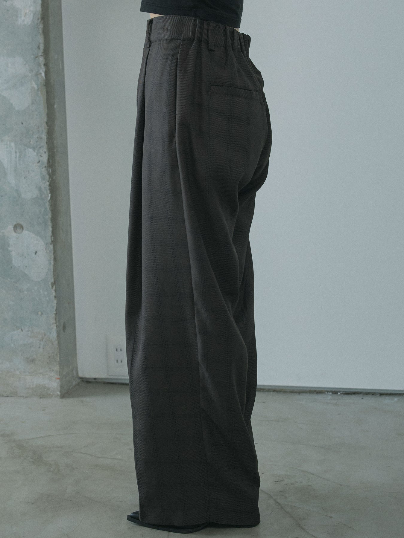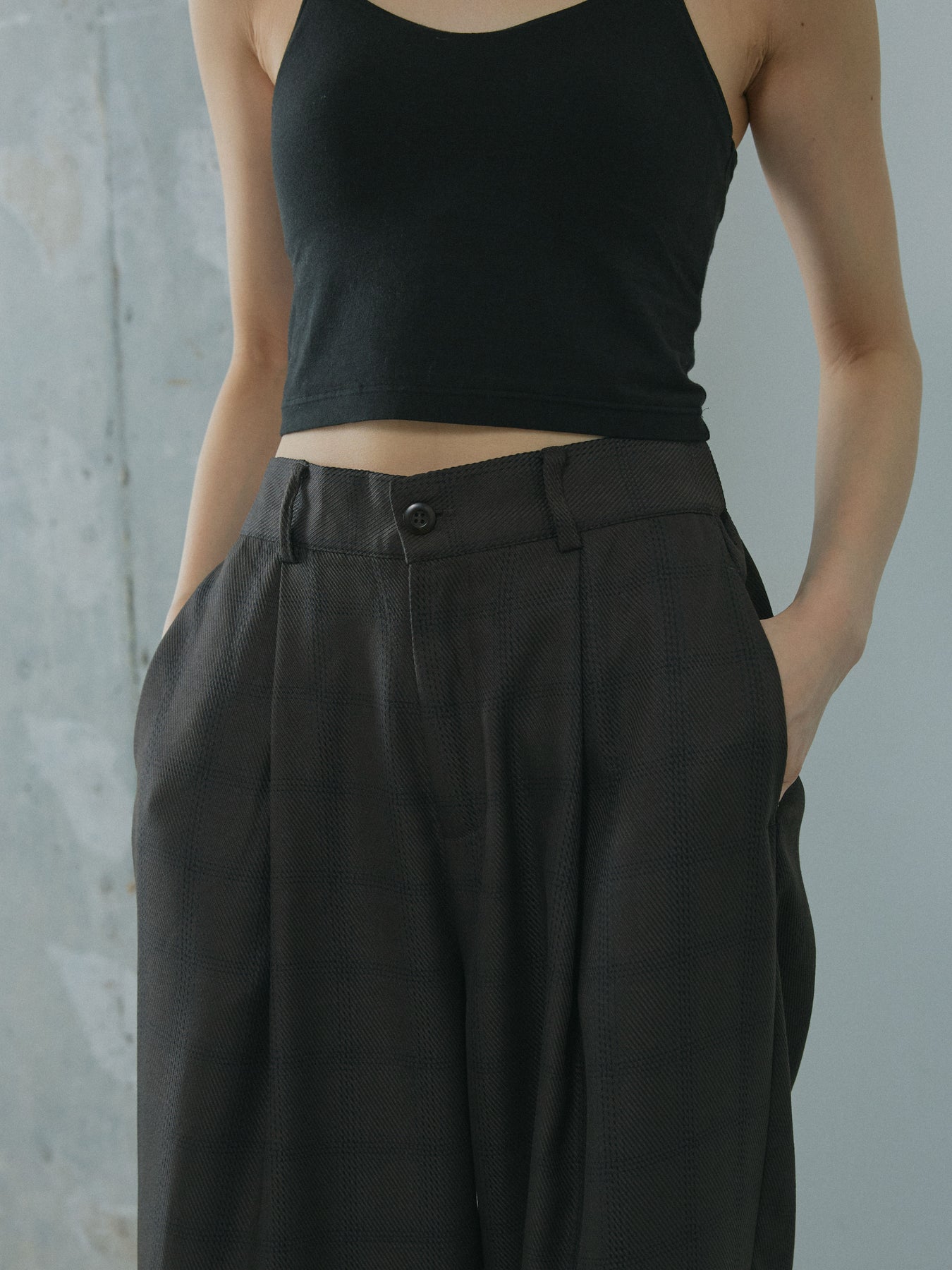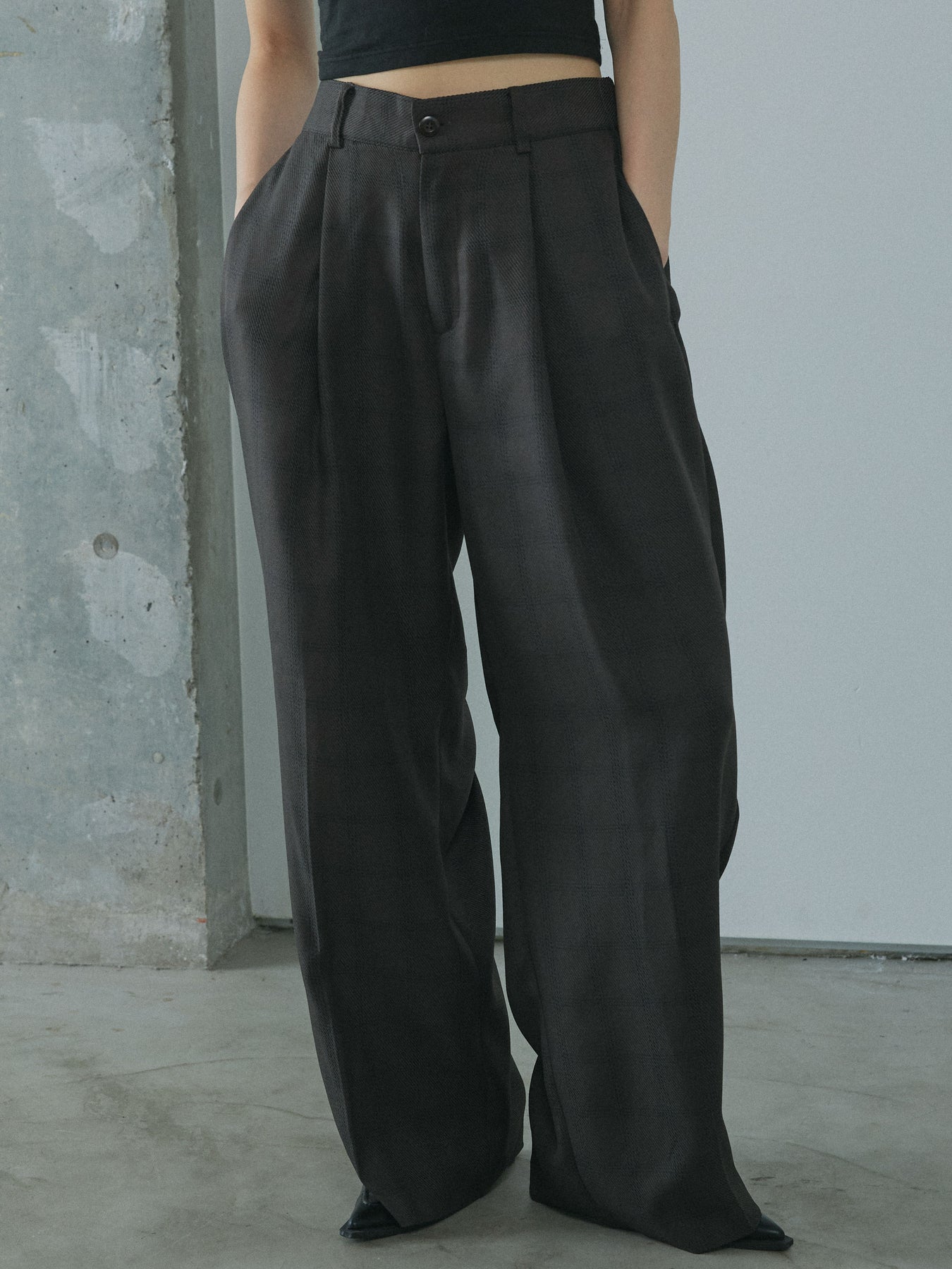 クラシカルなチェック柄と杢調の生地感が上品な印象を与えるタックパンツ。 フロントに施されたタックが立体感を生み、脚のラインをすっきりと見せてくれます。 程よくゆとりのあるシルエットで動きやすく、リラックス感のある穿き心地が魅力。 トップスをインしたスタイルもきれいに決まり、通勤から休日まで幅広いシーンで活躍します。 同素材のシャツジャケットと合わせたセットアップコーデもおすすめです。