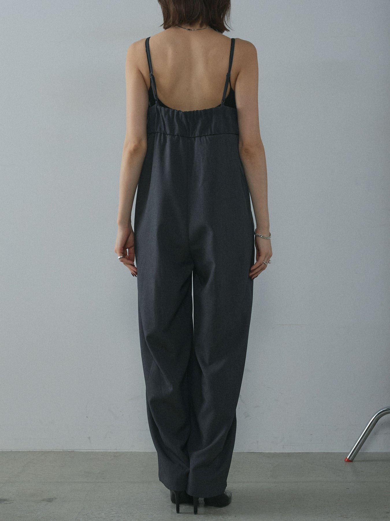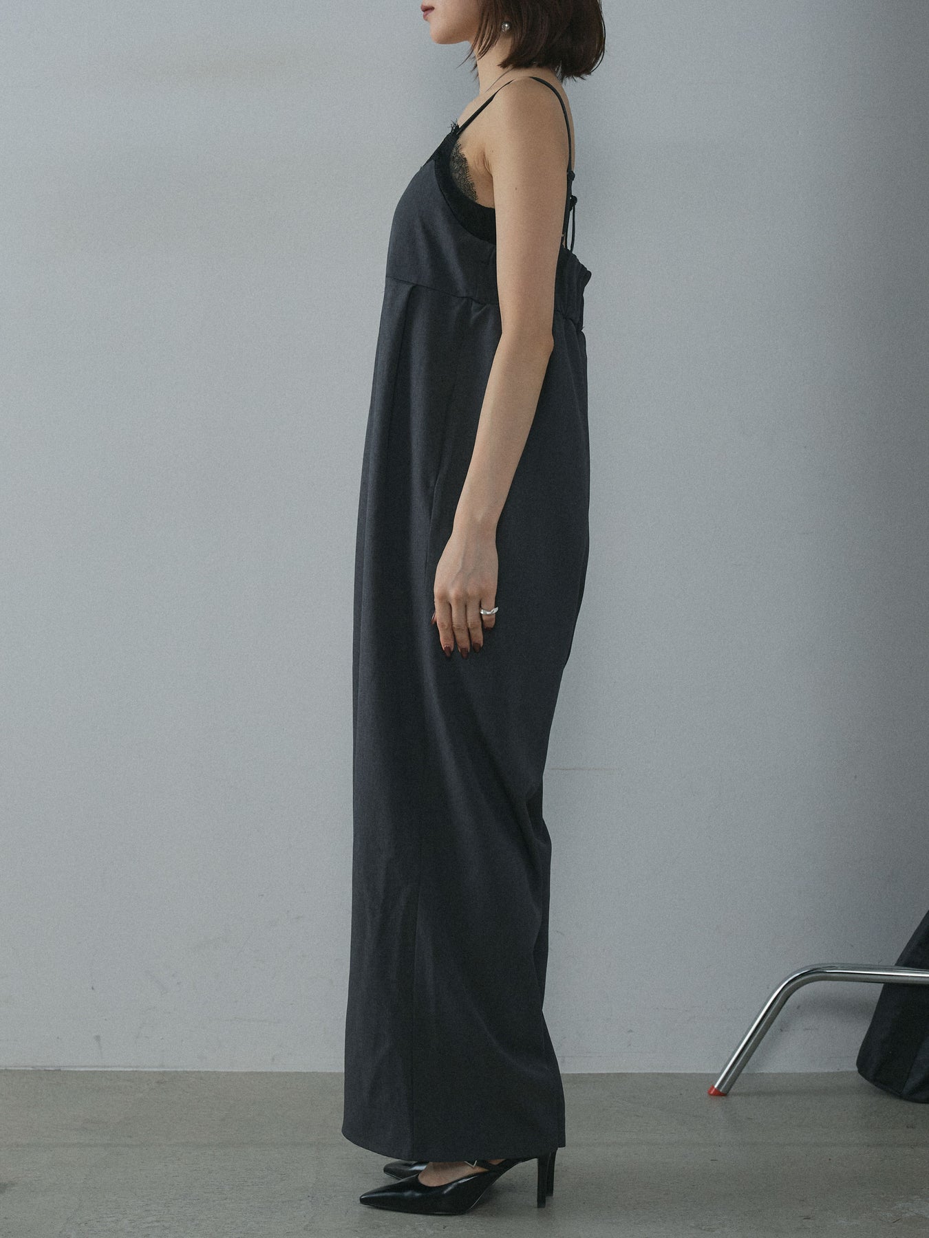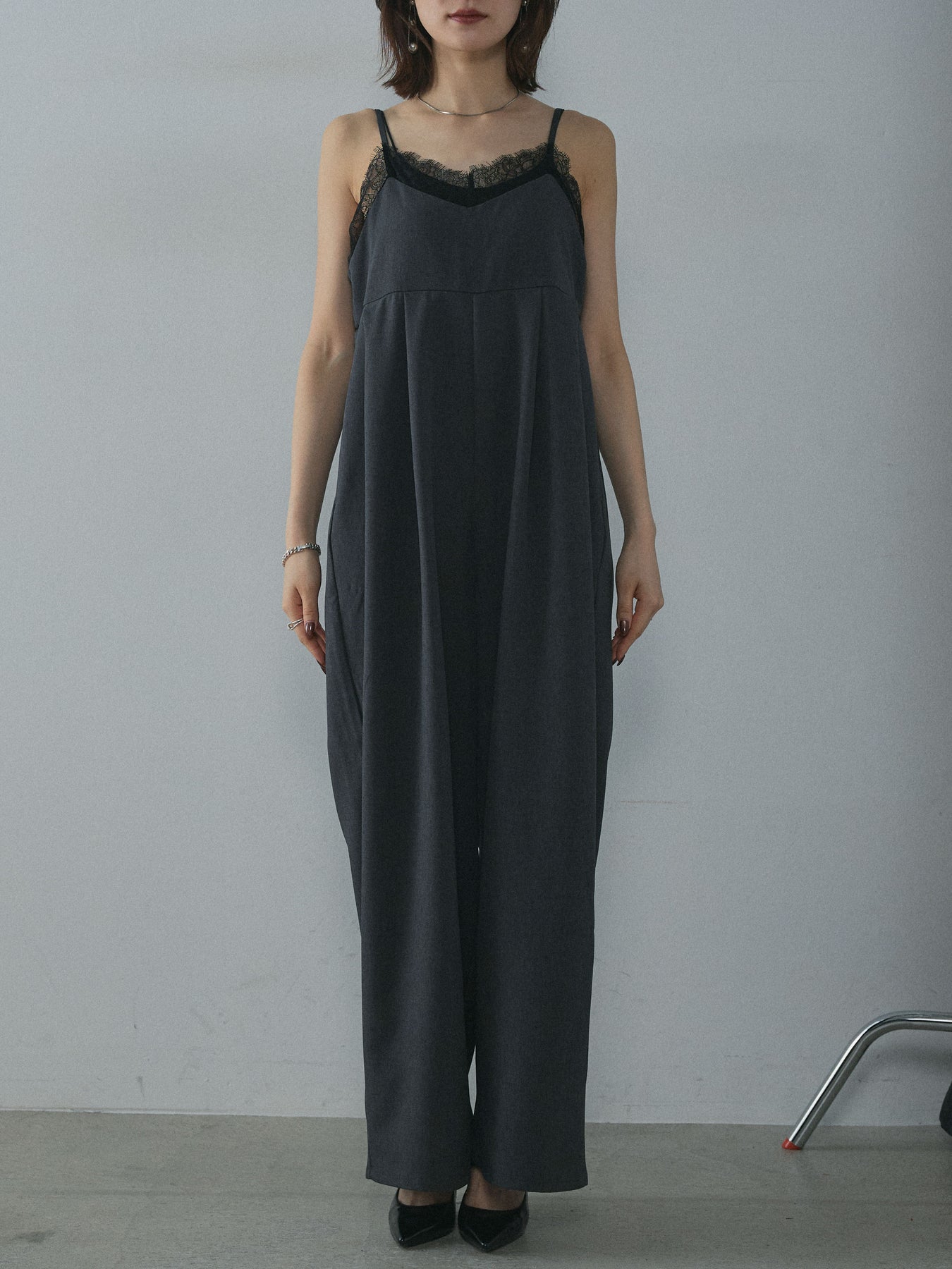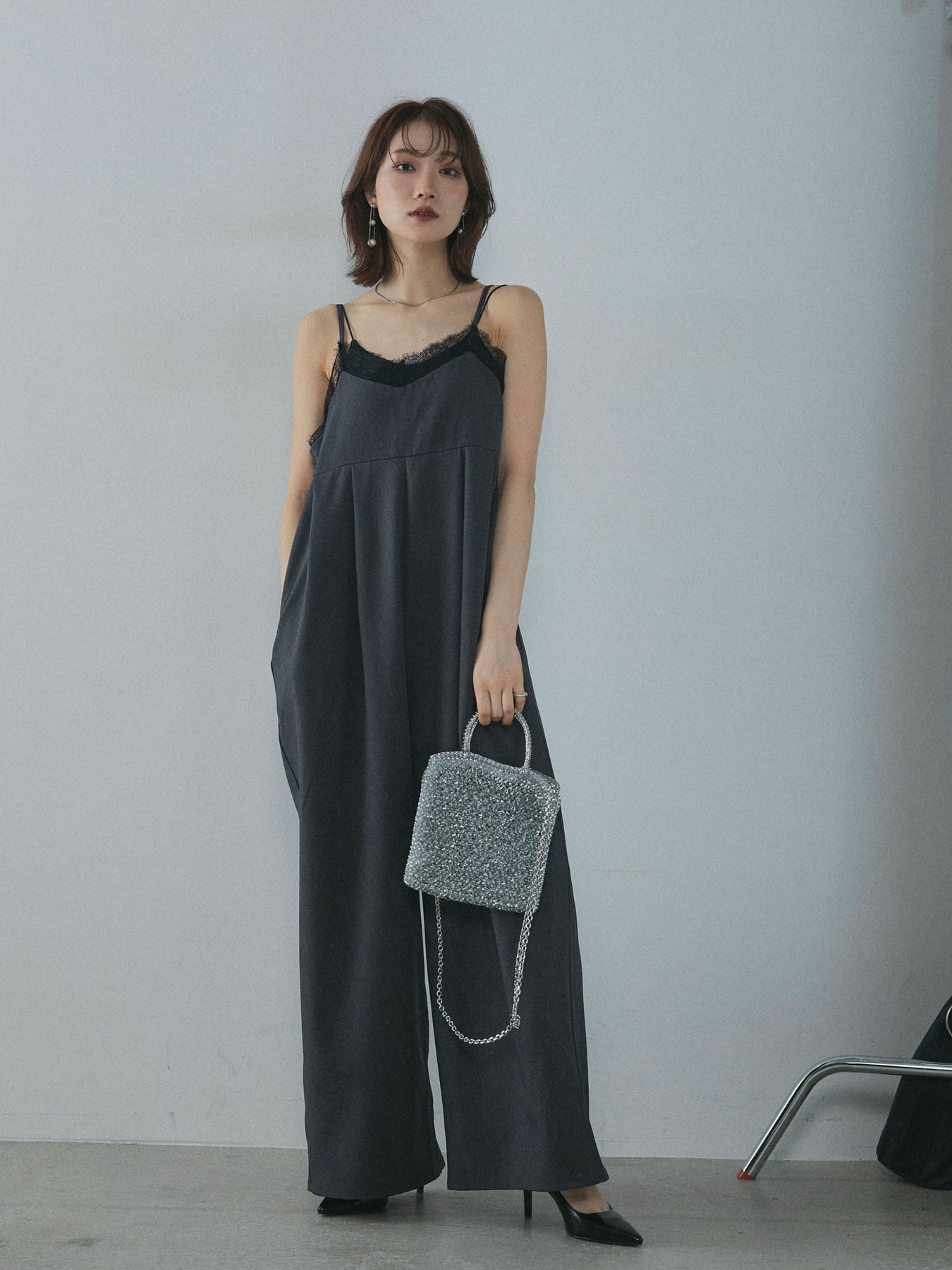 繊細なレースをあしらった胸元のデザインが、シンプルながらも女性らしさを引き立てるキャミオールインワン。華奢な肩紐と広がりすぎないストレートシルエットで、スタイルアップも叶うバランスに仕上げました。インナー次第でシーズンレスに活躍し、ジャケットやカーディガンとのレイヤードにもおすすめな一着です。