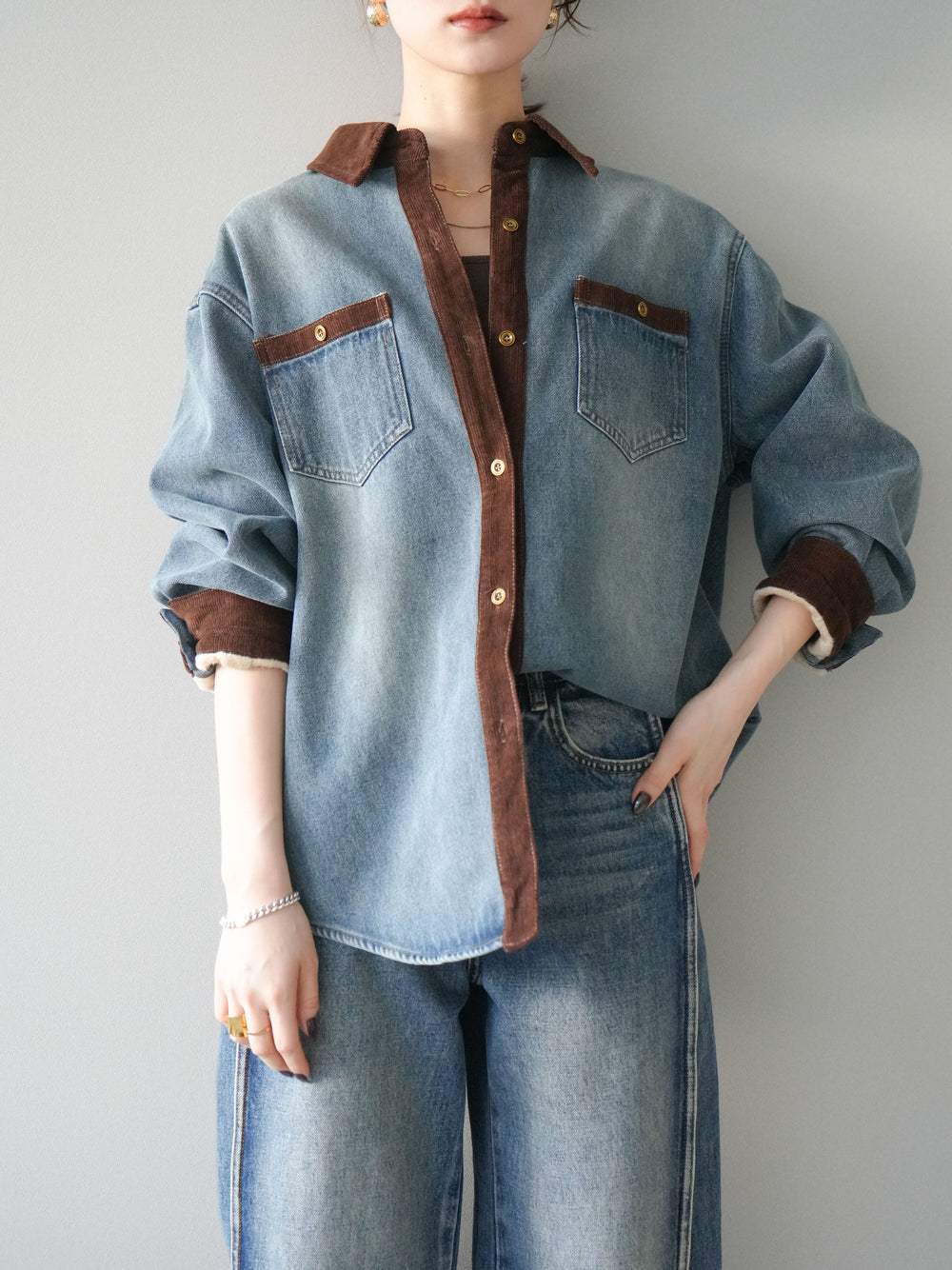 [予約]裏起毛コーデュロイ襟デニムシャツジャケット/ blue