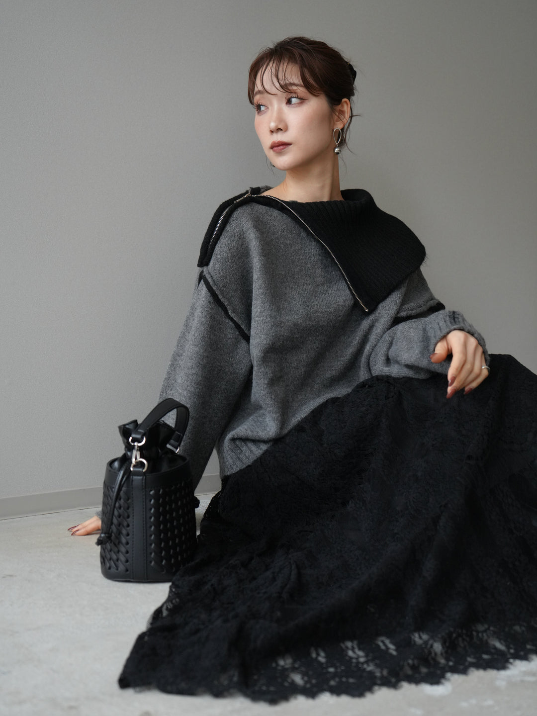 [予約]ZIPハイネックバイカラーニットプルオーバー/charcoal