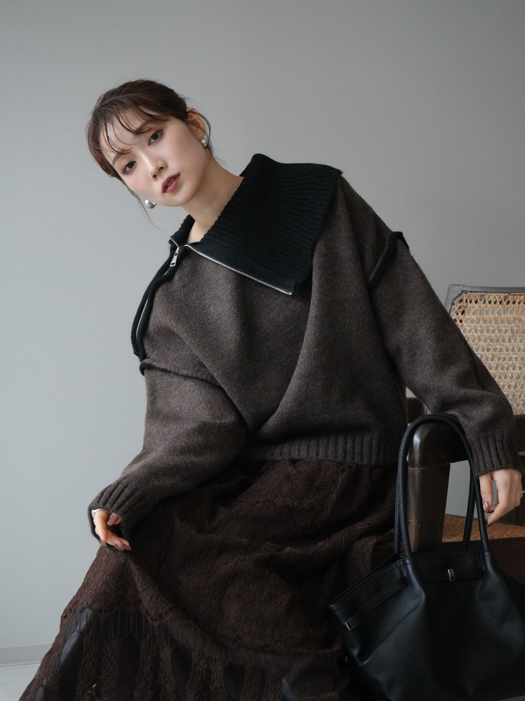 [予約]ZIPハイネックバイカラーニットプルオーバー/brown