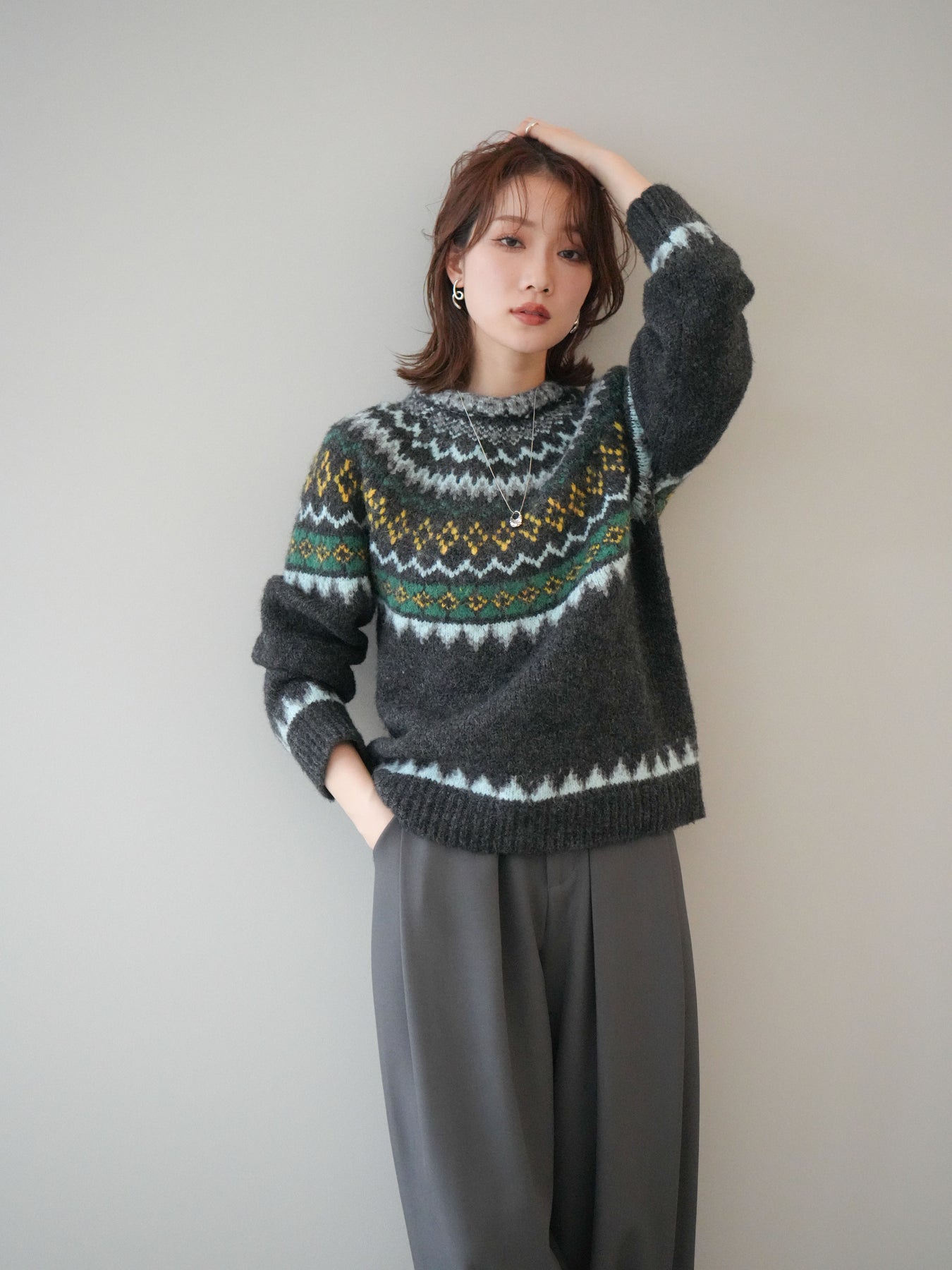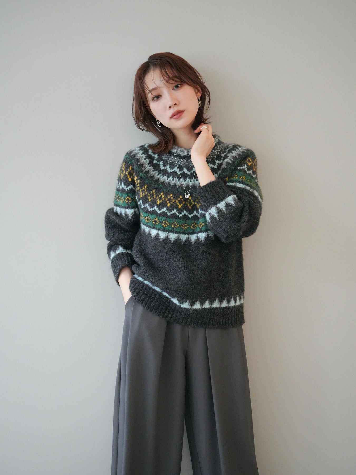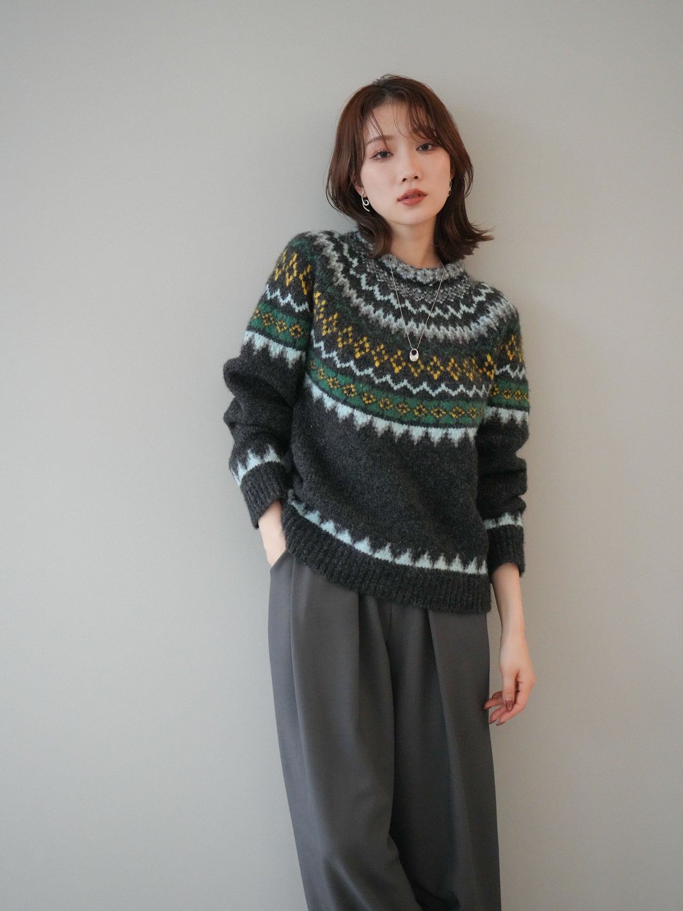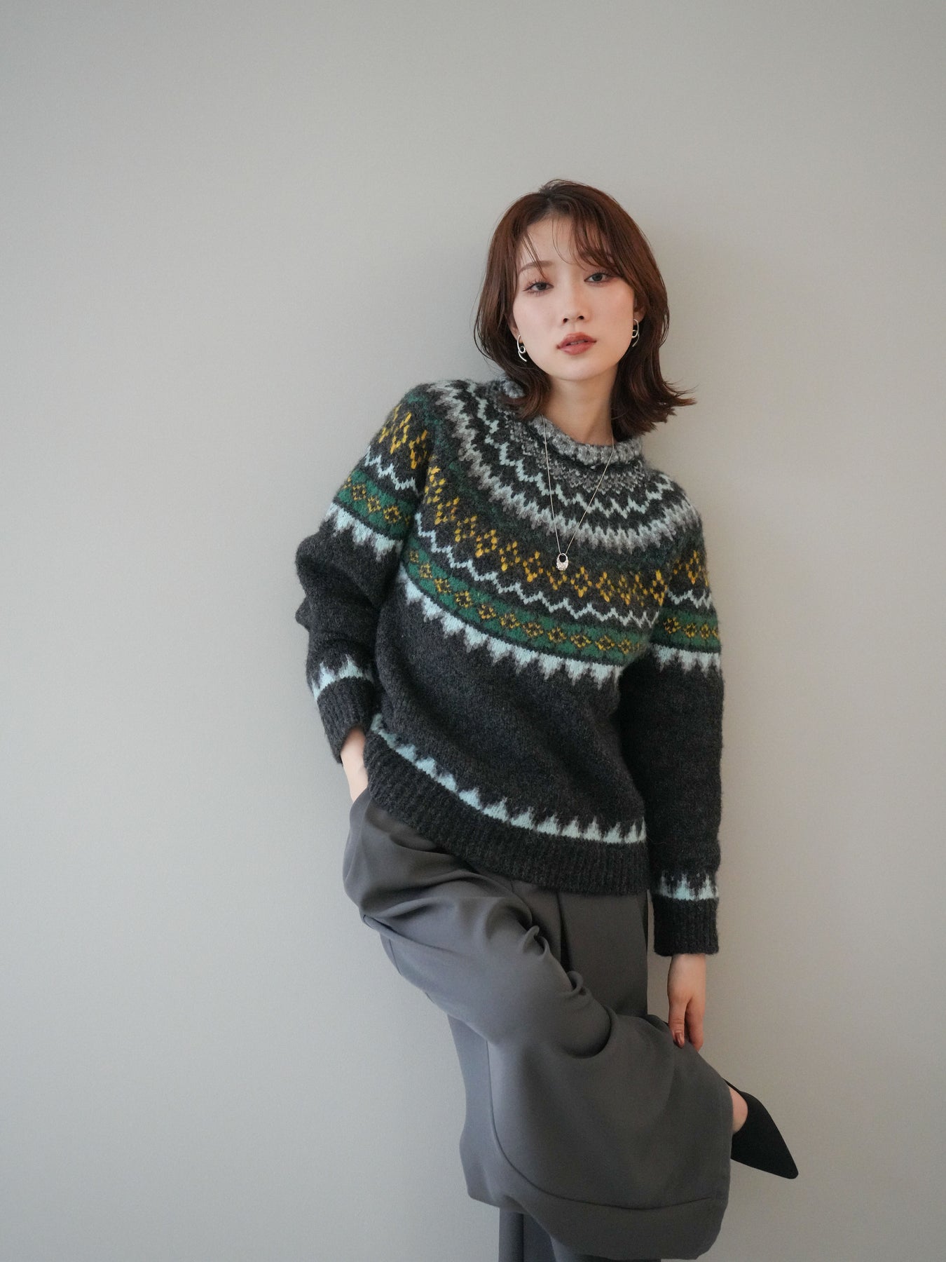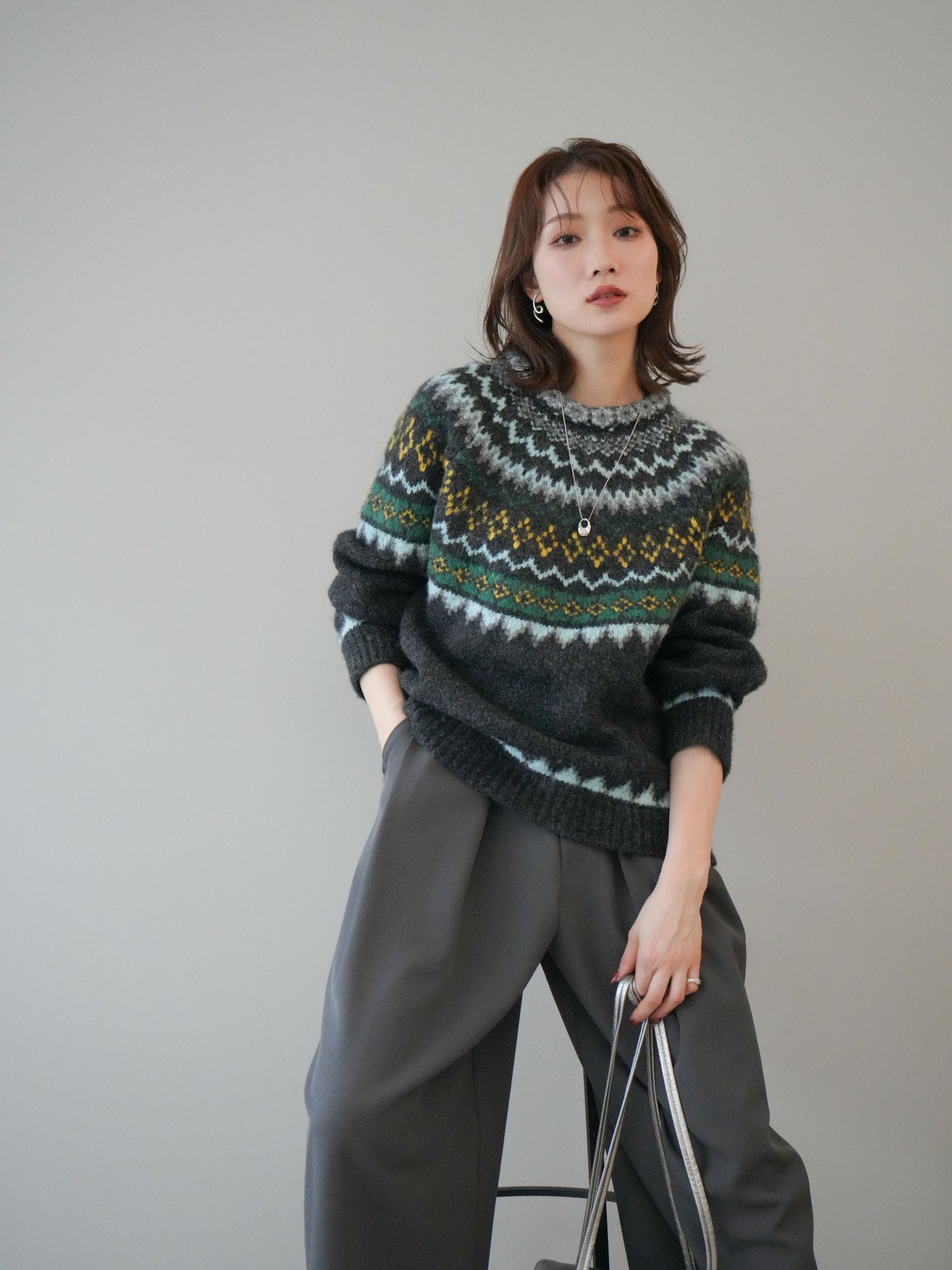 クラシカルな求心柄が目を惹くウールタッチニットプルオーバー。 ふんわりとした風合いと柔らかな肌触りで、暖かみのある着心地が魅力です。 程よくゆとりのあるオーバーシルエットが抜け感を演出し、1枚で存在感のあるスタイルに。 首元のリブデザインが程よいボリュームを与え、冬らしいムードを引き立てます。 デニムやスカートなど、カジュアルにもフェミニンにも着回せる万能ニットです。 ※ボトムス、キャミソール(インナー)以外の商品は一律でインナーは付属していません。