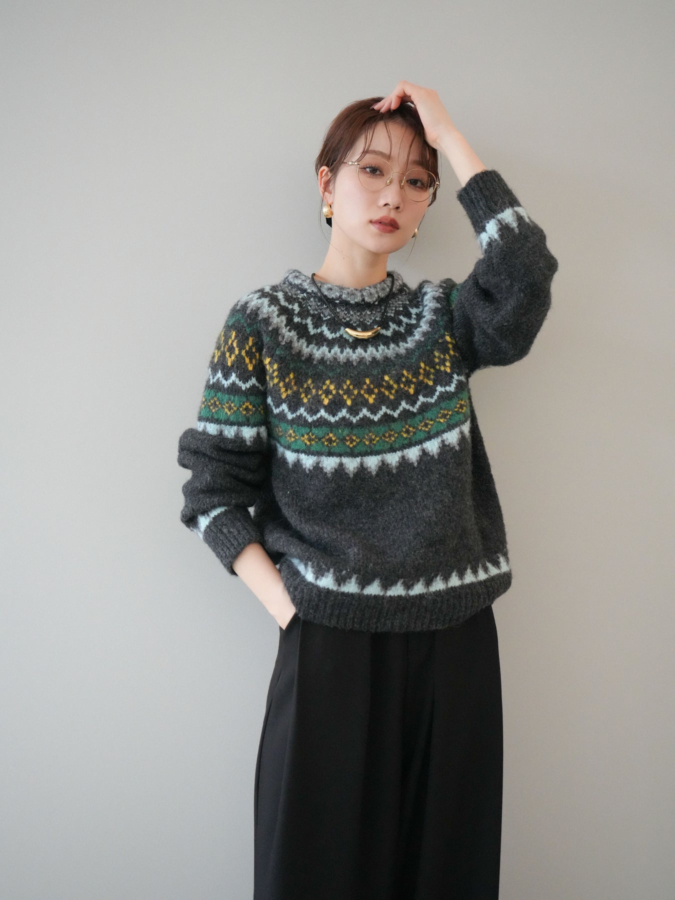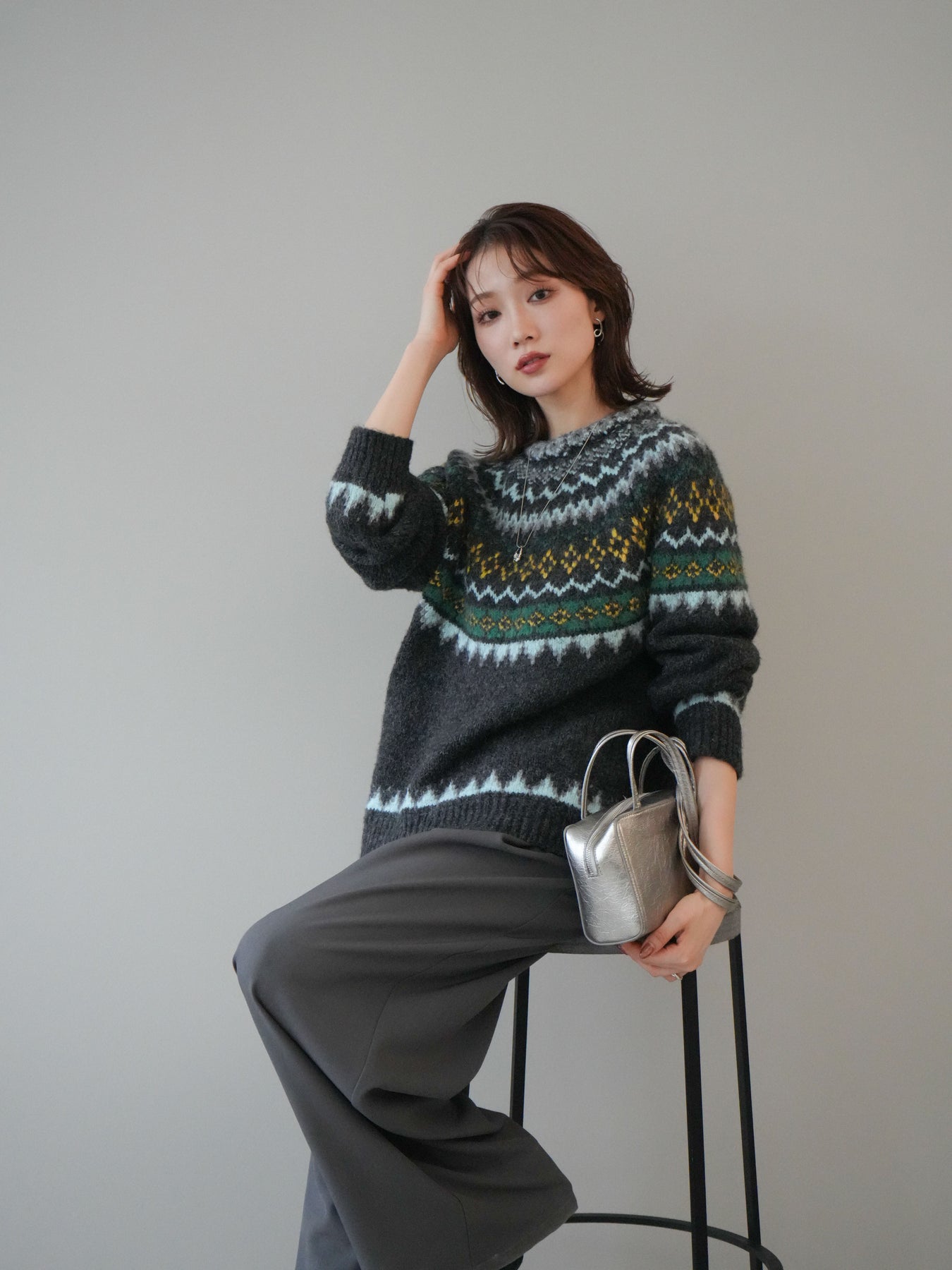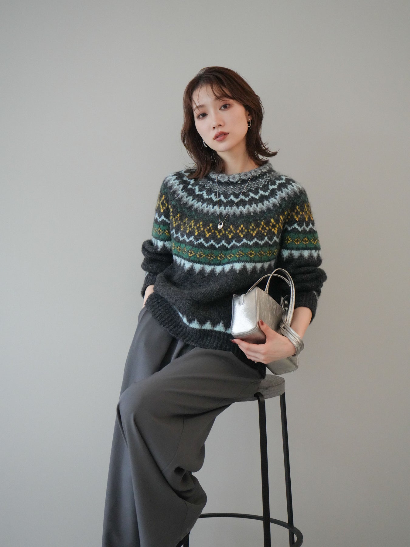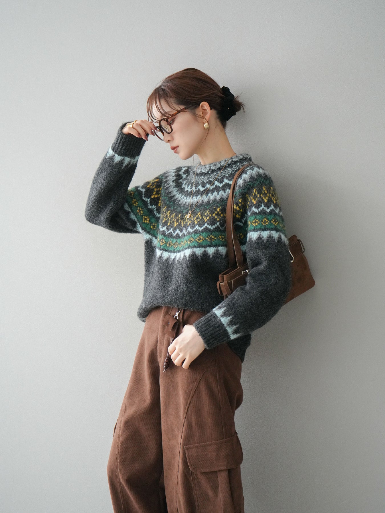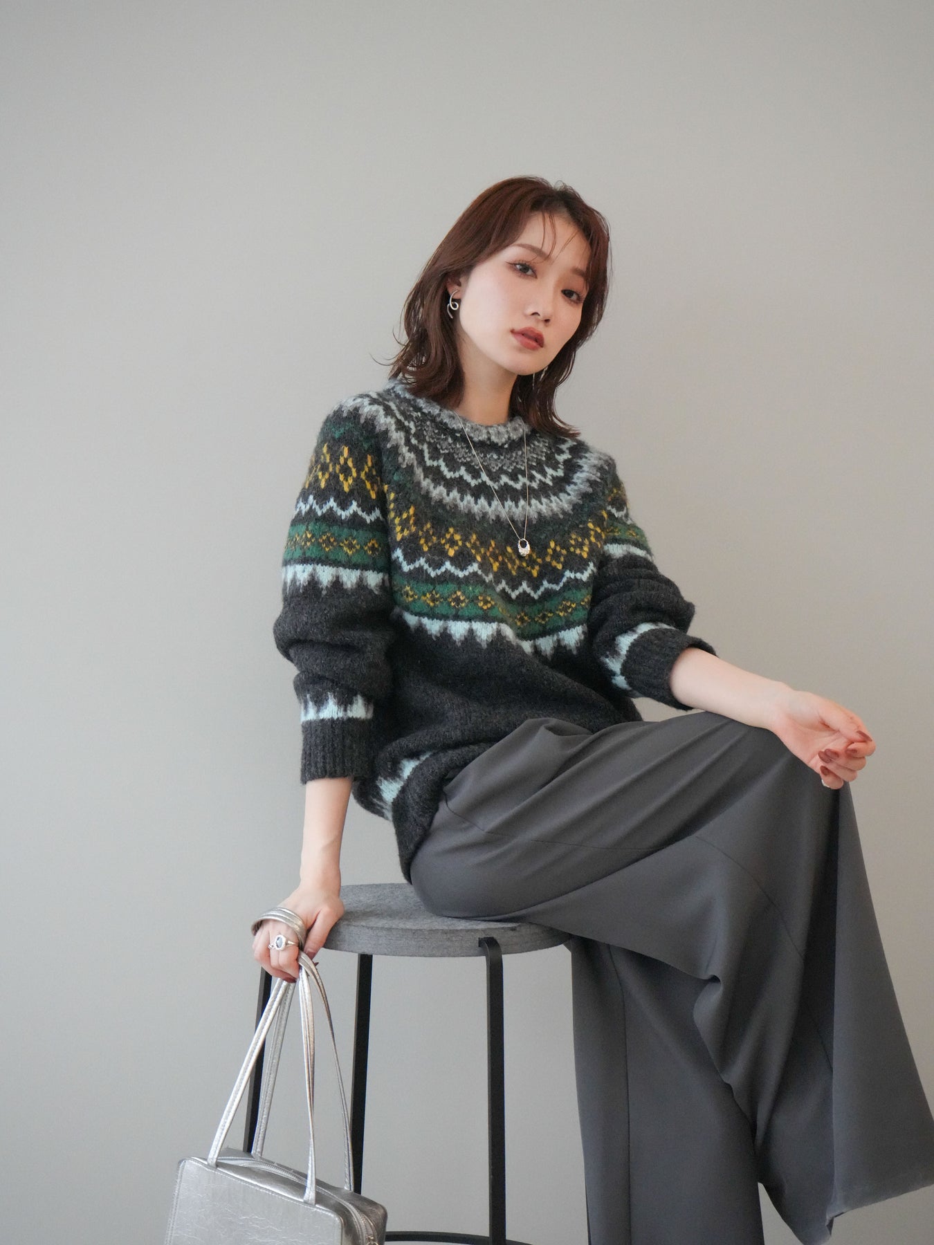 クラシカルな求心柄が目を惹くウールタッチニットプルオーバー。 ふんわりとした風合いと柔らかな肌触りで、暖かみのある着心地が魅力です。 程よくゆとりのあるオーバーシルエットが抜け感を演出し、1枚で存在感のあるスタイルに。 首元のリブデザインが程よいボリュームを与え、冬らしいムードを引き立てます。 デニムやスカートなど、カジュアルにもフェミニンにも着回せる万能ニットです。 ※ボトムス、キャミソール(インナー)以外の商品は一律でインナーは付属していません。