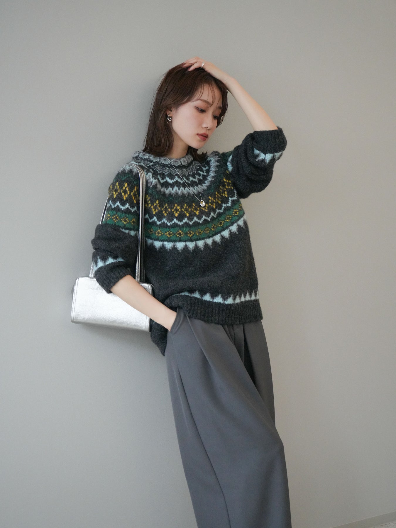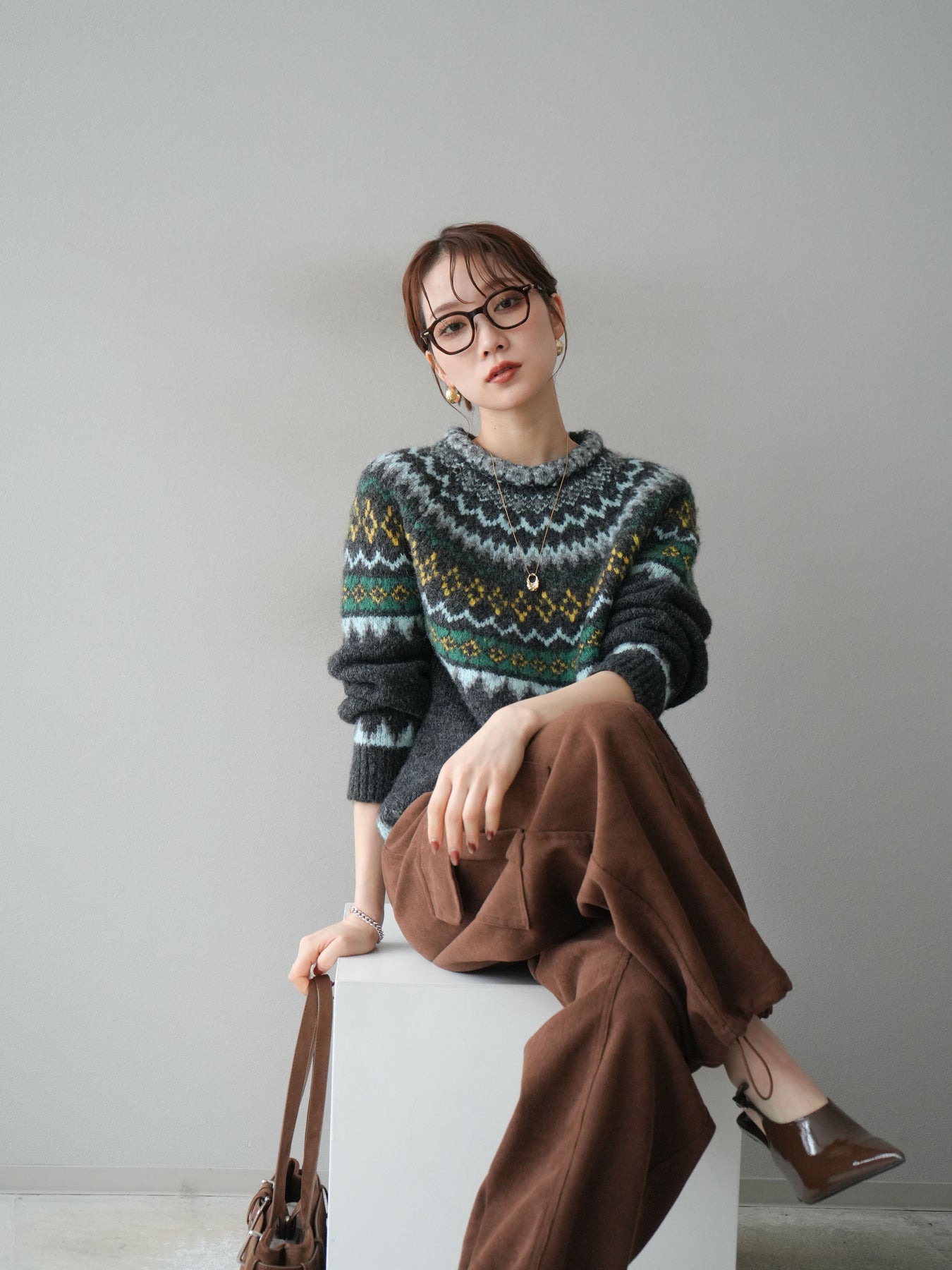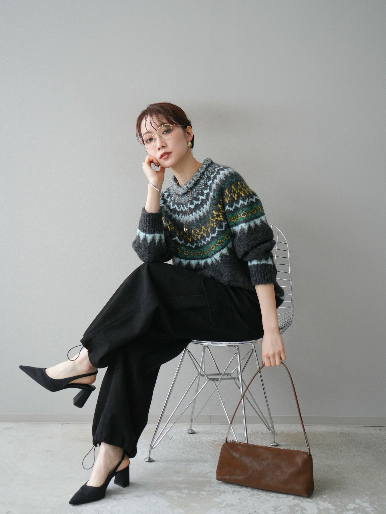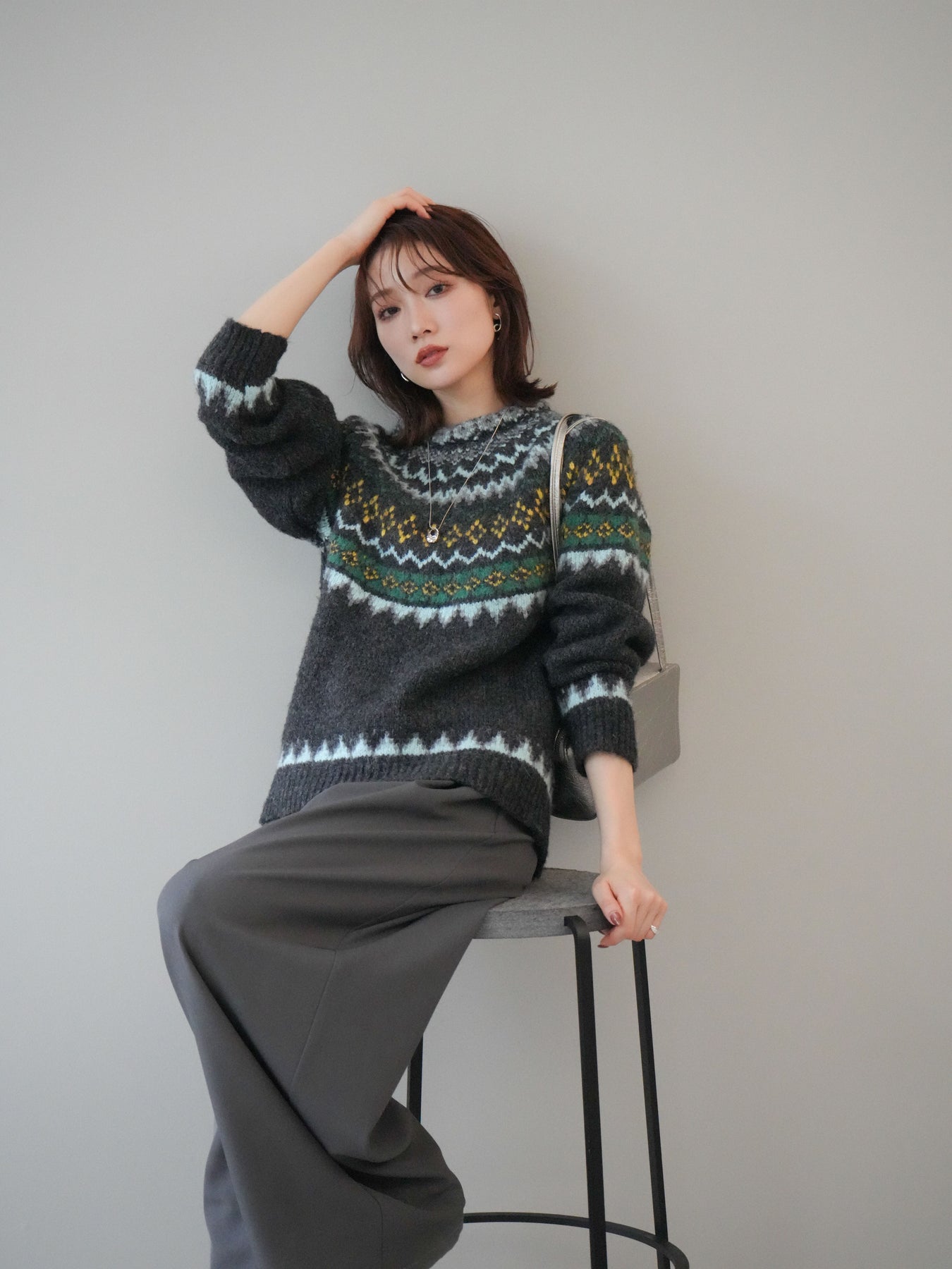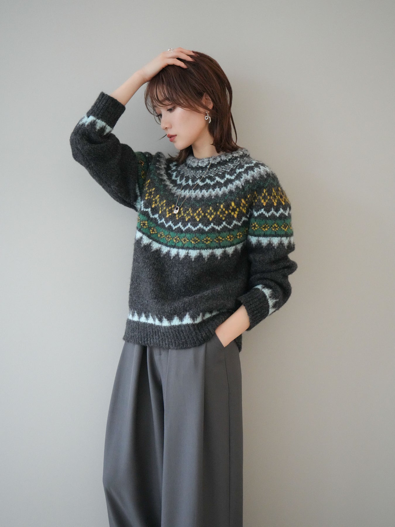 クラシカルな求心柄が目を惹くウールタッチニットプルオーバー。 ふんわりとした風合いと柔らかな肌触りで、暖かみのある着心地が魅力です。 程よくゆとりのあるオーバーシルエットが抜け感を演出し、1枚で存在感のあるスタイルに。 首元のリブデザインが程よいボリュームを与え、冬らしいムードを引き立てます。 デニムやスカートなど、カジュアルにもフェミニンにも着回せる万能ニットです。 ※ボトムス、キャミソール(インナー)以外の商品は一律でインナーは付属していません。
