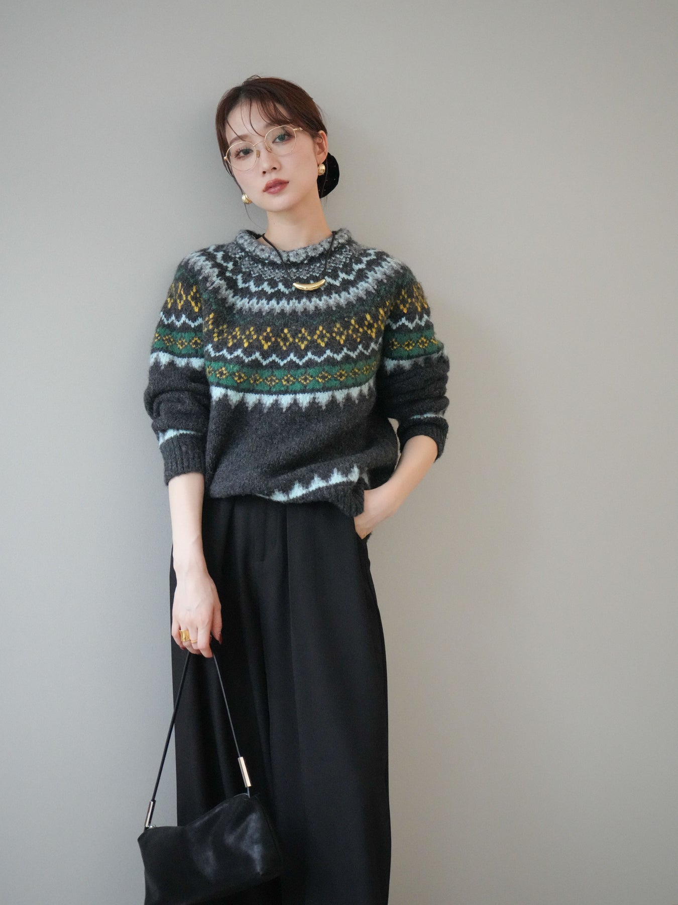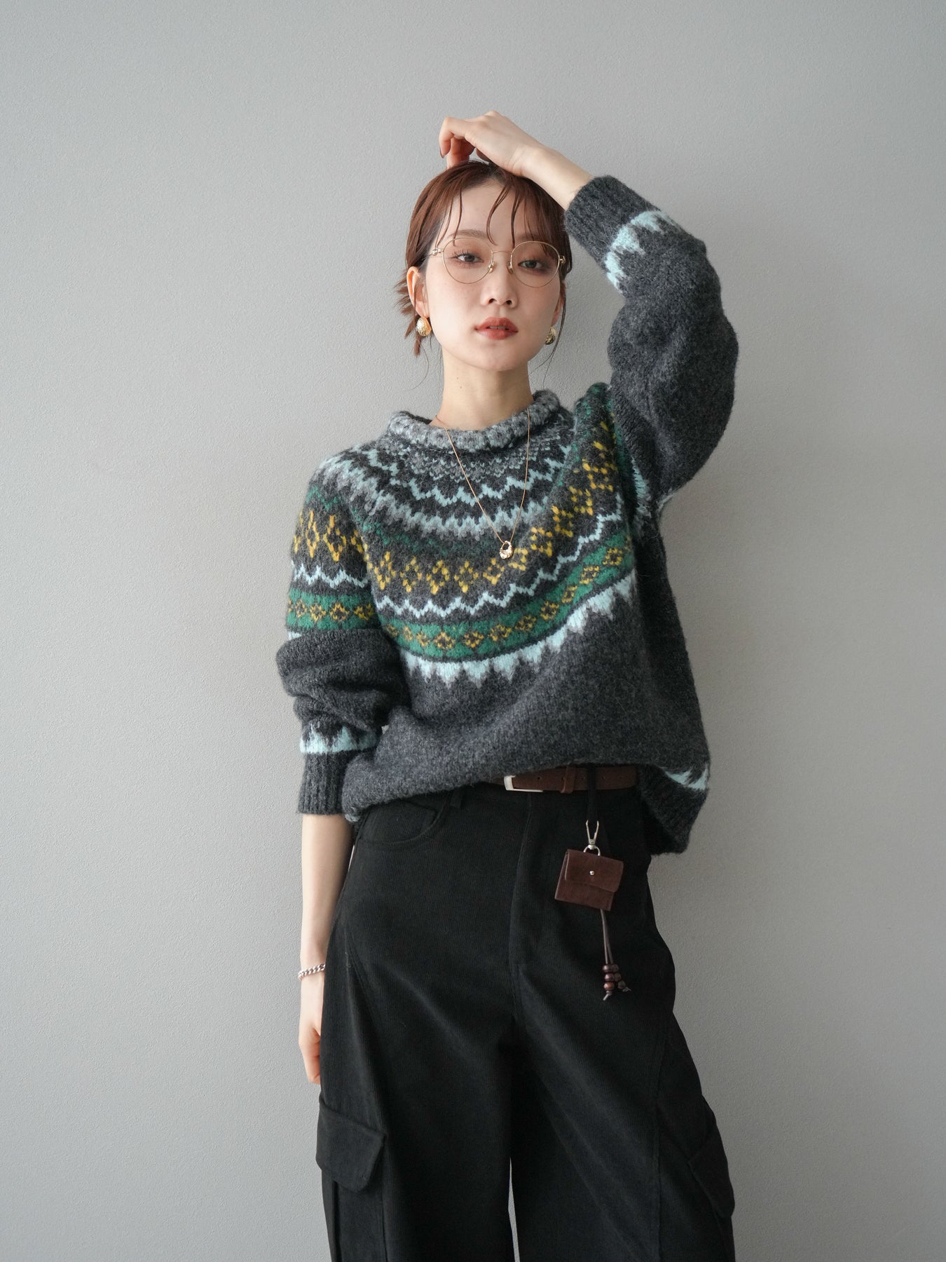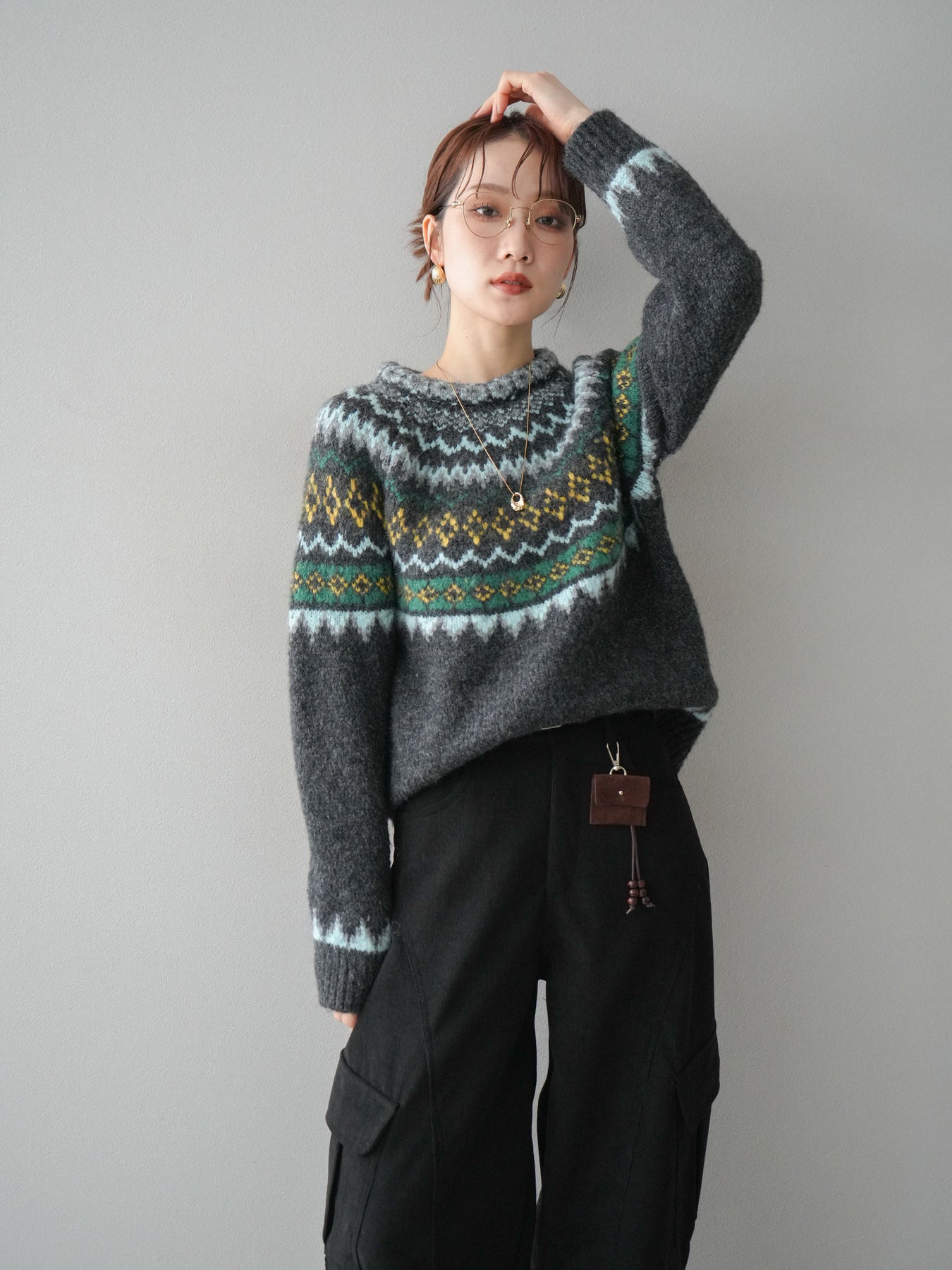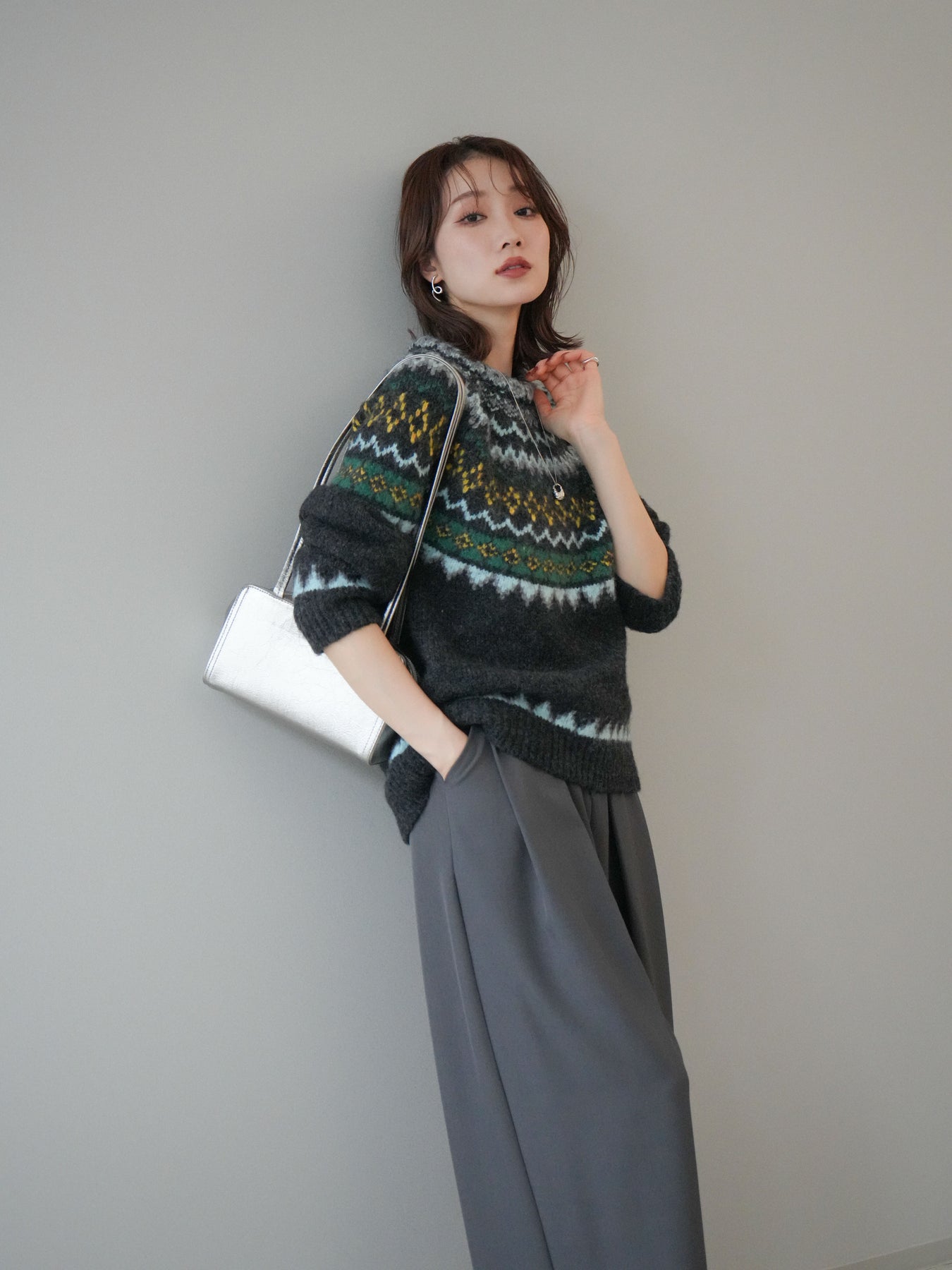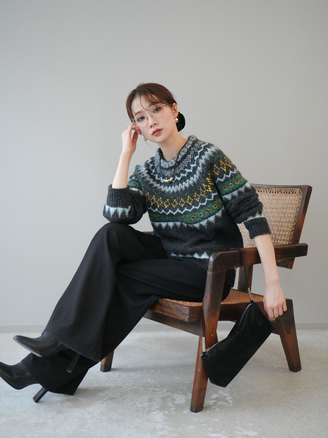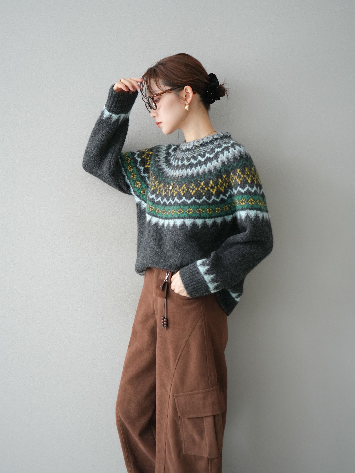 クラシカルな求心柄が目を惹くウールタッチニットプルオーバー。 ふんわりとした風合いと柔らかな肌触りで、暖かみのある着心地が魅力です。 程よくゆとりのあるオーバーシルエットが抜け感を演出し、1枚で存在感のあるスタイルに。 首元のリブデザインが程よいボリュームを与え、冬らしいムードを引き立てます。 デニムやスカートなど、カジュアルにもフェミニンにも着回せる万能ニットです。 ※ボトムス、キャミソール(インナー)以外の商品は一律でインナーは付属していません。