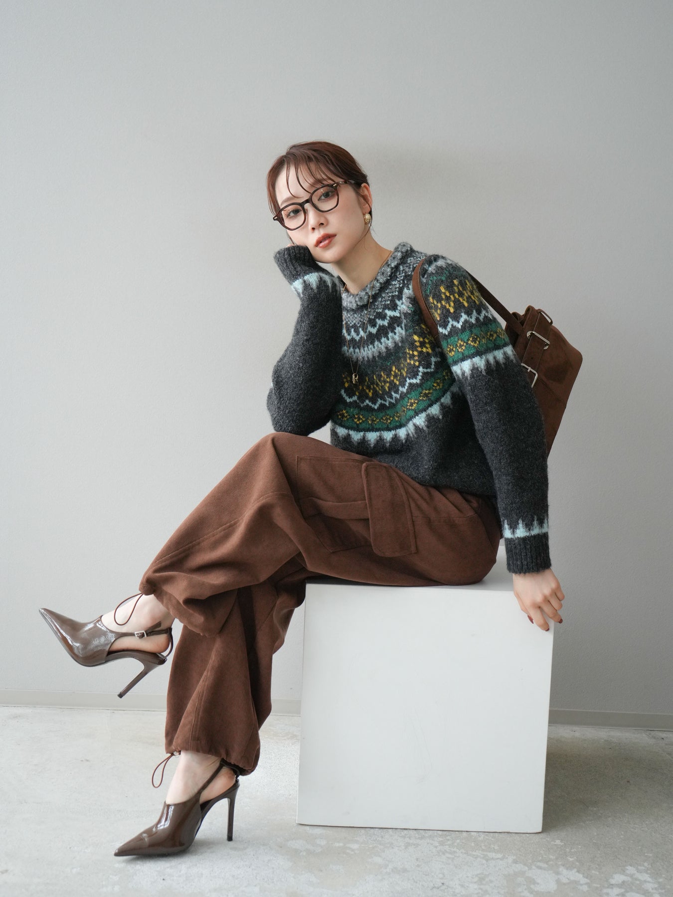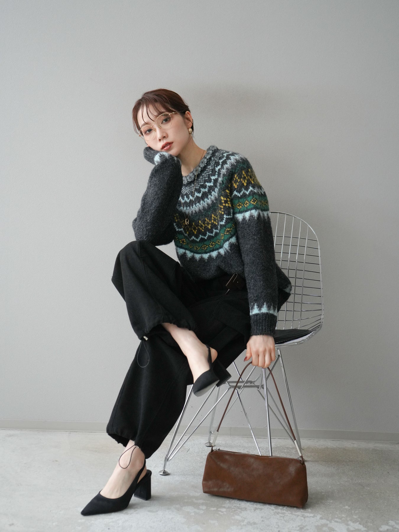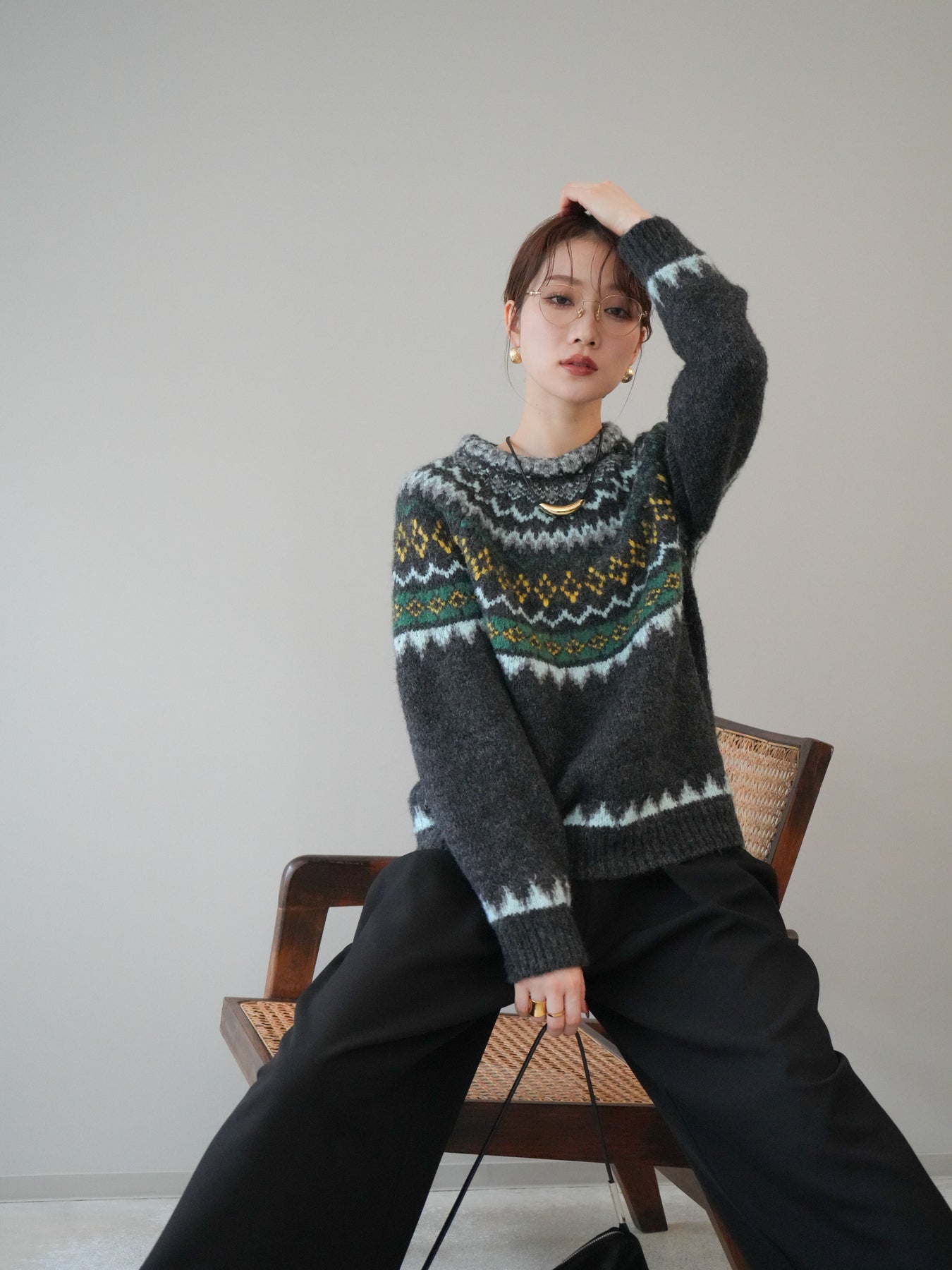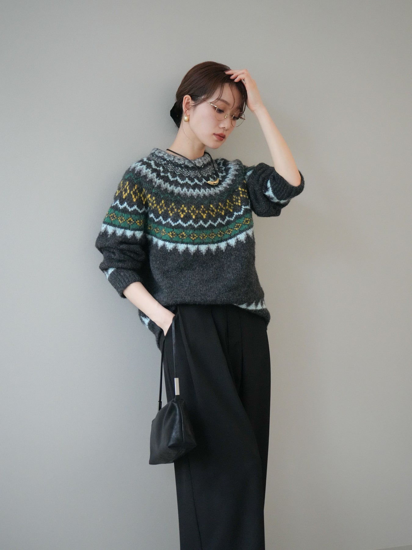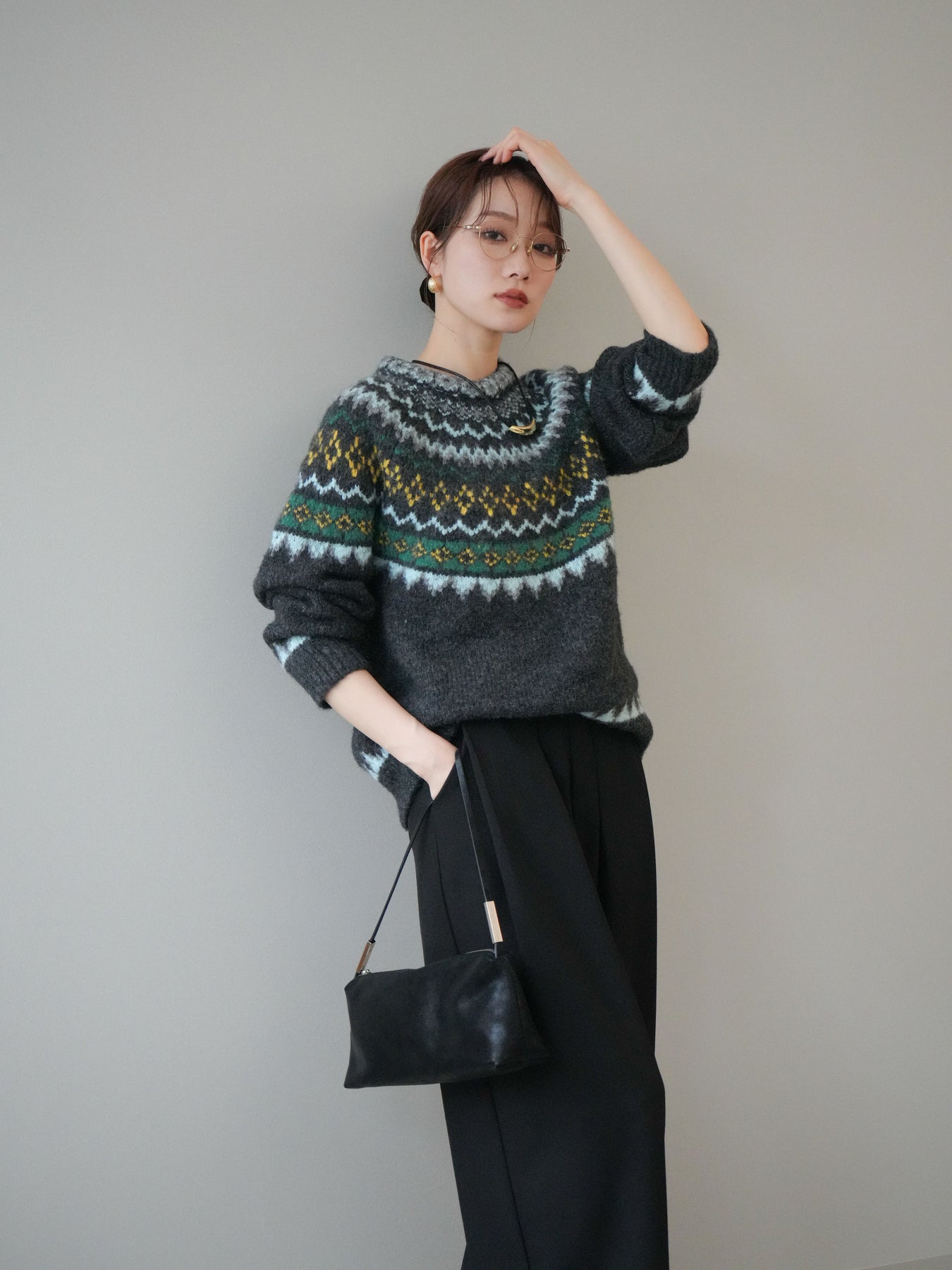 クラシカルな求心柄が目を惹くウールタッチニットプルオーバー。 ふんわりとした風合いと柔らかな肌触りで、暖かみのある着心地が魅力です。 程よくゆとりのあるオーバーシルエットが抜け感を演出し、1枚で存在感のあるスタイルに。 首元のリブデザインが程よいボリュームを与え、冬らしいムードを引き立てます。 デニムやスカートなど、カジュアルにもフェミニンにも着回せる万能ニットです。 ※ボトムス、キャミソール(インナー)以外の商品は一律でインナーは付属していません。