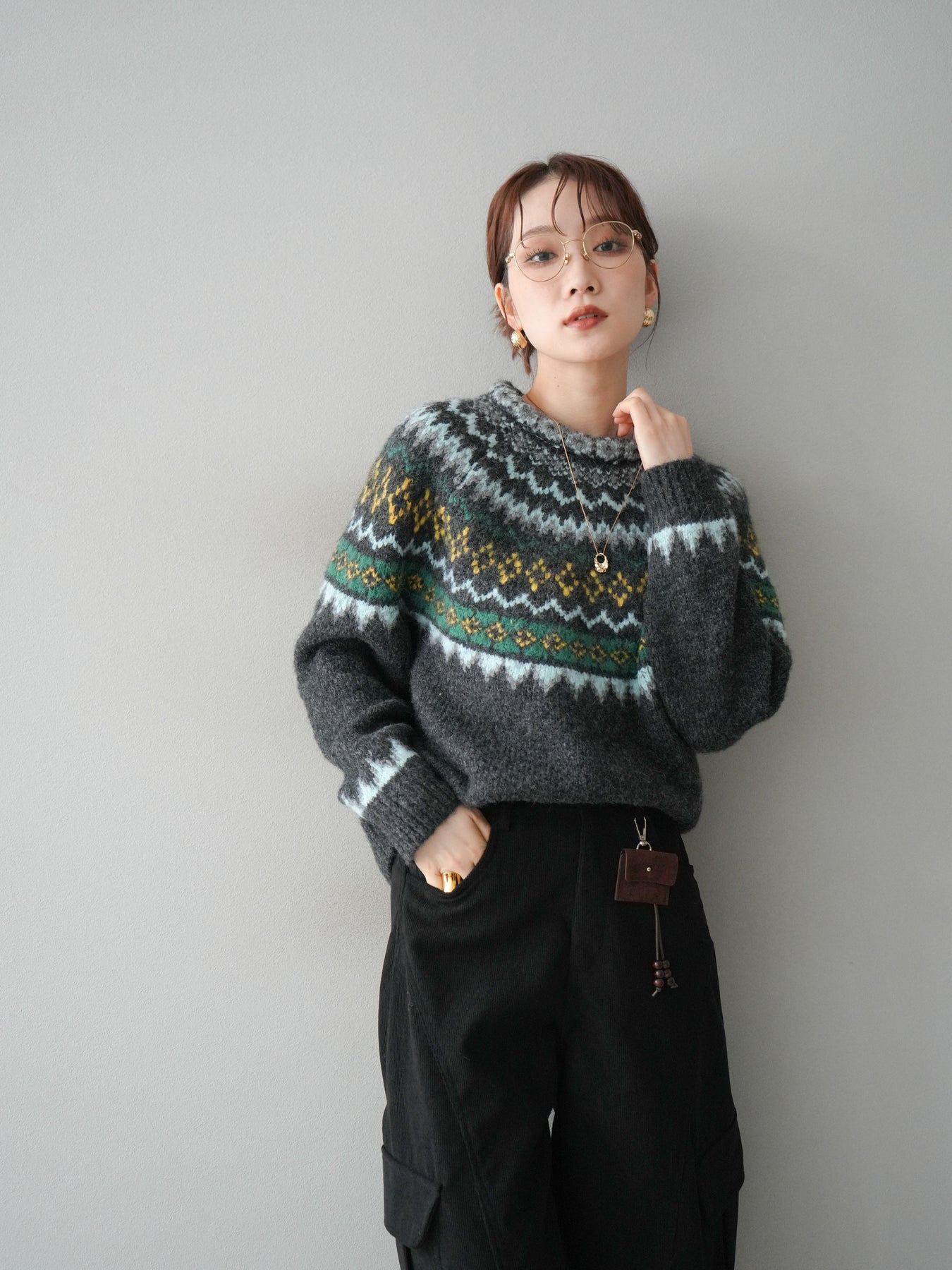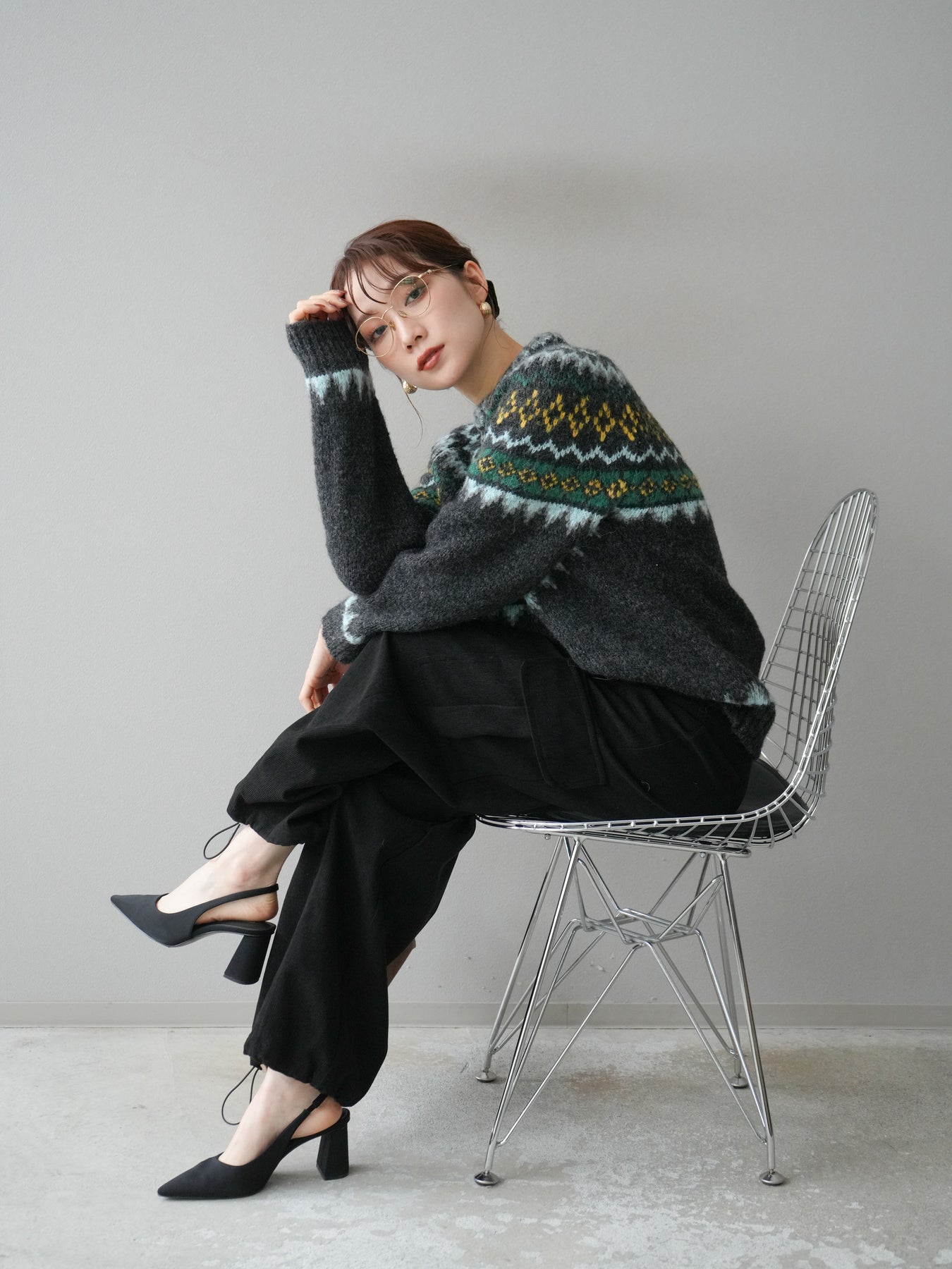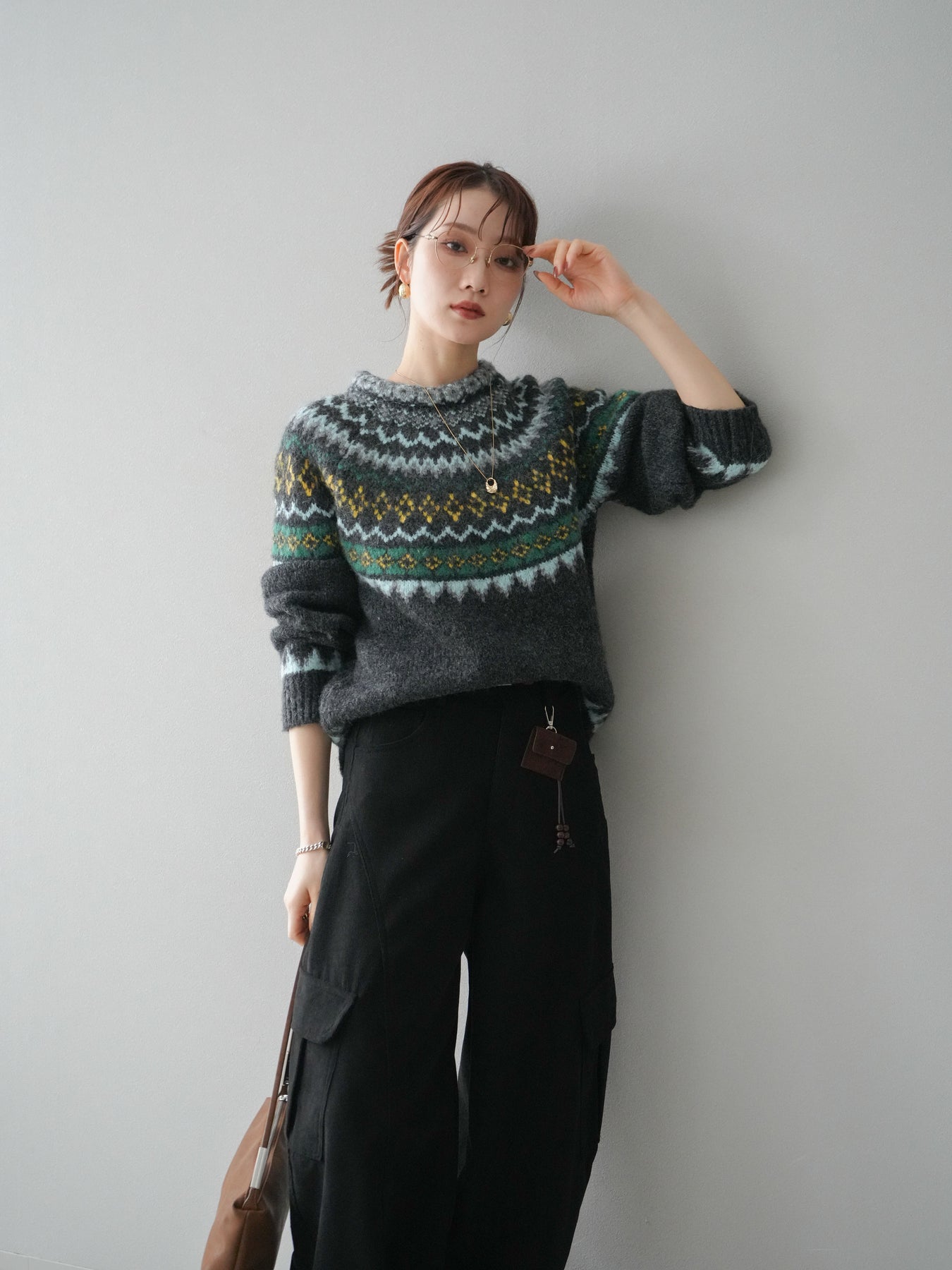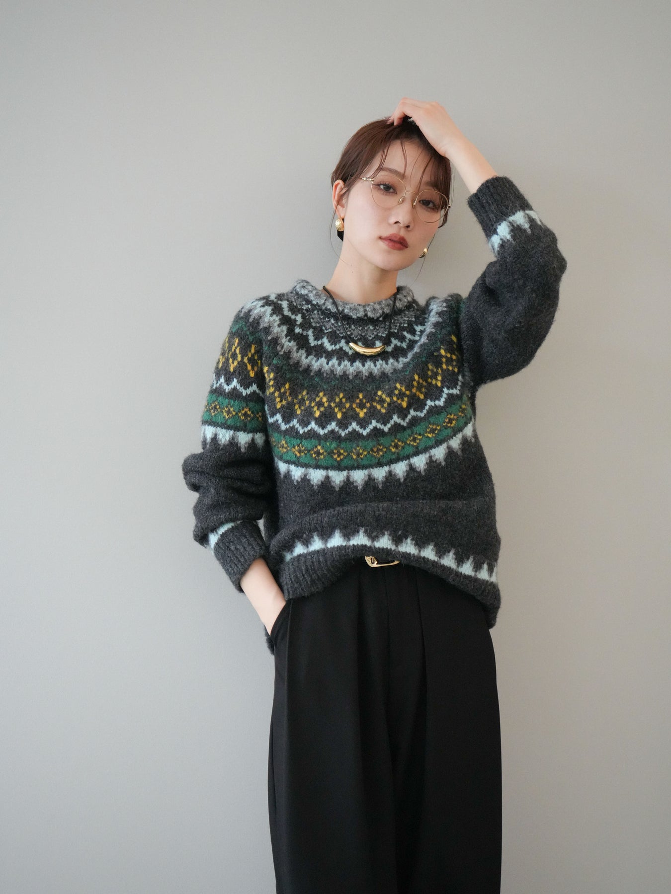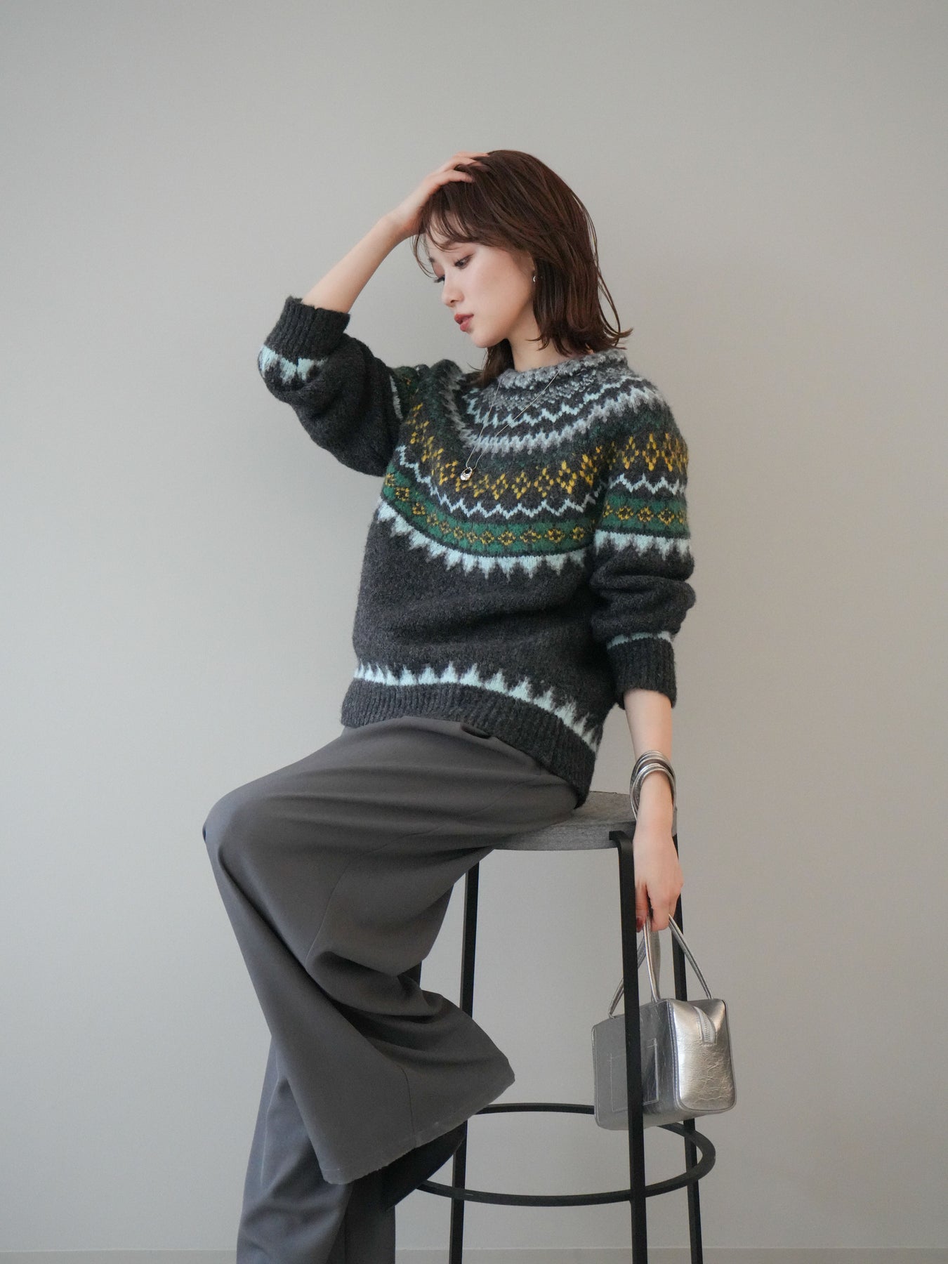 クラシカルな求心柄が目を惹くウールタッチニットプルオーバー。 ふんわりとした風合いと柔らかな肌触りで、暖かみのある着心地が魅力です。 程よくゆとりのあるオーバーシルエットが抜け感を演出し、1枚で存在感のあるスタイルに。 首元のリブデザインが程よいボリュームを与え、冬らしいムードを引き立てます。 デニムやスカートなど、カジュアルにもフェミニンにも着回せる万能ニットです。 ※ボトムス、キャミソール(インナー)以外の商品は一律でインナーは付属していません。