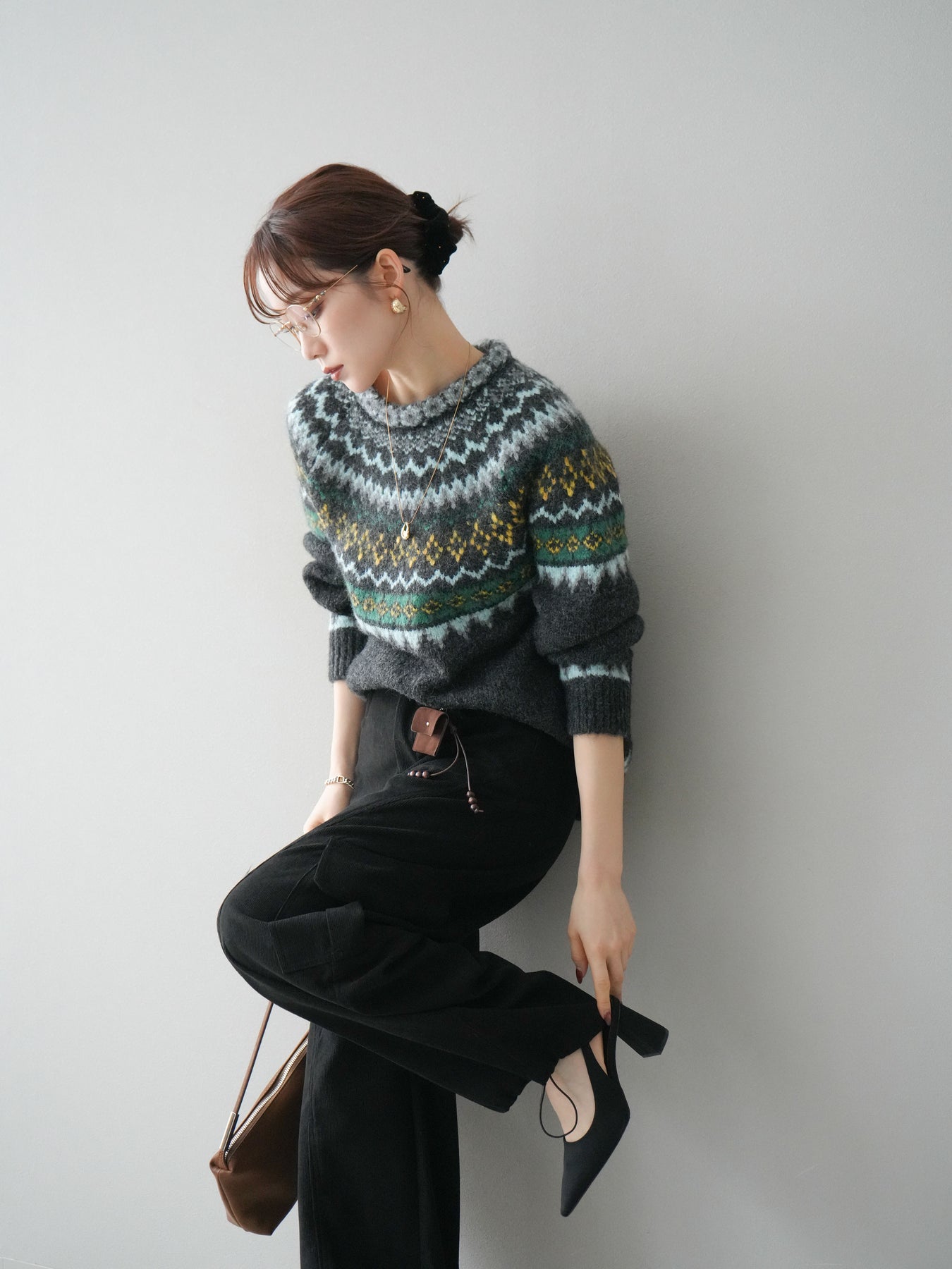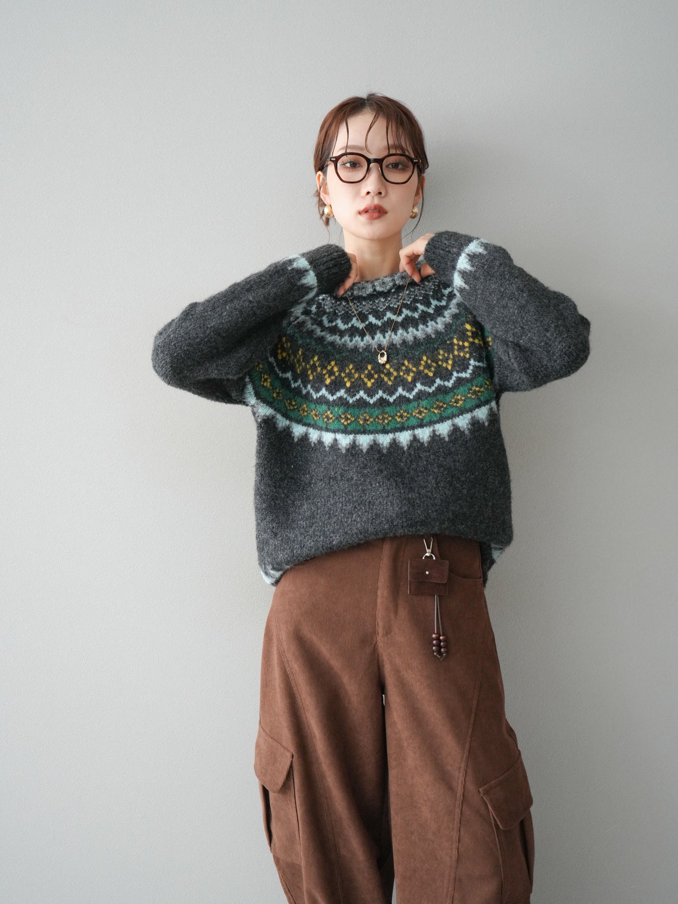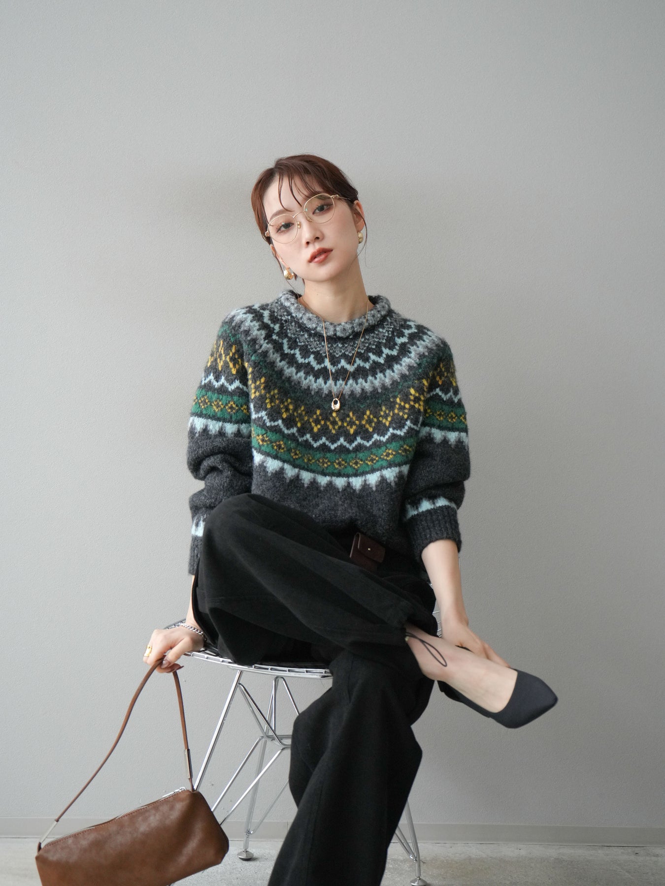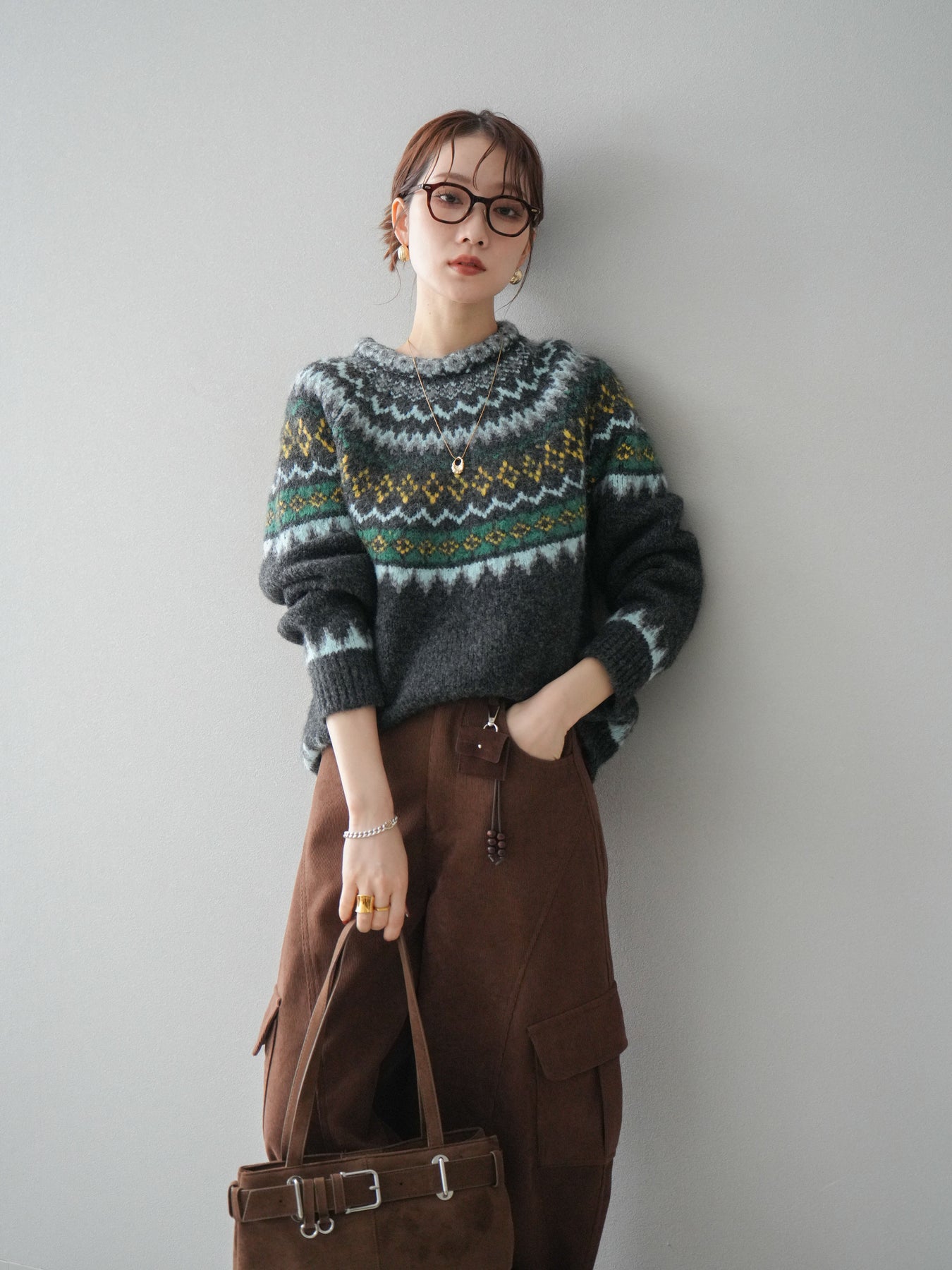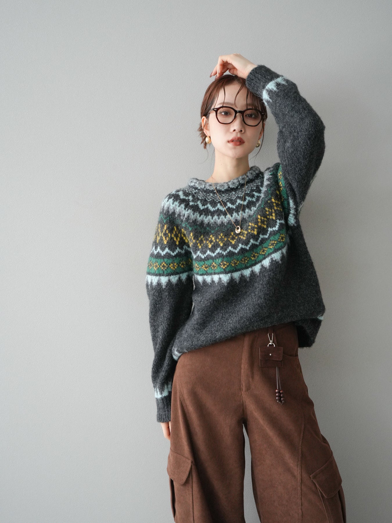 クラシカルな求心柄が目を惹くウールタッチニットプルオーバー。 ふんわりとした風合いと柔らかな肌触りで、暖かみのある着心地が魅力です。 程よくゆとりのあるオーバーシルエットが抜け感を演出し、1枚で存在感のあるスタイルに。 首元のリブデザインが程よいボリュームを与え、冬らしいムードを引き立てます。 デニムやスカートなど、カジュアルにもフェミニンにも着回せる万能ニットです。 ※ボトムス、キャミソール(インナー)以外の商品は一律でインナーは付属していません。