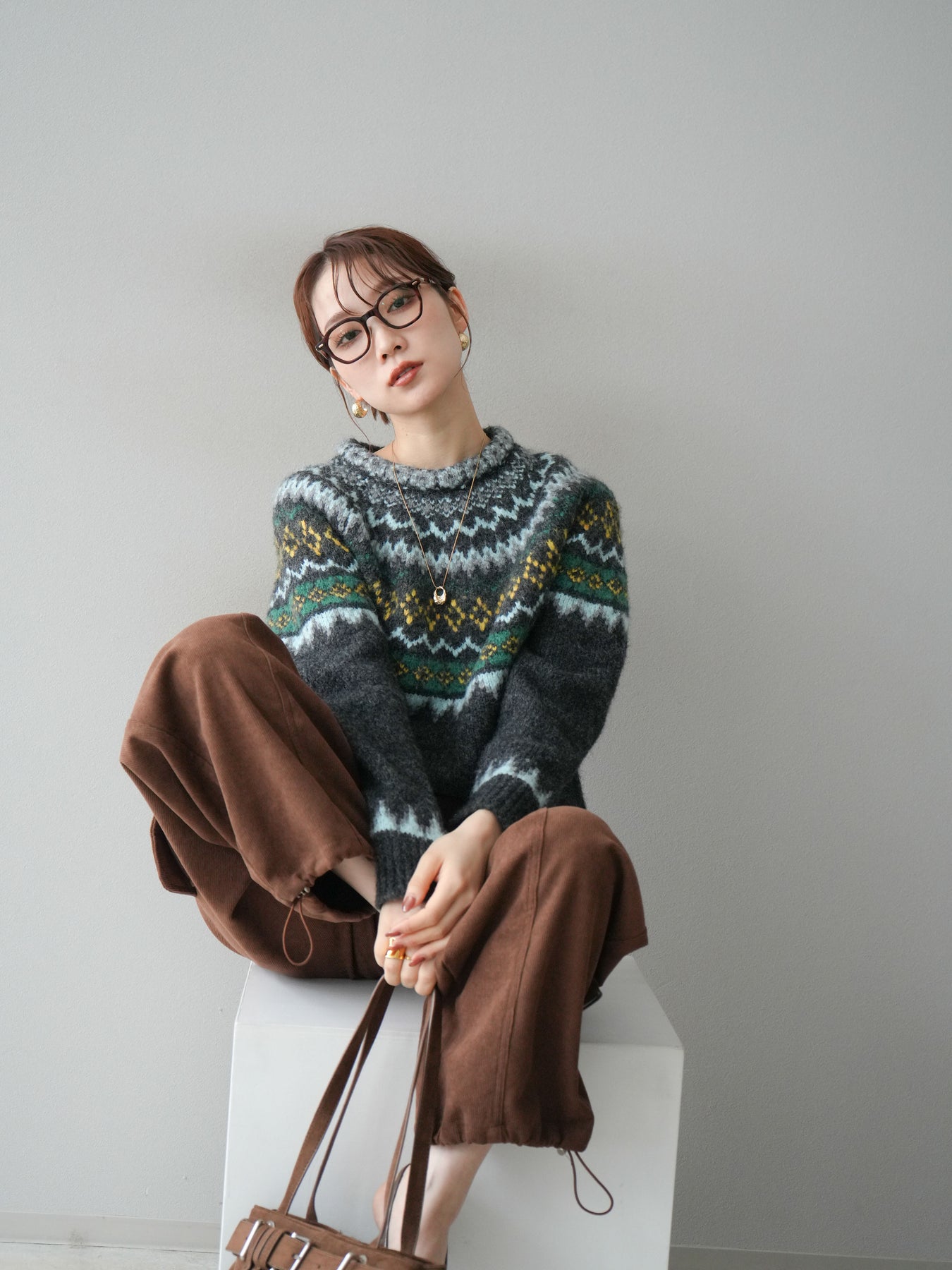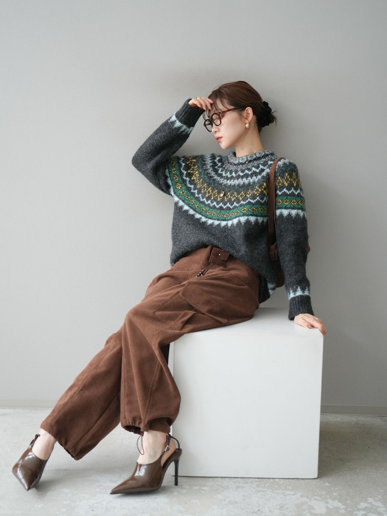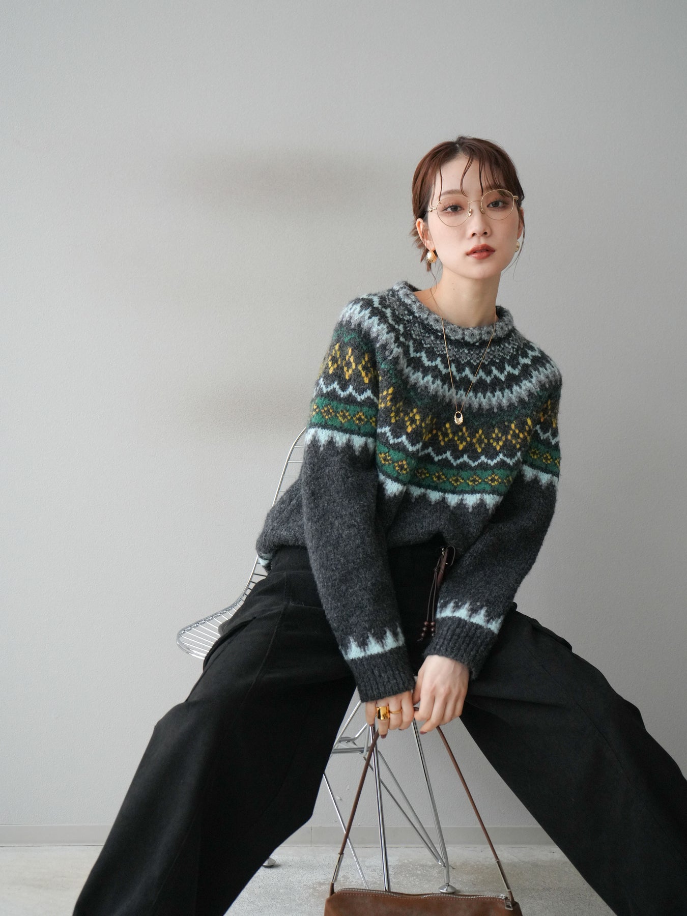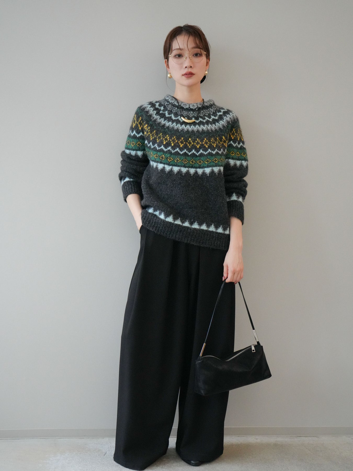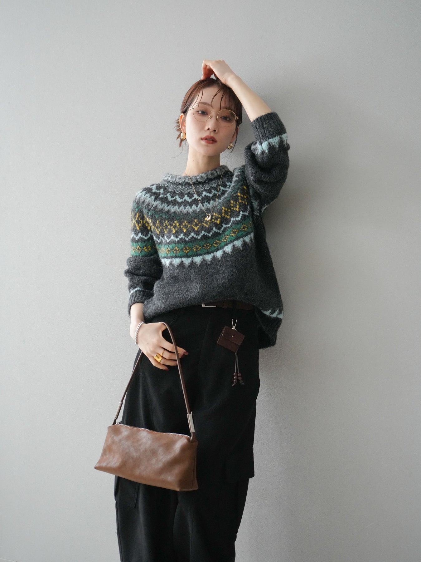 クラシカルな求心柄が目を惹くウールタッチニットプルオーバー。 ふんわりとした風合いと柔らかな肌触りで、暖かみのある着心地が魅力です。 程よくゆとりのあるオーバーシルエットが抜け感を演出し、1枚で存在感のあるスタイルに。 首元のリブデザインが程よいボリュームを与え、冬らしいムードを引き立てます。 デニムやスカートなど、カジュアルにもフェミニンにも着回せる万能ニットです。 ※ボトムス、キャミソール(インナー)以外の商品は一律でインナーは付属していません。