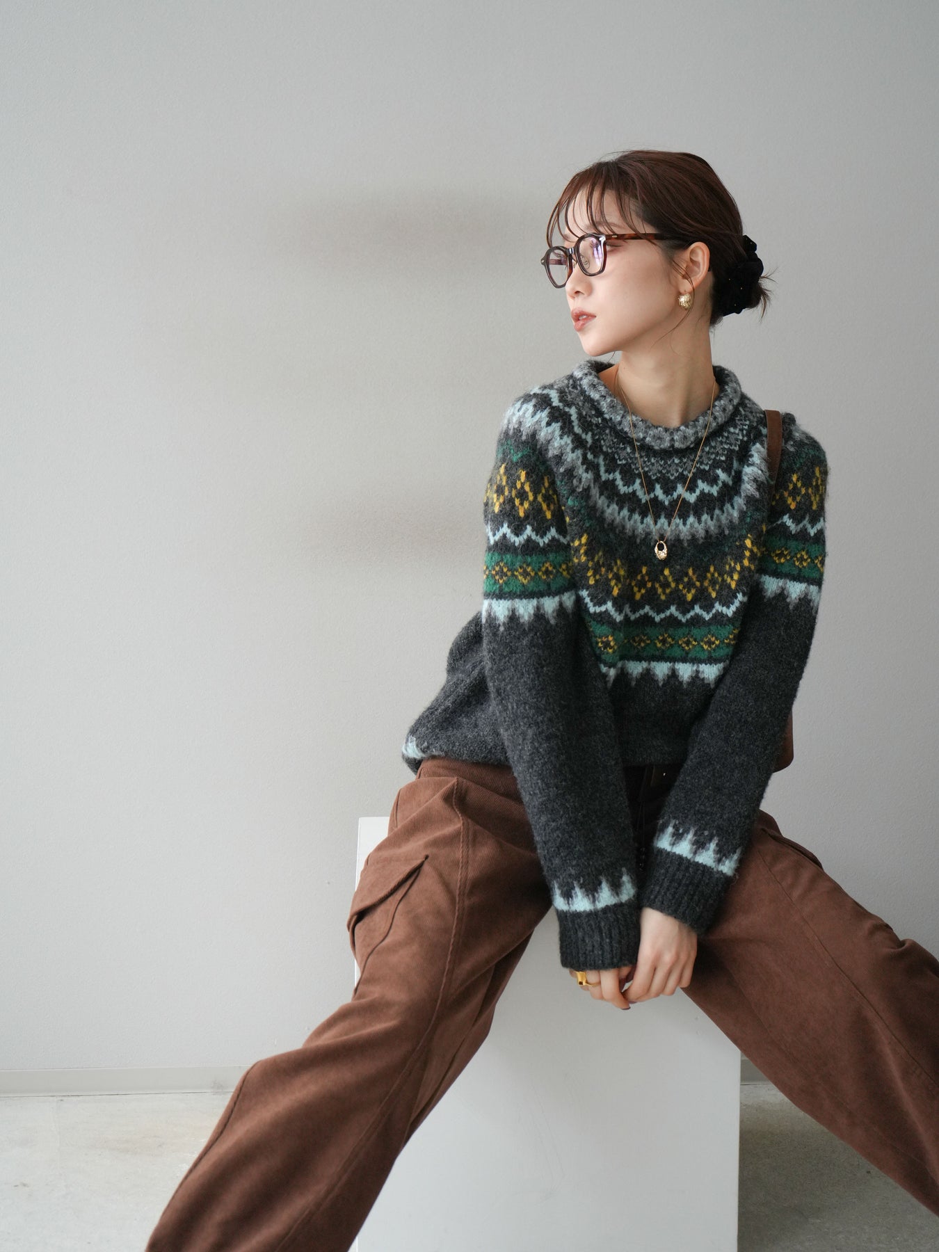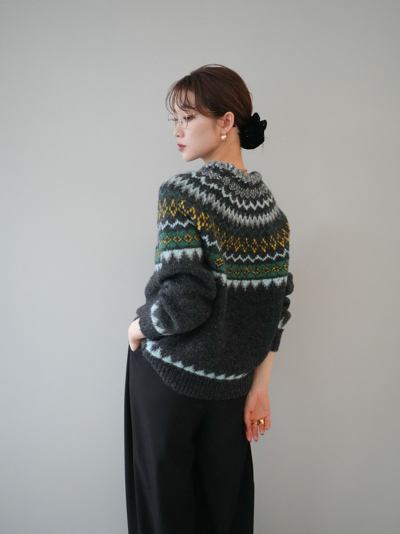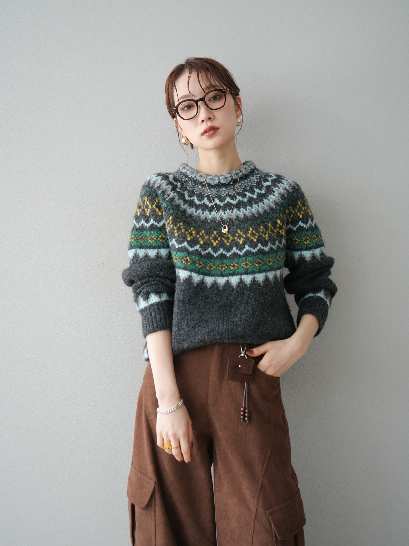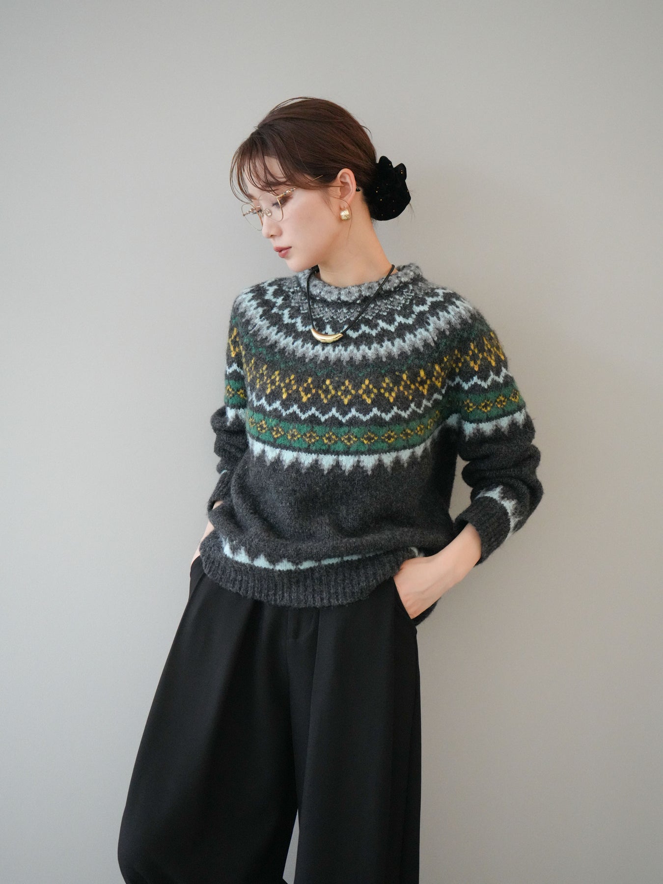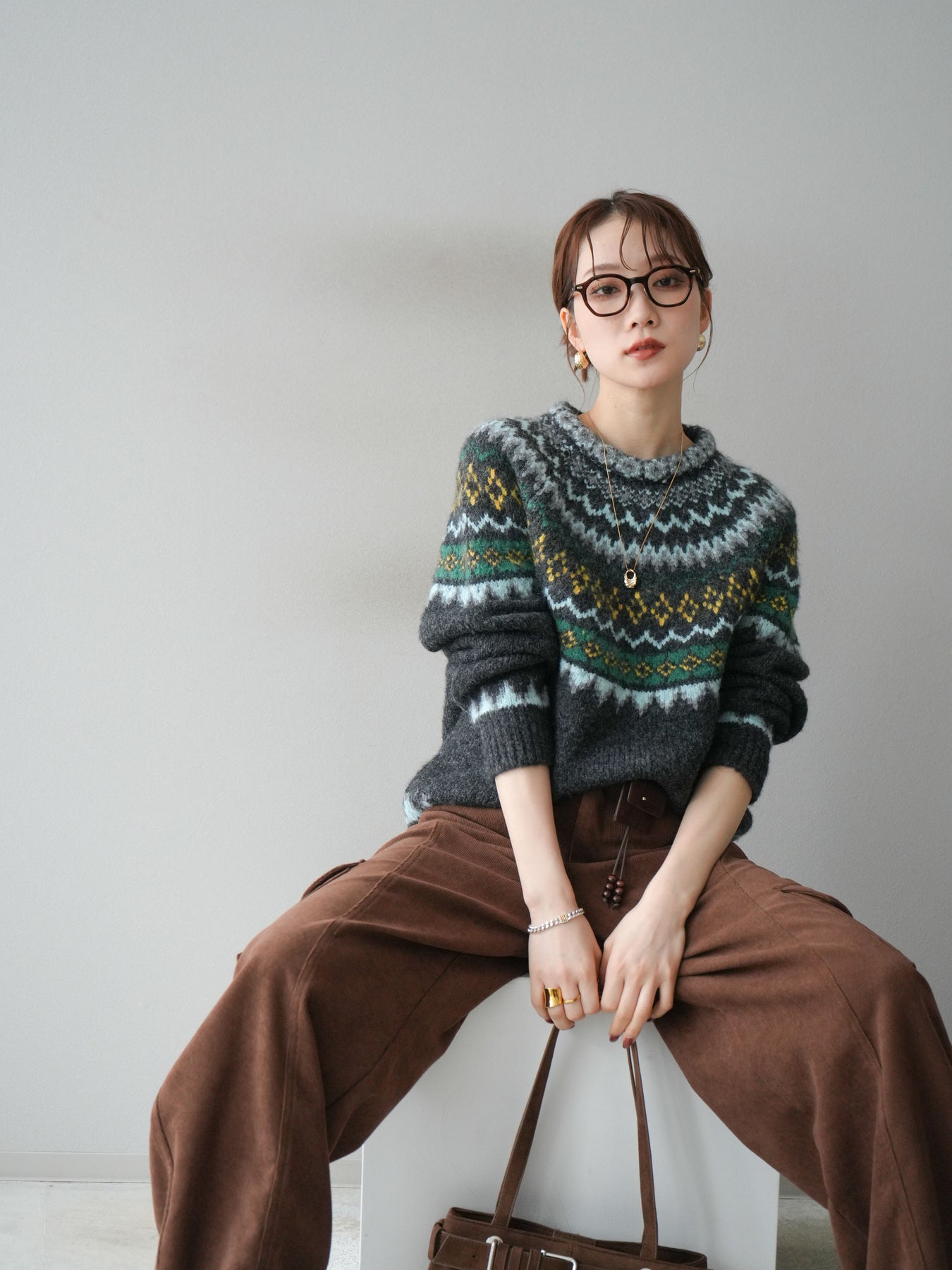 クラシカルな求心柄が目を惹くウールタッチニットプルオーバー。 ふんわりとした風合いと柔らかな肌触りで、暖かみのある着心地が魅力です。 程よくゆとりのあるオーバーシルエットが抜け感を演出し、1枚で存在感のあるスタイルに。 首元のリブデザインが程よいボリュームを与え、冬らしいムードを引き立てます。 デニムやスカートなど、カジュアルにもフェミニンにも着回せる万能ニットです。 ※ボトムス、キャミソール(インナー)以外の商品は一律でインナーは付属していません。