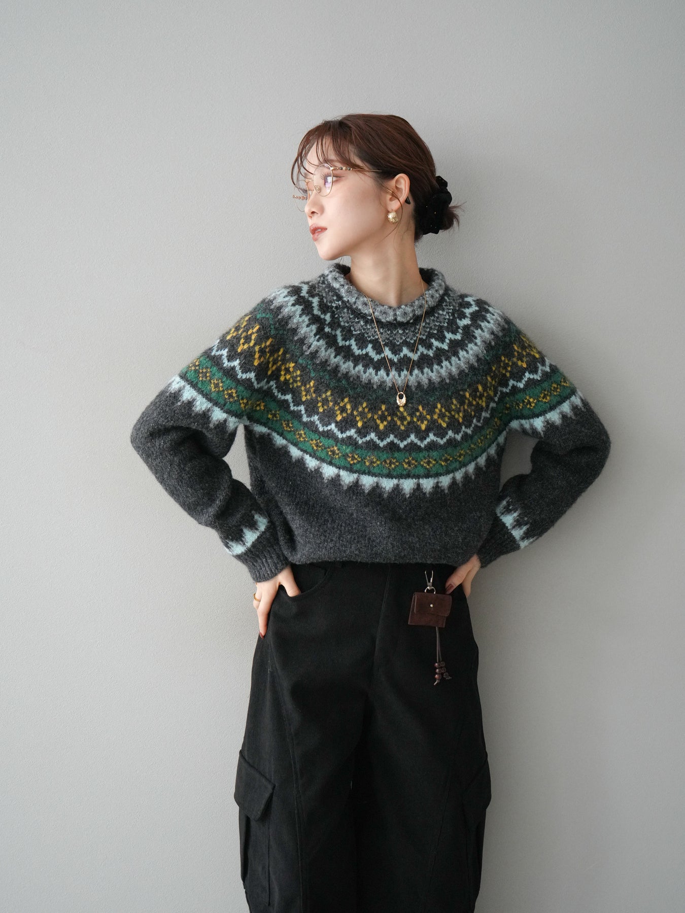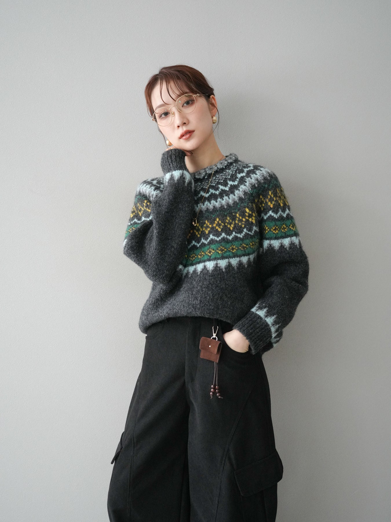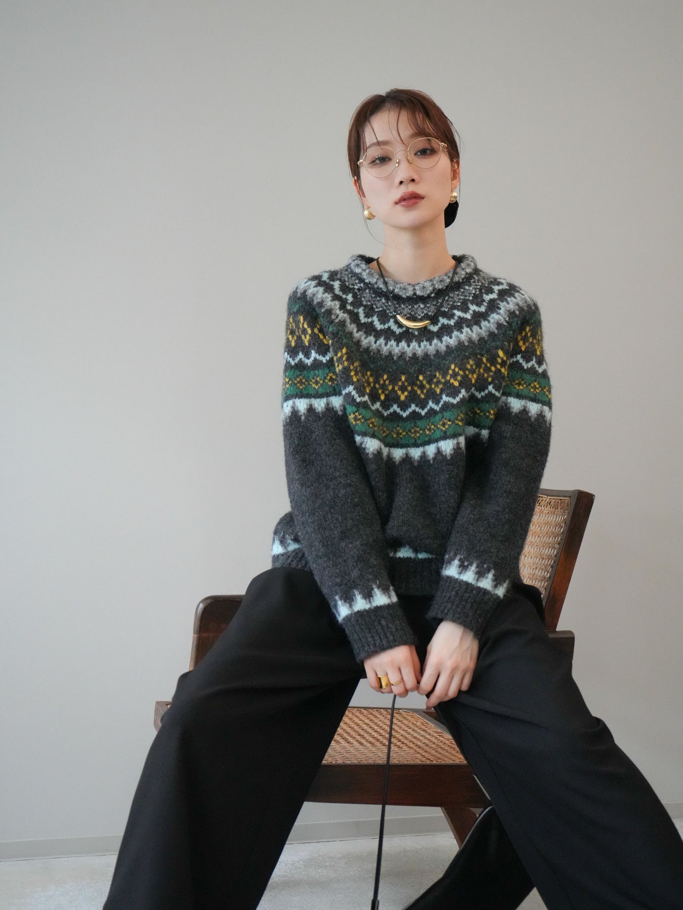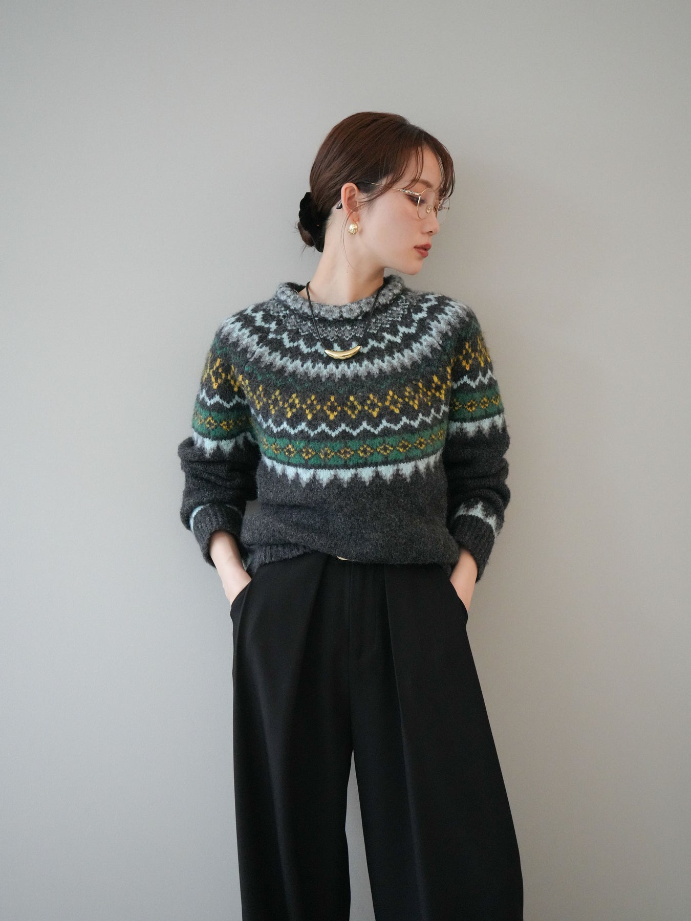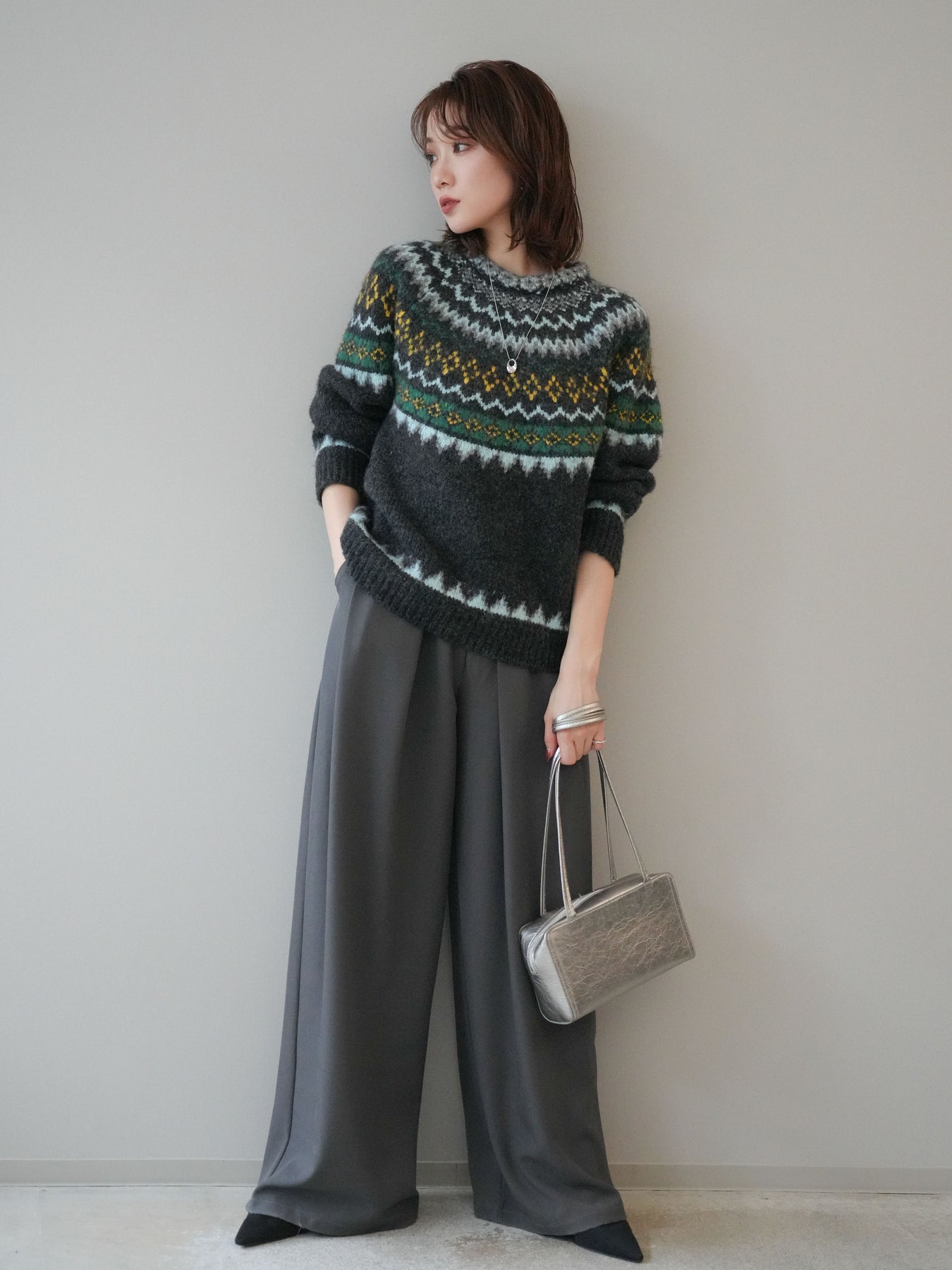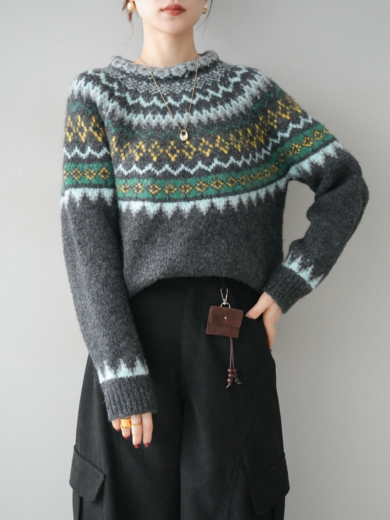 クラシカルな求心柄が目を惹くウールタッチニットプルオーバー。 ふんわりとした風合いと柔らかな肌触りで、暖かみのある着心地が魅力です。 程よくゆとりのあるオーバーシルエットが抜け感を演出し、1枚で存在感のあるスタイルに。 首元のリブデザインが程よいボリュームを与え、冬らしいムードを引き立てます。 デニムやスカートなど、カジュアルにもフェミニンにも着回せる万能ニットです。 ※ボトムス、キャミソール(インナー)以外の商品は一律でインナーは付属していません。