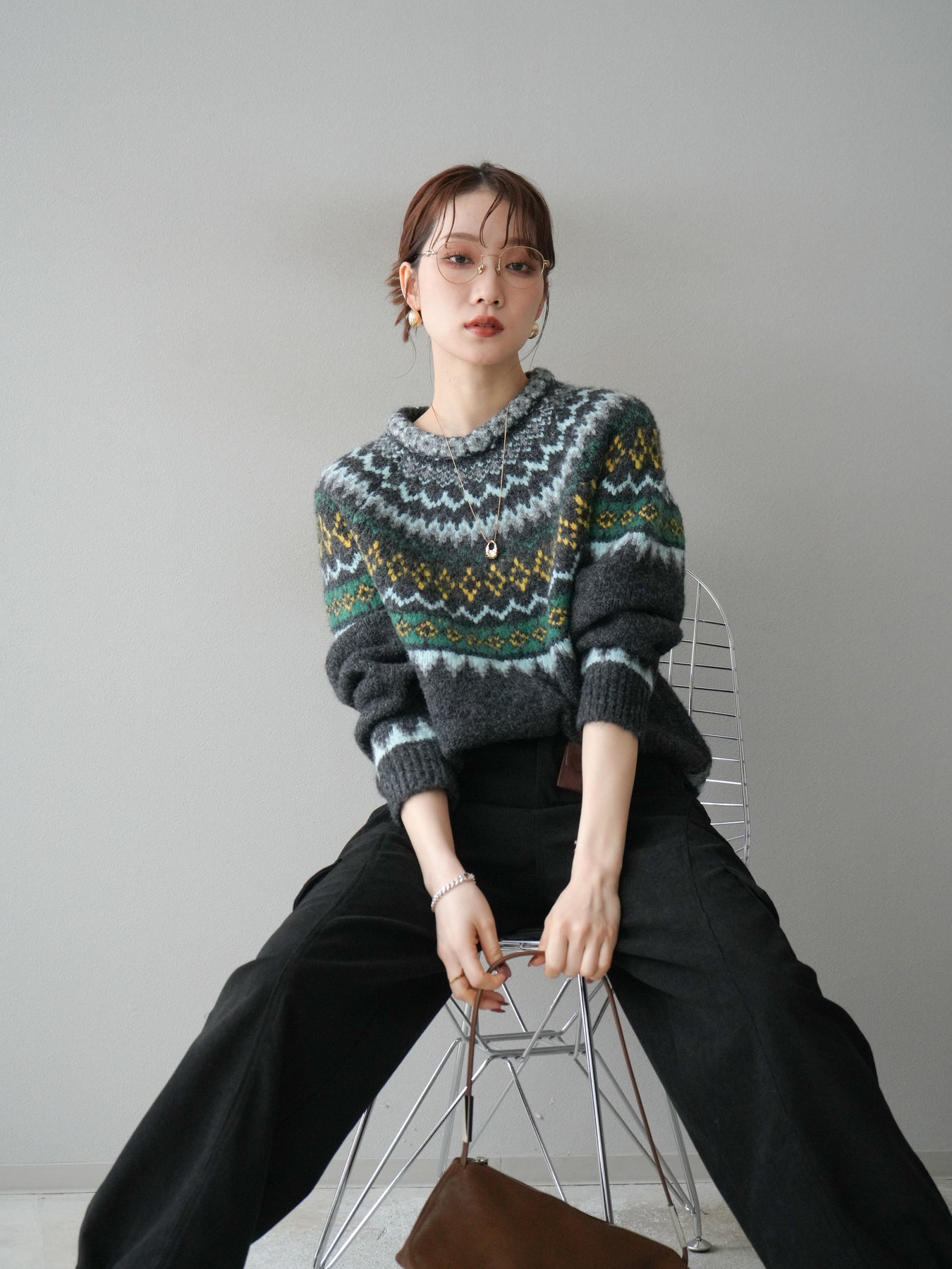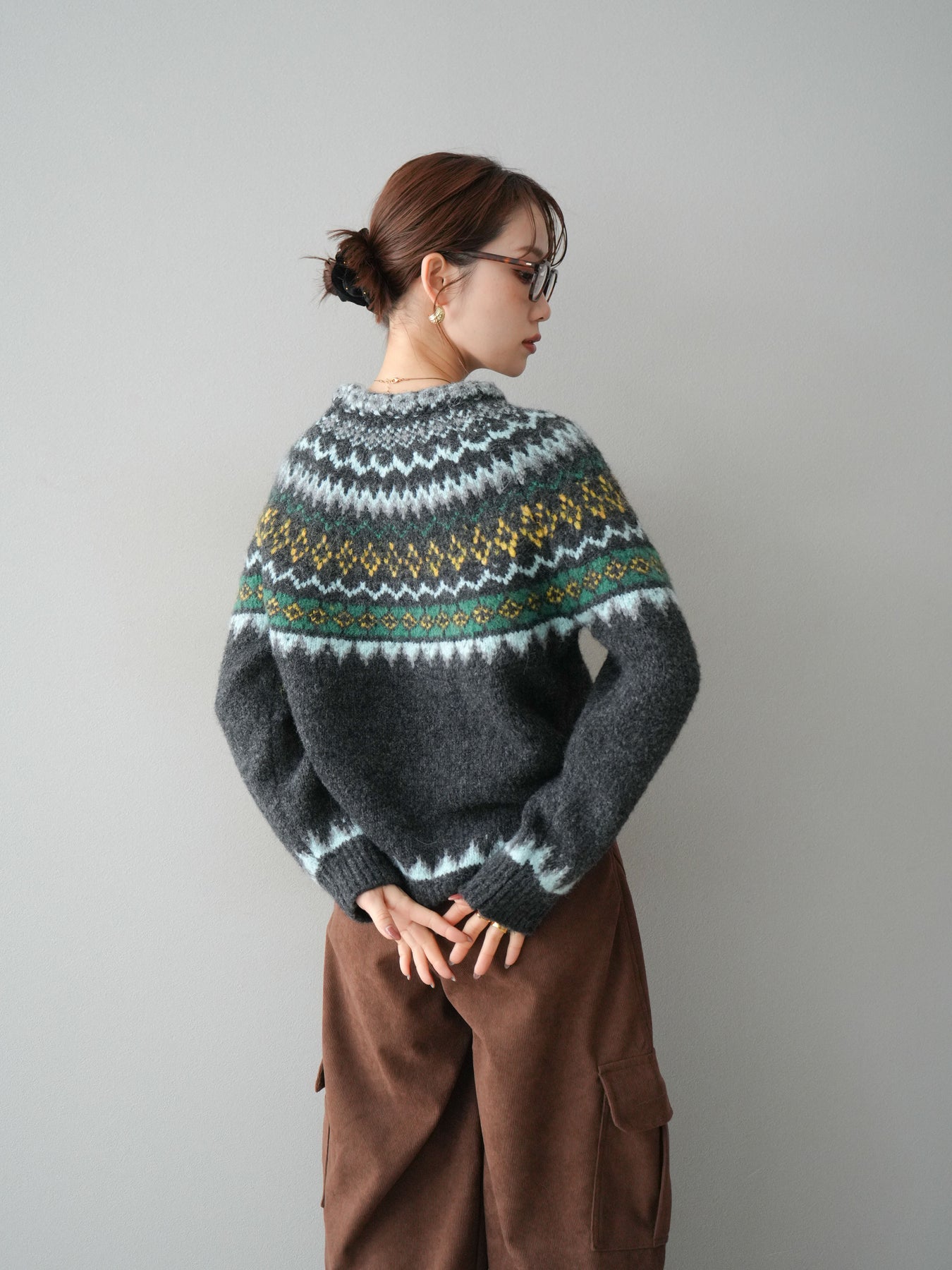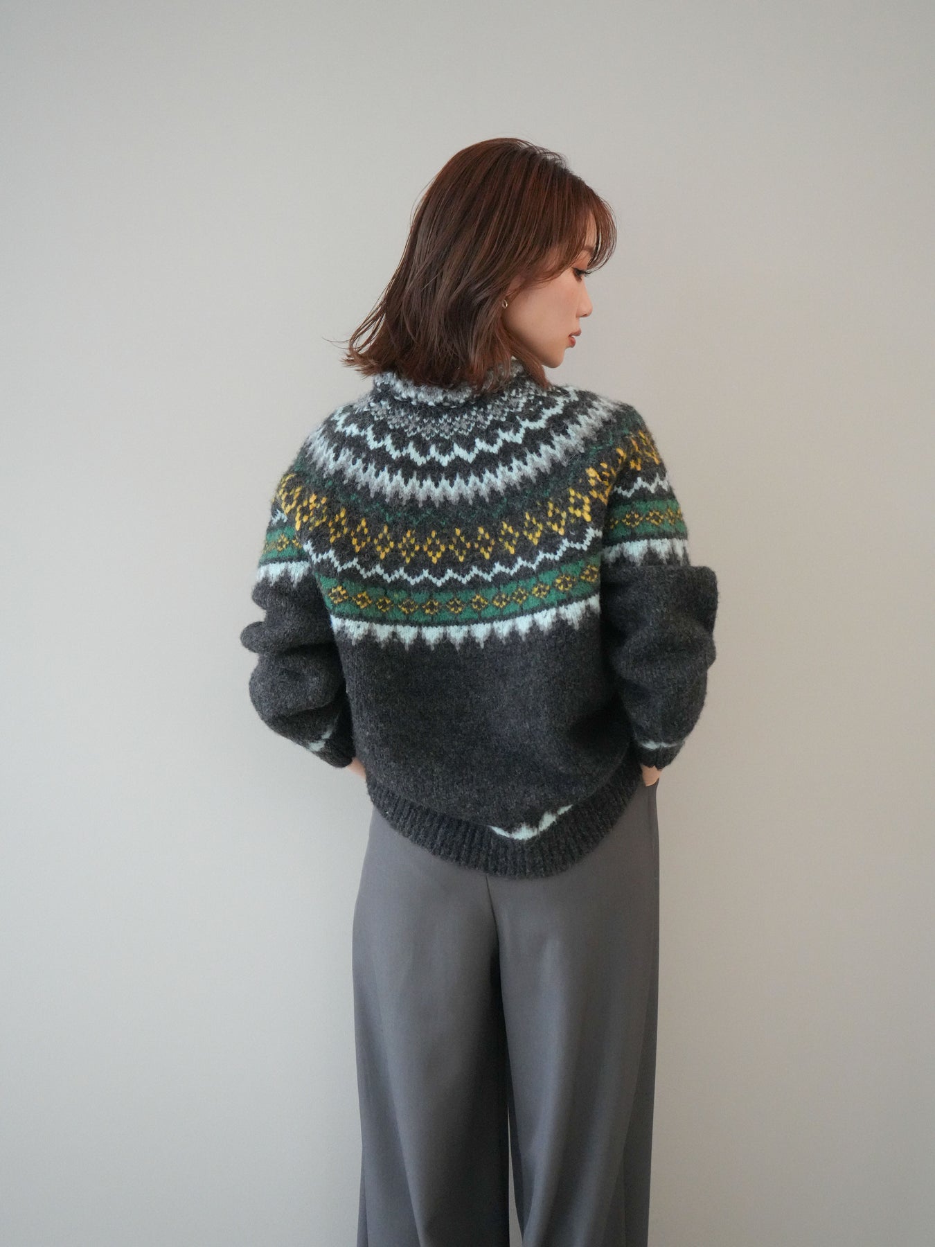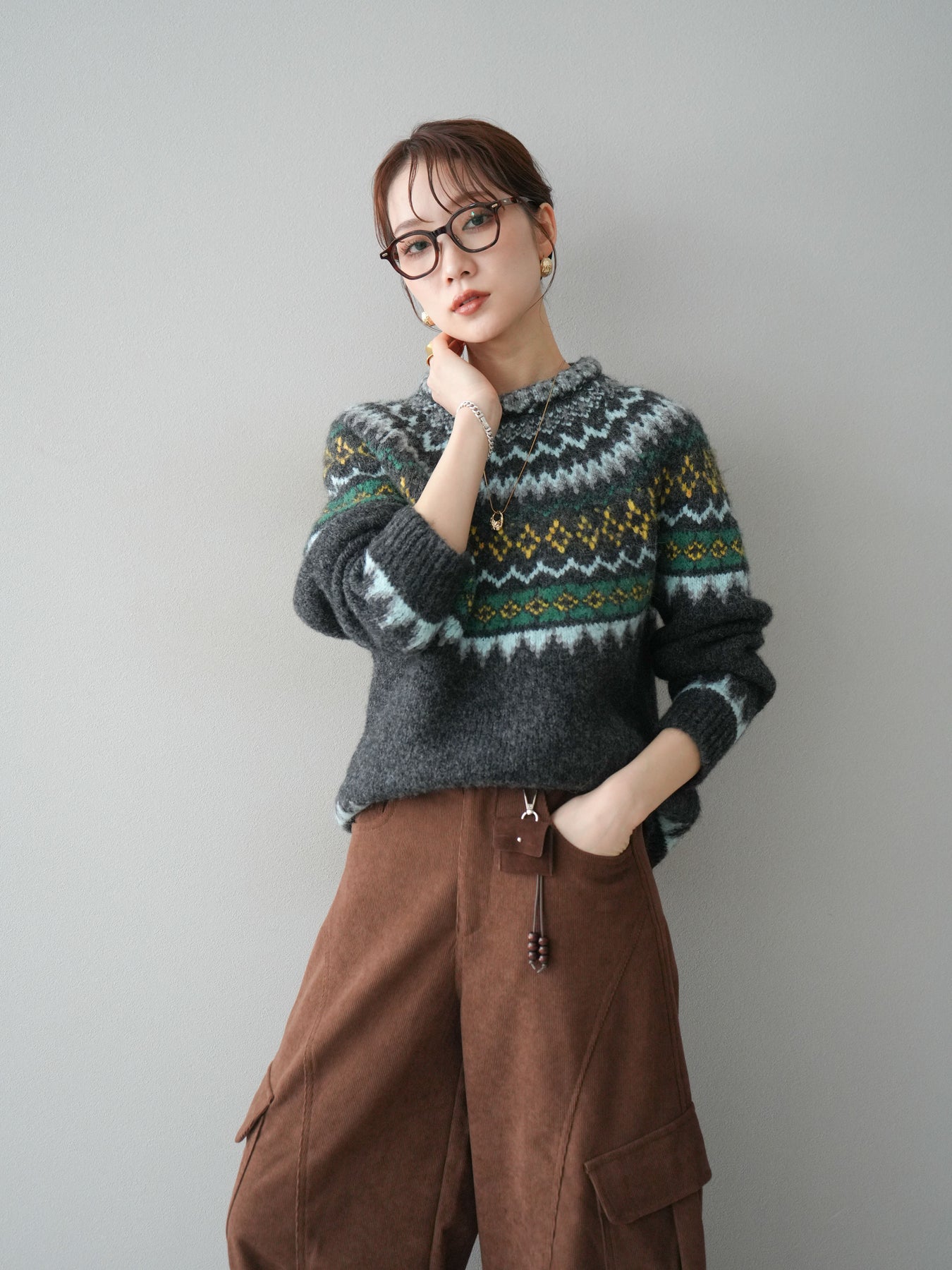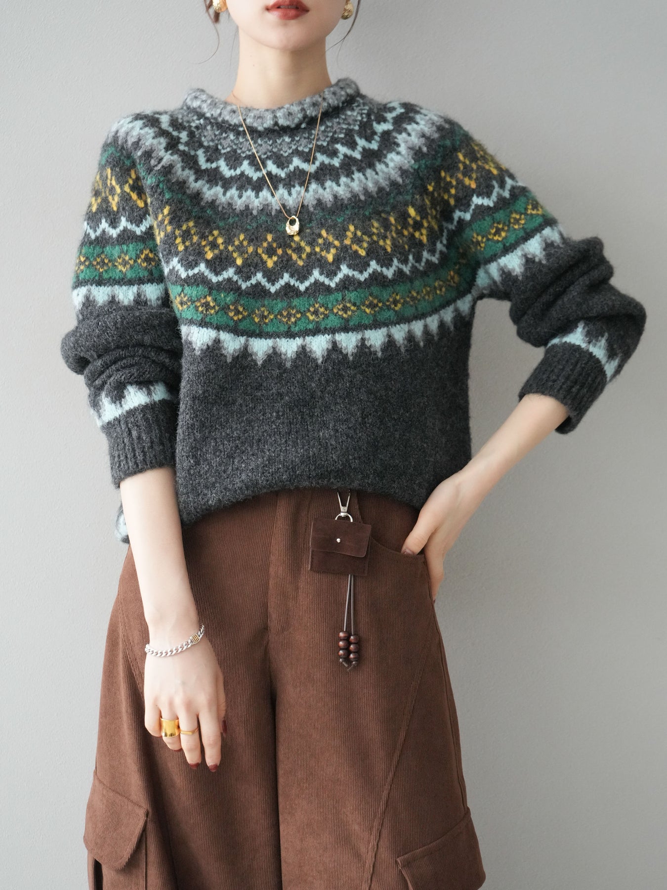 クラシカルな求心柄が目を惹くウールタッチニットプルオーバー。 ふんわりとした風合いと柔らかな肌触りで、暖かみのある着心地が魅力です。 程よくゆとりのあるオーバーシルエットが抜け感を演出し、1枚で存在感のあるスタイルに。 首元のリブデザインが程よいボリュームを与え、冬らしいムードを引き立てます。 デニムやスカートなど、カジュアルにもフェミニンにも着回せる万能ニットです。 ※ボトムス、キャミソール(インナー)以外の商品は一律でインナーは付属していません。