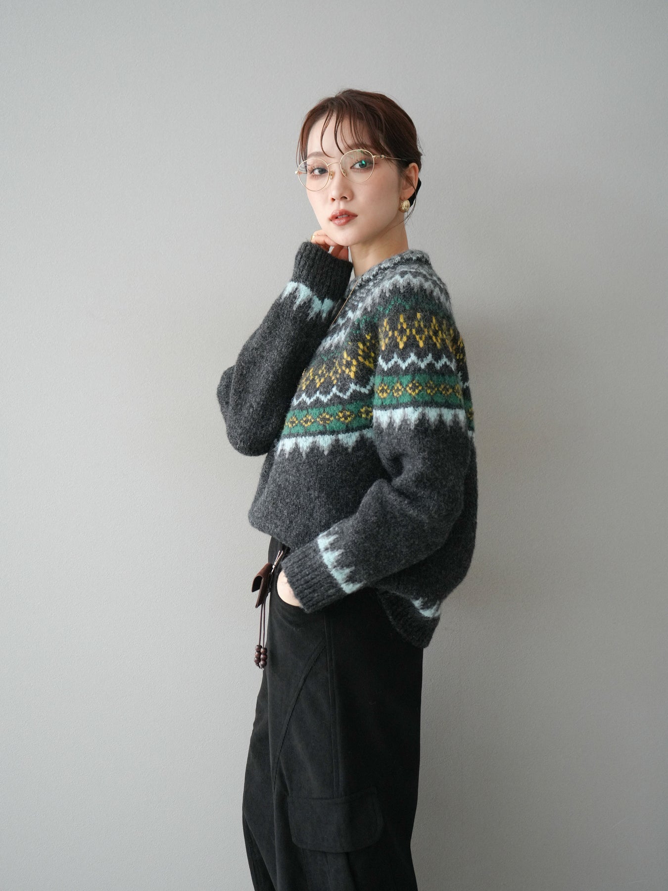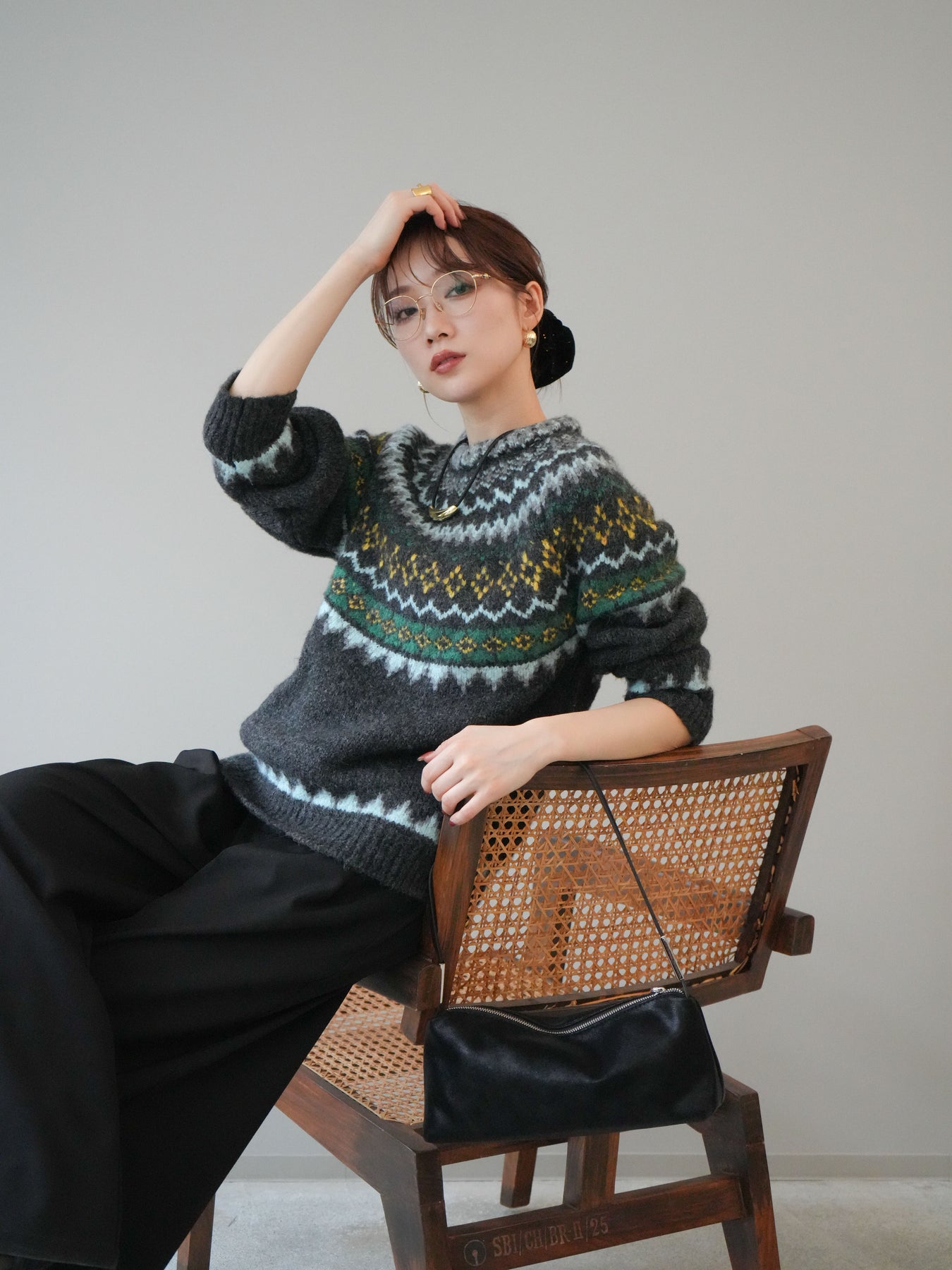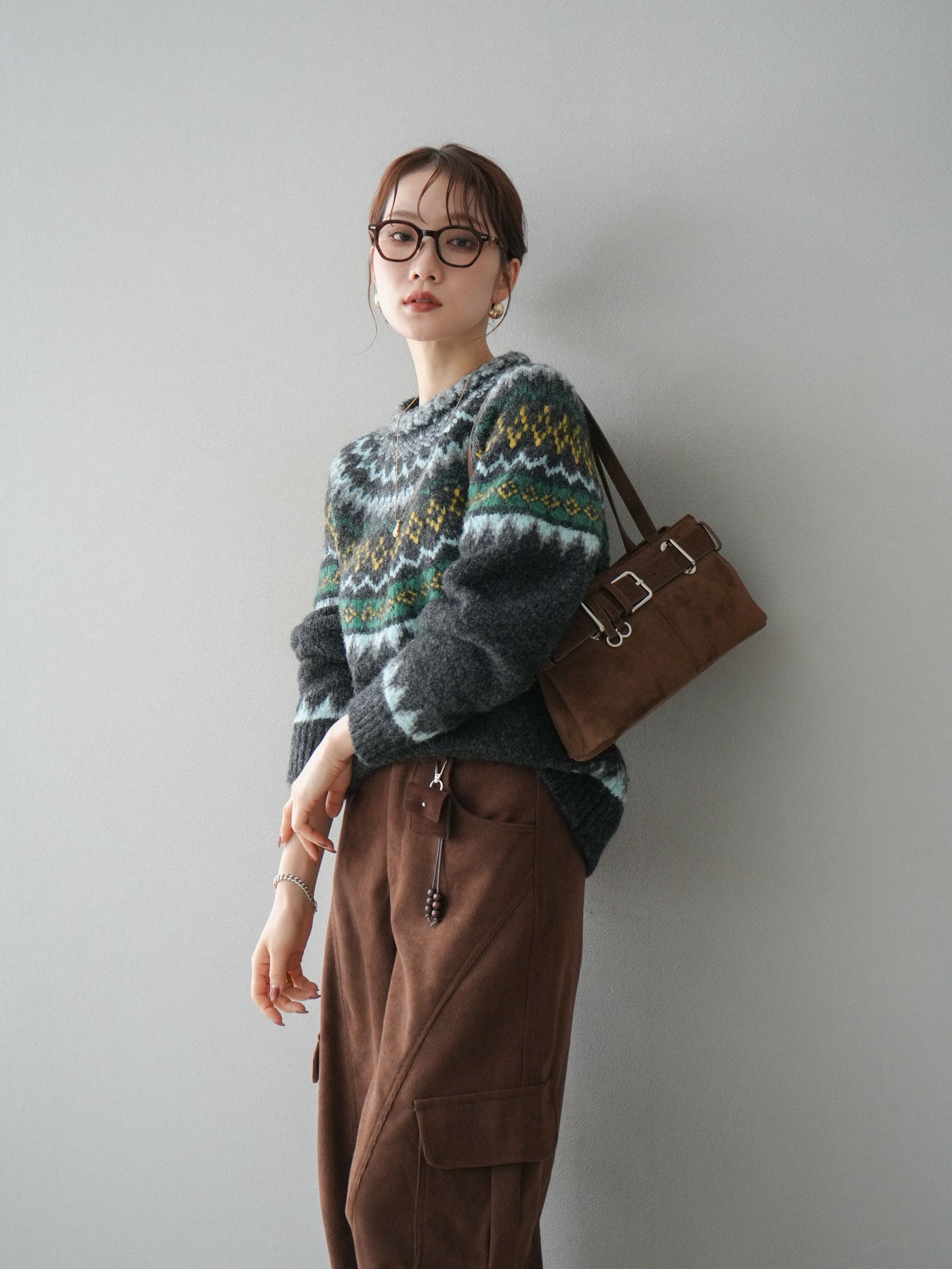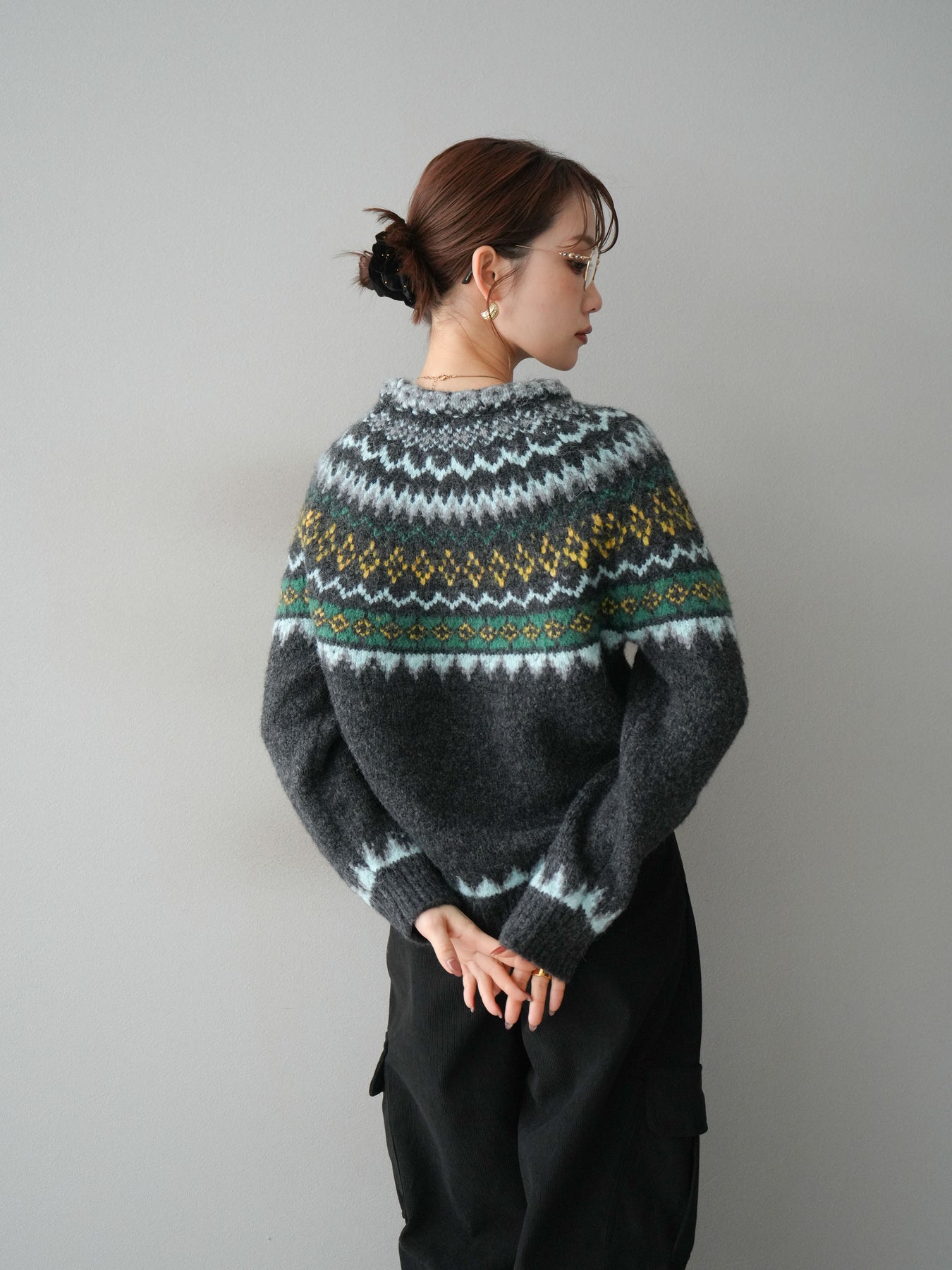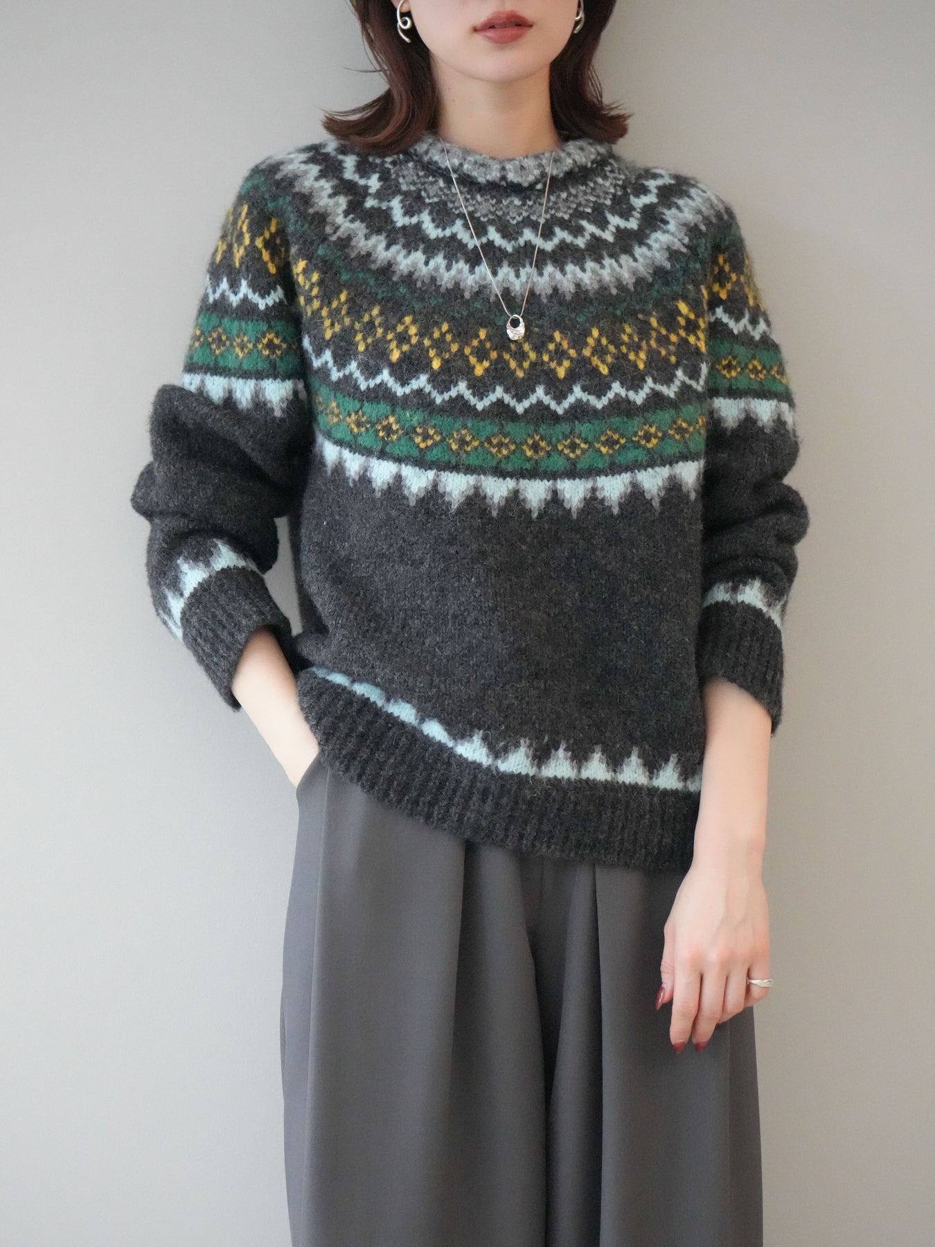 クラシカルな求心柄が目を惹くウールタッチニットプルオーバー。 ふんわりとした風合いと柔らかな肌触りで、暖かみのある着心地が魅力です。 程よくゆとりのあるオーバーシルエットが抜け感を演出し、1枚で存在感のあるスタイルに。 首元のリブデザインが程よいボリュームを与え、冬らしいムードを引き立てます。 デニムやスカートなど、カジュアルにもフェミニンにも着回せる万能ニットです。 ※ボトムス、キャミソール(インナー)以外の商品は一律でインナーは付属していません。