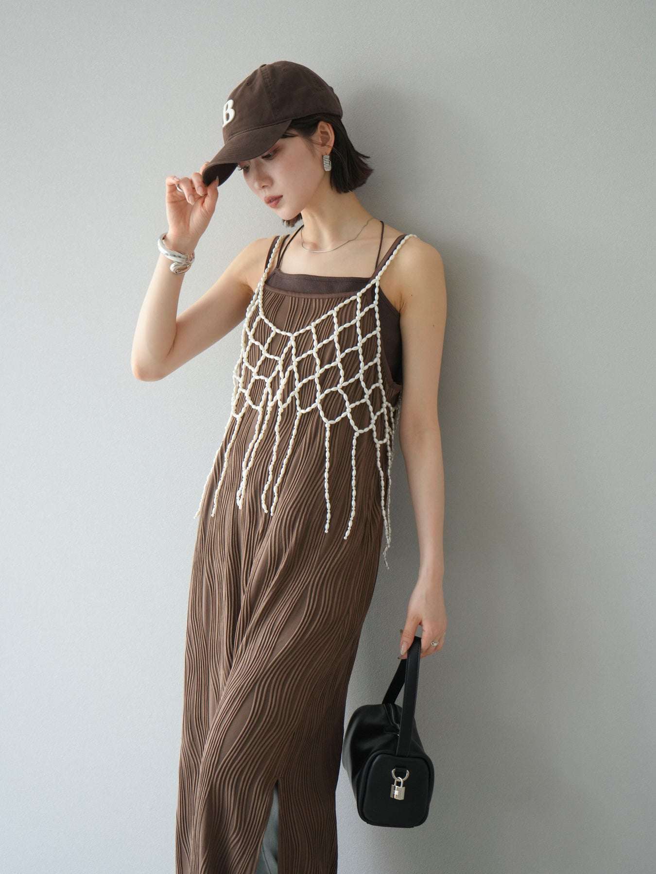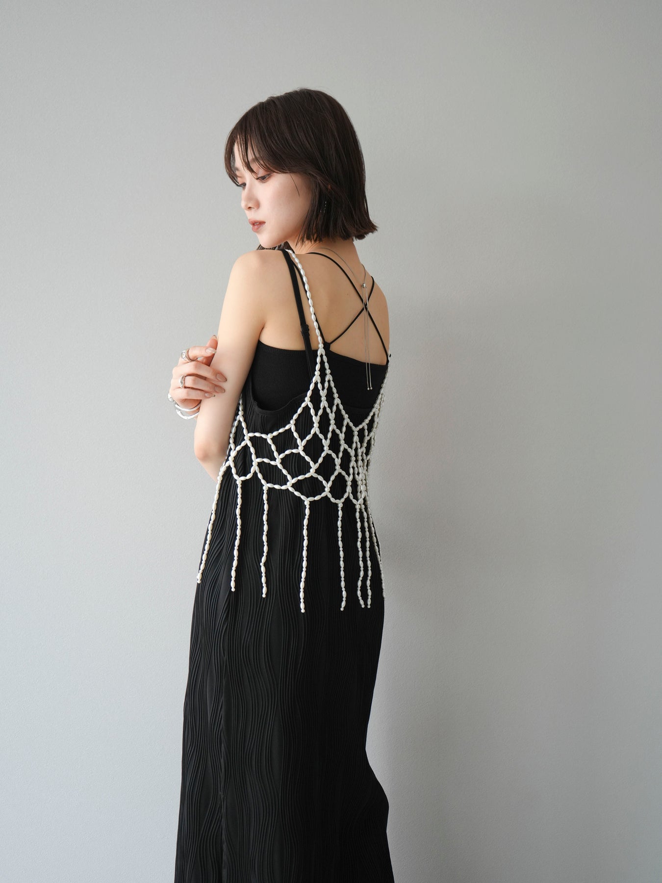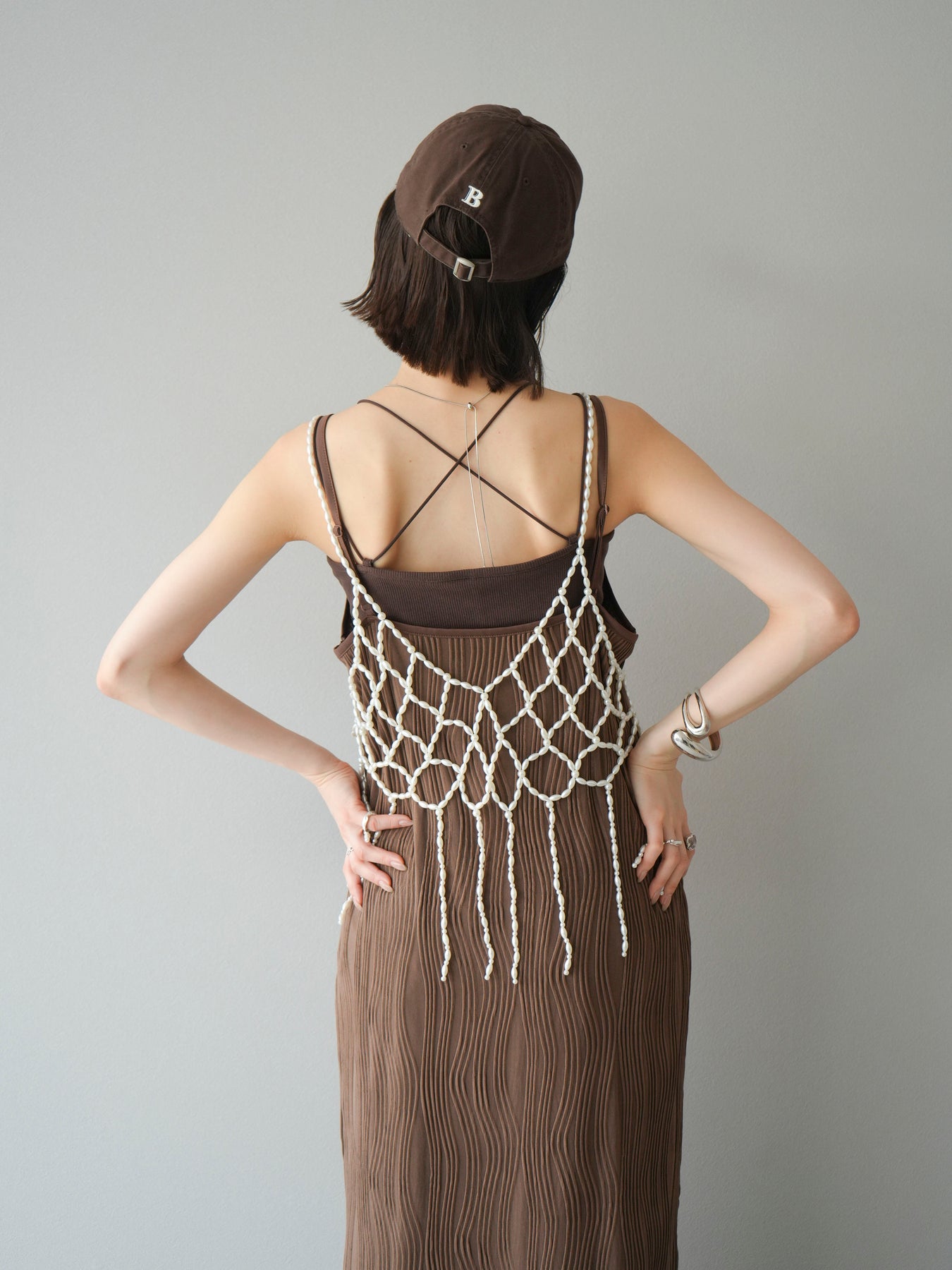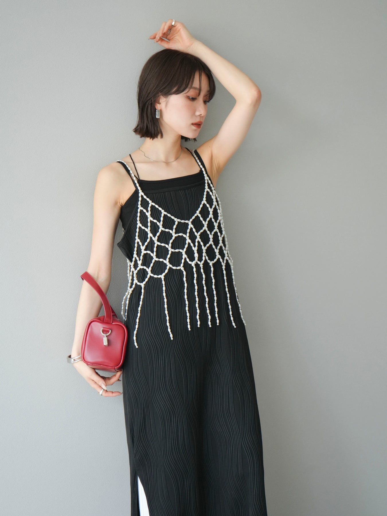 繊細なパールで編み上げたフリンジディテールが目を惹く、パールフリンジビスチェ。華奢なループ状のストラップと透け感のあるメッシュ状のデザインが、コーディネートに立体感と華やかさをプラスします。シンプルなTシャツやキャミソールの上に重ねるだけで、ぐっとモード感のあるスタイリングに。軽やかでアクセサリー感覚で使えるデザインは、デイリーからドレスアップスタイルまで幅広く活躍します。トレンドのレイヤードコーデに欠かせない、主役級のビスチェです。 ※ボトムス、キャミソール(インナー)以外の商品は一律でインナーは付属していません。