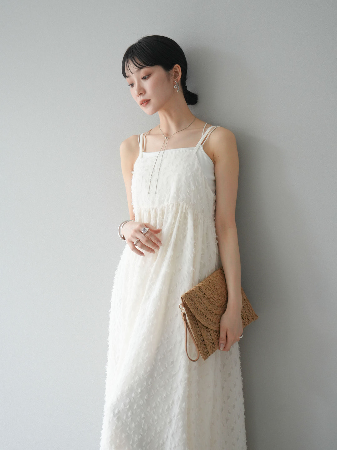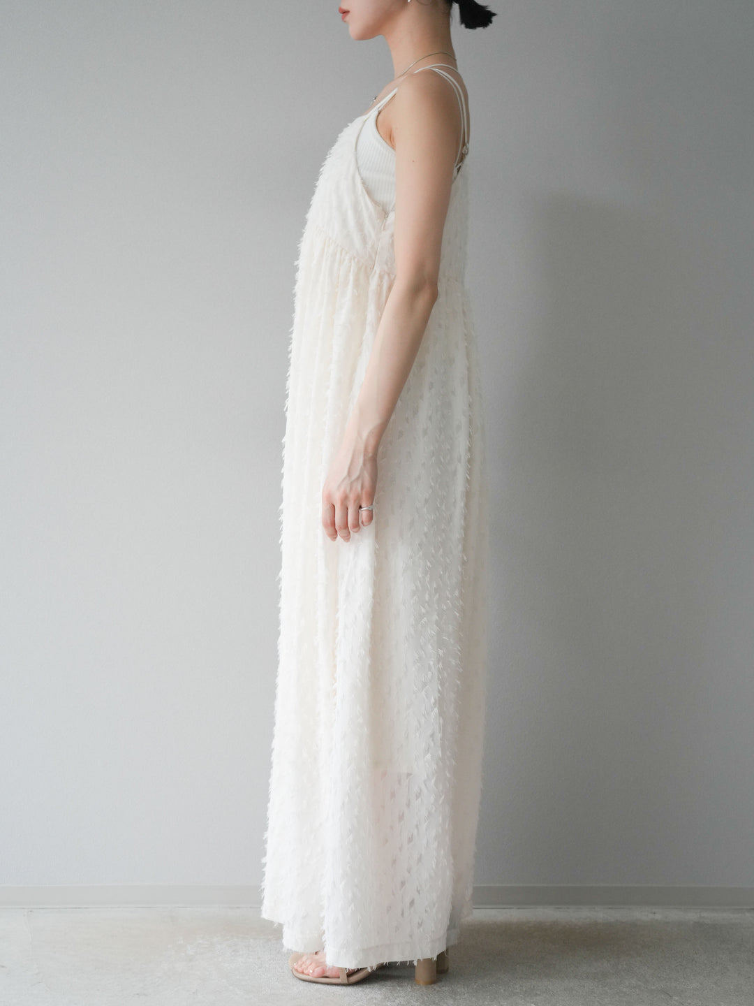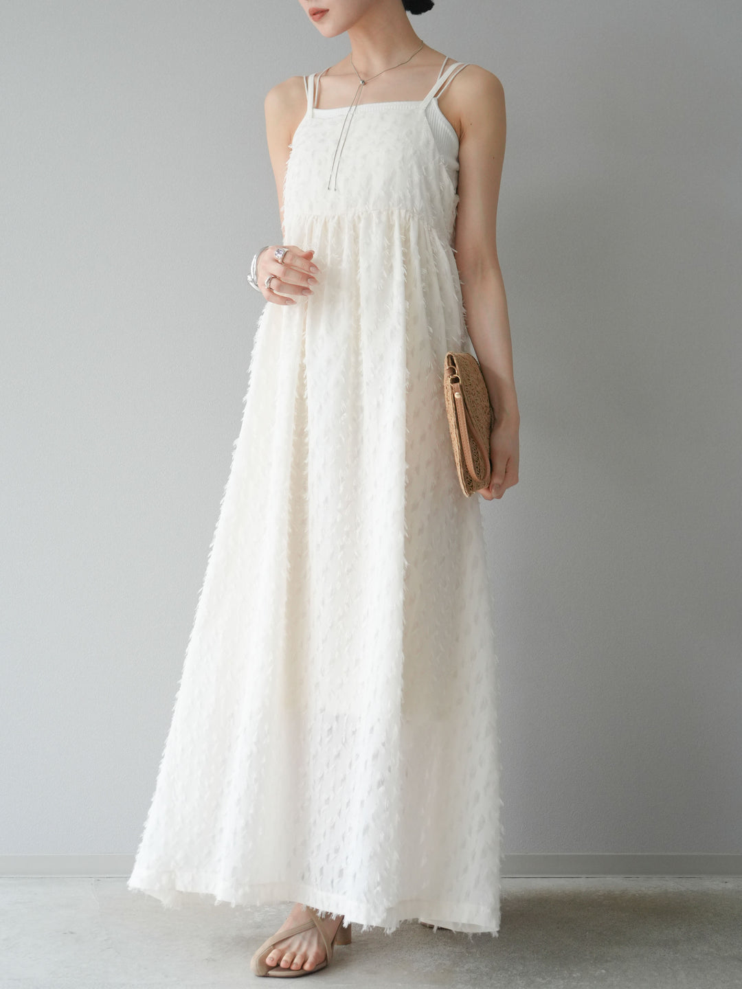 トレンド感あふれるフリンジジャガード素材を使用したキャミワンピース。繊細なフリンジが動くたびに表情を生み、華やかさをプラスします。二重の華奢なストラップが女性らしさを引き立て、リラックス感のあるシルエットが魅力。1枚ではもちろん、インナーや羽織りとレイヤードして着こなすのもおすすめです。デイリーから特別なシーンまで幅広く活躍します。 ※ボトムス、キャミソール(インナー)以外の商品は一律でインナーは付属していません