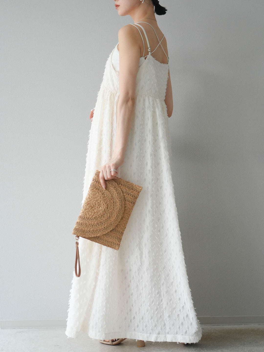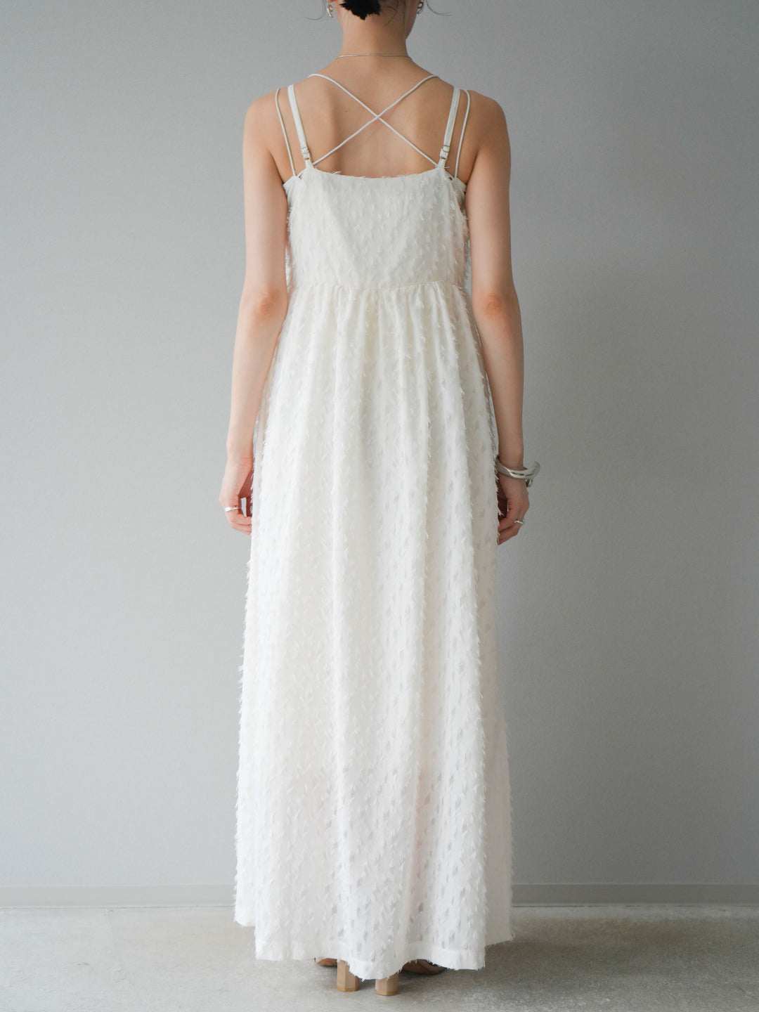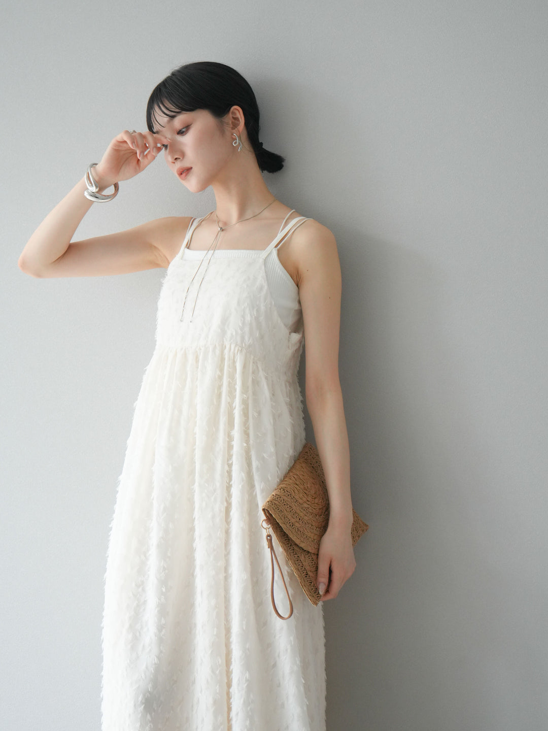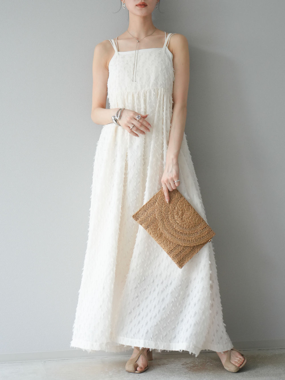 トレンド感あふれるフリンジジャガード素材を使用したキャミワンピース。繊細なフリンジが動くたびに表情を生み、華やかさをプラスします。二重の華奢なストラップが女性らしさを引き立て、リラックス感のあるシルエットが魅力。1枚ではもちろん、インナーや羽織りとレイヤードして着こなすのもおすすめです。デイリーから特別なシーンまで幅広く活躍します。 ※ボトムス、キャミソール(インナー)以外の商品は一律でインナーは付属していません