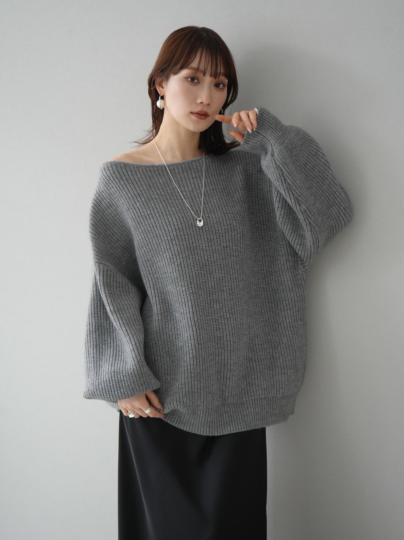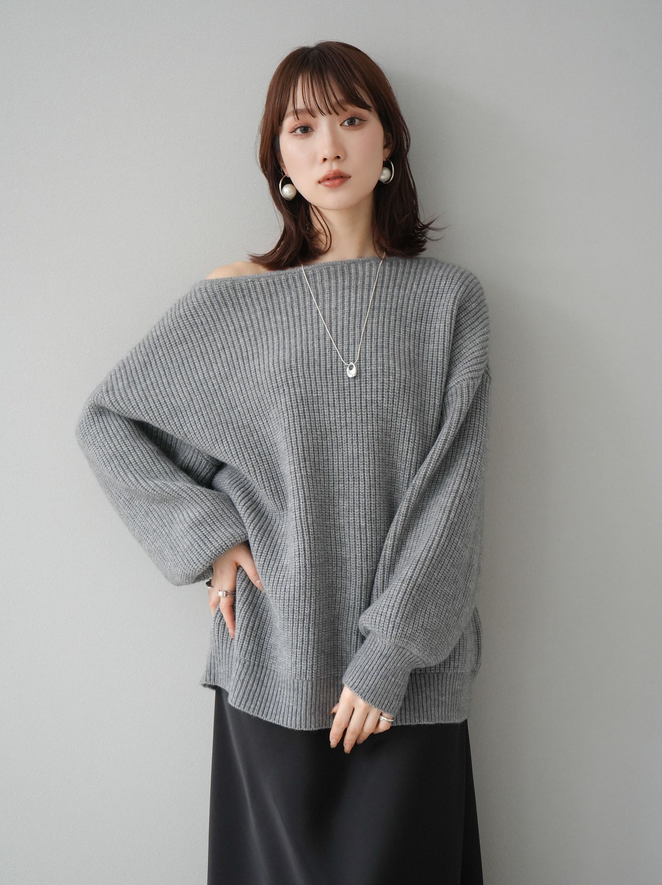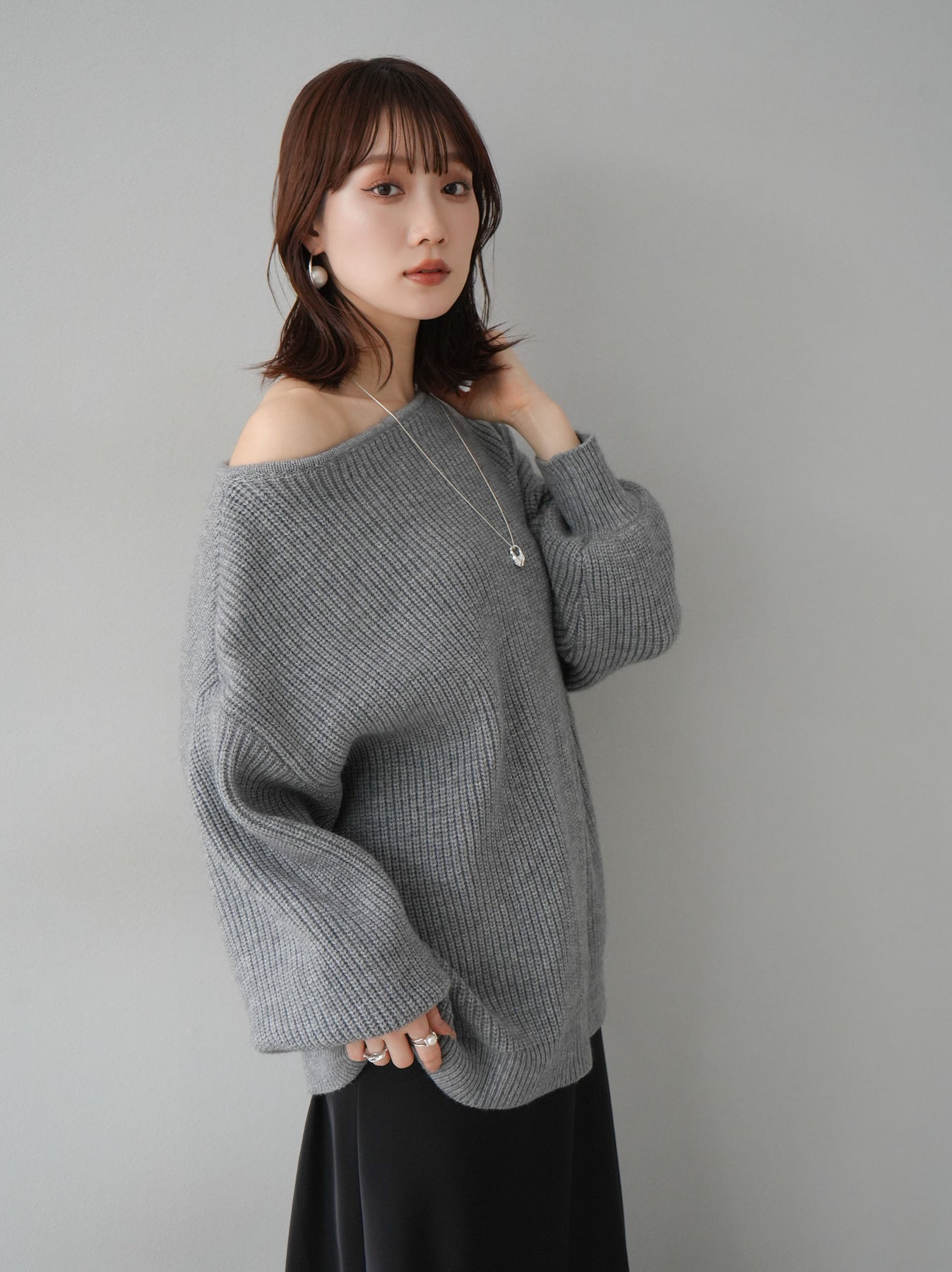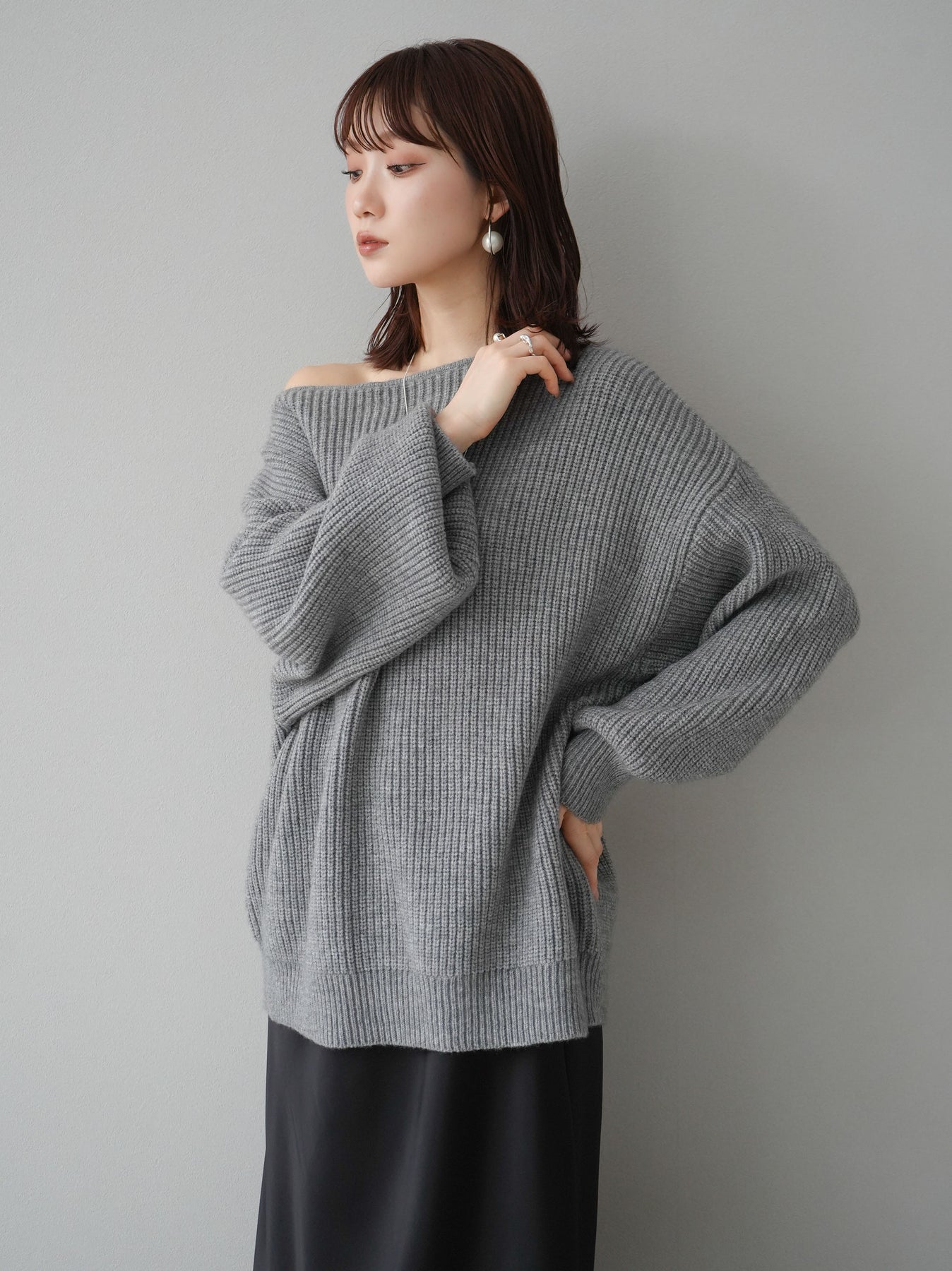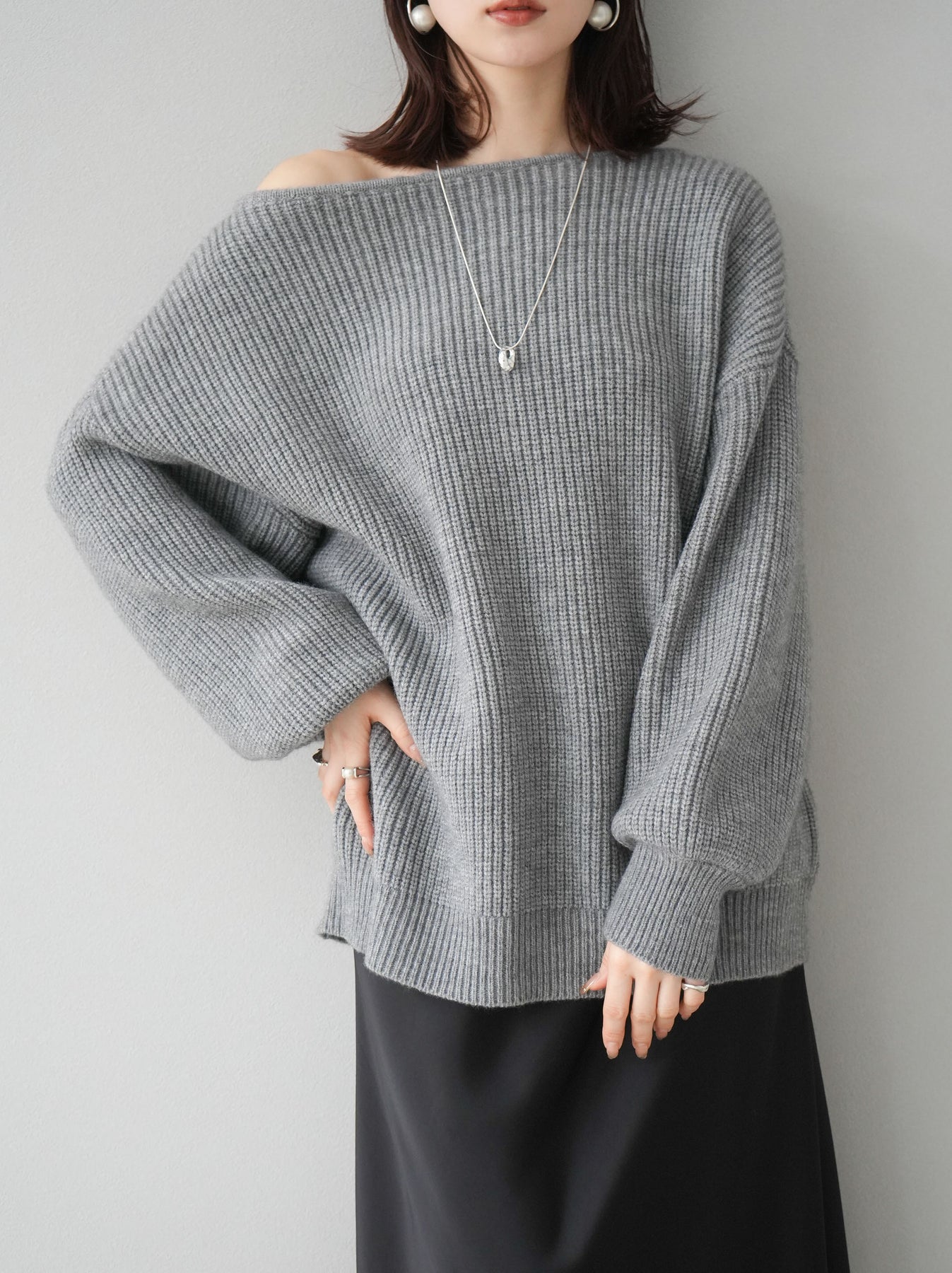 [予約]アルパカタッチオフショルオーバーニットプルオーバー/杢グレー