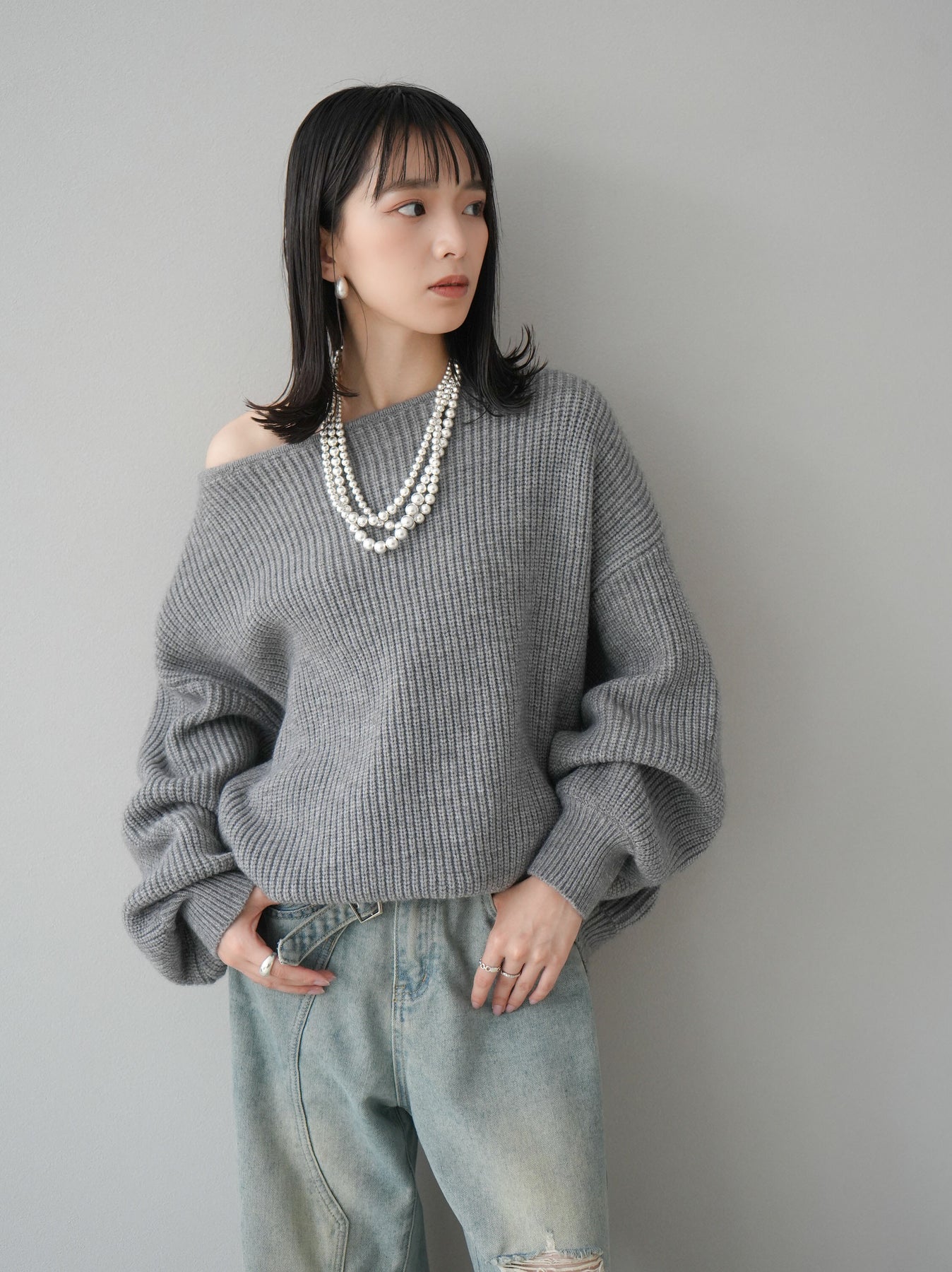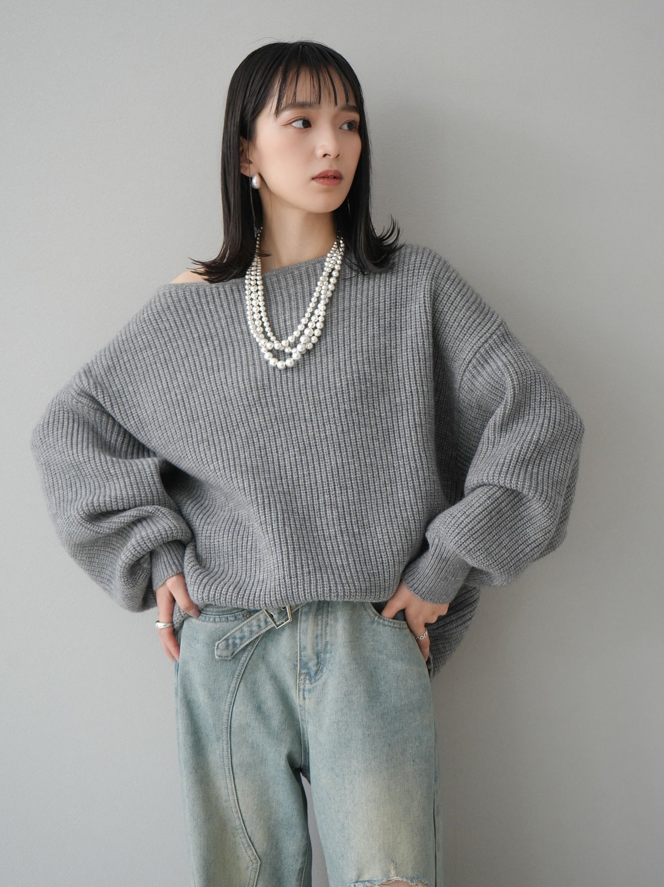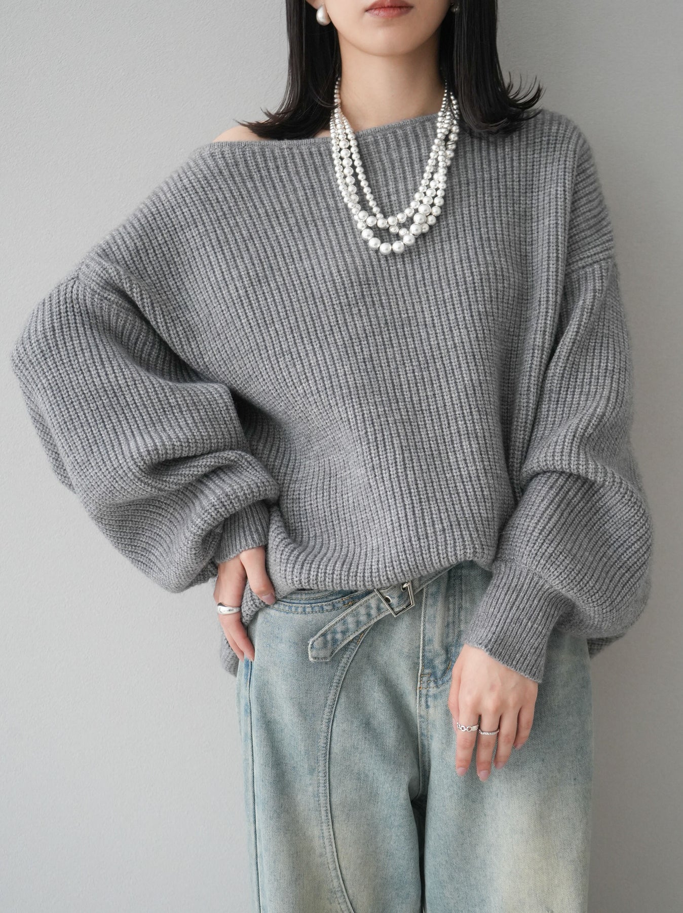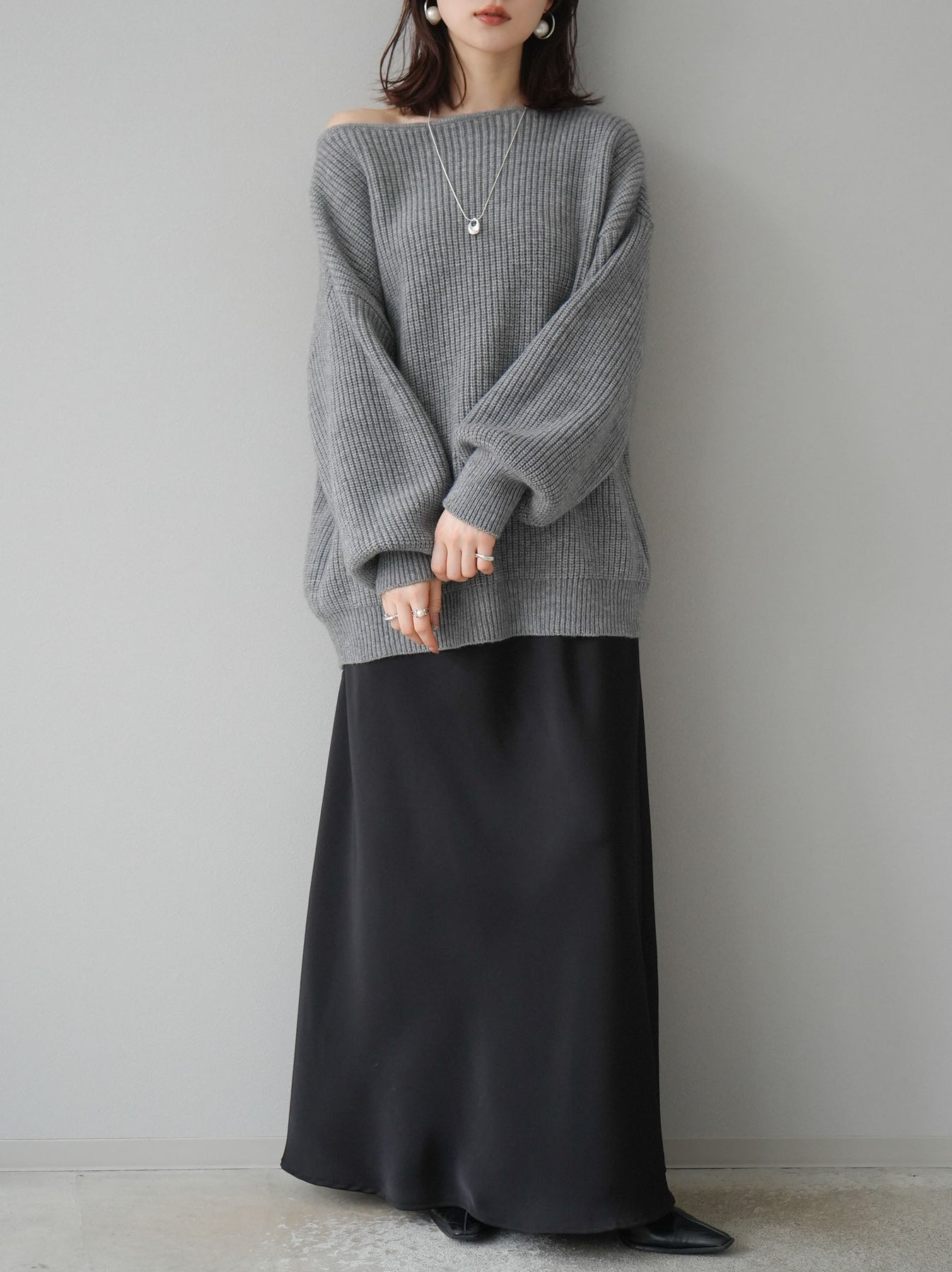 [予約]アルパカタッチオフショルオーバーニットプルオーバー/杢グレー