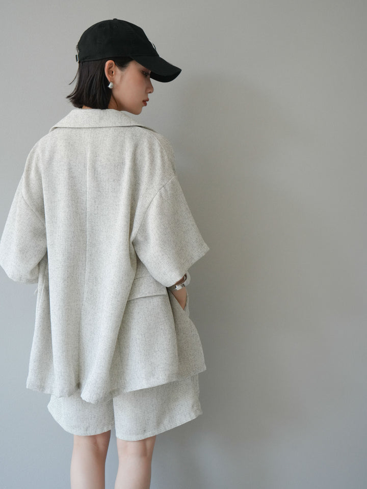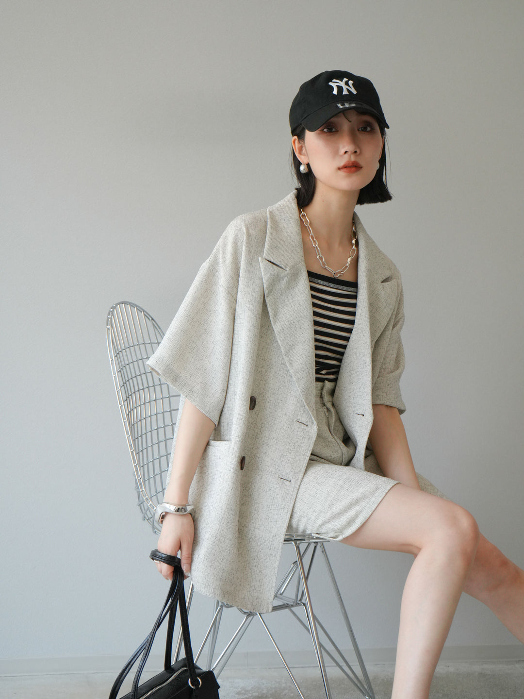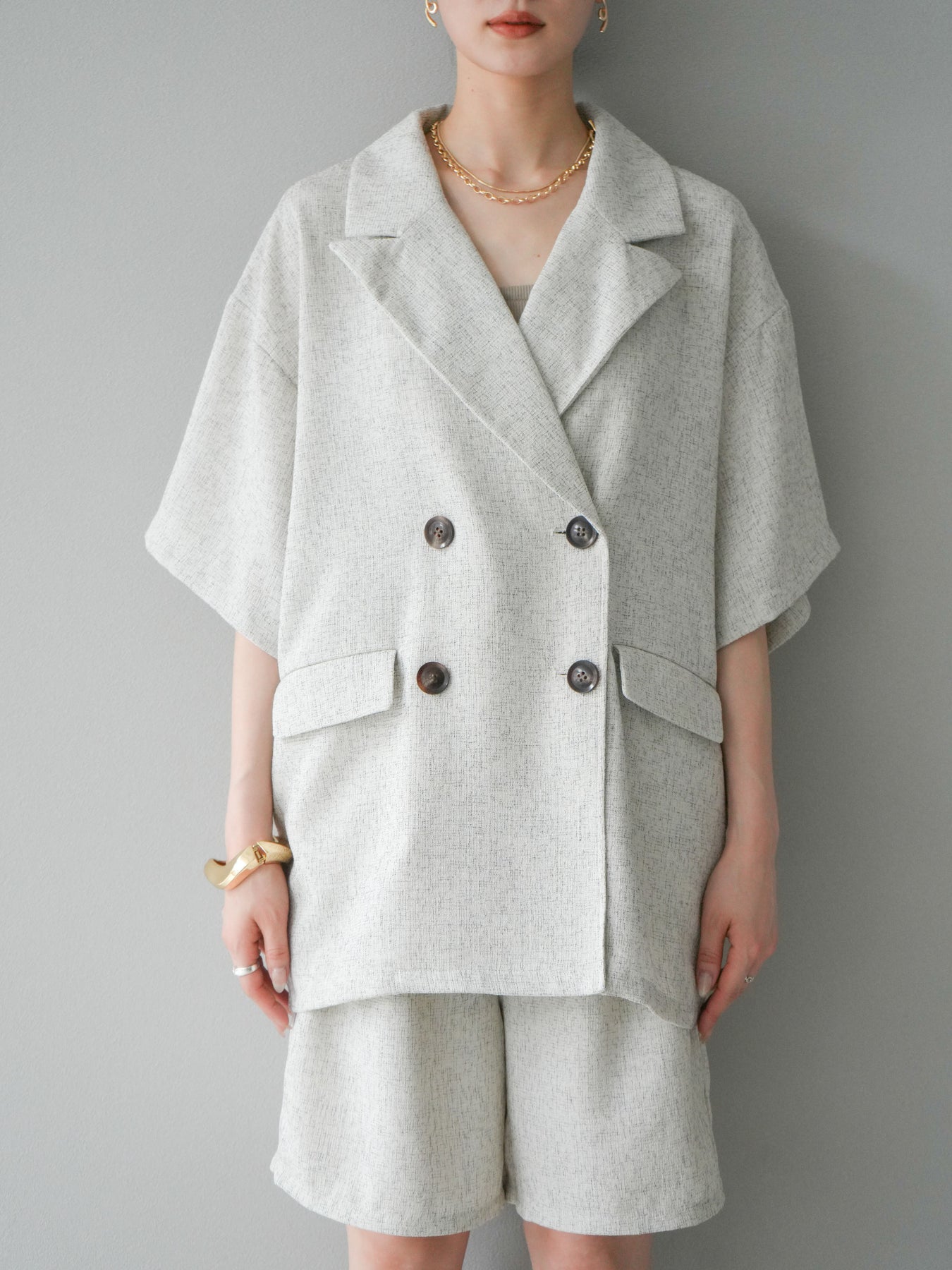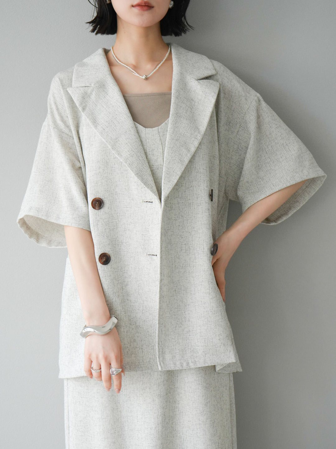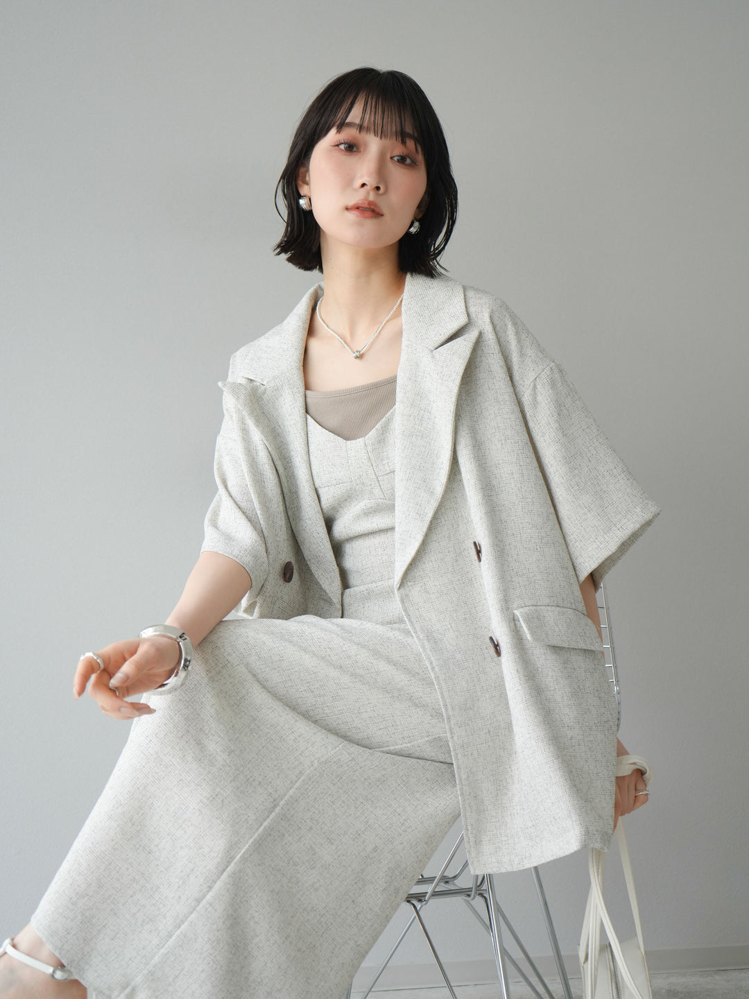 軽やかなサマーツイード素材を使用したハーフジャケット。きちんと感のあるテーラードデザインに、半袖と程よい丈感で涼しげな印象をプラス。カジュアルからきれいめまで幅広く着回せ、セットアップコーデも楽しめます。オンオフ問わず、今季のトレンドスタイルにぴったりな一枚です。 ※ボトムス、キャミソール(インナー)以外の商品は一律でインナーは付属していません