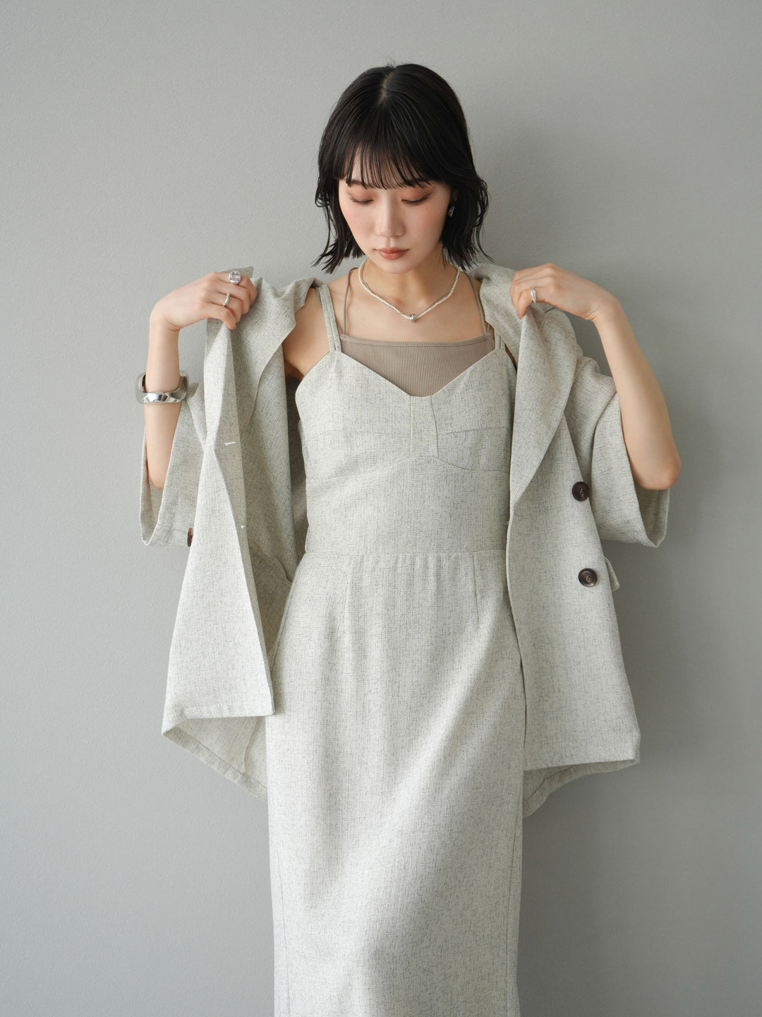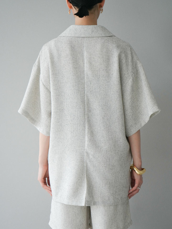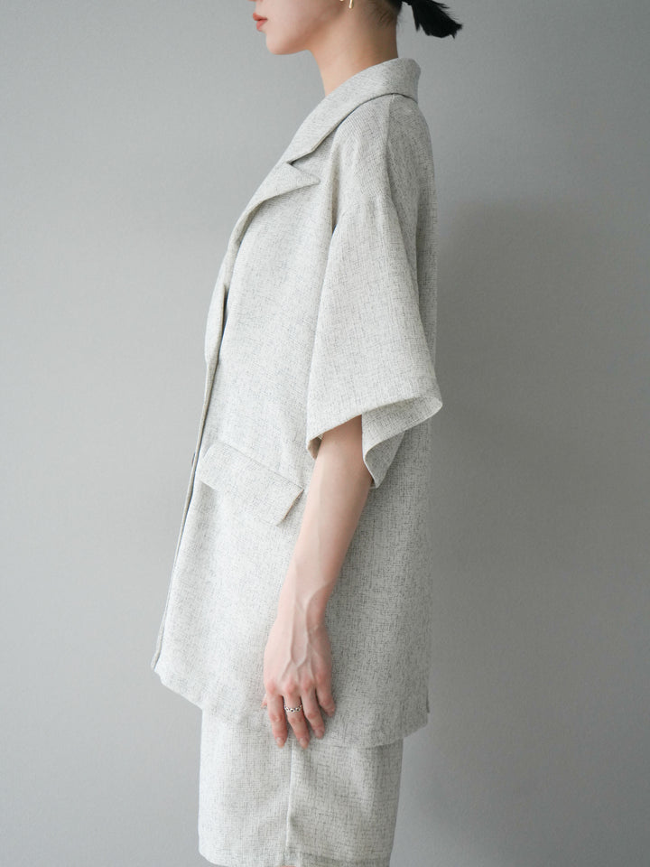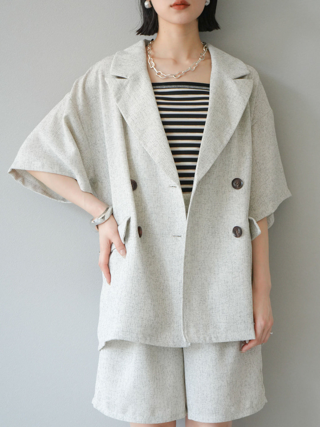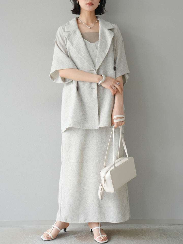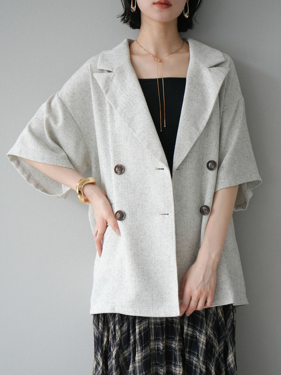 軽やかなサマーツイード素材を使用したハーフジャケット。きちんと感のあるテーラードデザインに、半袖と程よい丈感で涼しげな印象をプラス。カジュアルからきれいめまで幅広く着回せ、セットアップコーデも楽しめます。オンオフ問わず、今季のトレンドスタイルにぴったりな一枚です。 ※ボトムス、キャミソール(インナー)以外の商品は一律でインナーは付属していません