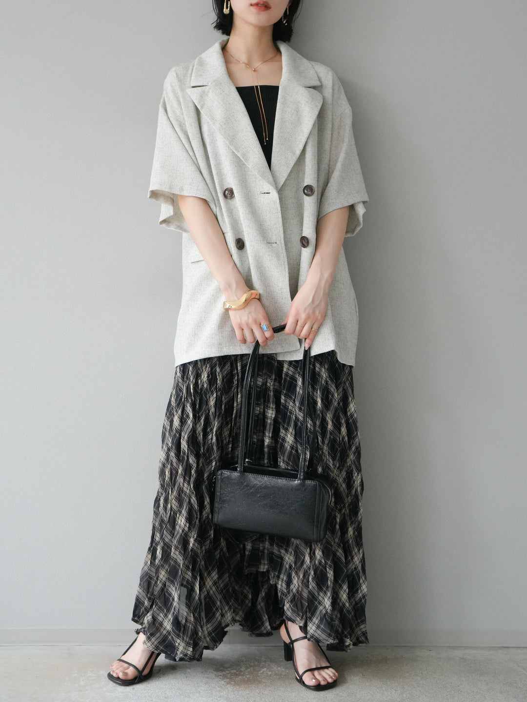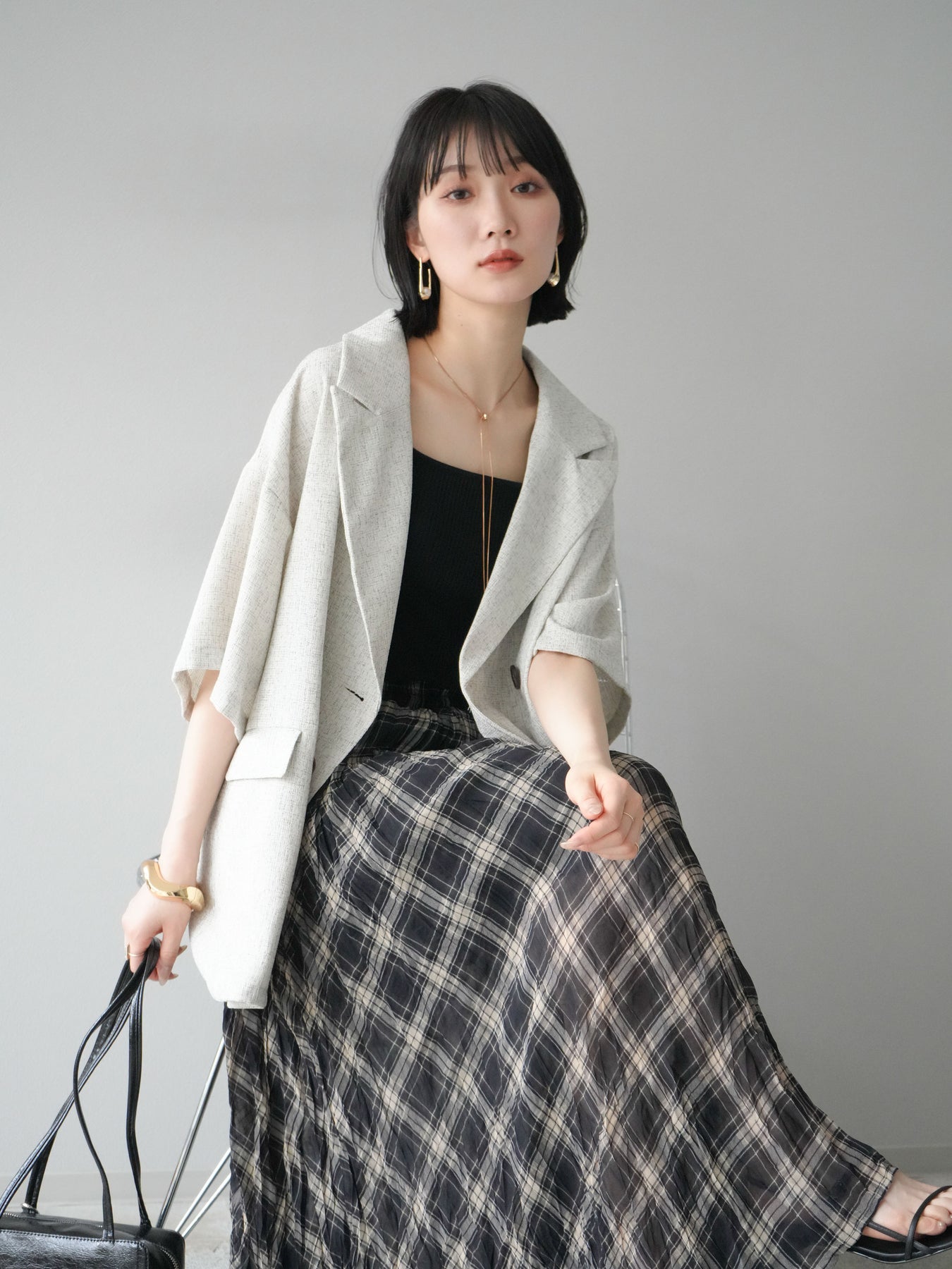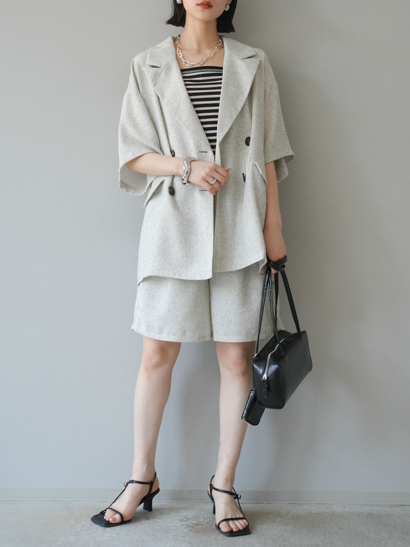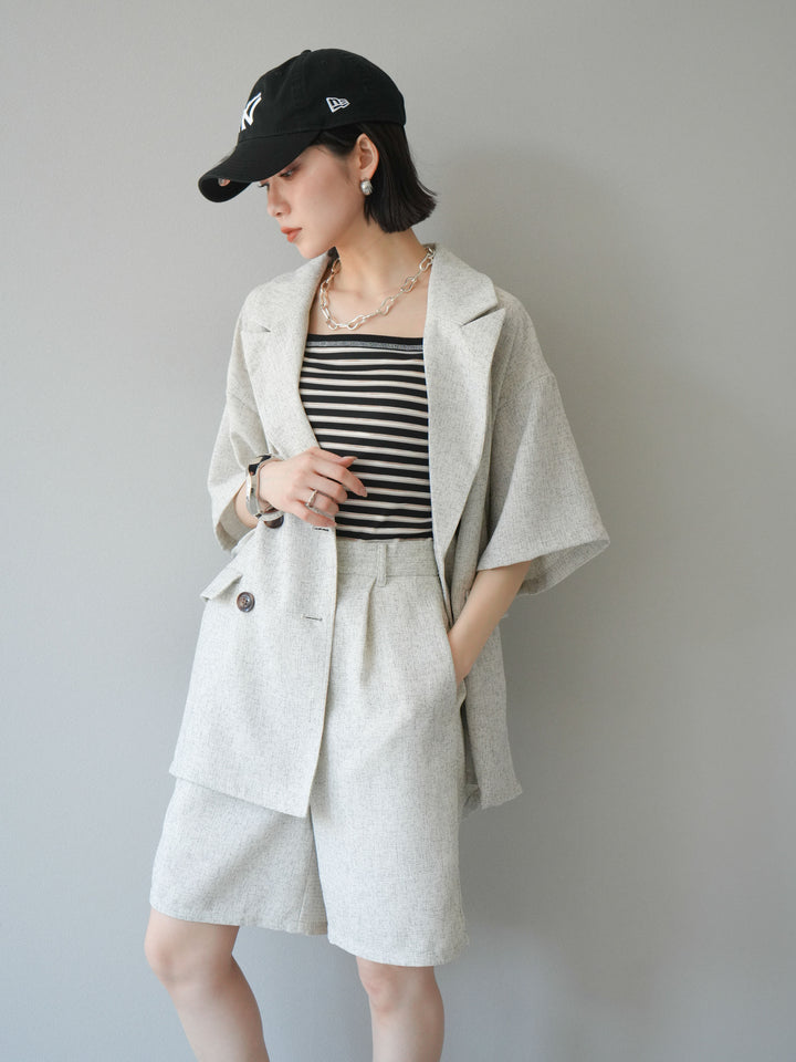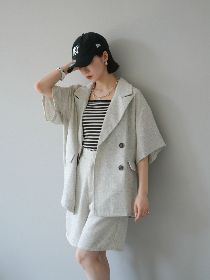 軽やかなサマーツイード素材を使用したハーフジャケット。きちんと感のあるテーラードデザインに、半袖と程よい丈感で涼しげな印象をプラス。カジュアルからきれいめまで幅広く着回せ、セットアップコーデも楽しめます。オンオフ問わず、今季のトレンドスタイルにぴったりな一枚です。 ※ボトムス、キャミソール(インナー)以外の商品は一律でインナーは付属していません