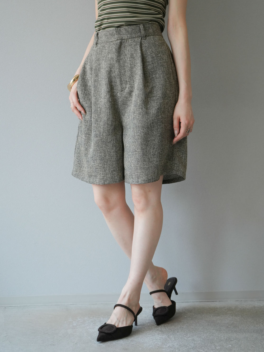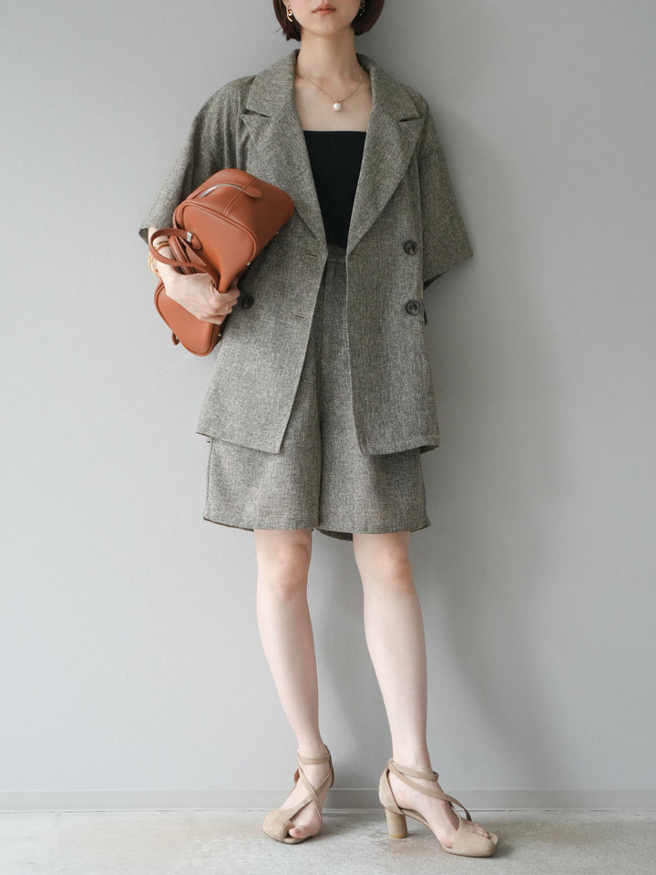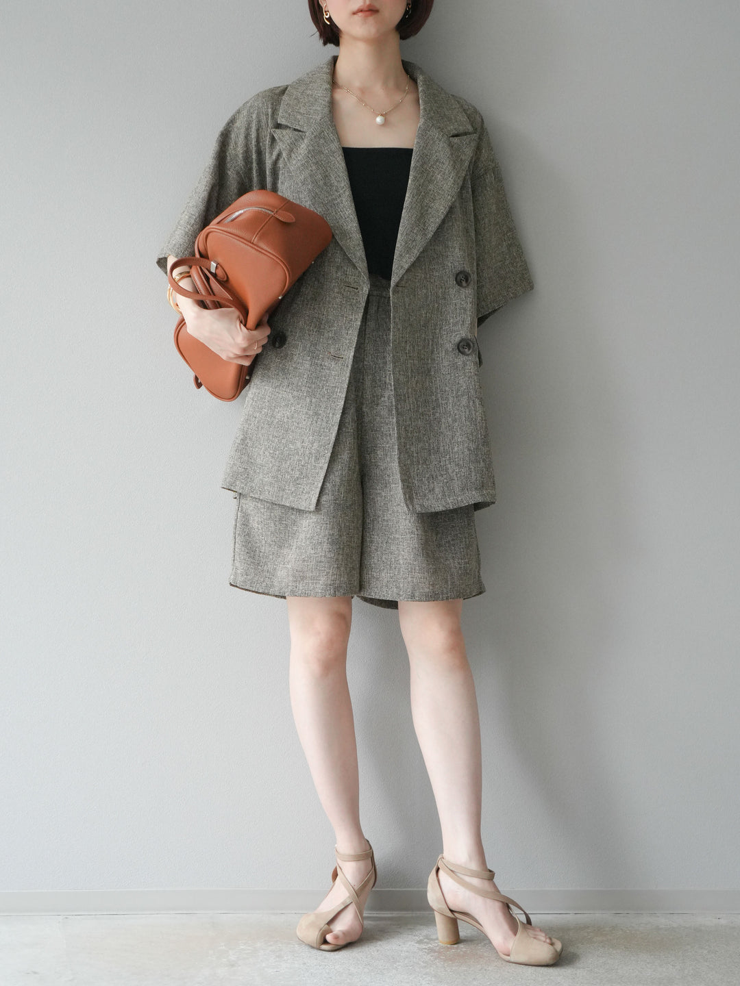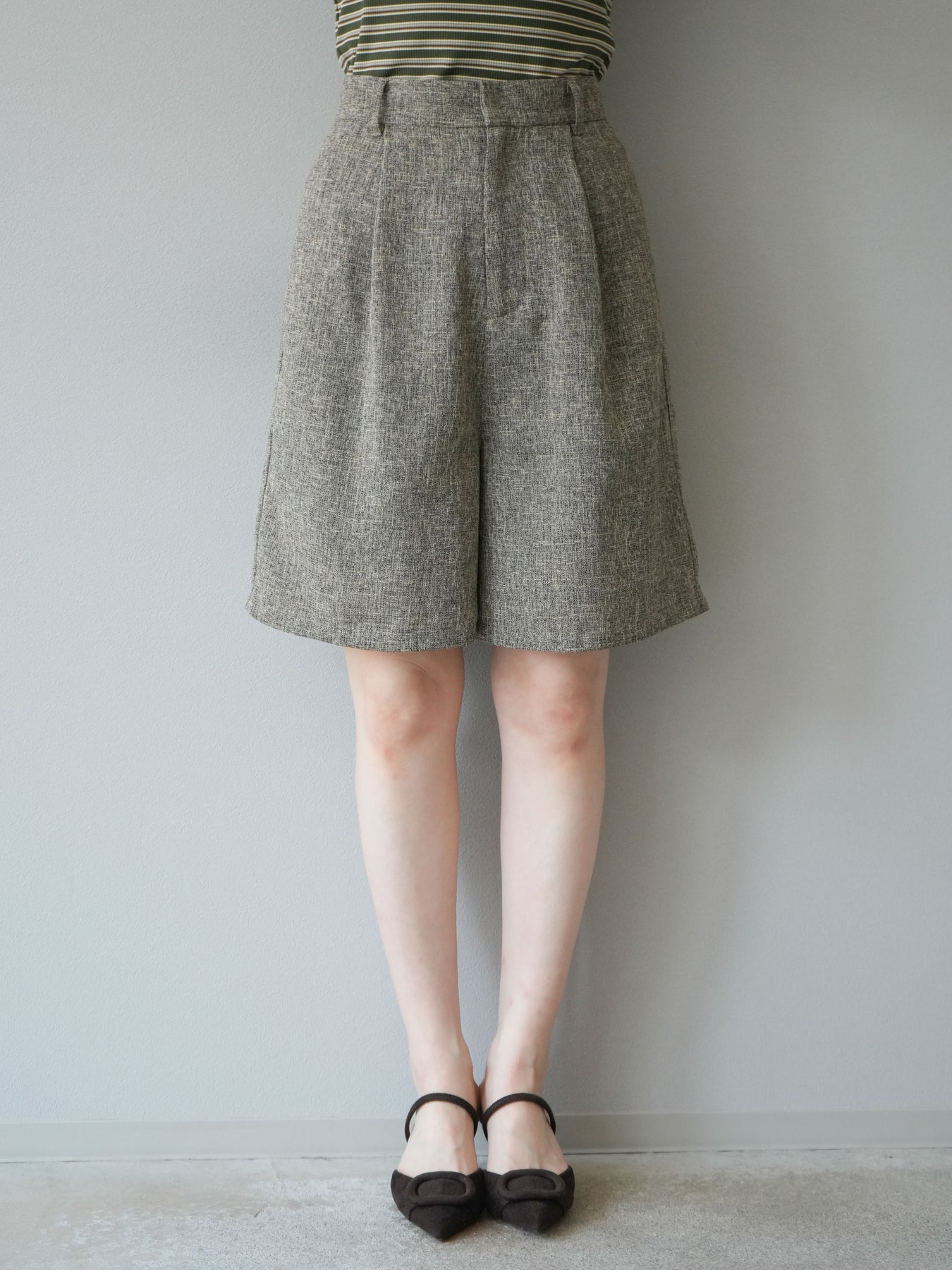 軽やかなサマーツイード素材を使用した、季節感たっぷりのハーフパンツ。程よくゆとりのあるシルエットと、上品なツイードの質感が、ラフすぎず大人っぽい印象を演出します。セットアップコーデはもちろん、単品でもきれいめからカジュアルまで幅広く着回せる万能アイテムです。 ※ボトムス、キャミソール(インナー)以外の商品は一律でインナーは付属していません