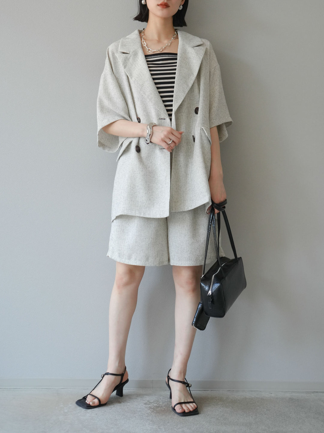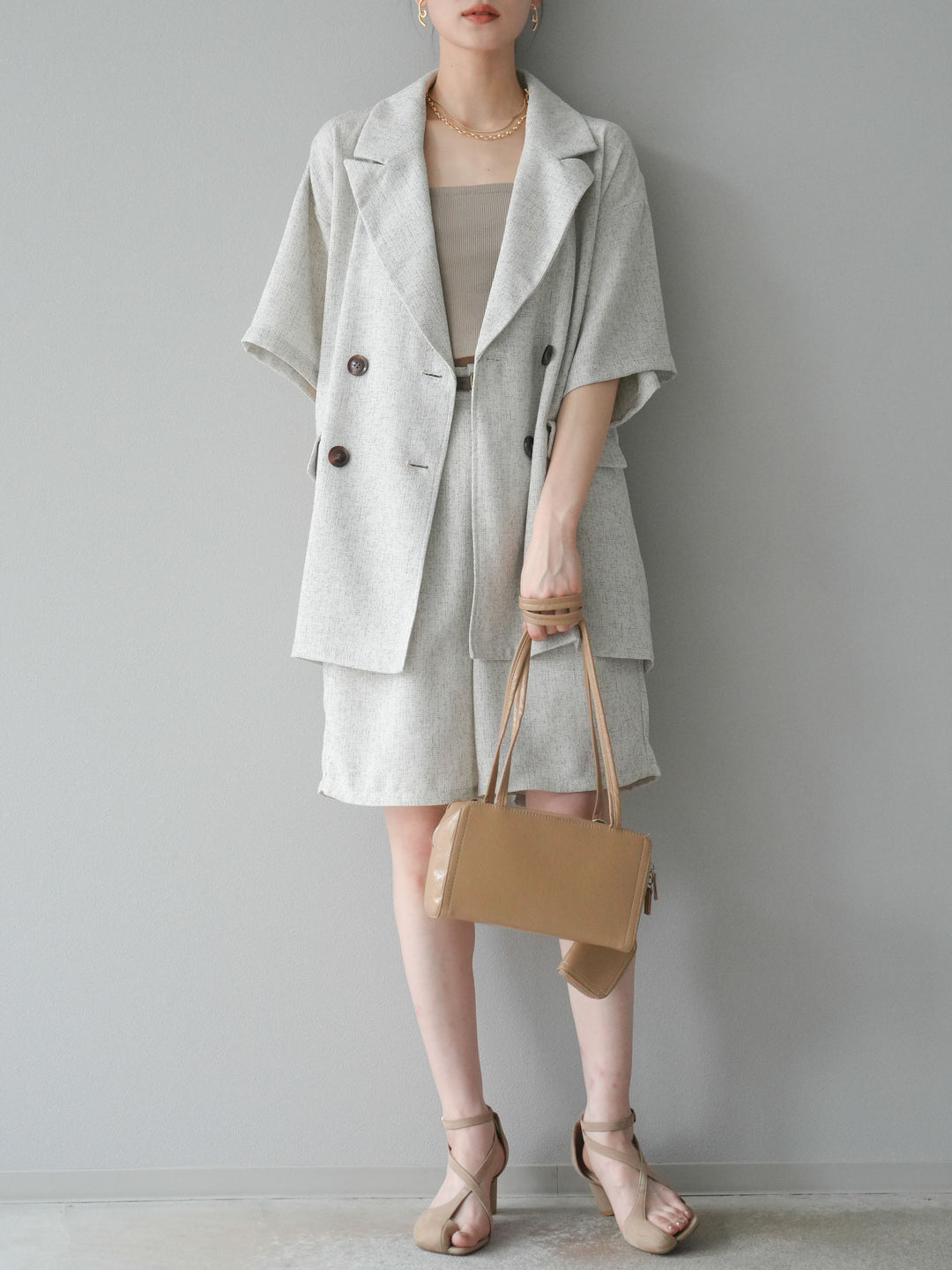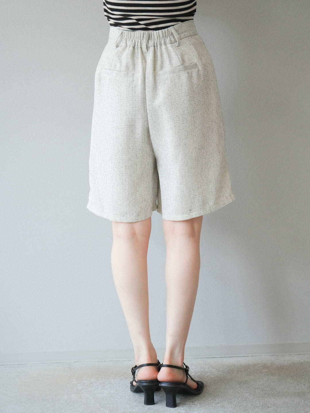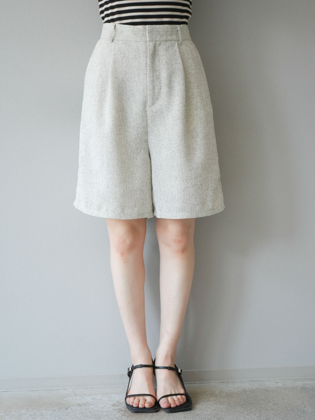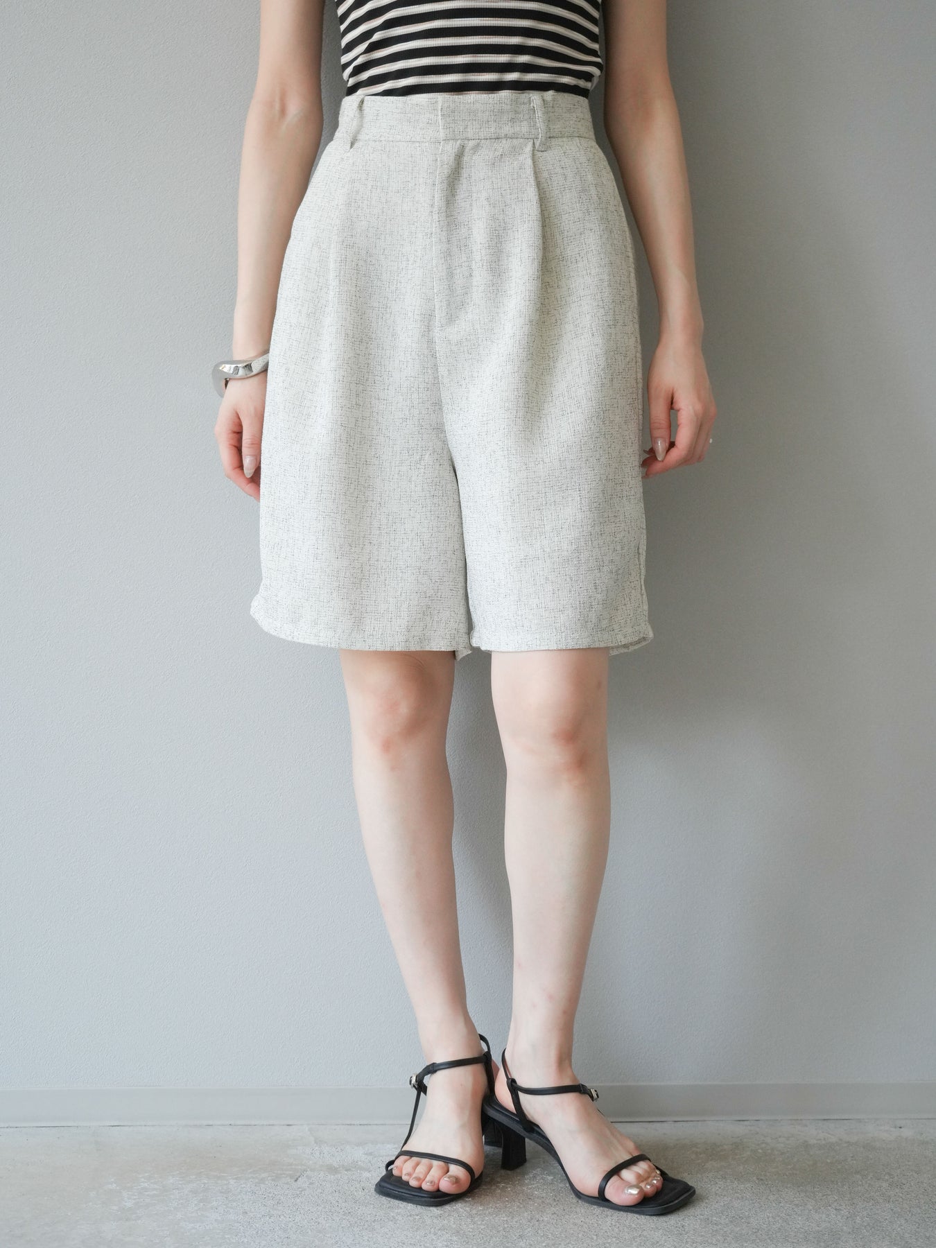 軽やかなサマーツイード素材を使用した、季節感たっぷりのハーフパンツ。程よくゆとりのあるシルエットと、上品なツイードの質感が、ラフすぎず大人っぽい印象を演出します。セットアップコーデはもちろん、単品でもきれいめからカジュアルまで幅広く着回せる万能アイテムです。 ※ボトムス、キャミソール(インナー)以外の商品は一律でインナーは付属していません