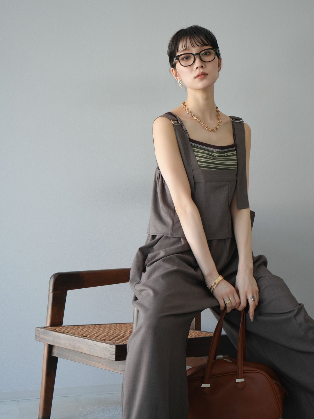 リネン風のさらりとした素材感が季節感を演出するサロペット。レイヤード風のデザインで、一枚で着映えるのが魅力です。肩のバックルやワイドシルエットがトレンド感をプラスし、リラックス感ときちんと感を兼ね備えた一着。インナー次第でカジュアルにもキレイめにも着こなせる、着回し力抜群のアイテムです。 ※ボトムス、キャミソール(インナー)以外の商品は一律でインナーは付属していません