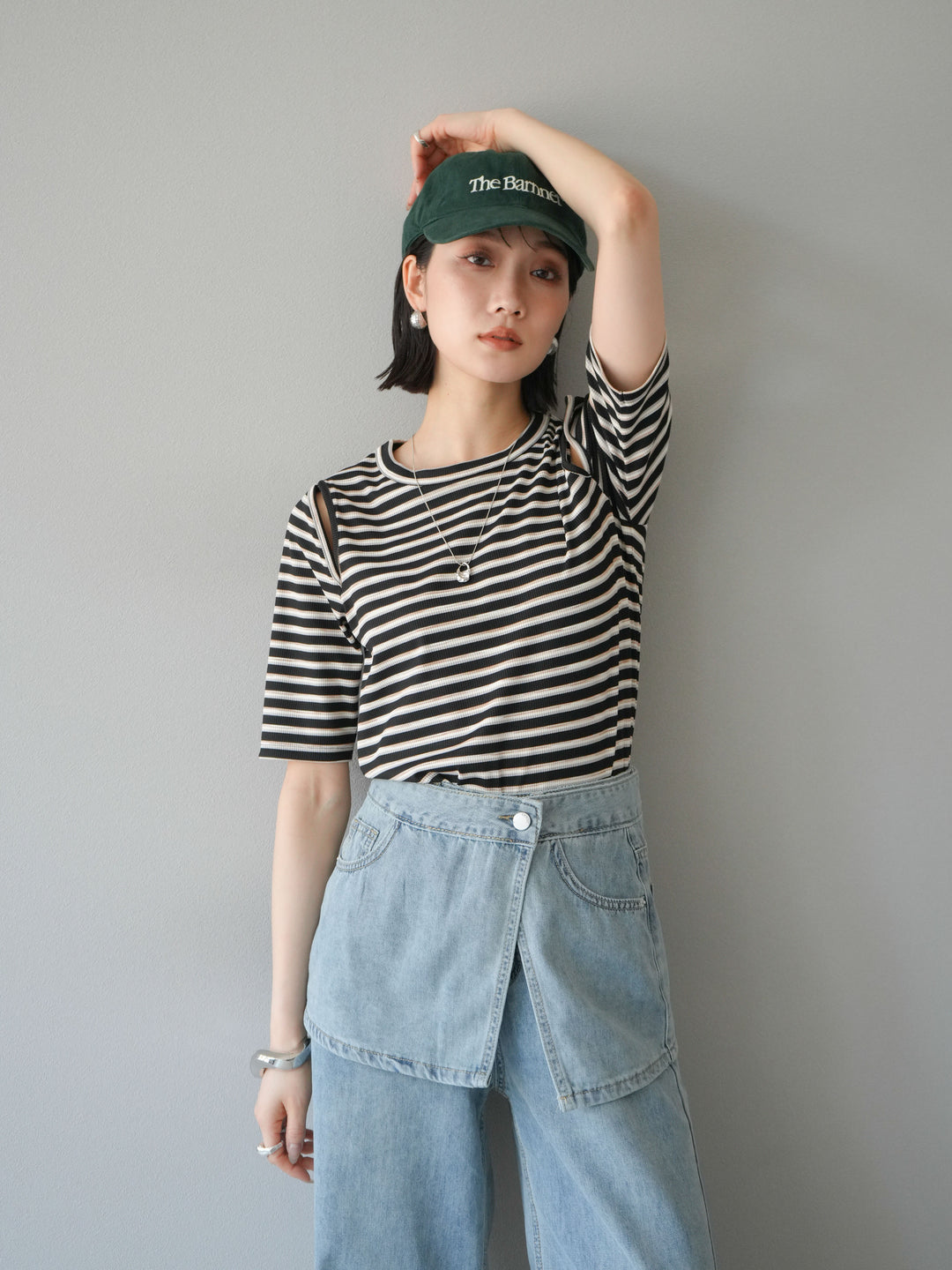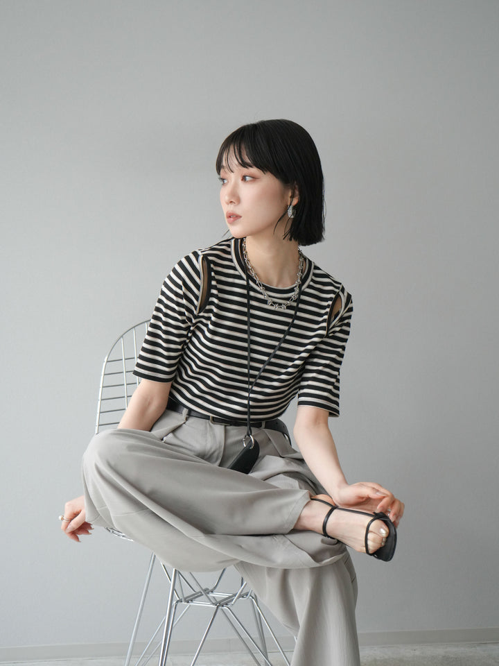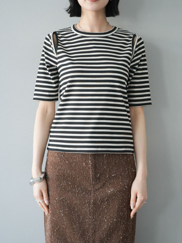 トレンド感のあるマルチボーダー柄が目を引くコンパクトTシャツ。肩部分のカットアウトデザインが程よい肌見せを叶え、シンプルながらもこなれた印象に。伸縮性のある素材で着心地も抜群。デニムやスカートに合わせるだけで、旬のカジュアルスタイルが完成する万能アイテムです。 ※ボトムス、キャミソール(インナー)以外の商品は一律でインナーは付属していません