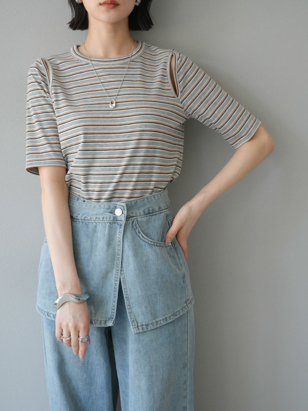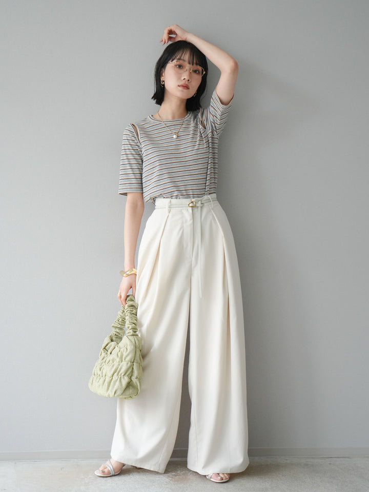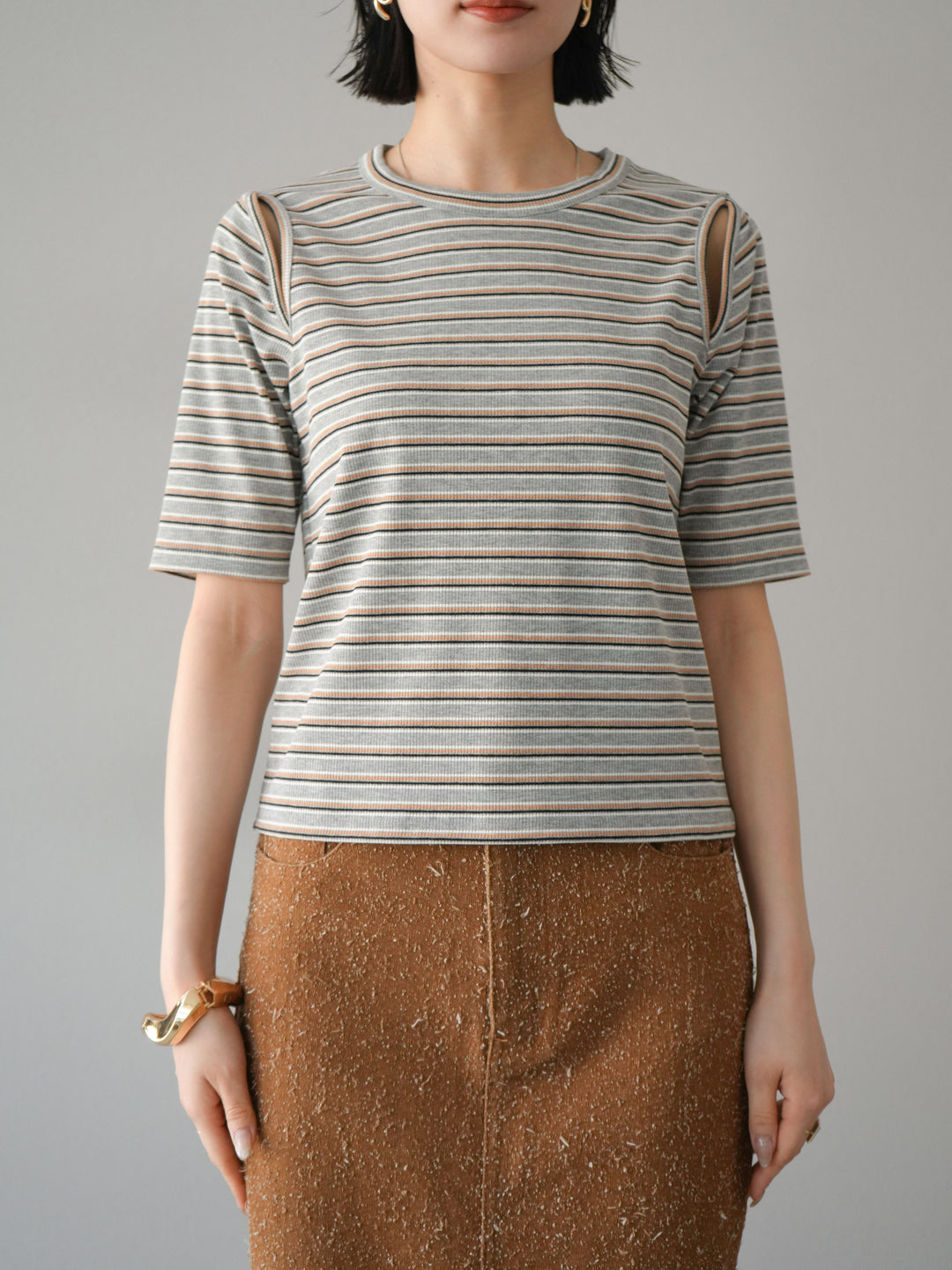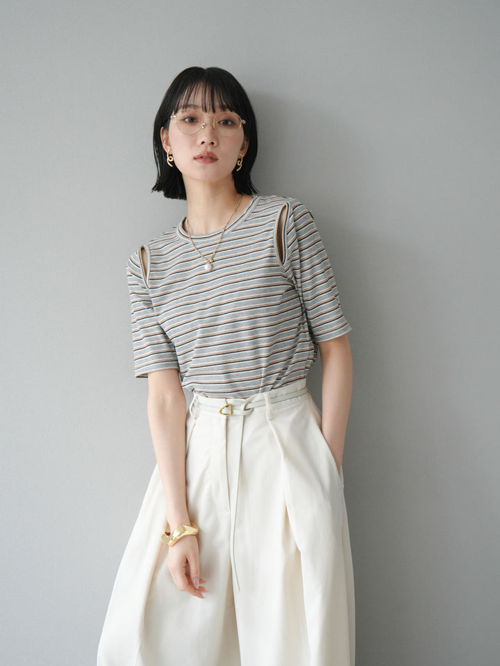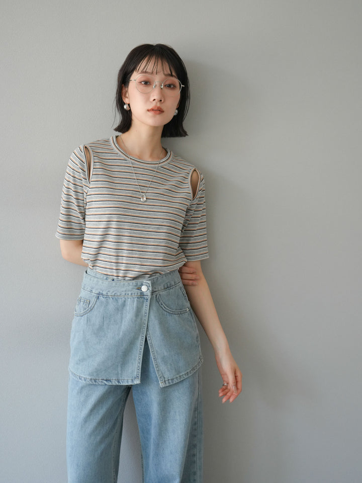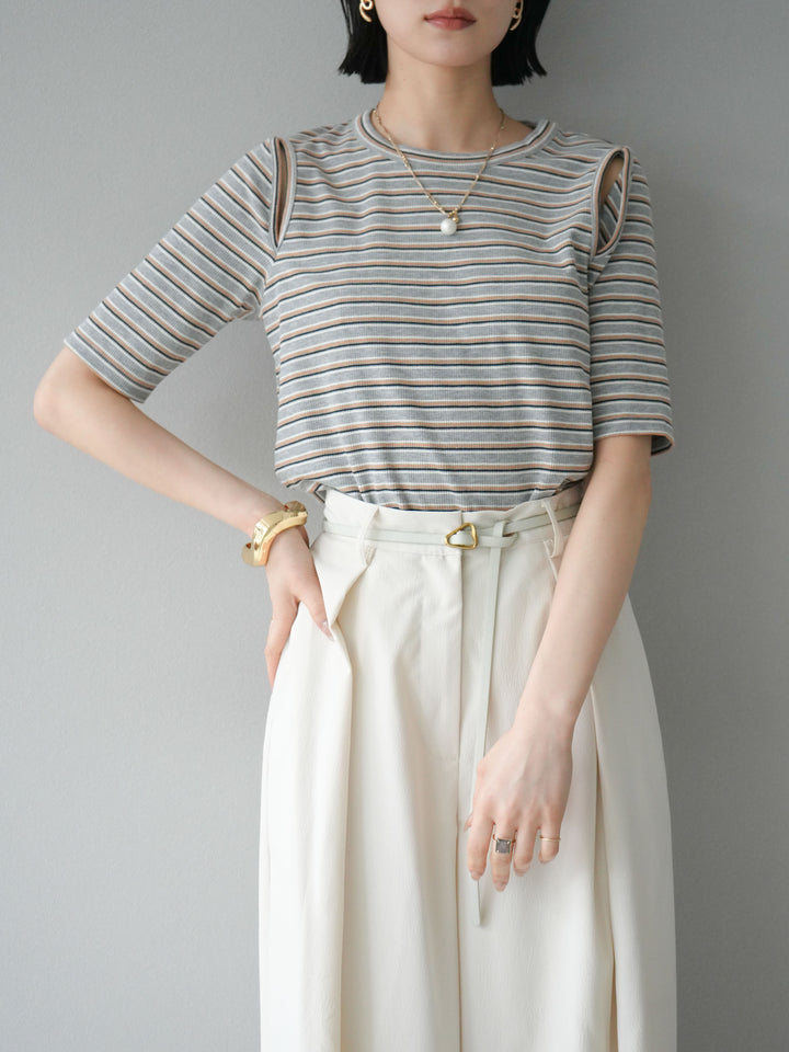 トレンド感のあるマルチボーダー柄が目を引くコンパクトTシャツ。肩部分のカットアウトデザインが程よい肌見せを叶え、シンプルながらもこなれた印象に。伸縮性のある素材で着心地も抜群。デニムやスカートに合わせるだけで、旬のカジュアルスタイルが完成する万能アイテムです。 ※ボトムス、キャミソール(インナー)以外の商品は一律でインナーは付属していません