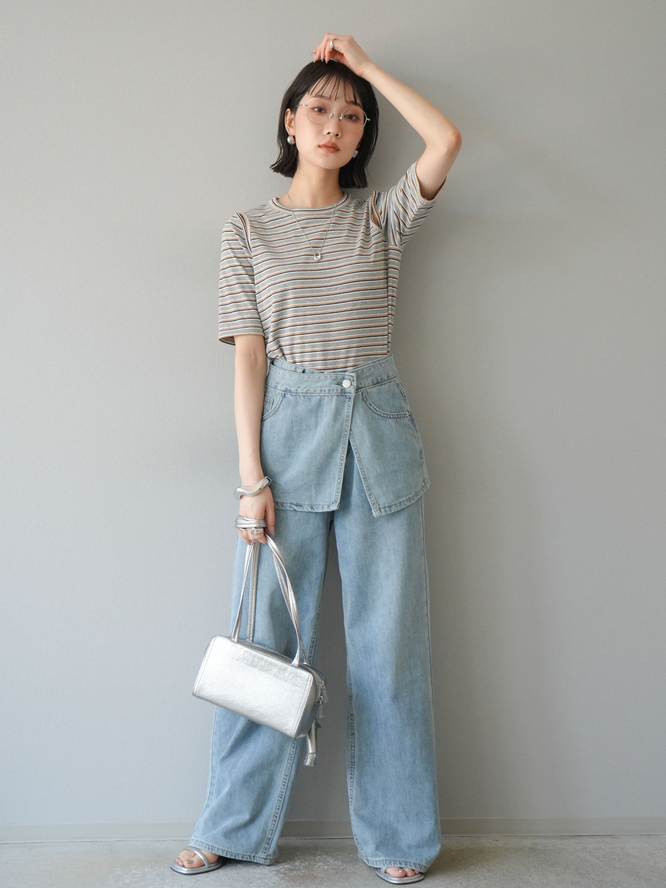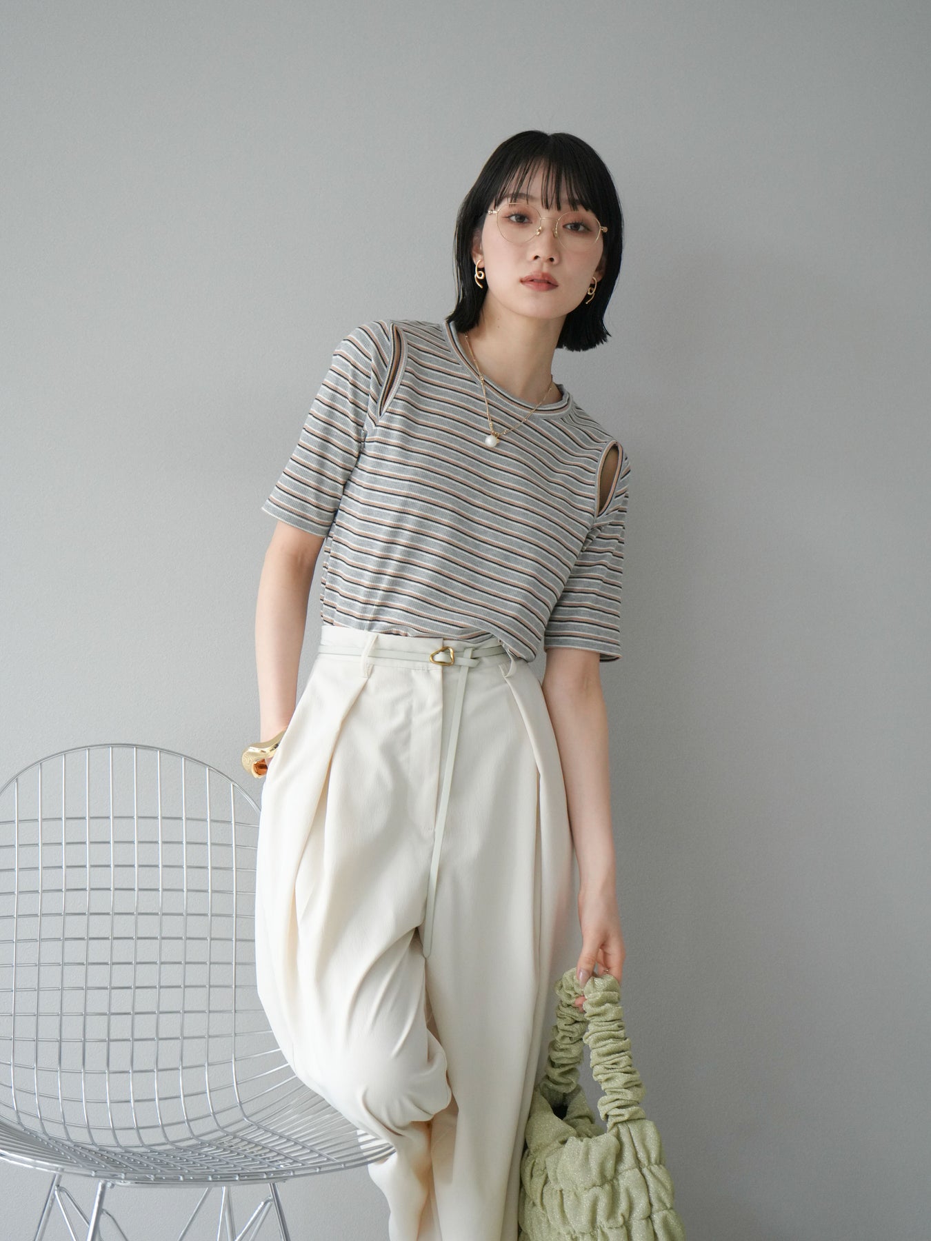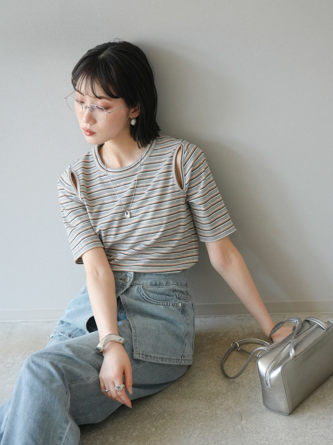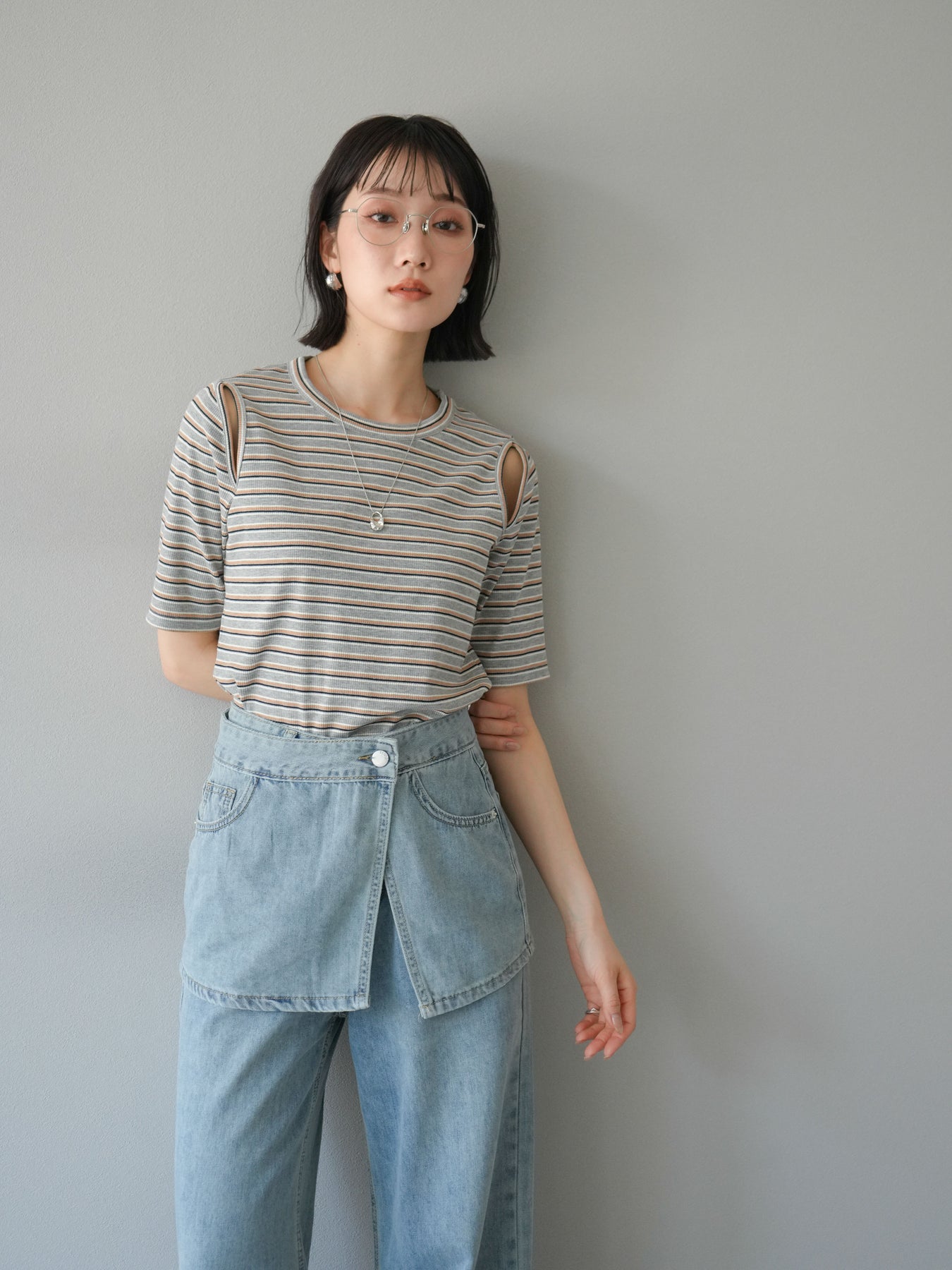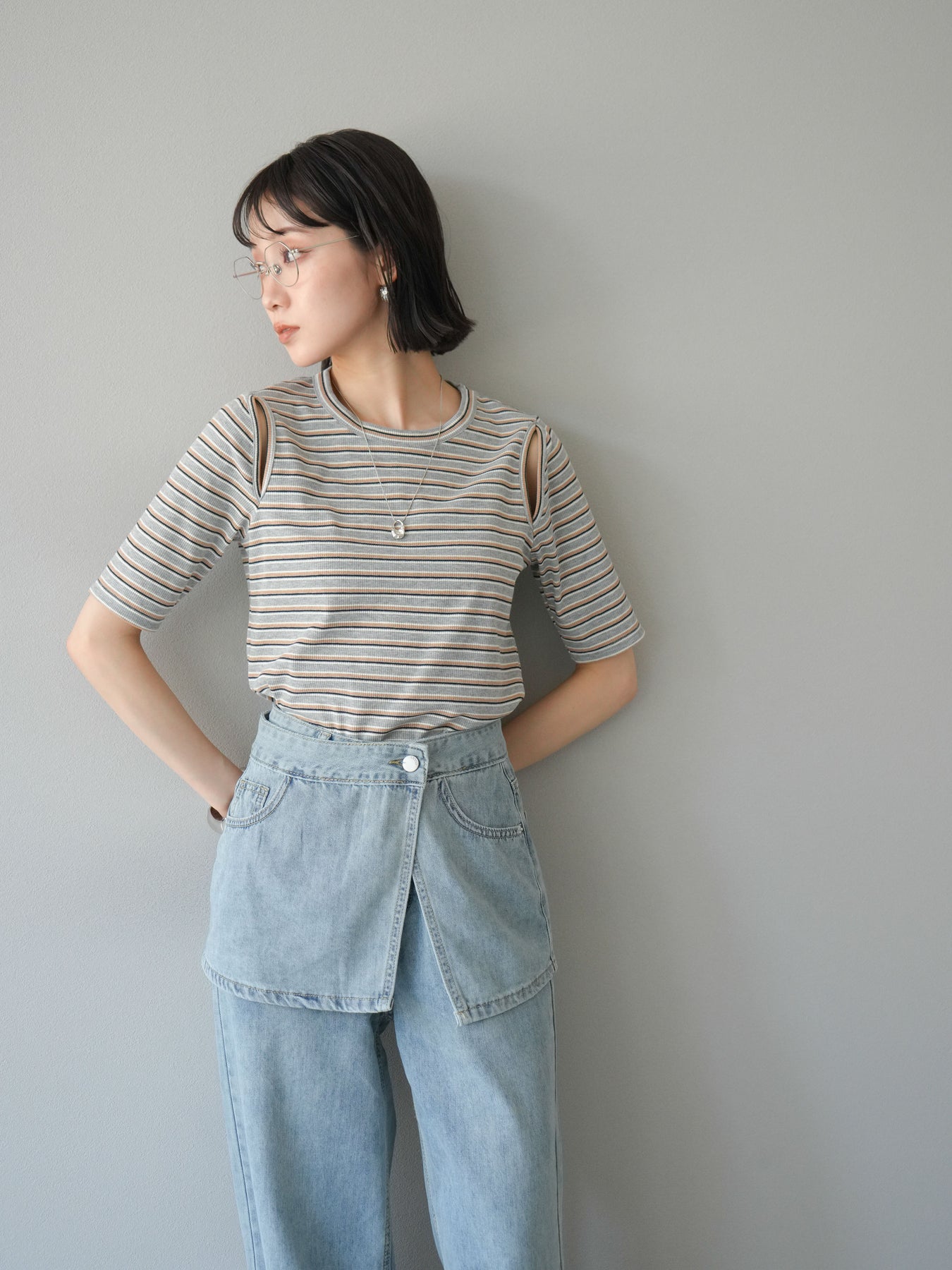 トレンド感のあるマルチボーダー柄が目を引くコンパクトTシャツ。肩部分のカットアウトデザインが程よい肌見せを叶え、シンプルながらもこなれた印象に。伸縮性のある素材で着心地も抜群。デニムやスカートに合わせるだけで、旬のカジュアルスタイルが完成する万能アイテムです。 ※ボトムス、キャミソール(インナー)以外の商品は一律でインナーは付属していません
