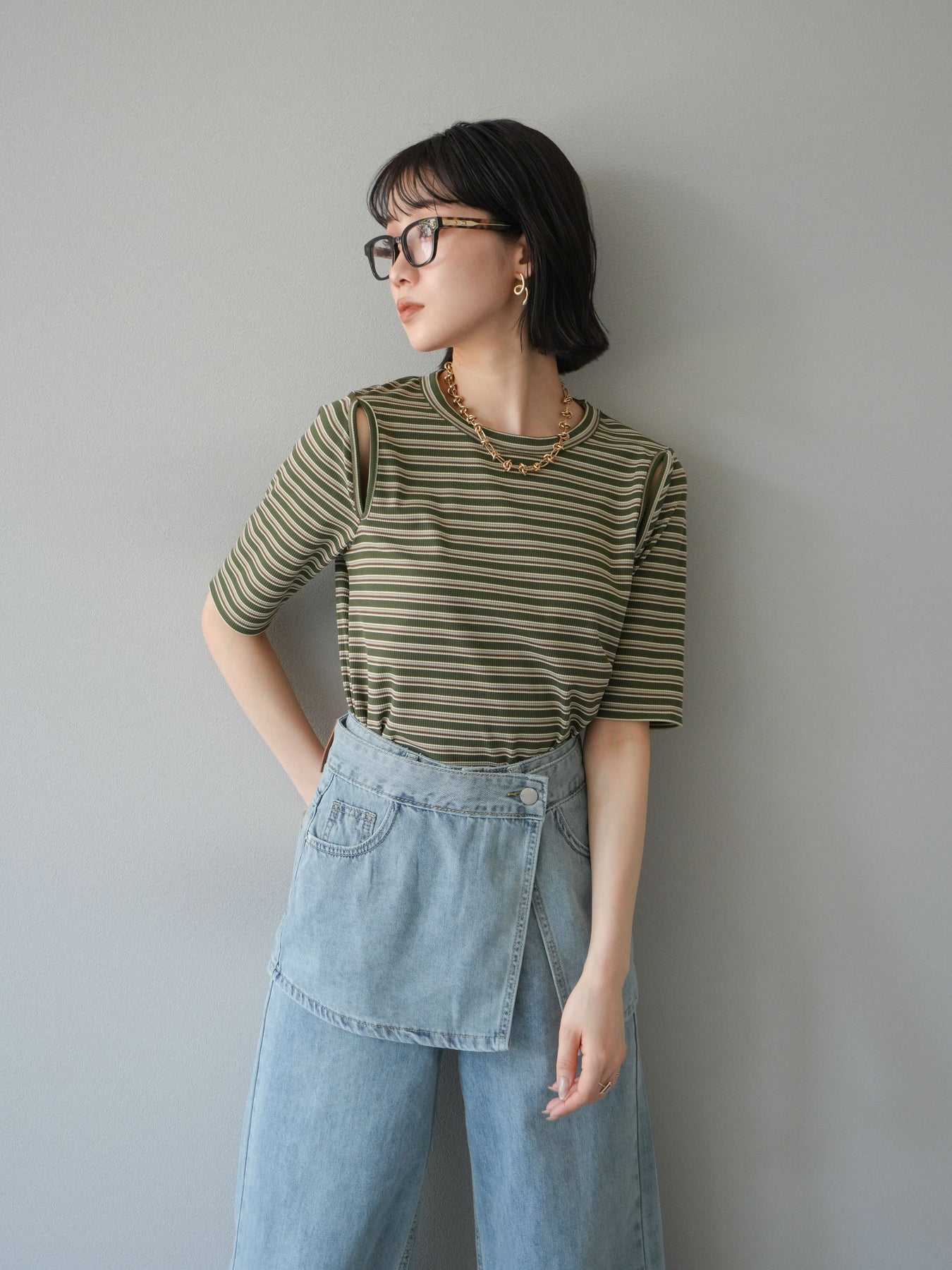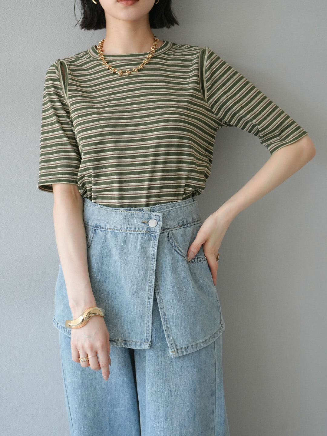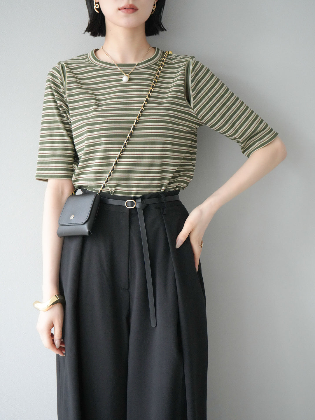 トレンド感のあるマルチボーダー柄が目を引くコンパクトTシャツ。肩部分のカットアウトデザインが程よい肌見せを叶え、シンプルながらもこなれた印象に。伸縮性のある素材で着心地も抜群。デニムやスカートに合わせるだけで、旬のカジュアルスタイルが完成する万能アイテムです。 ※ボトムス、キャミソール(インナー)以外の商品は一律でインナーは付属していません