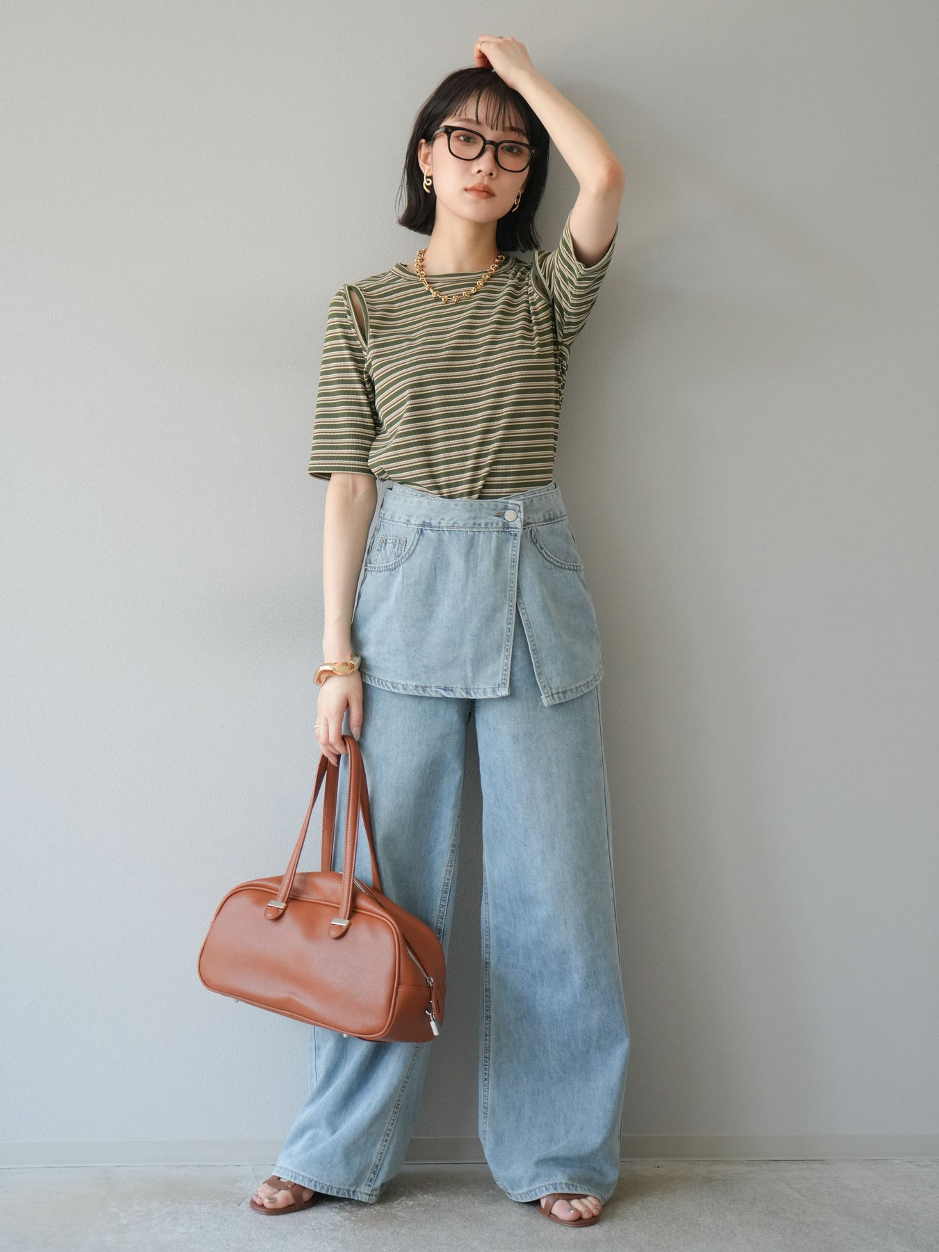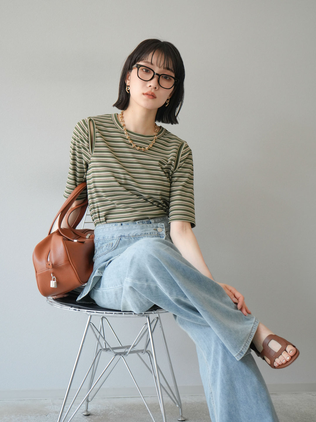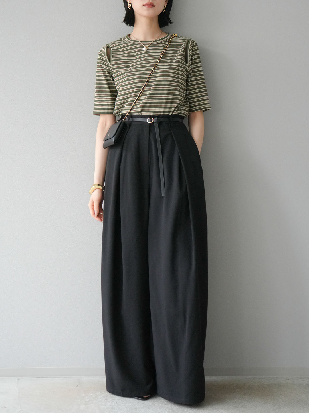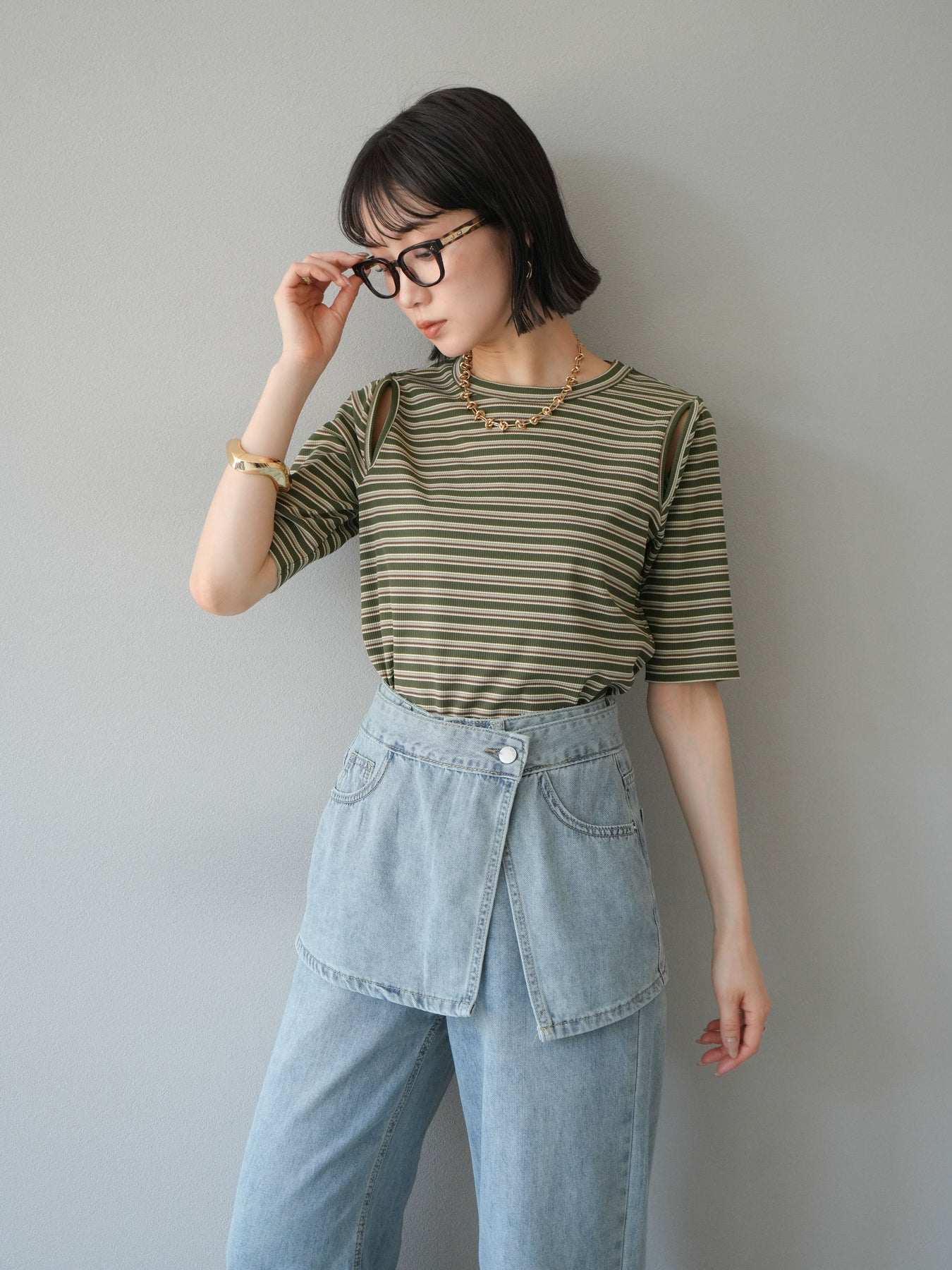 トレンド感のあるマルチボーダー柄が目を引くコンパクトTシャツ。肩部分のカットアウトデザインが程よい肌見せを叶え、シンプルながらもこなれた印象に。伸縮性のある素材で着心地も抜群。デニムやスカートに合わせるだけで、旬のカジュアルスタイルが完成する万能アイテムです。 ※ボトムス、キャミソール(インナー)以外の商品は一律でインナーは付属していません