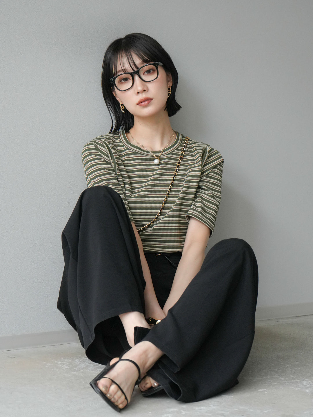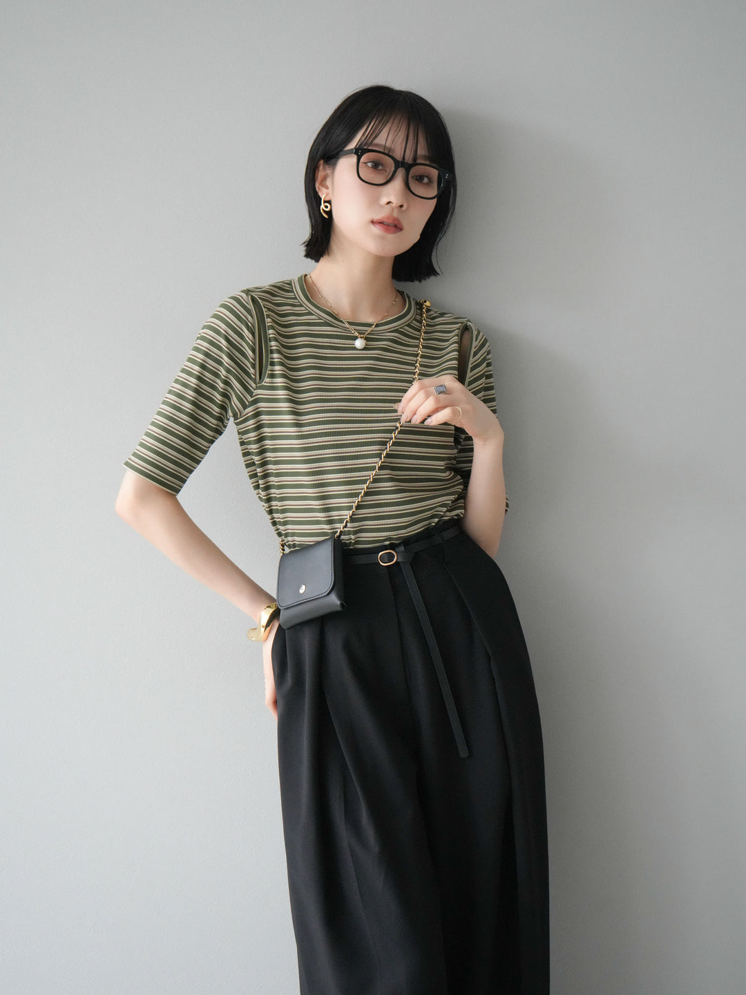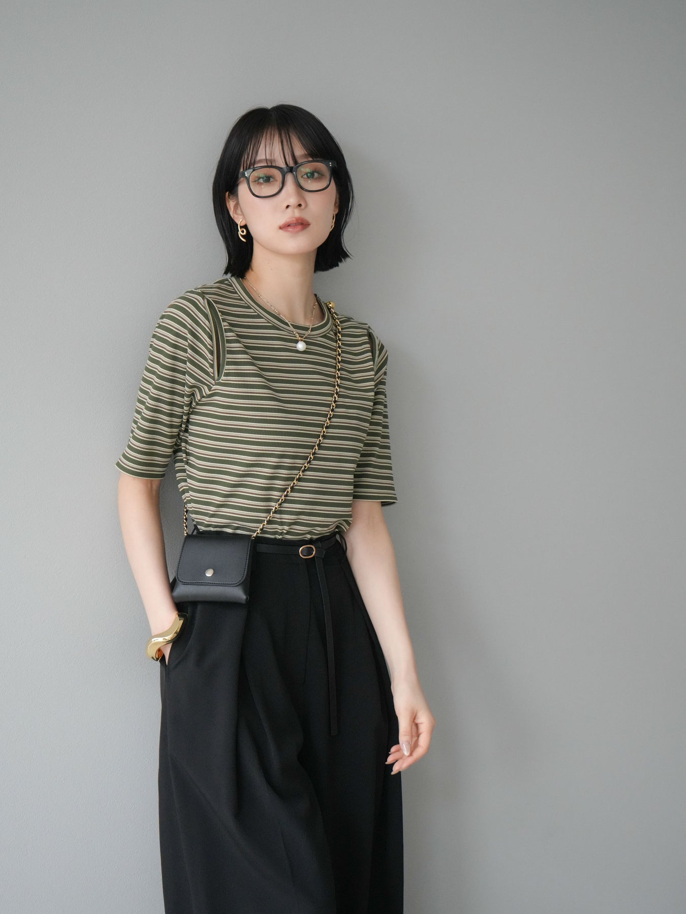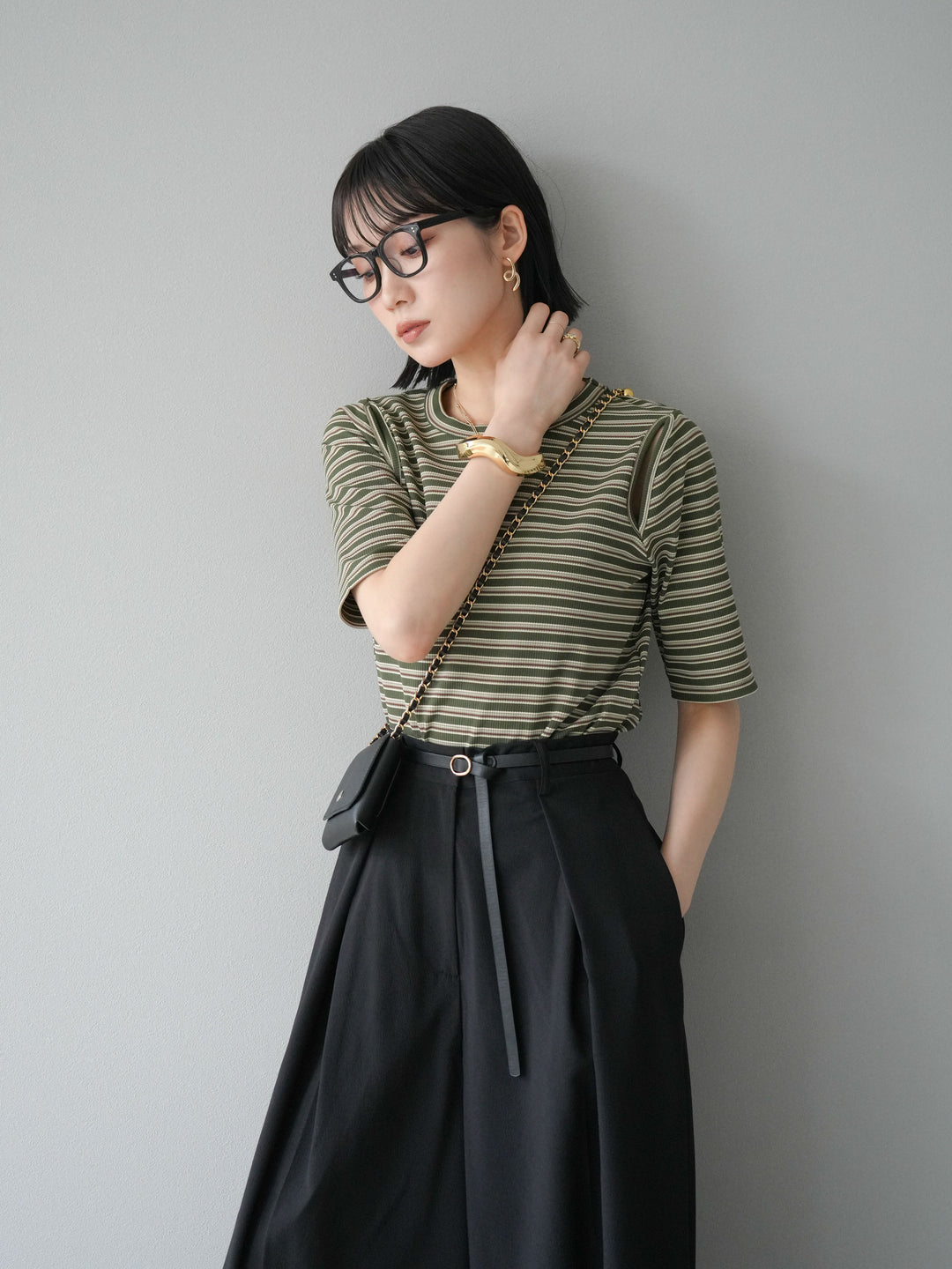 [予約]マルチボーダーコンパクトTシャツ/カーキ