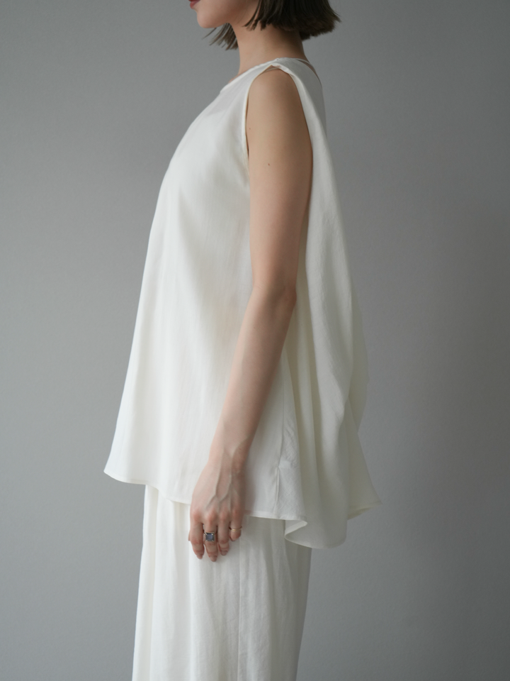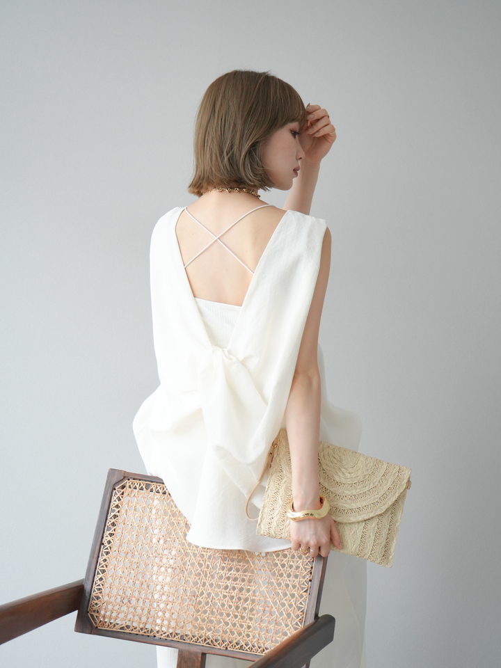 上品なシボ感のある素材に、背中のツイストデザインが目を惹く一枚。立体感のあるシルエットで、シンプルながらも印象的なバックスタイルを演出します。肩のラインを綺麗に見せるノースリーブ仕様で、1枚でも重ね着でも着回し自在。抜け感のある大人のトレンドスタイルにおすすめです。 ※ボトムス、キャミソール(インナー)以外の商品は一律でインナーは付属していません