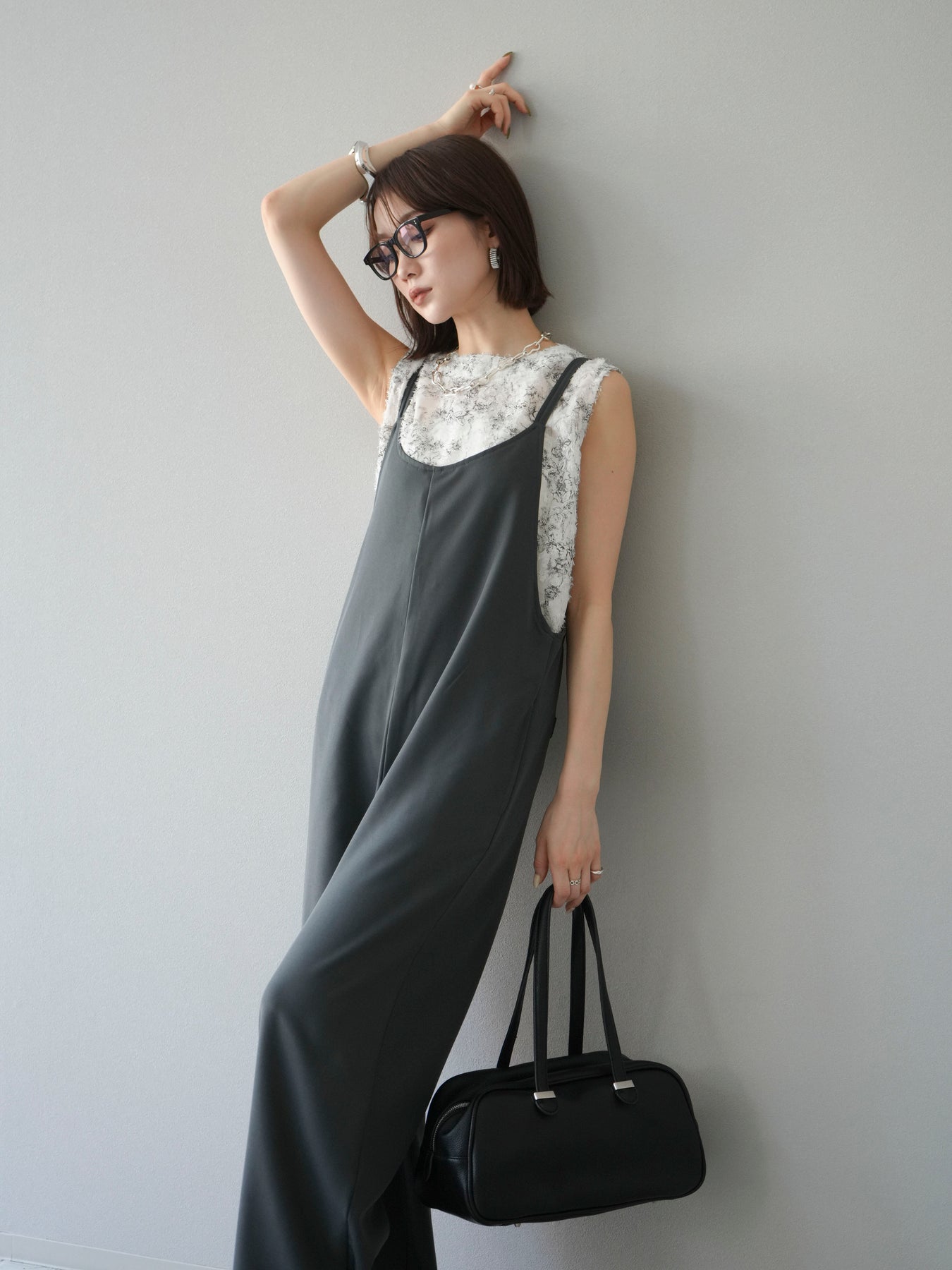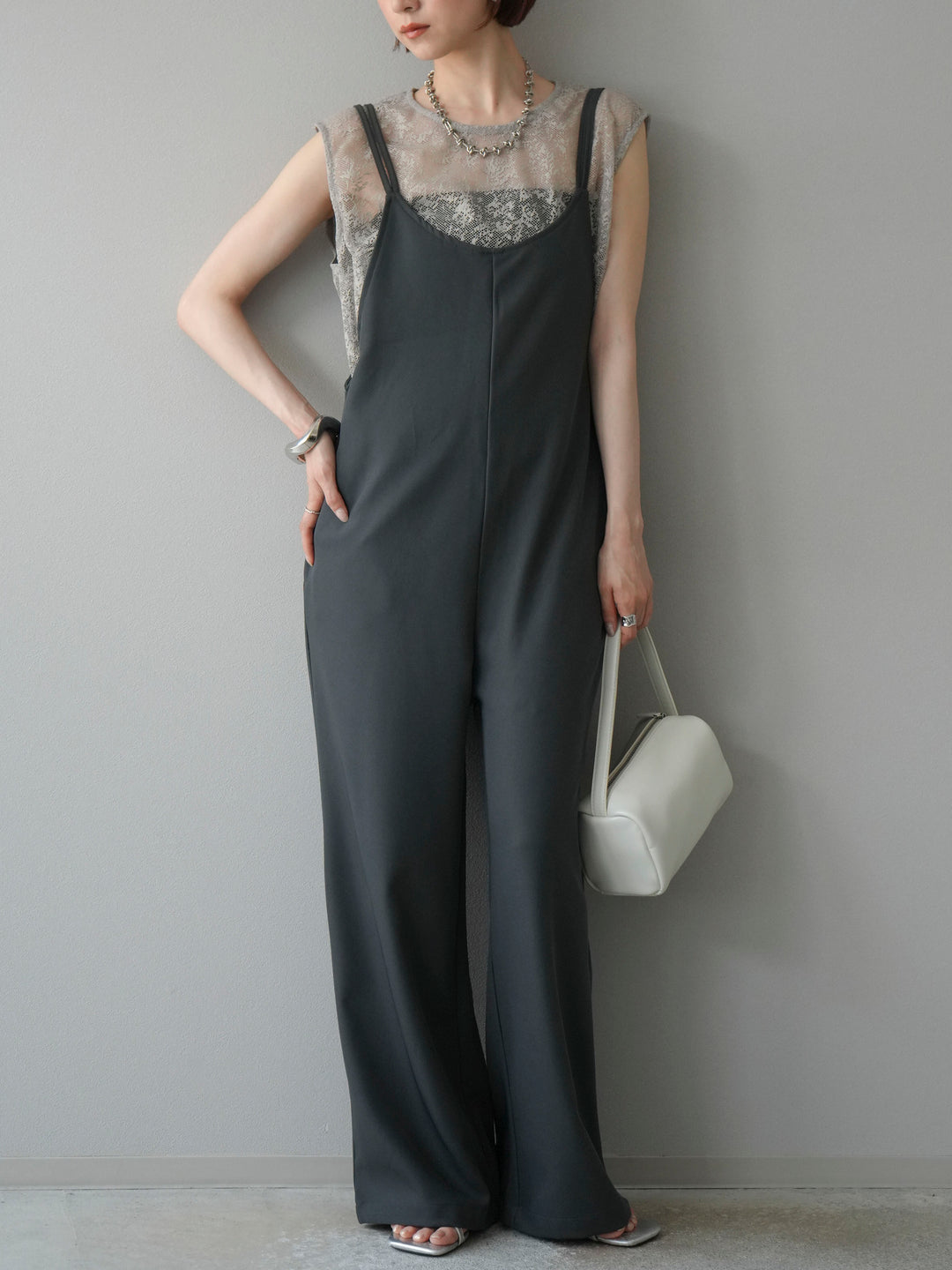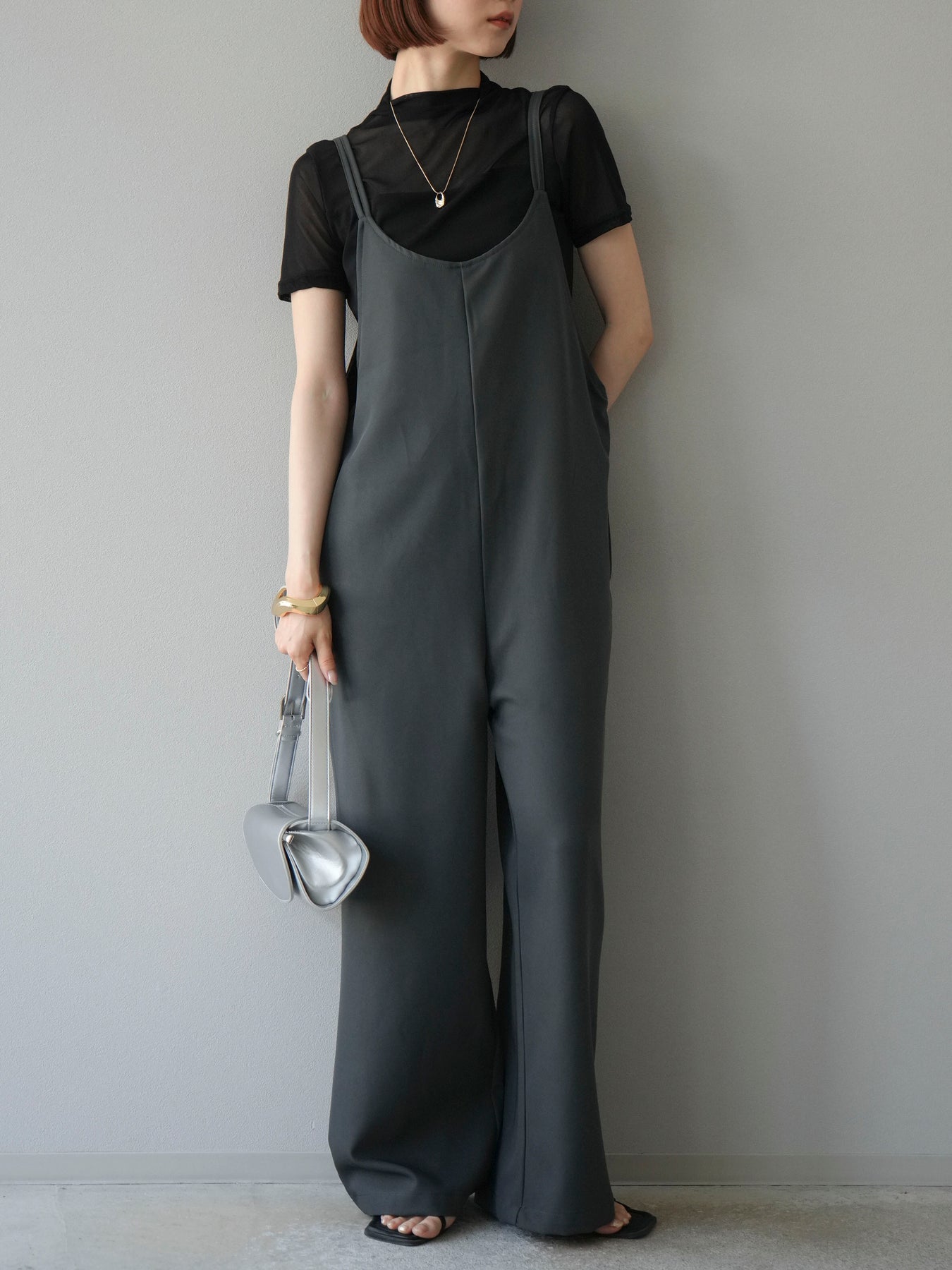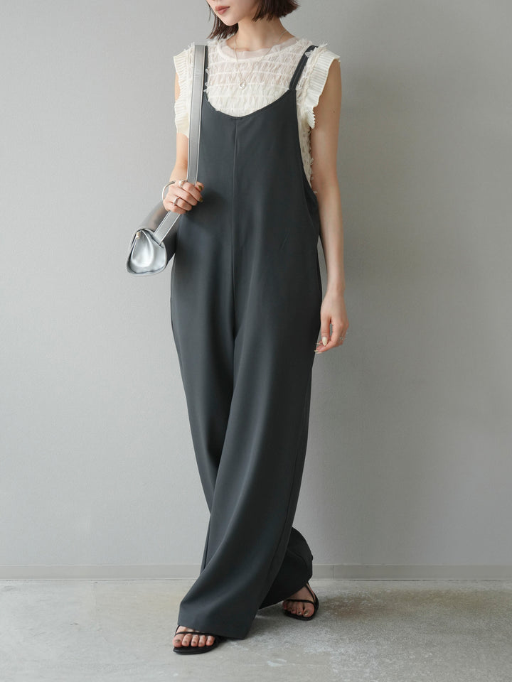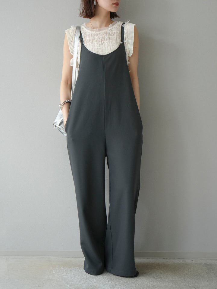 すっきりとしたフロントと、印象的なバックデザインが魅力のオールインワン。背中側に施された深めのVカットとダブルストラップが、程よく抜け感を与えつつ、こなれたムードを演出します。 落ち感のあるストレートシルエットで体のラインを拾わず、スタイルアップも叶うバランスの良い1枚。ストラップはアジャスター付きで長さ調節が可能なため、着丈やバランスの調整も自在です。 Tシャツやブラウスなど、インナー次第でロングシーズン着回せる万能アイテムです。 ※ボトムス、キャミソール(インナー)以外の商品は一律でインナーは付属していません。