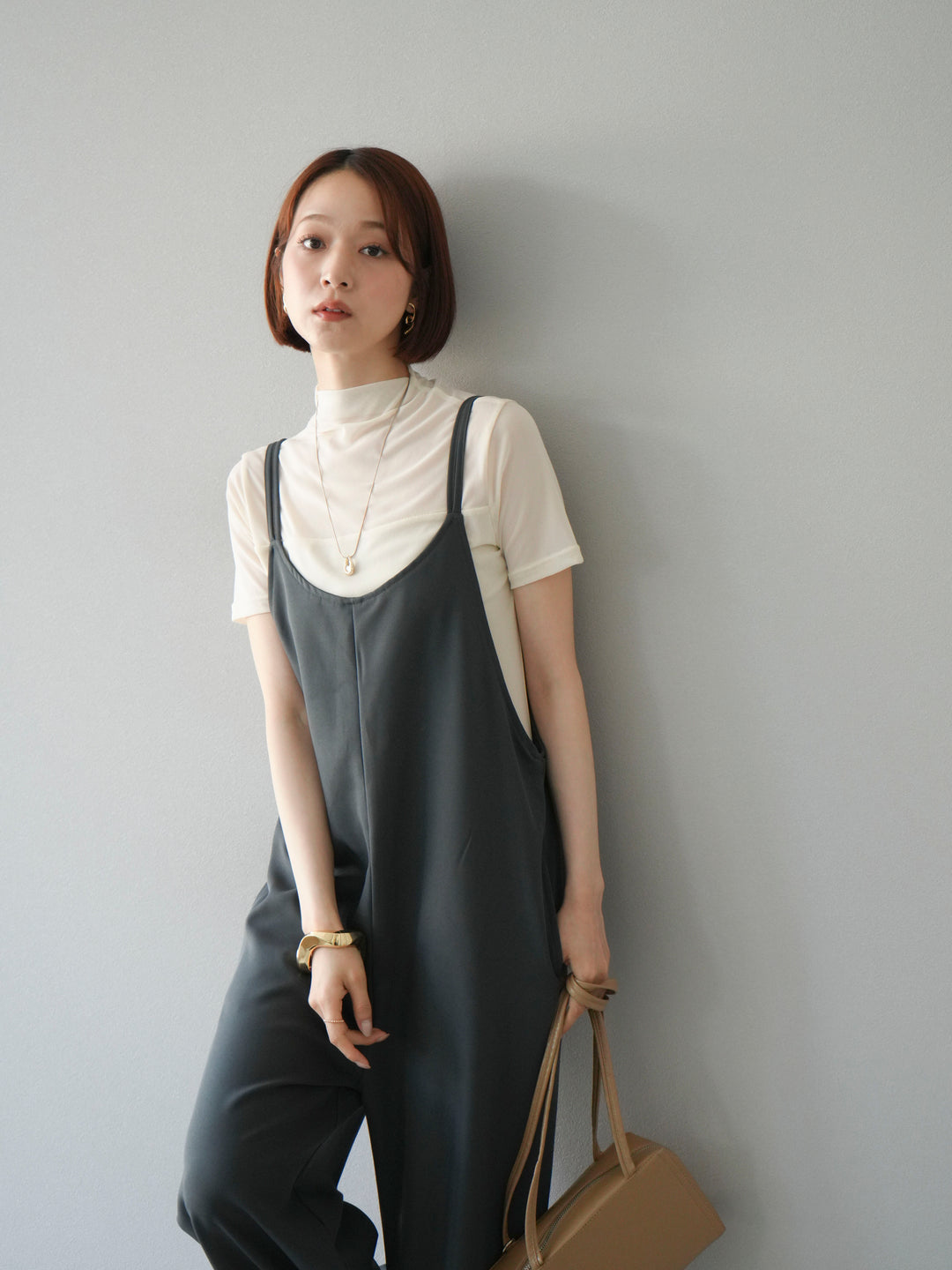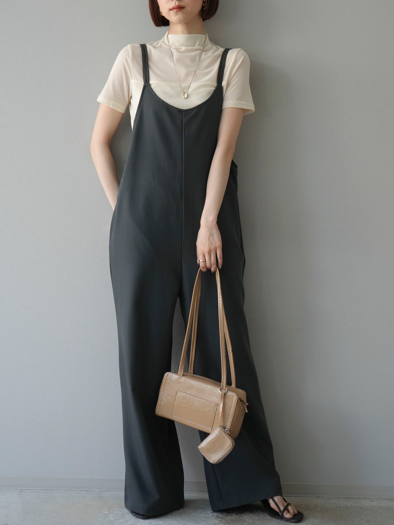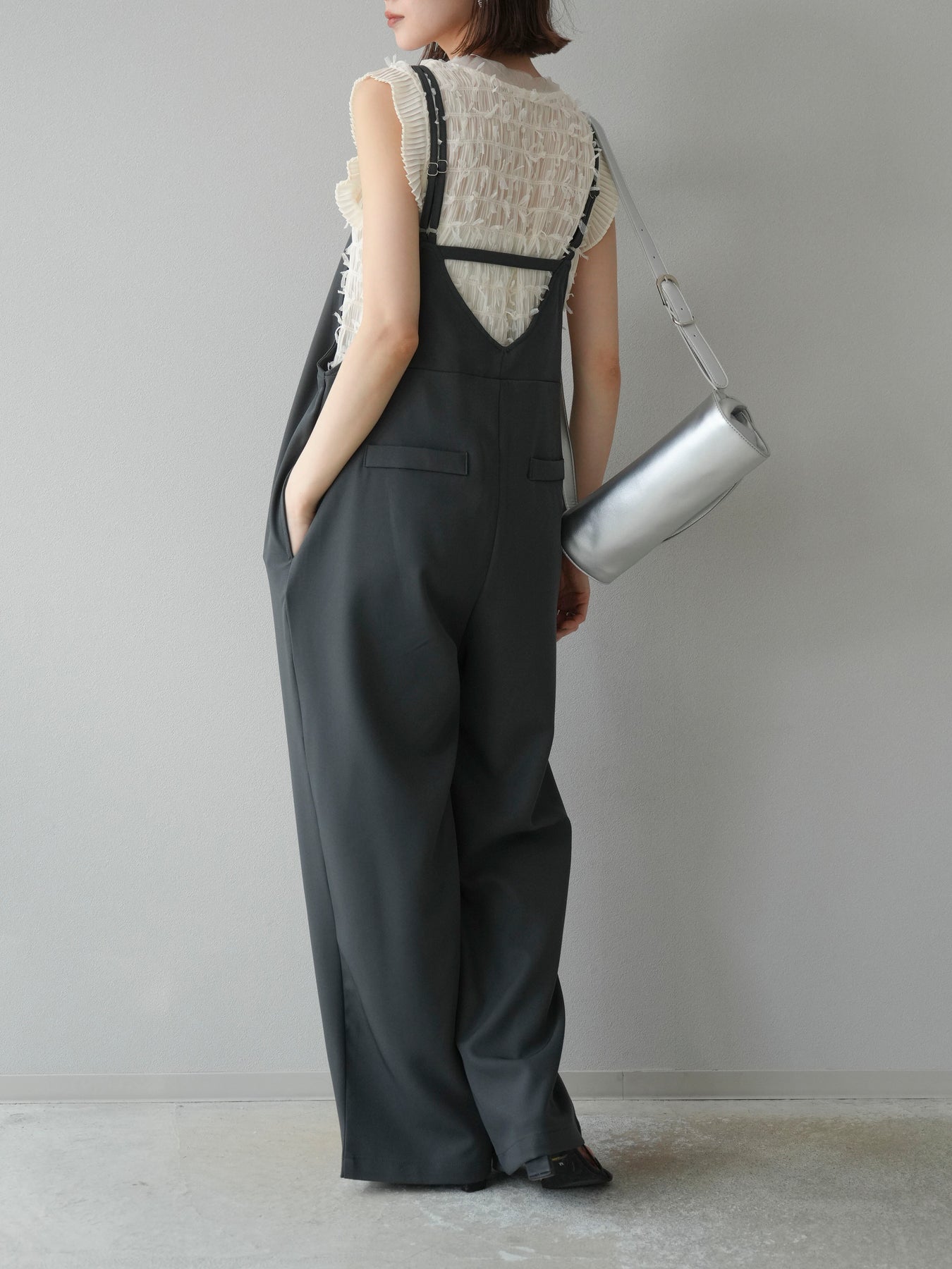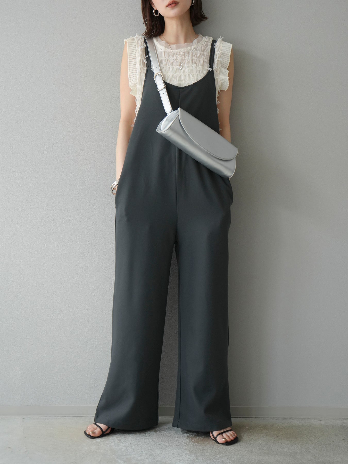 すっきりとしたフロントと、印象的なバックデザインが魅力のオールインワン。背中側に施された深めのVカットとダブルストラップが、程よく抜け感を与えつつ、こなれたムードを演出します。 落ち感のあるストレートシルエットで体のラインを拾わず、スタイルアップも叶うバランスの良い1枚。ストラップはアジャスター付きで長さ調節が可能なため、着丈やバランスの調整も自在です。 Tシャツやブラウスなど、インナー次第でロングシーズン着回せる万能アイテムです。 ※ボトムス、キャミソール(インナー)以外の商品は一律でインナーは付属していません。