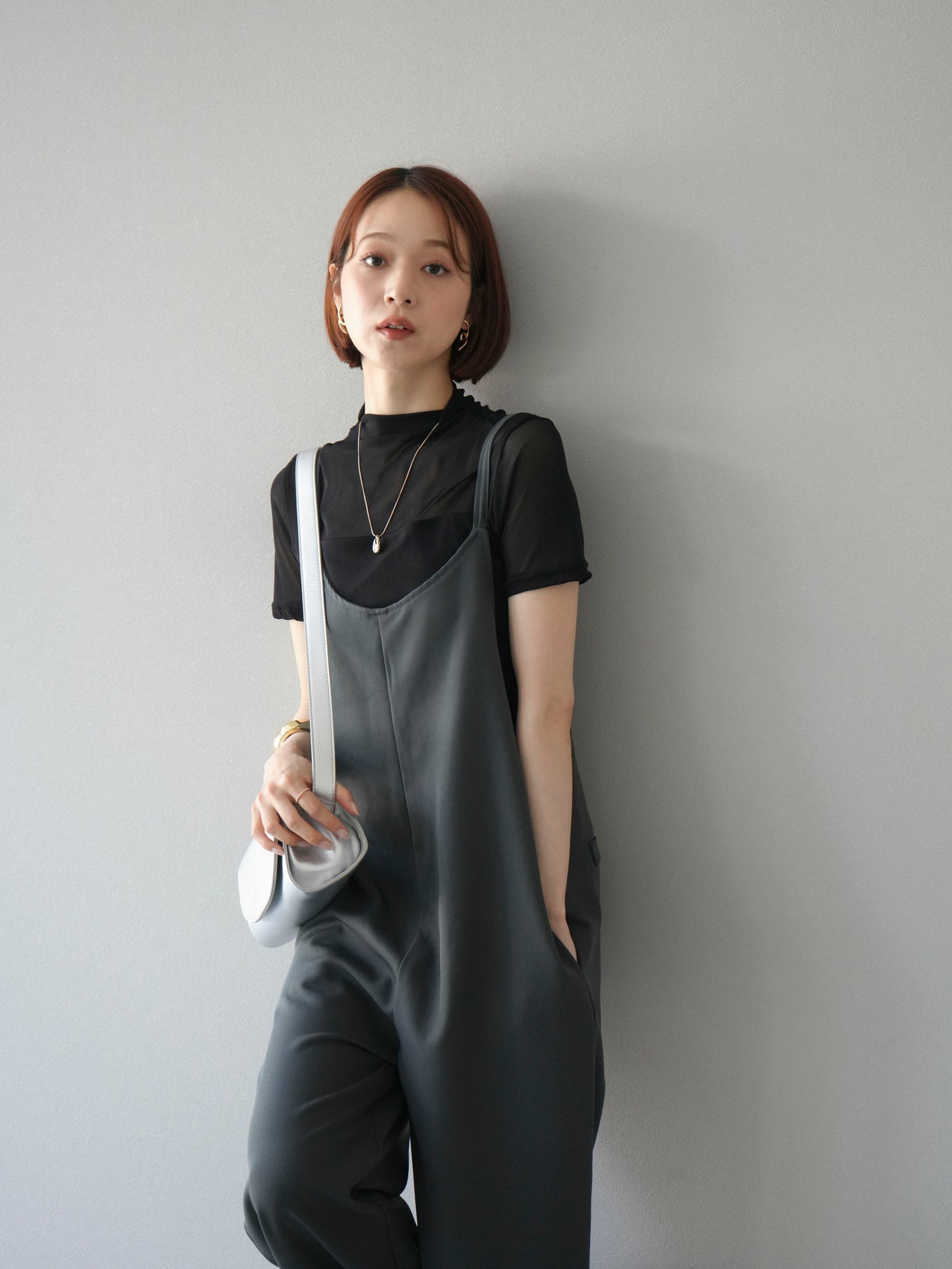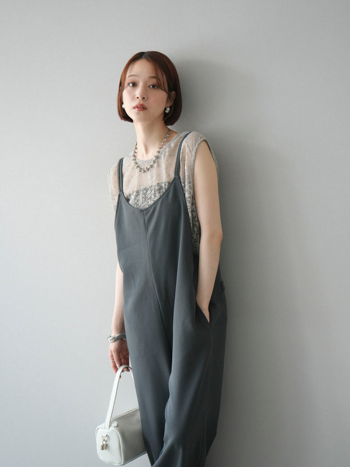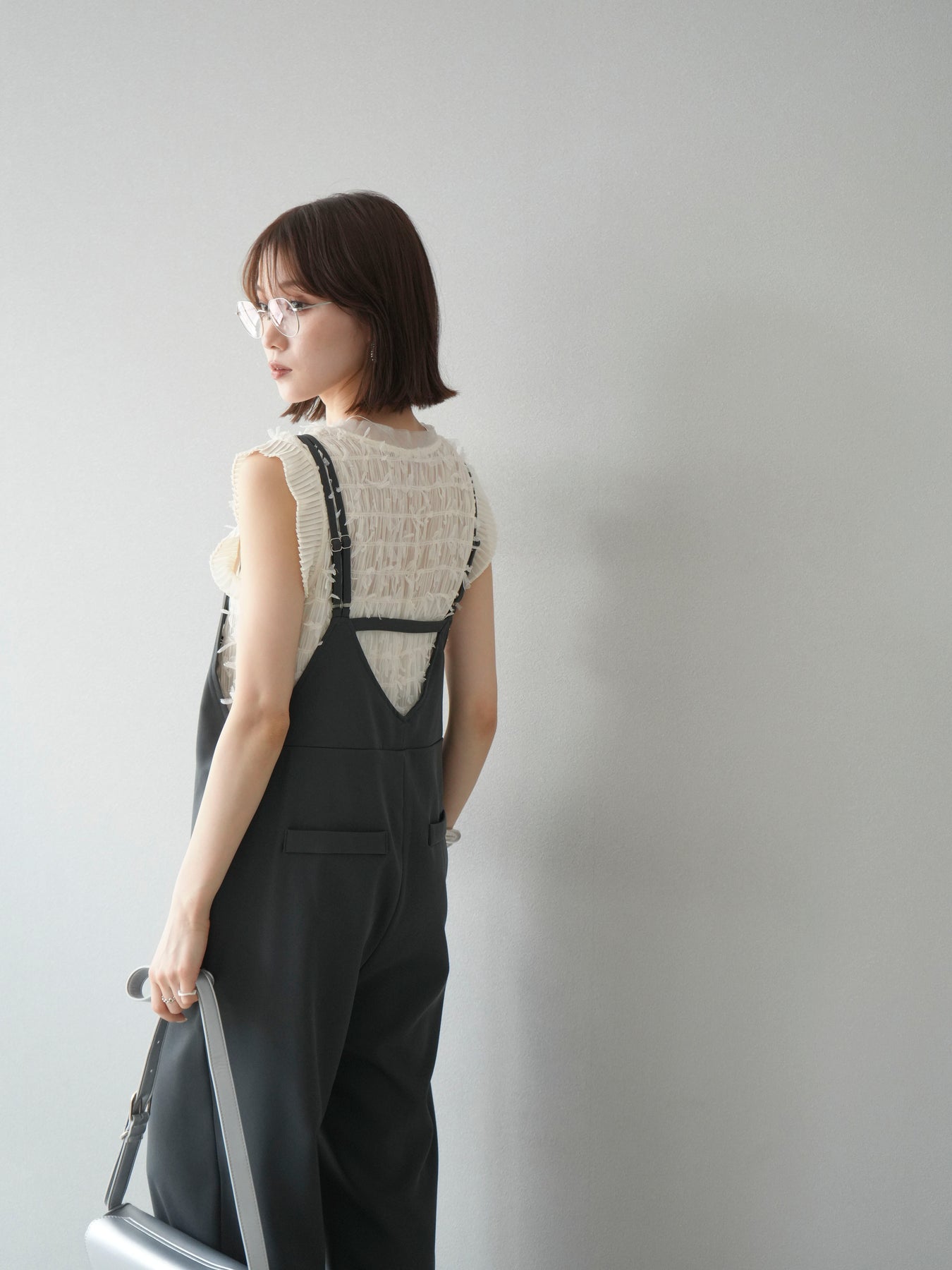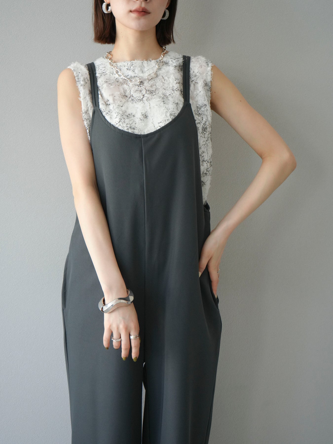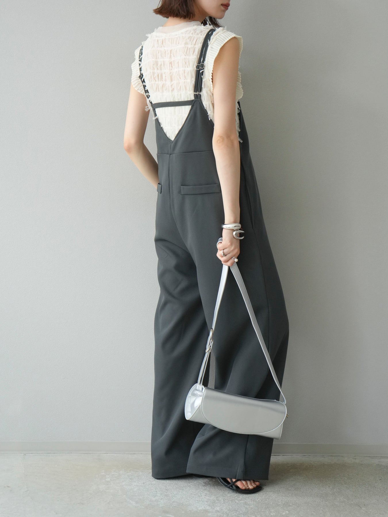 すっきりとしたフロントと、印象的なバックデザインが魅力のオールインワン。背中側に施された深めのVカットとダブルストラップが、程よく抜け感を与えつつ、こなれたムードを演出します。 落ち感のあるストレートシルエットで体のラインを拾わず、スタイルアップも叶うバランスの良い1枚。ストラップはアジャスター付きで長さ調節が可能なため、着丈やバランスの調整も自在です。 Tシャツやブラウスなど、インナー次第でロングシーズン着回せる万能アイテムです。 ※ボトムス、キャミソール(インナー)以外の商品は一律でインナーは付属していません。