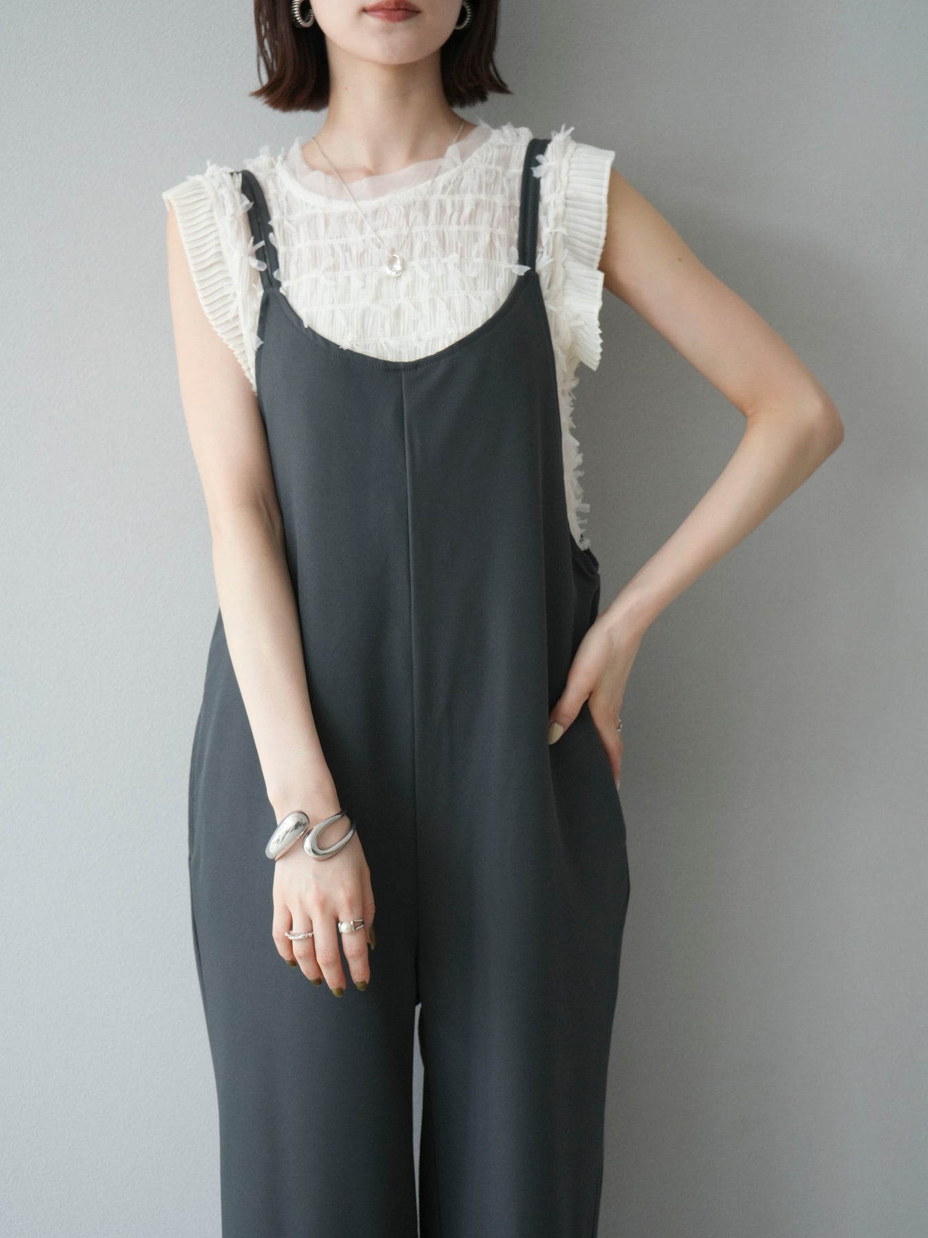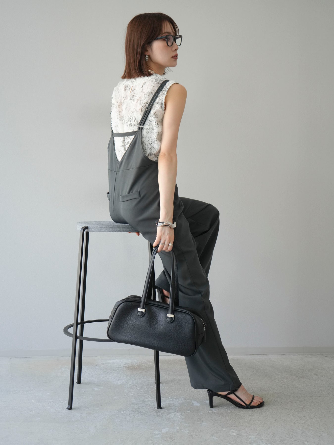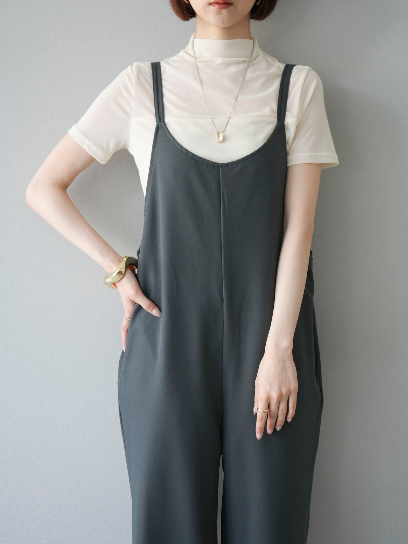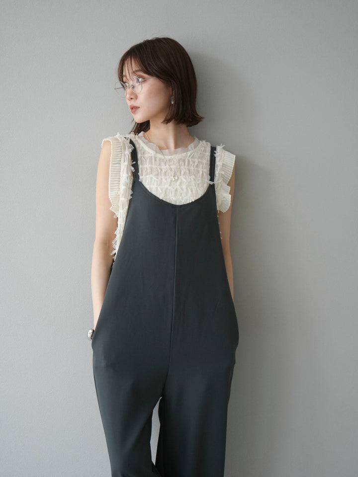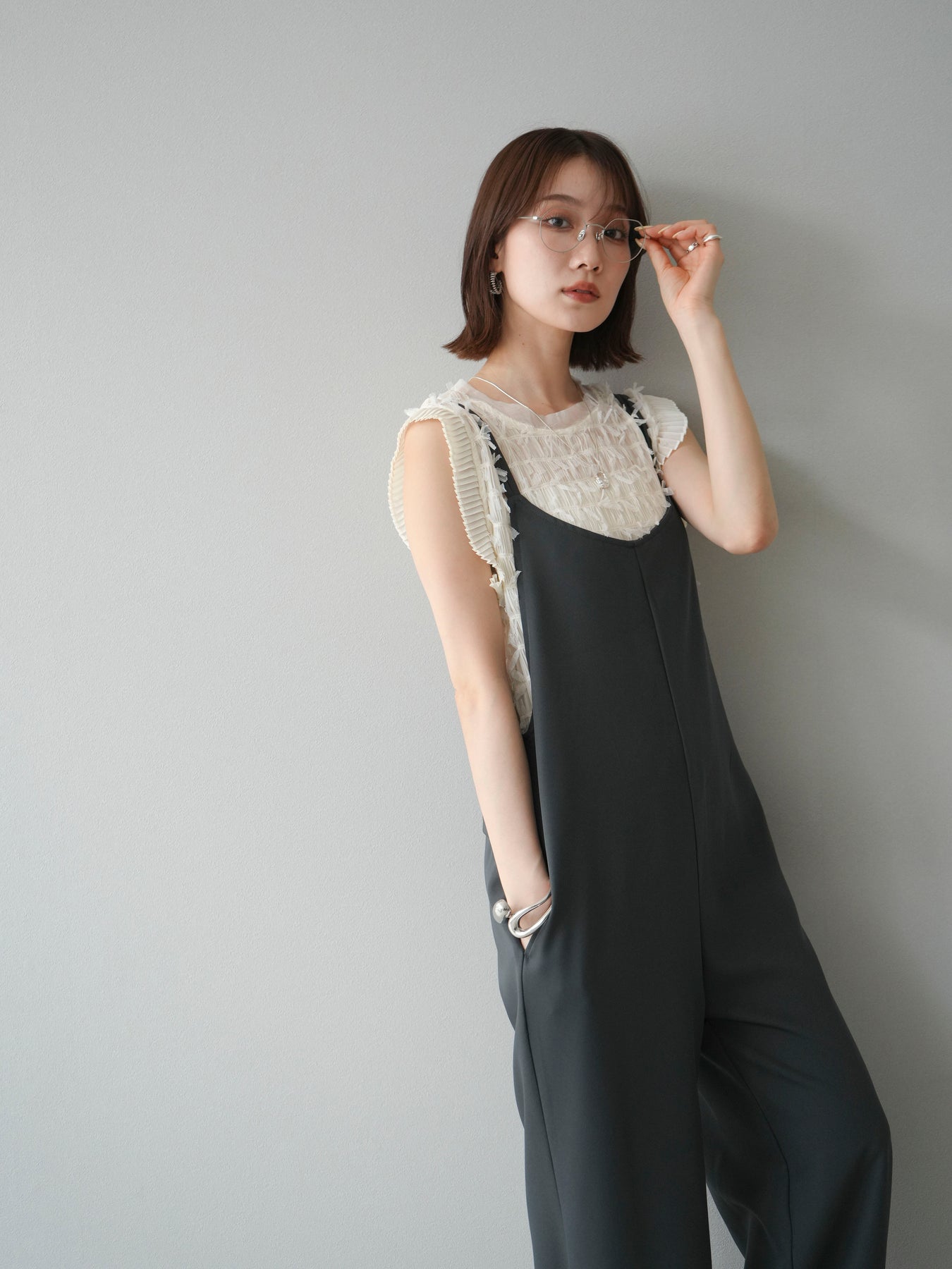 すっきりとしたフロントと、印象的なバックデザインが魅力のオールインワン。背中側に施された深めのVカットとダブルストラップが、程よく抜け感を与えつつ、こなれたムードを演出します。 落ち感のあるストレートシルエットで体のラインを拾わず、スタイルアップも叶うバランスの良い1枚。ストラップはアジャスター付きで長さ調節が可能なため、着丈やバランスの調整も自在です。 Tシャツやブラウスなど、インナー次第でロングシーズン着回せる万能アイテムです。 ※ボトムス、キャミソール(インナー)以外の商品は一律でインナーは付属していません。