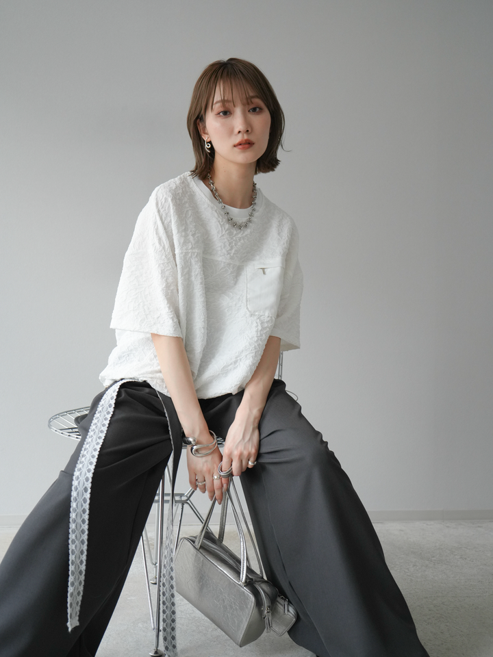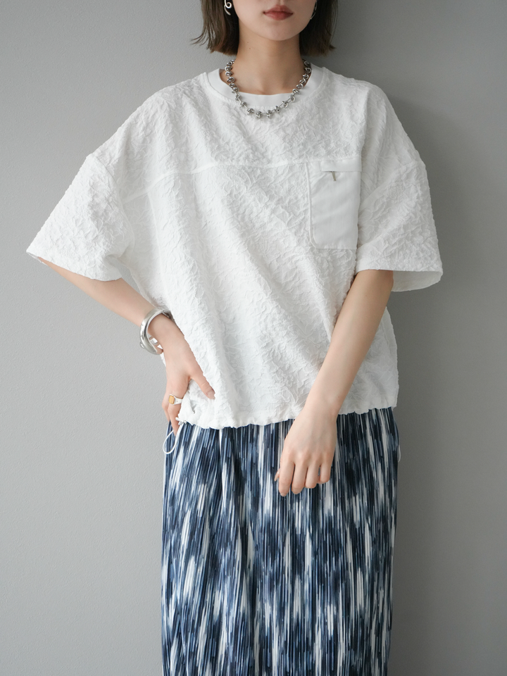 表情豊かなジャガード生地で仕上げたプルオーバー。程よくゆとりのあるシルエットに、胸元のポケットがアクセントに。裾にはドロスト仕様を施し、シルエットに変化をつけられるのも魅力です。ストレッチが効いているので着心地も抜群。抜け感のあるカジュアルスタイルにぴったりのアイテムです。 ※ボトムス、キャミソール(インナー)以外の商品は一律でインナーは付属していません