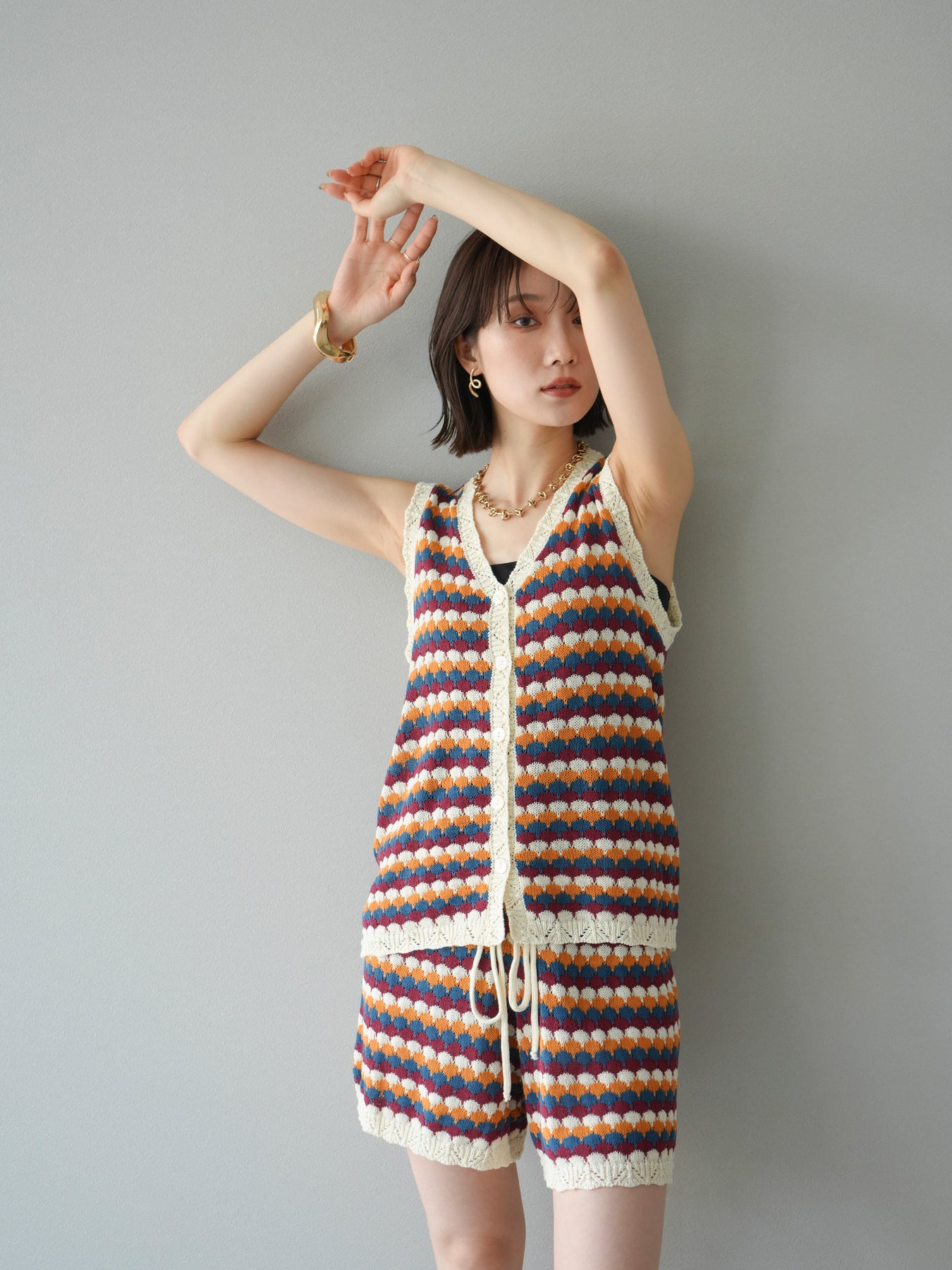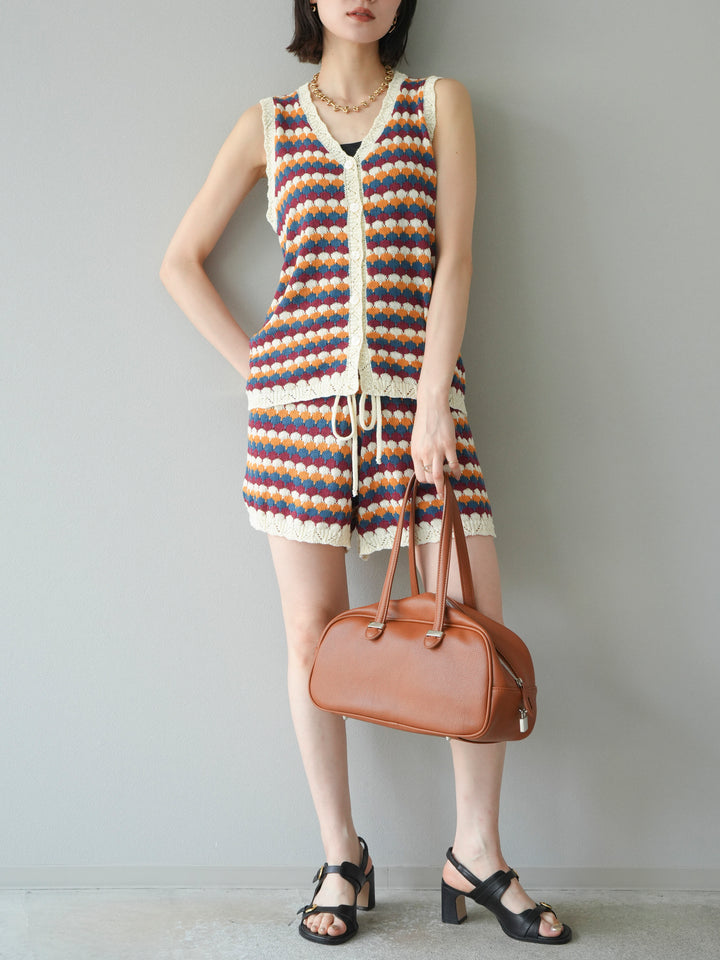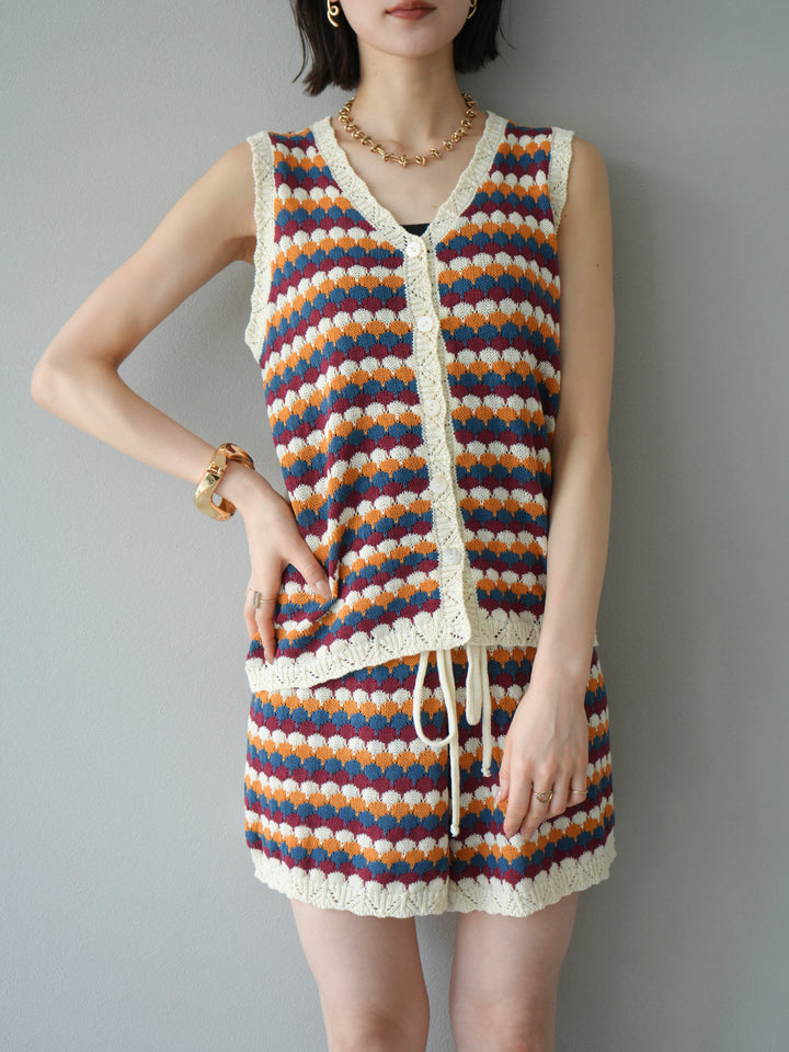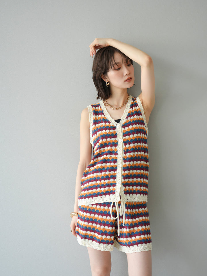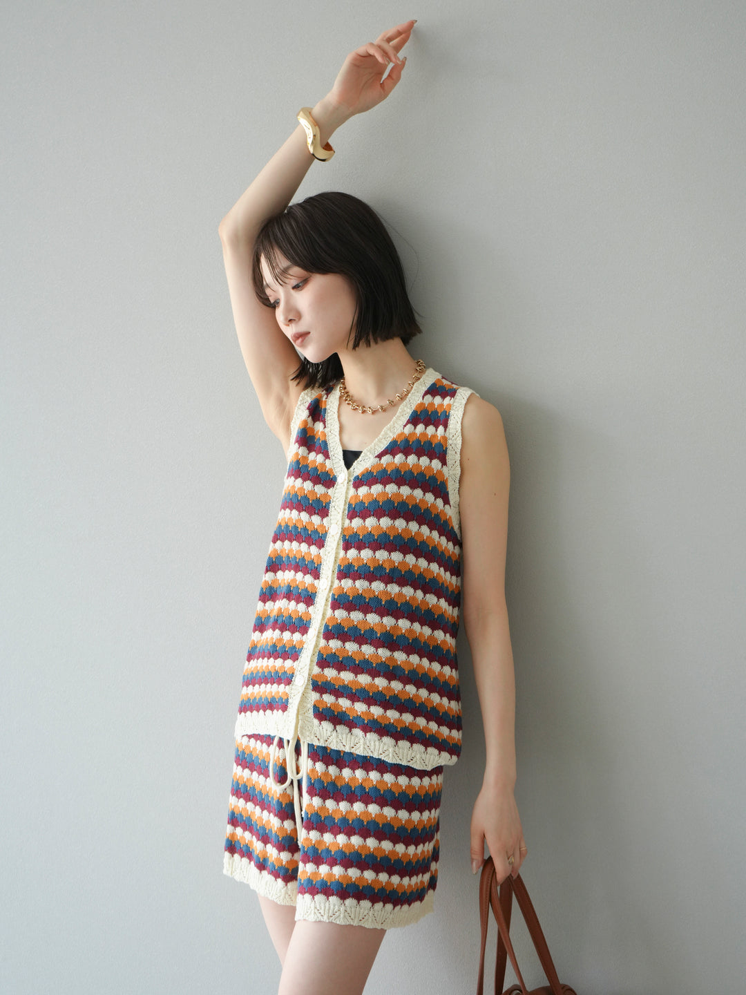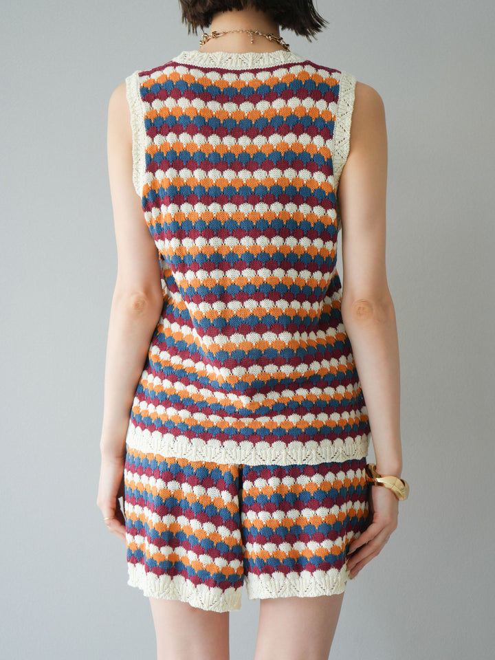 レトロな雰囲気漂うカラフルなボーダー柄が目を惹く、デザインボーダーニットベスト&ショートパンツのセットアップ。透かし編み風の軽やかなサマーニット素材で、通気性も良く真夏でも快適な着心地を叶えます。ベストはVネック&フロントボタン仕様で、インナーとのレイヤードも楽しめるデザイン。ショートパンツはウエストゴム仕様でリラックス感たっぷり。セットでの着用はもちろん、それぞれ単品でも着回し力抜群。リゾートやデイリーにぴったりの映えるサマールックです。 ※ボトムス、キャミソール(インナー)以外の商品は一律でインナーは付属していません。