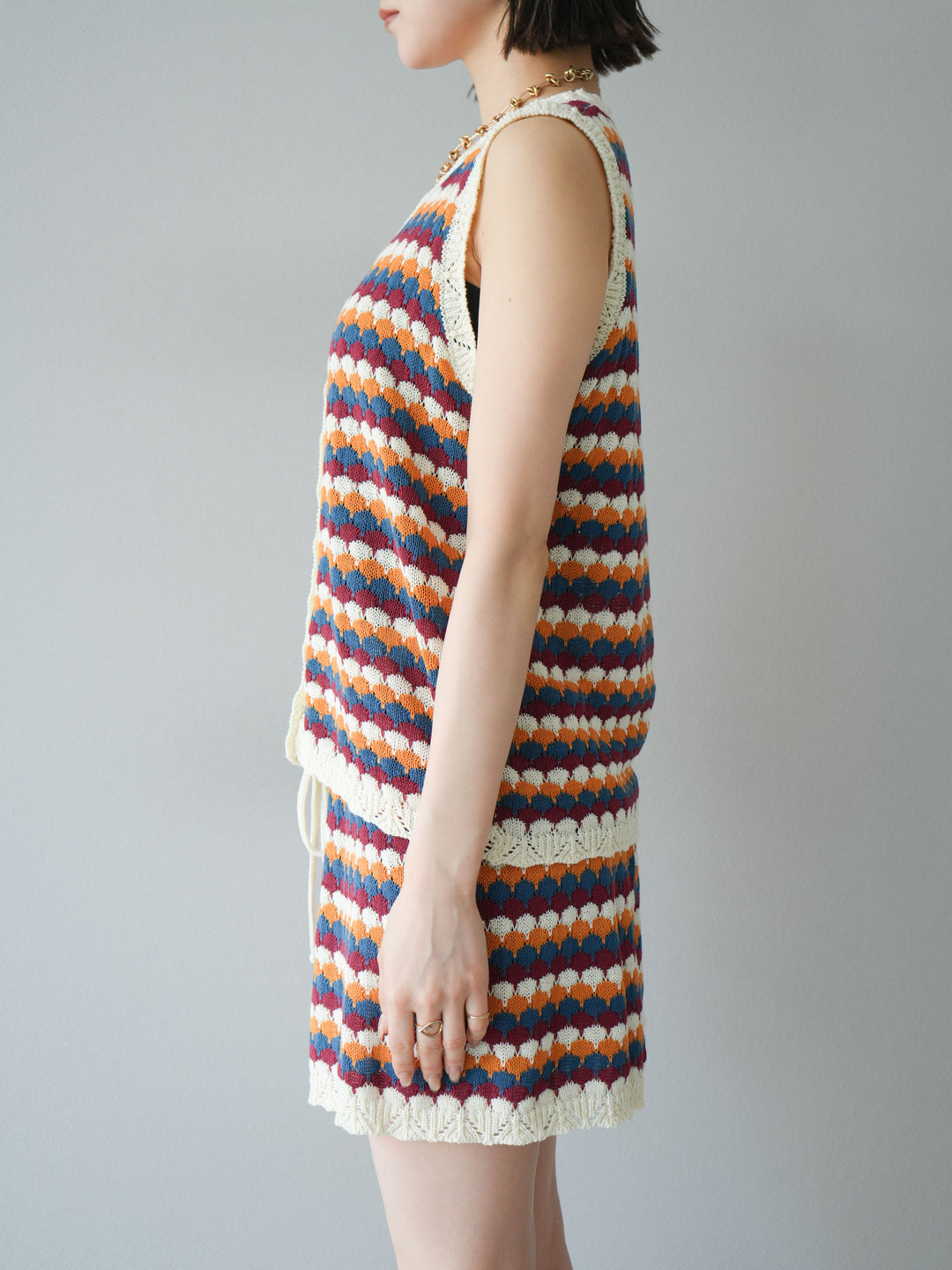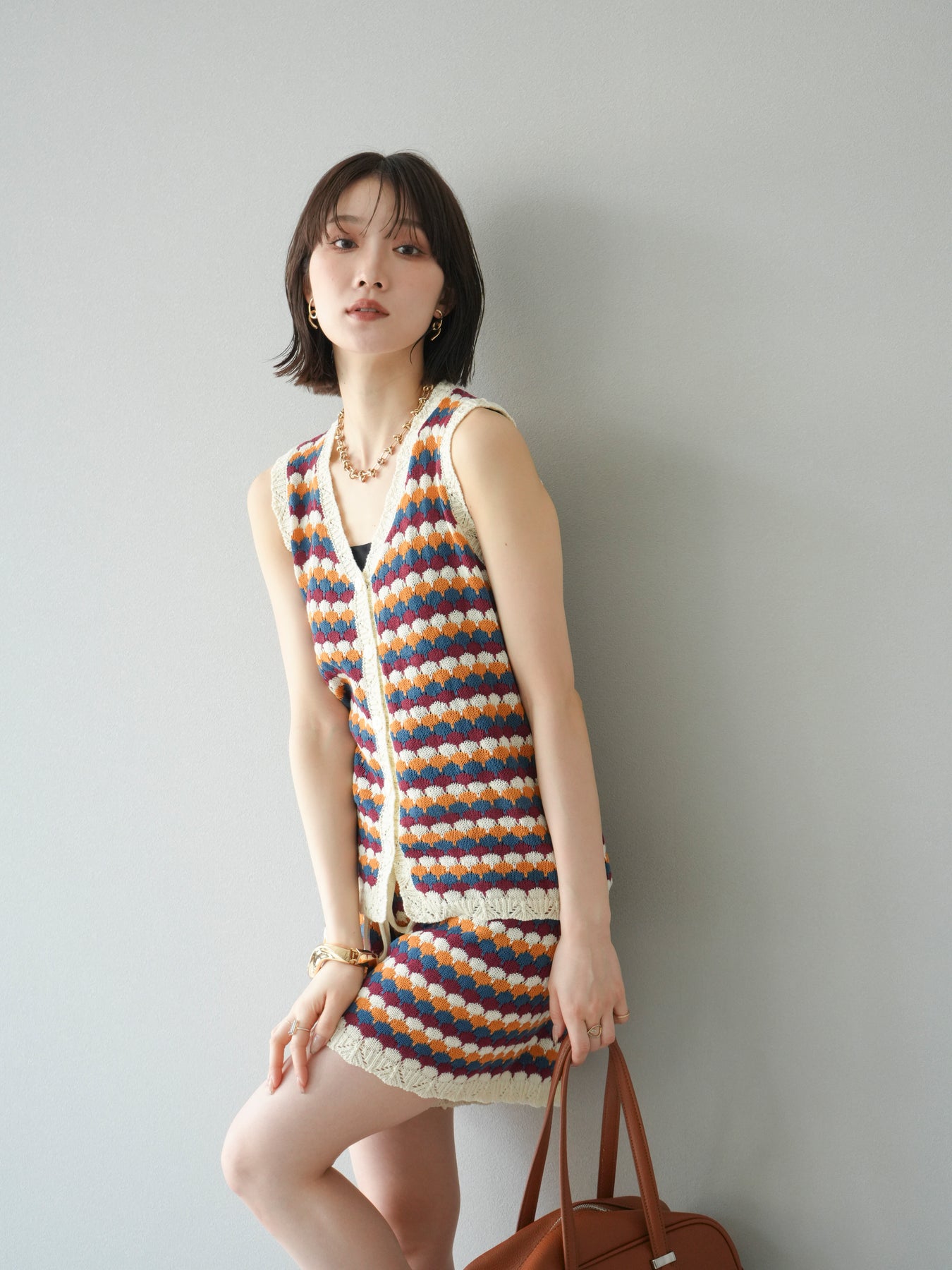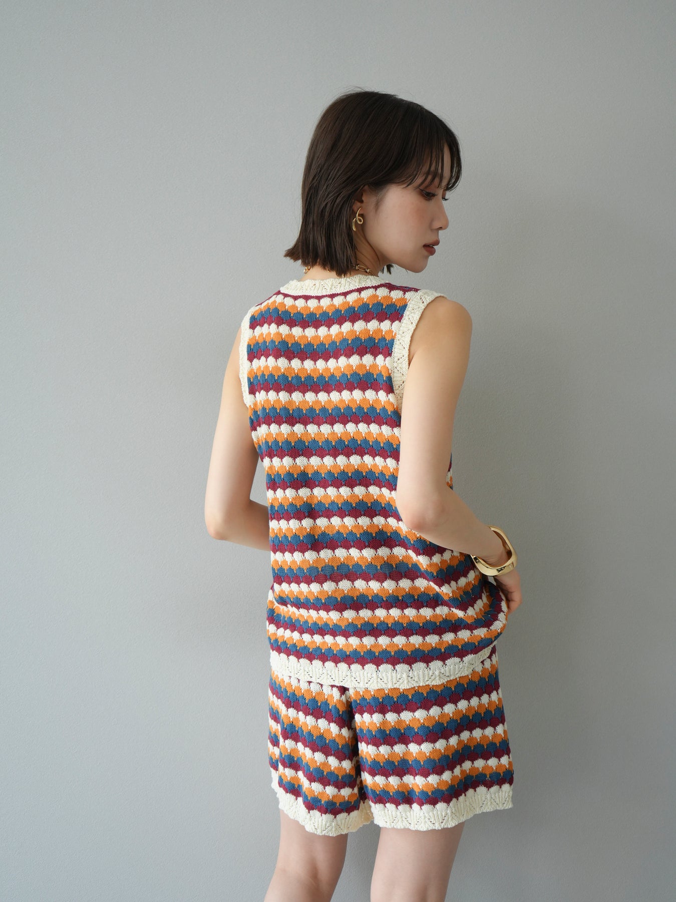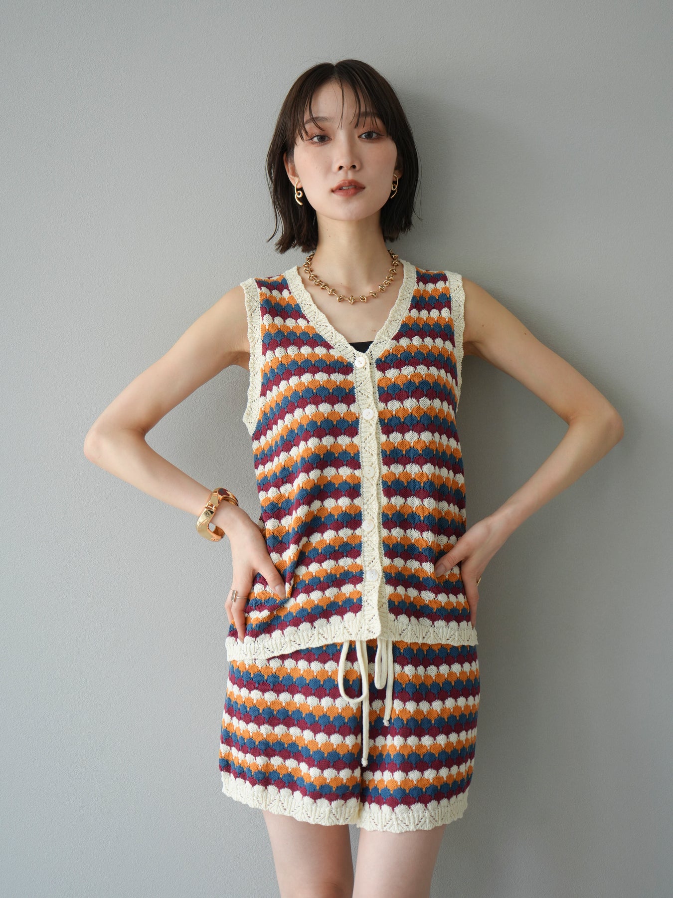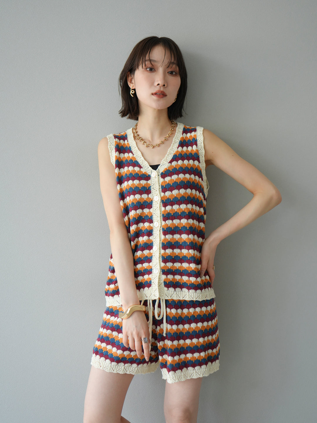 レトロな雰囲気漂うカラフルなボーダー柄が目を惹く、デザインボーダーニットベスト&ショートパンツのセットアップ。透かし編み風の軽やかなサマーニット素材で、通気性も良く真夏でも快適な着心地を叶えます。ベストはVネック&フロントボタン仕様で、インナーとのレイヤードも楽しめるデザイン。ショートパンツはウエストゴム仕様でリラックス感たっぷり。セットでの着用はもちろん、それぞれ単品でも着回し力抜群。リゾートやデイリーにぴったりの映えるサマールックです。 ※ボトムス、キャミソール(インナー)以外の商品は一律でインナーは付属していません。