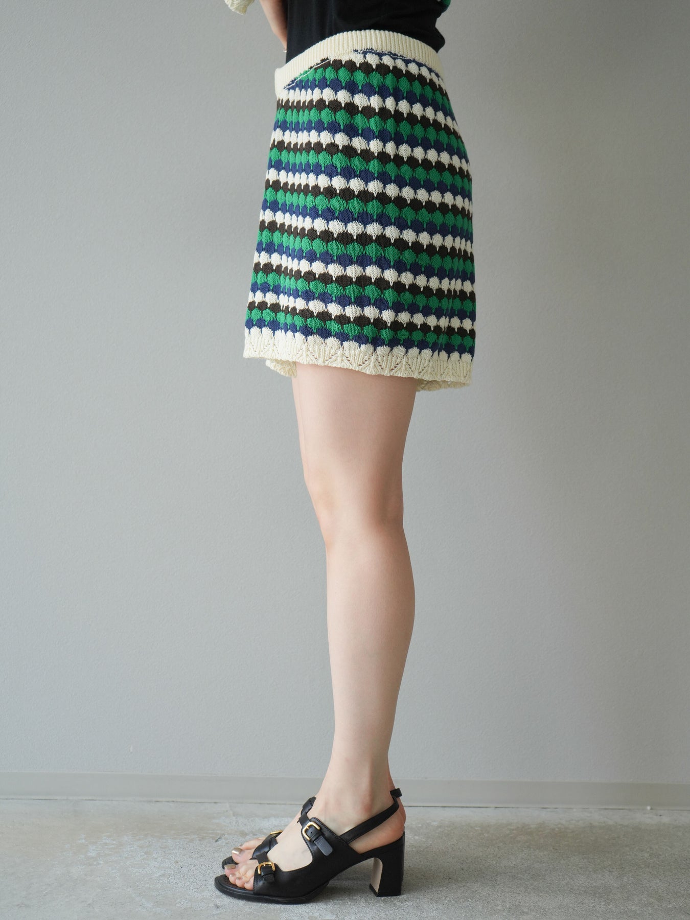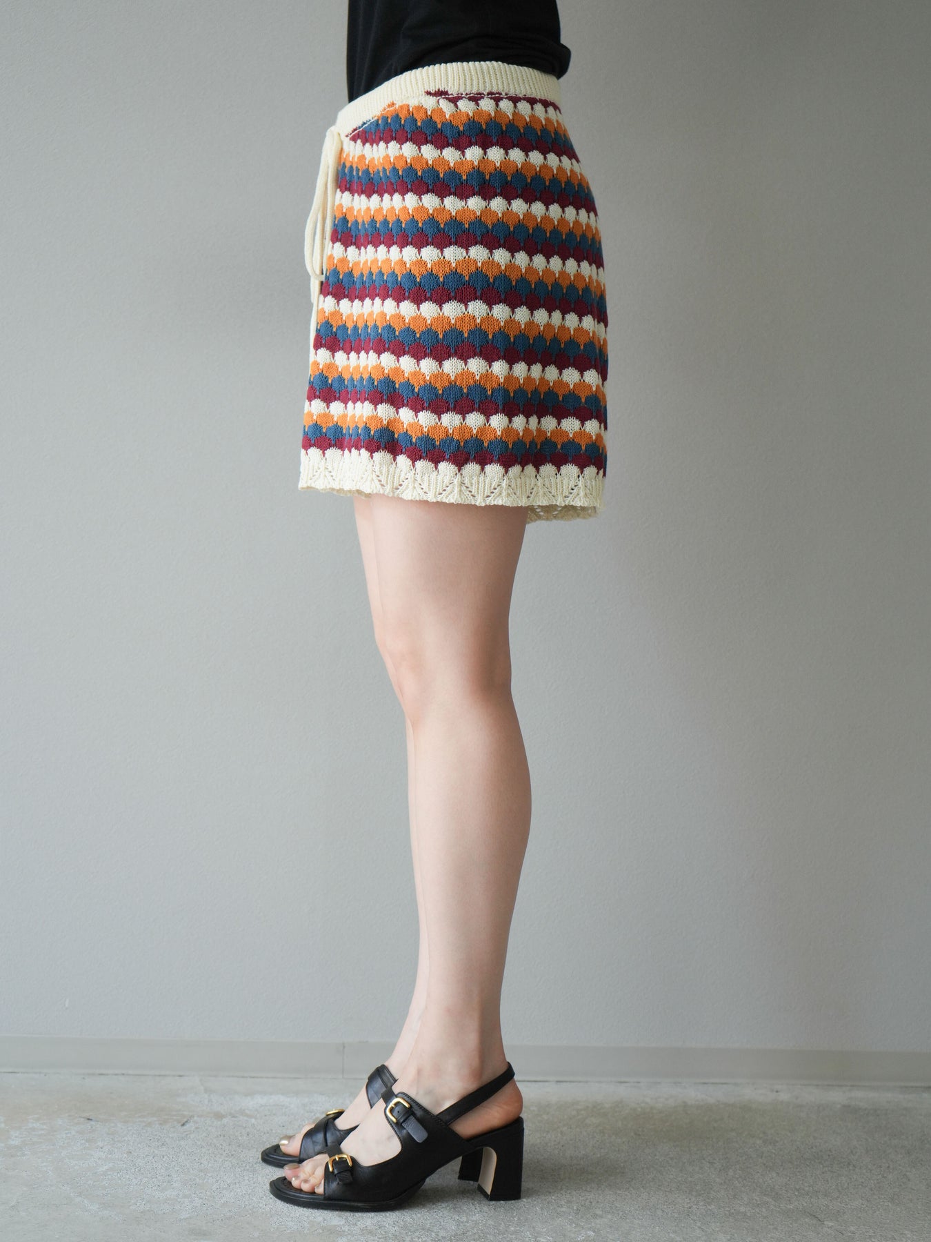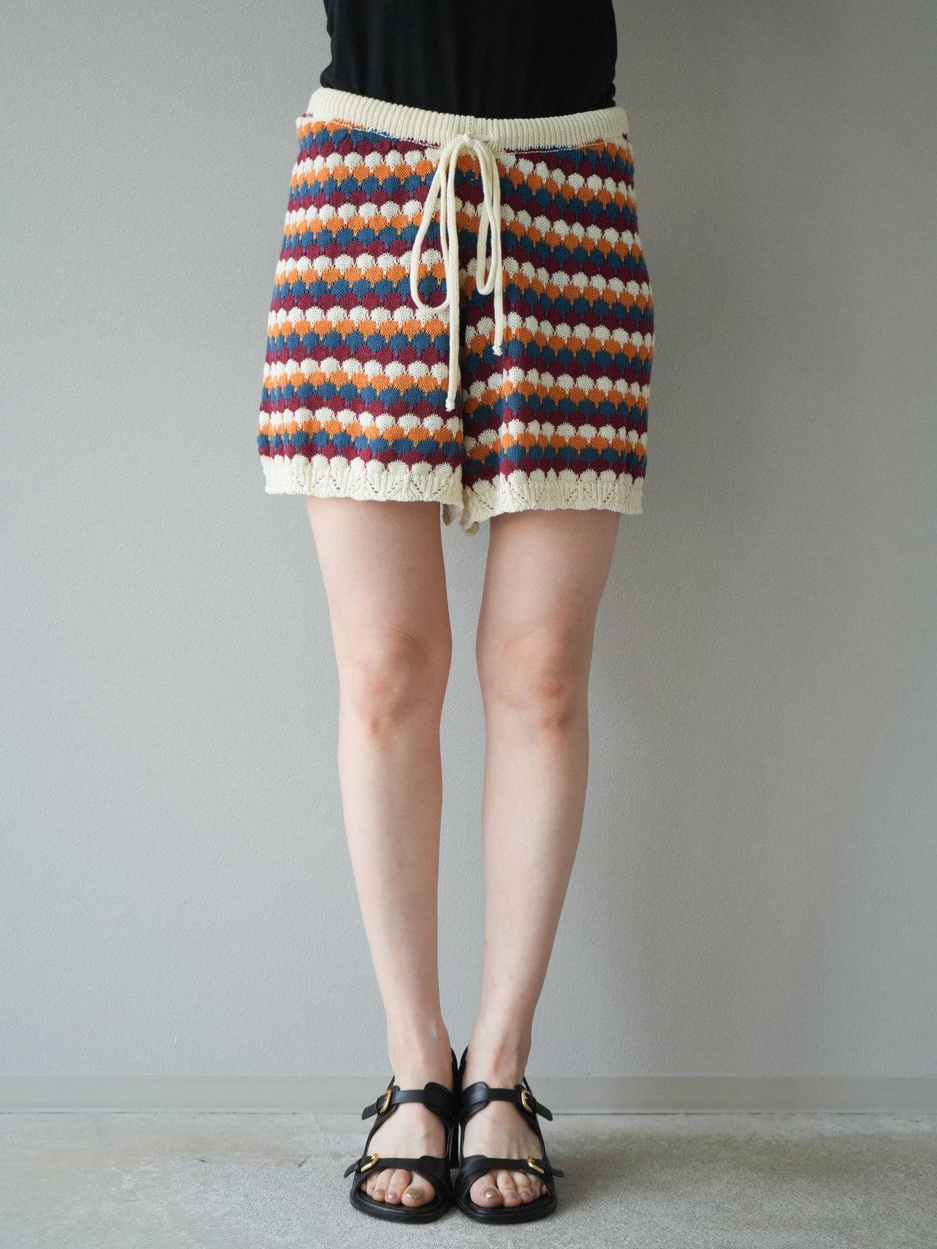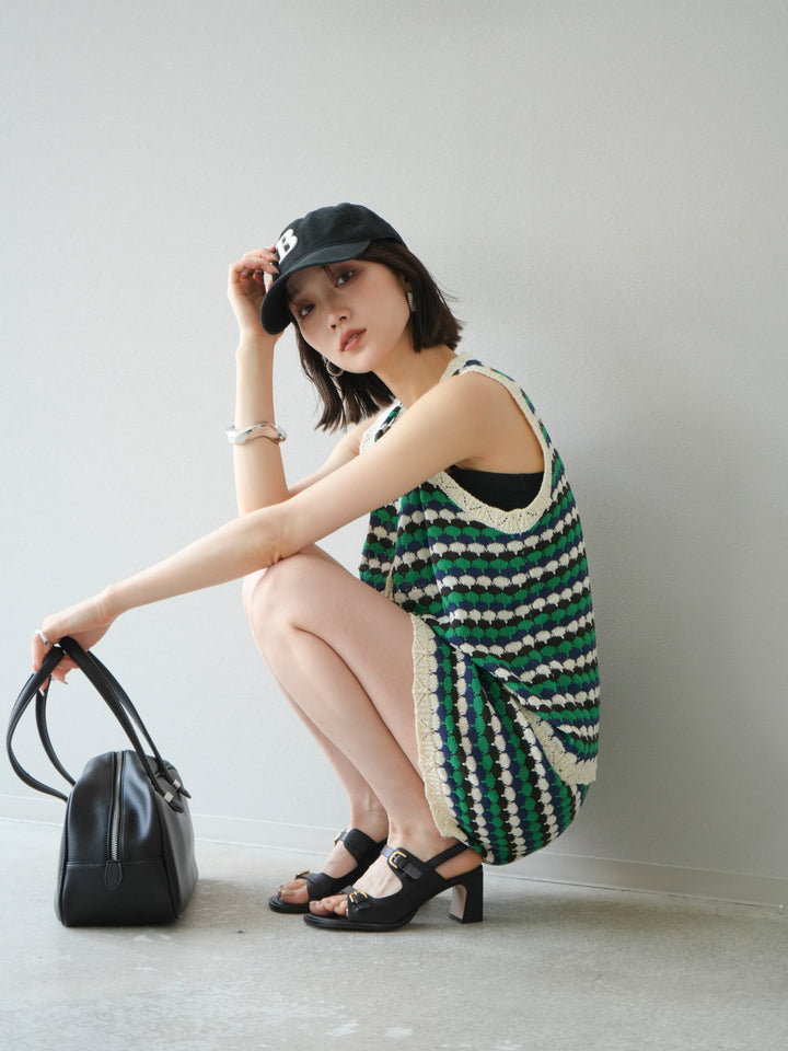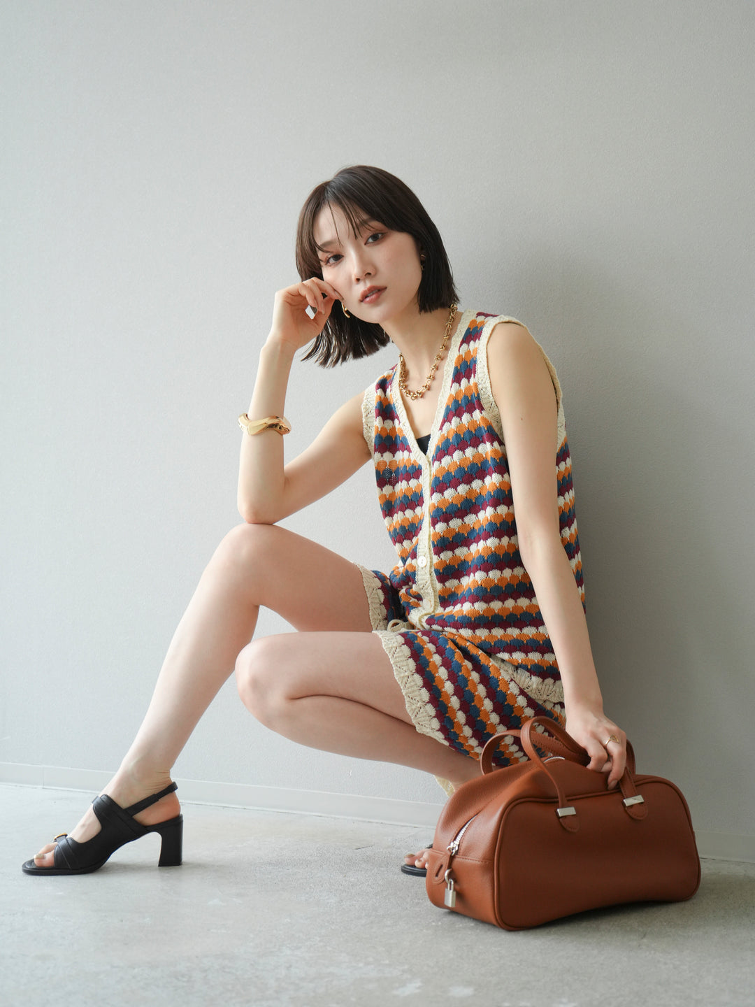レトロな雰囲気漂うカラフルなボーダー柄が目を惹く、デザインボーダーニットベスト&ショートパンツのセットアップ。透かし編み風の軽やかなサマーニット素材で、通気性も良く真夏でも快適な着心地を叶えます。ベストはVネック&フロントボタン仕様で、インナーとのレイヤードも楽しめるデザイン。ショートパンツはウエストゴム仕様でリラックス感たっぷり。セットでの着用はもちろん、それぞれ単品でも着回し力抜群。リゾートやデイリーにぴったりの映えるサマールックです。 ※ボトムス、キャミソール(インナー)以外の商品は一律でインナーは付属していません。