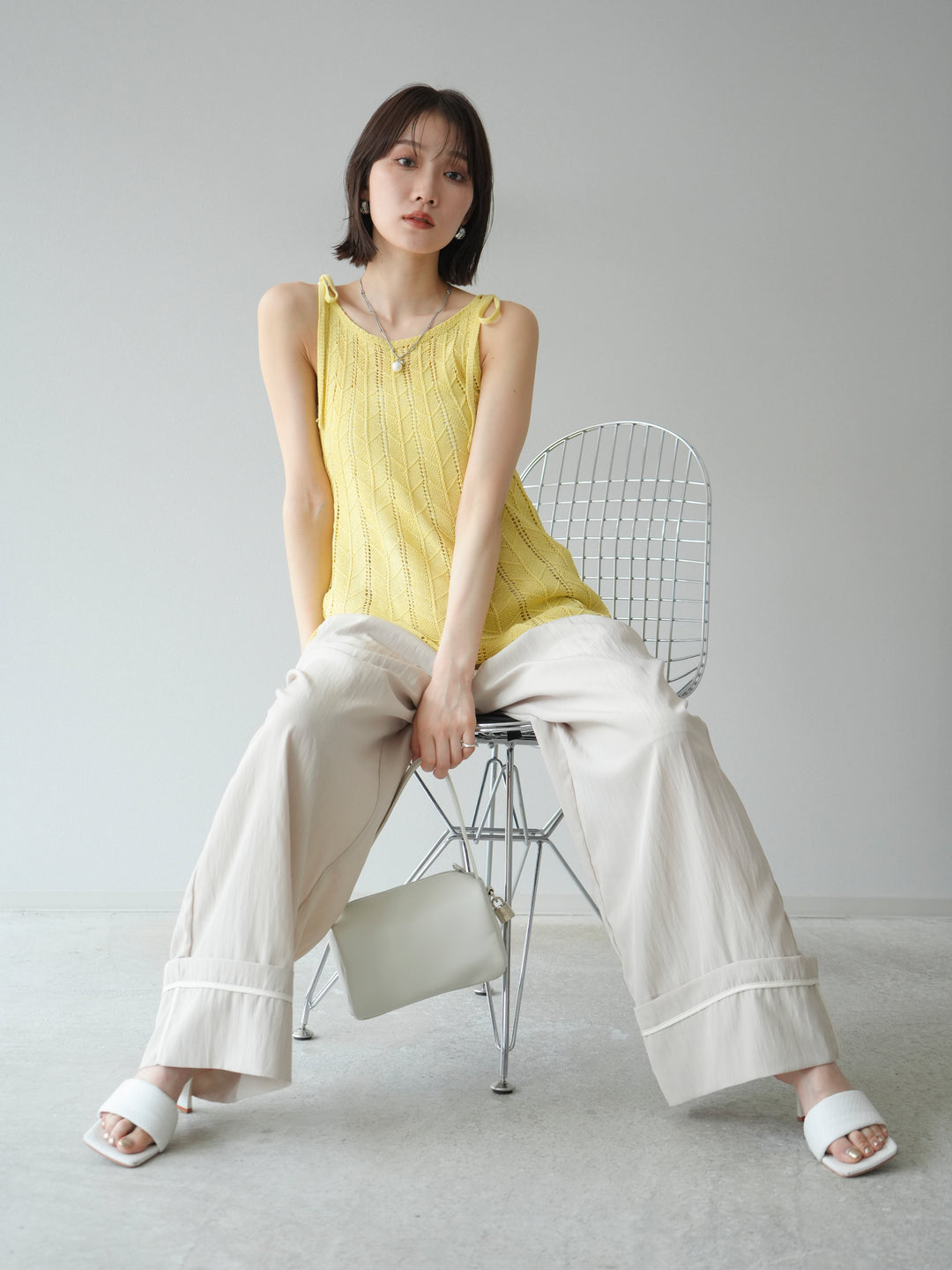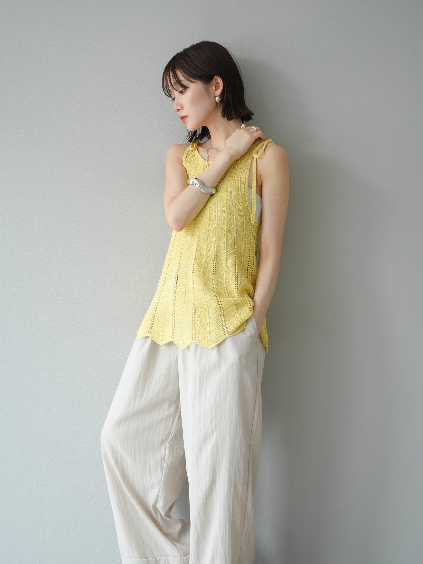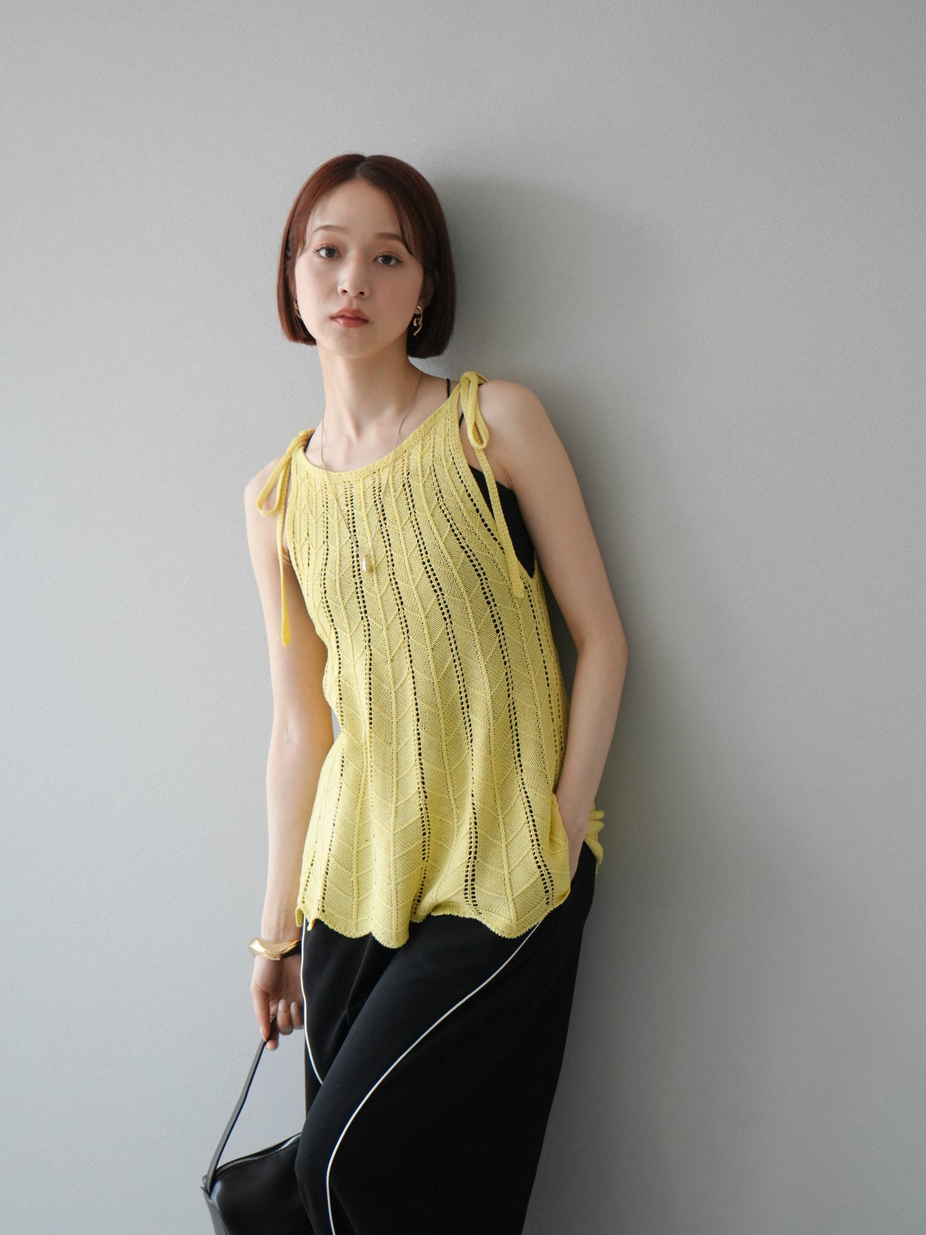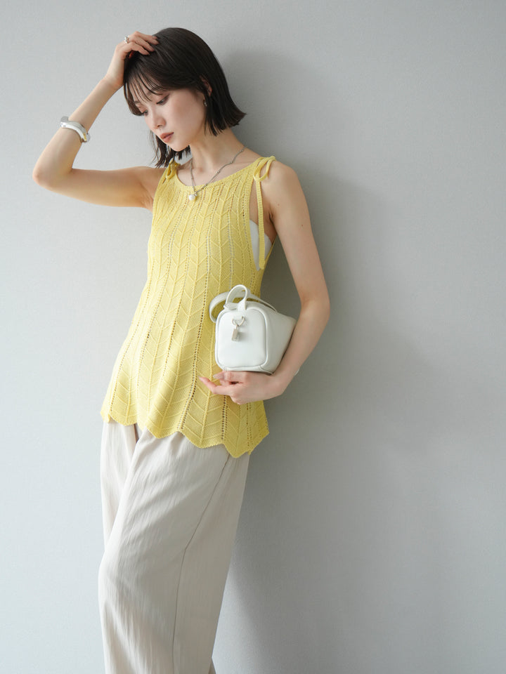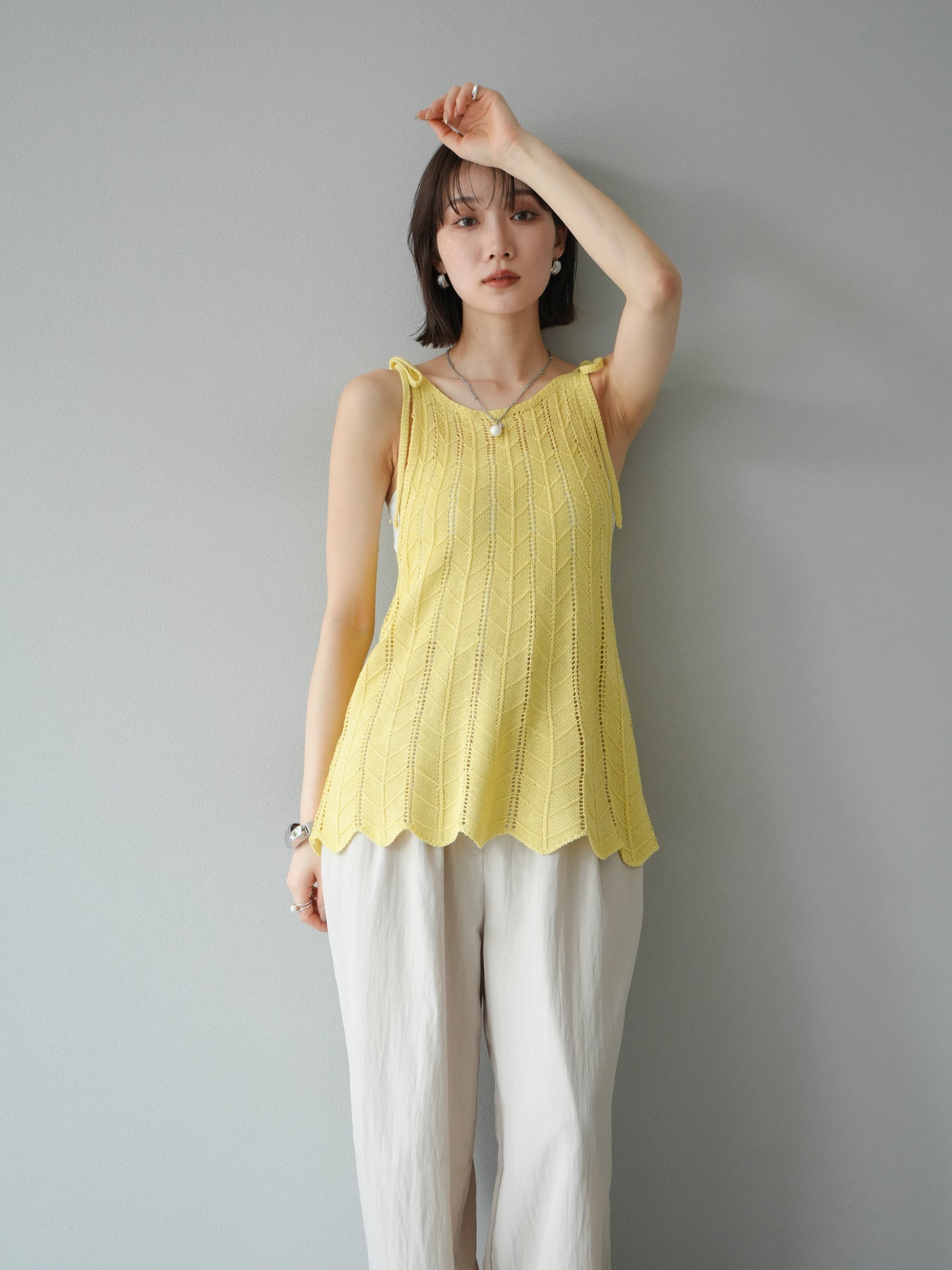 繊細な透かし編みが涼しげな印象を与える、透かしニットキャミソール。ナチュラルな透け感と軽やかな素材感が春夏のレイヤードスタイルにぴったりな一着です。肩紐はリボン結びで長さ調整が可能となっており、さりげないフェミニンさもプラス。ほどよく広がるAラインシルエットで、体のラインを拾いすぎずリラックス感のある着心地を実現します。Tシャツやタンクトップに重ねたり、ワンピースのインナーとしても着回しの効く万能アイテムです。 ※ボトムス、キャミソール(インナー)以外の商品は一律でインナーは付属していません。