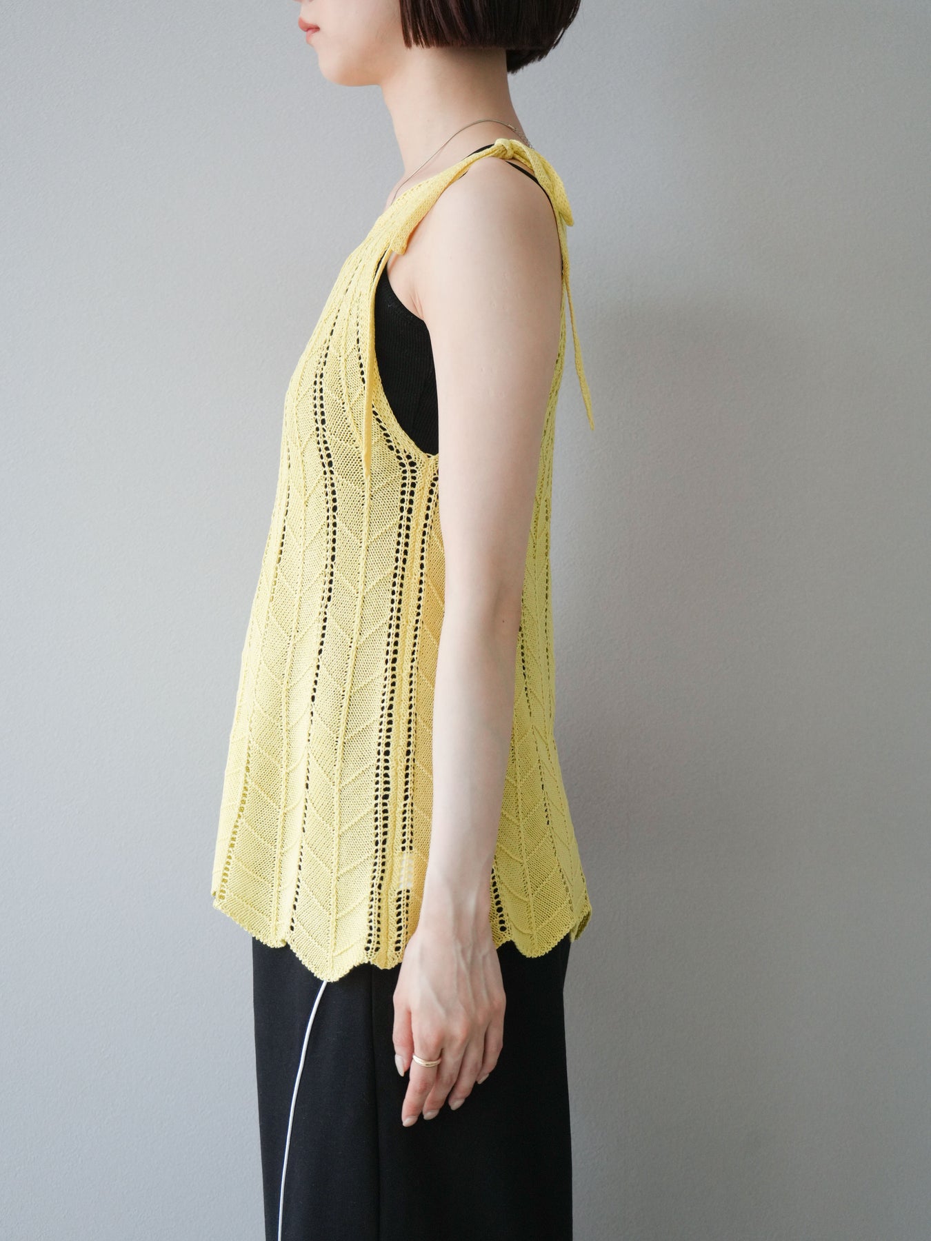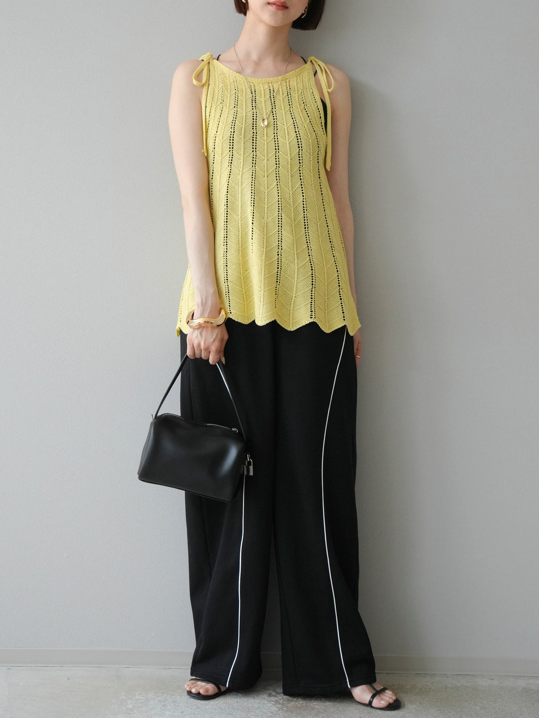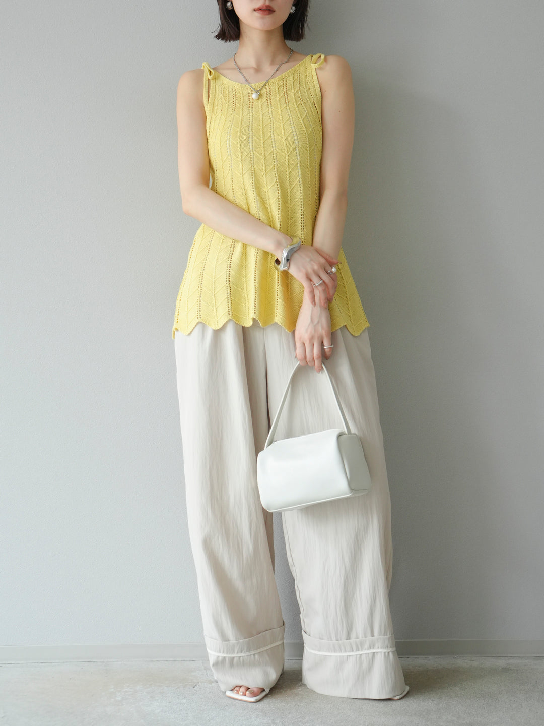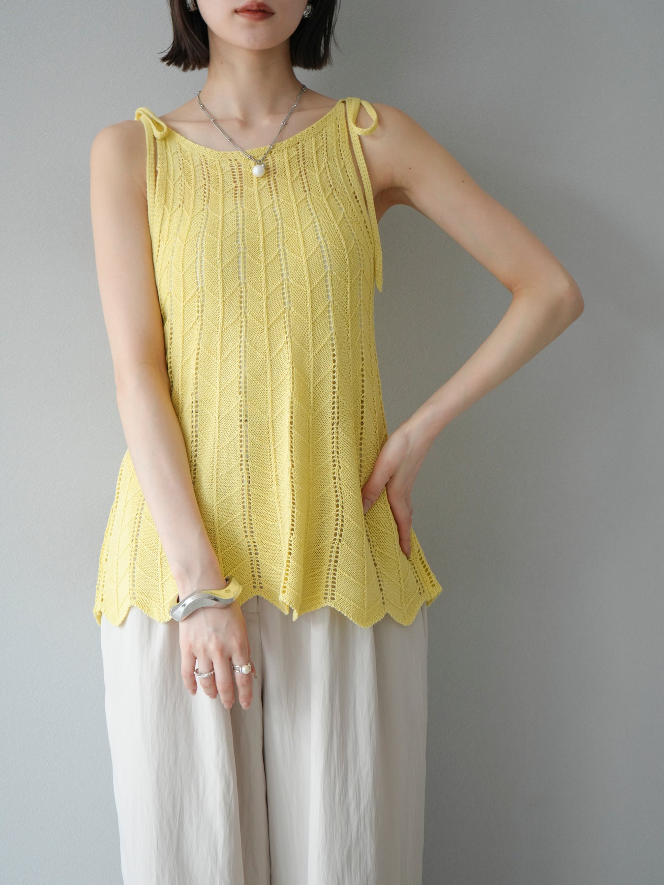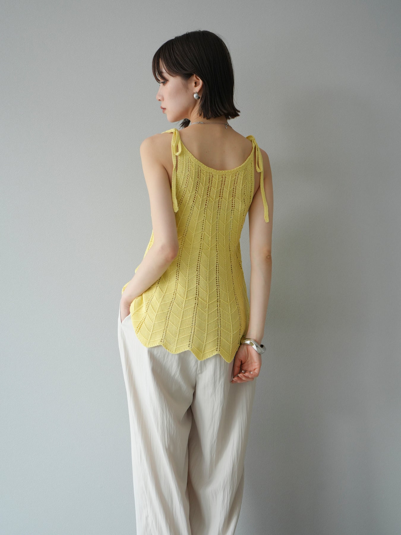 繊細な透かし編みが涼しげな印象を与える、透かしニットキャミソール。ナチュラルな透け感と軽やかな素材感が春夏のレイヤードスタイルにぴったりな一着です。肩紐はリボン結びで長さ調整が可能となっており、さりげないフェミニンさもプラス。ほどよく広がるAラインシルエットで、体のラインを拾いすぎずリラックス感のある着心地を実現します。Tシャツやタンクトップに重ねたり、ワンピースのインナーとしても着回しの効く万能アイテムです。 ※ボトムス、キャミソール(インナー)以外の商品は一律でインナーは付属していません。