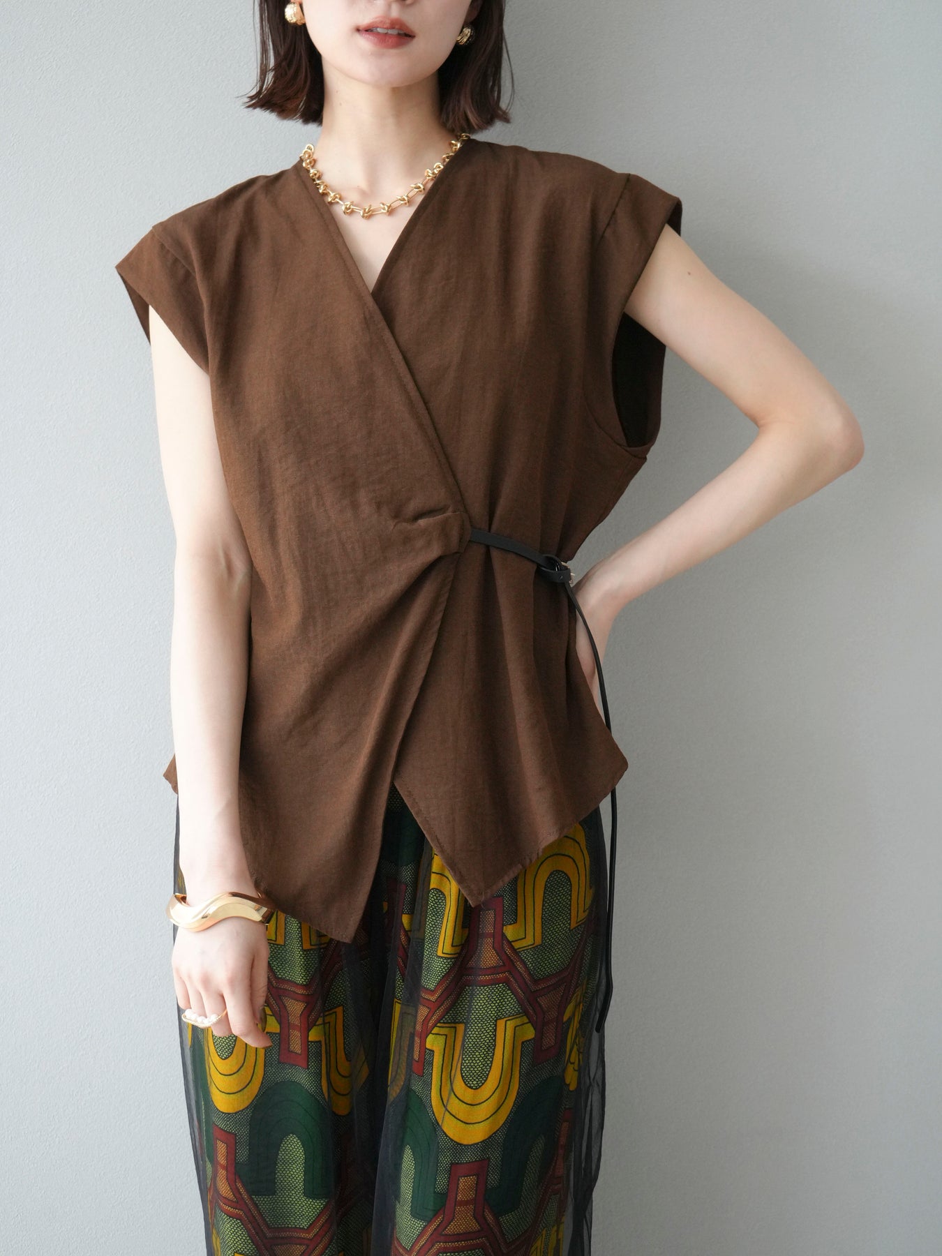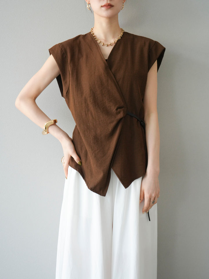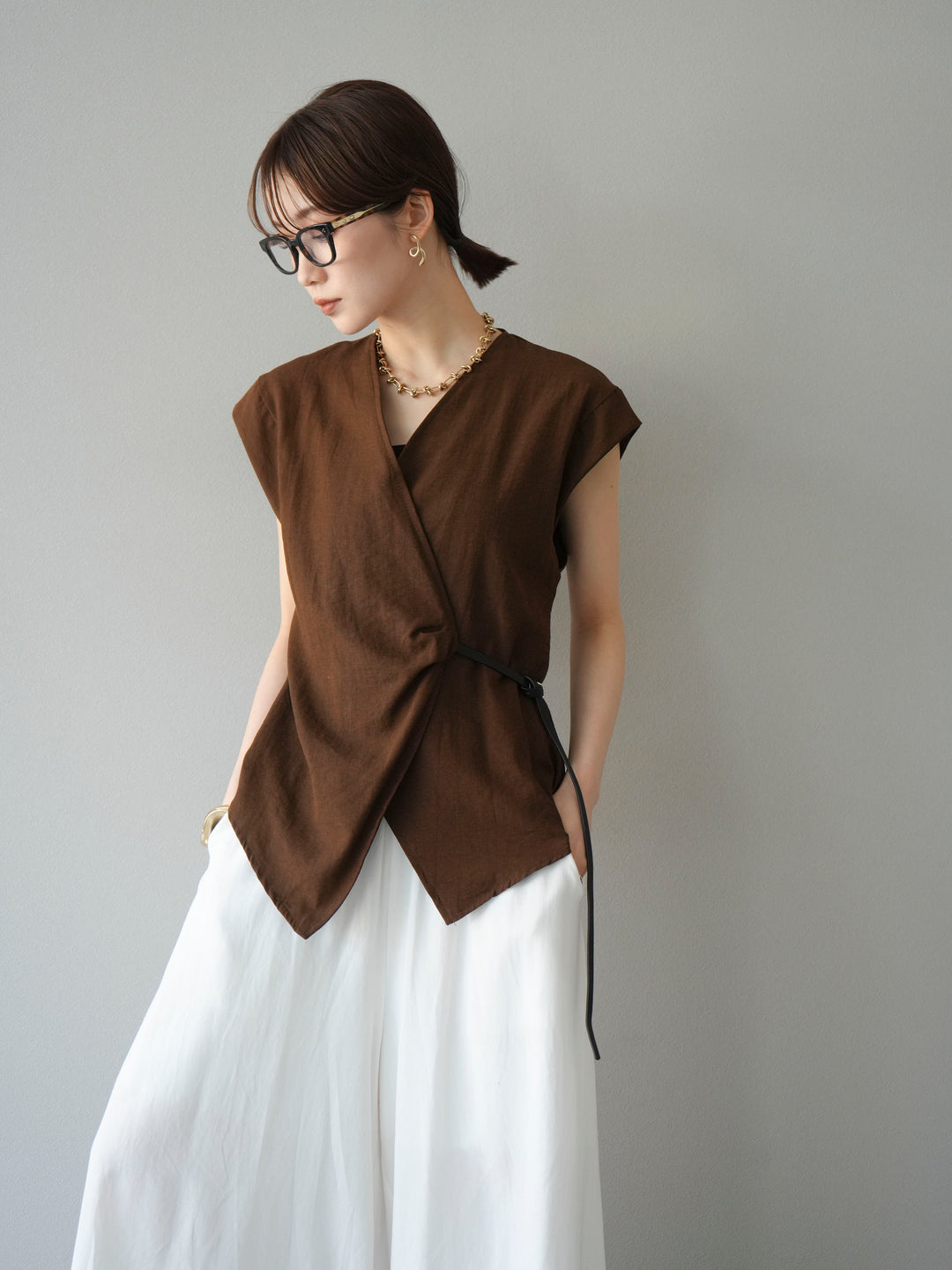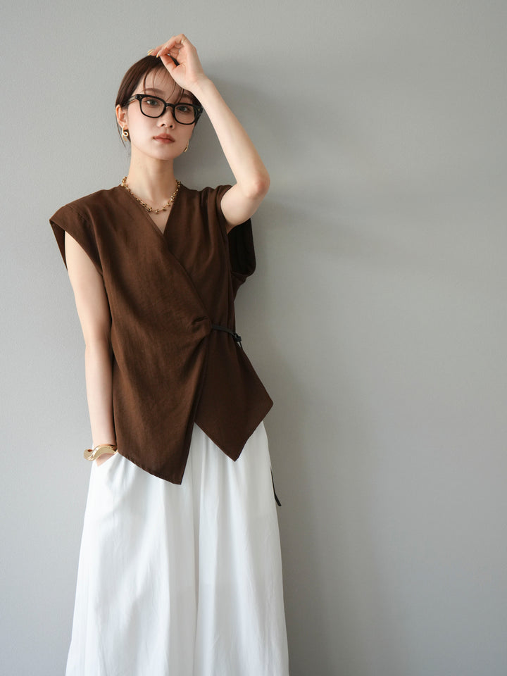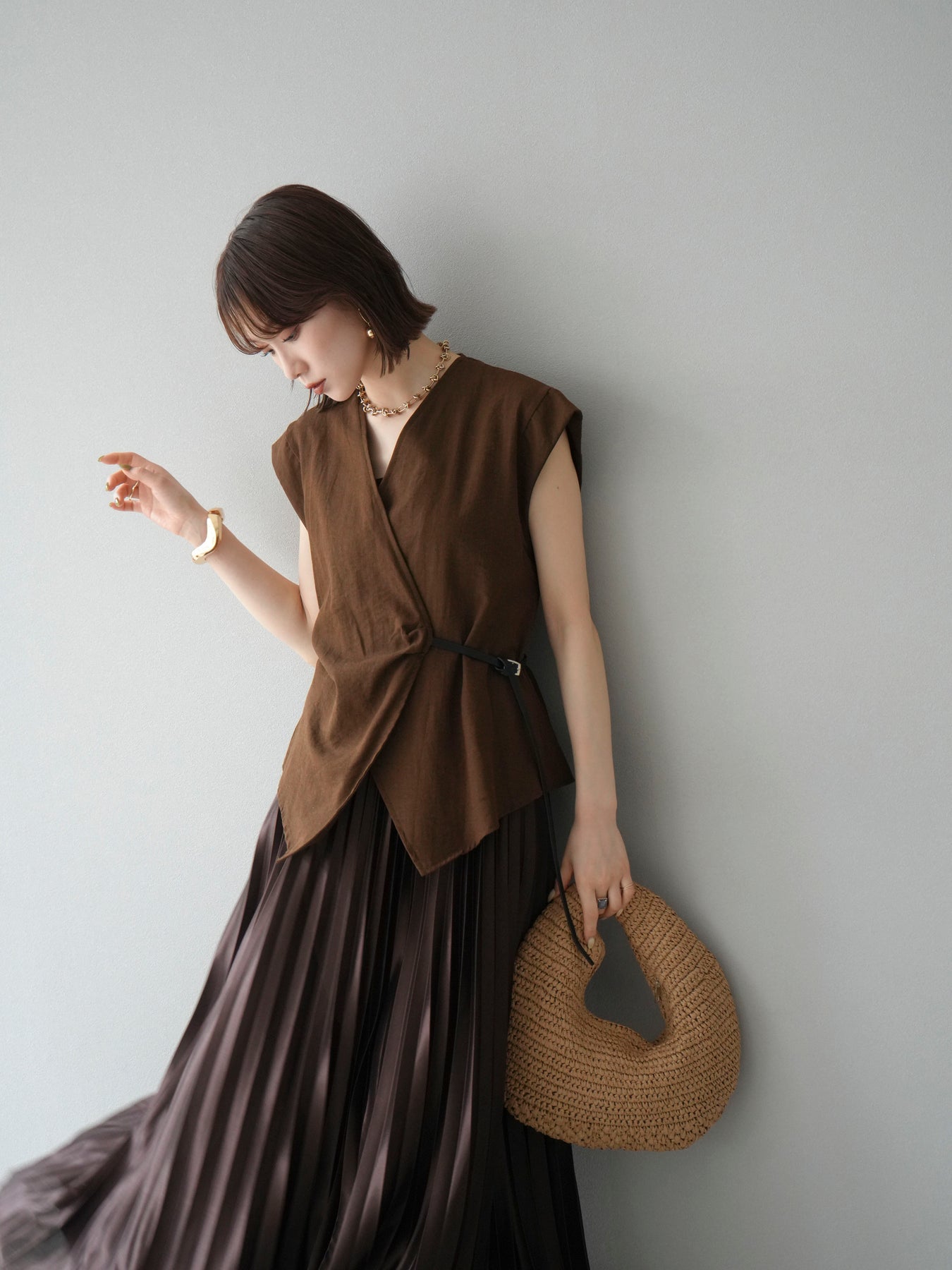 フロントのラップ風デザインに、ウエストベルトをあしらったモード感漂うノースリーブトップス。ベルトの絞り加減でシルエットに変化をつけられ、女性らしいくびれラインと抜け感を演出できます。 柔らかな素材感とすっきりとしたVネックラインが、軽やかさと上品さを両立。1枚で着映えする主役アイテムとして、ワイドパンツやタイトスカートとの相性も抜群です。 デイリー使いはもちろん、きれいめなシーンにも活躍する万能トップスです。