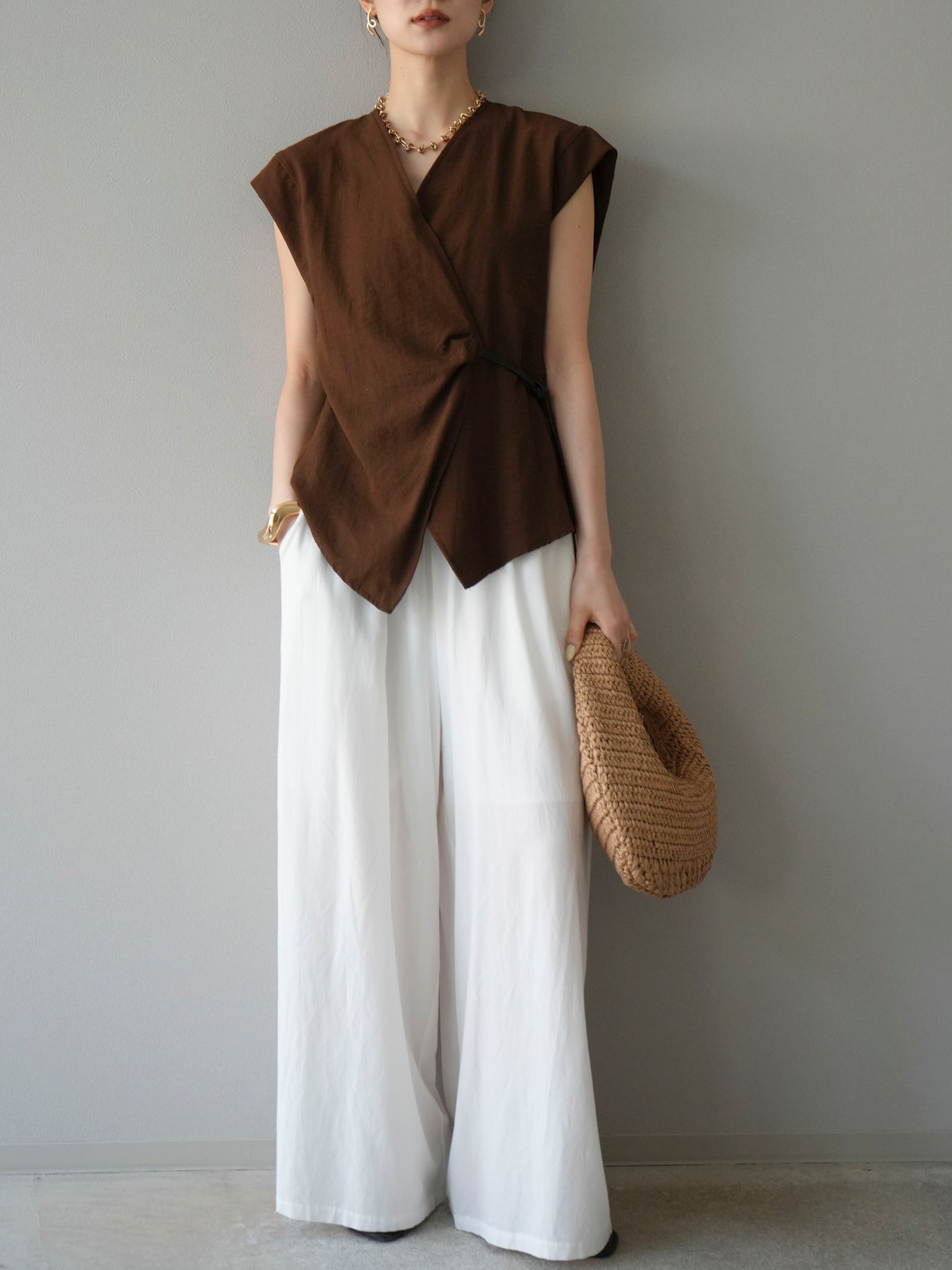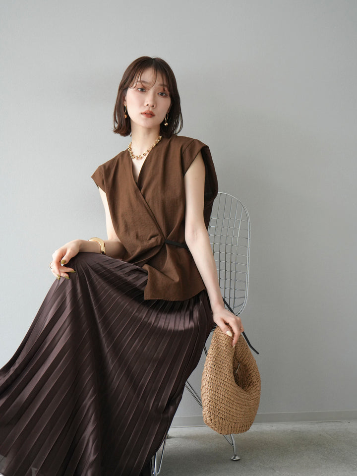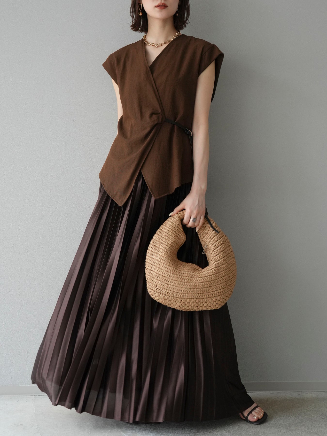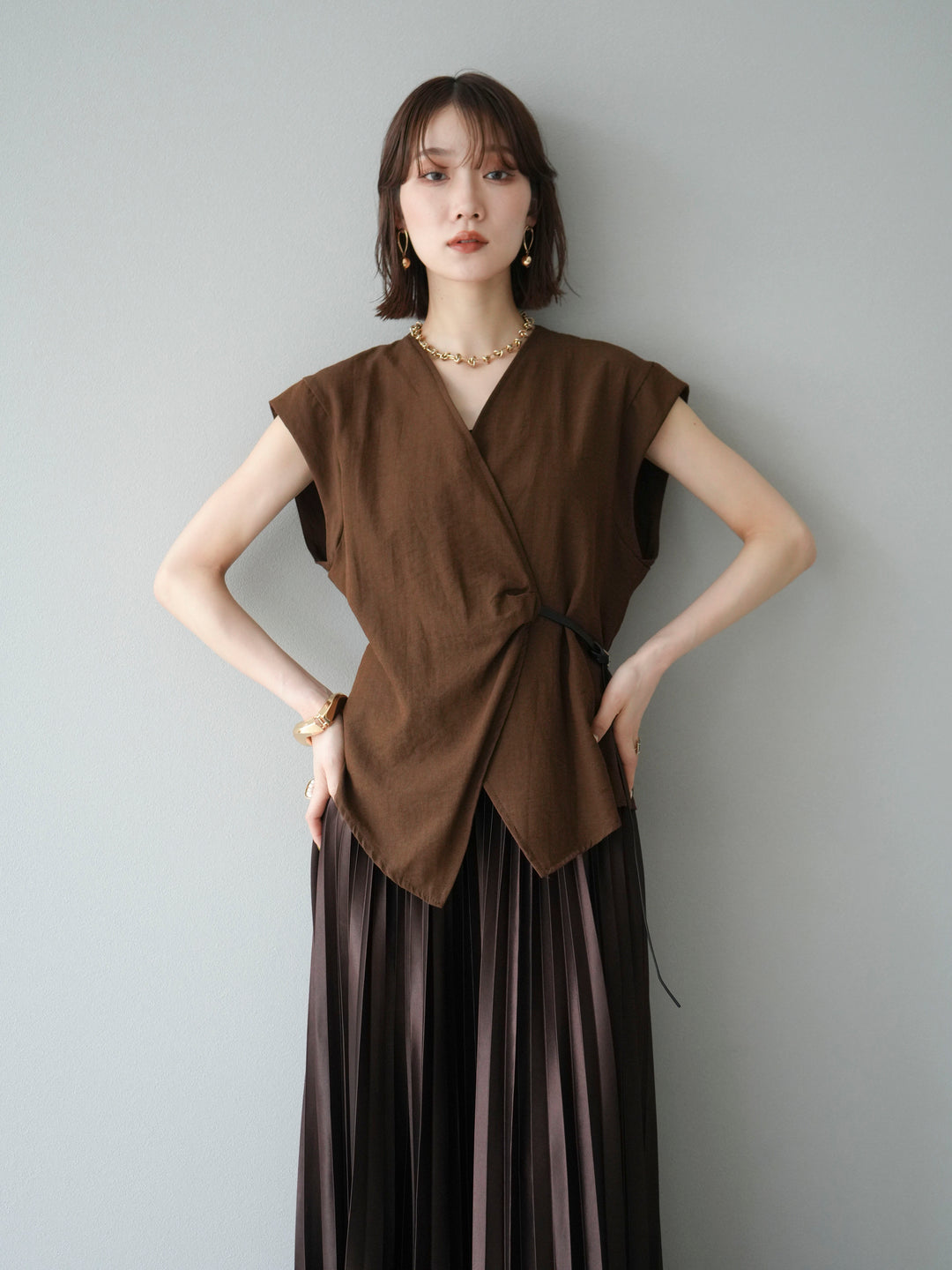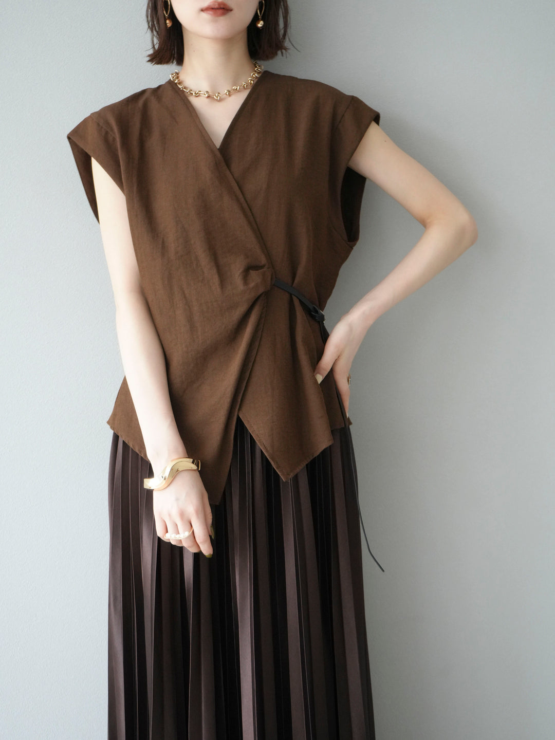 フロントのラップ風デザインに、ウエストベルトをあしらったモード感漂うノースリーブトップス。ベルトの絞り加減でシルエットに変化をつけられ、女性らしいくびれラインと抜け感を演出できます。 柔らかな素材感とすっきりとしたVネックラインが、軽やかさと上品さを両立。1枚で着映えする主役アイテムとして、ワイドパンツやタイトスカートとの相性も抜群です。 デイリー使いはもちろん、きれいめなシーンにも活躍する万能トップスです。