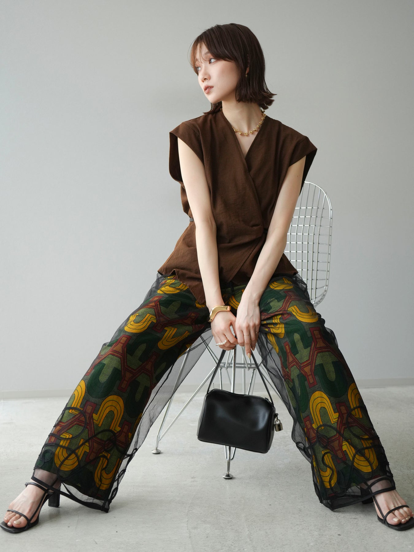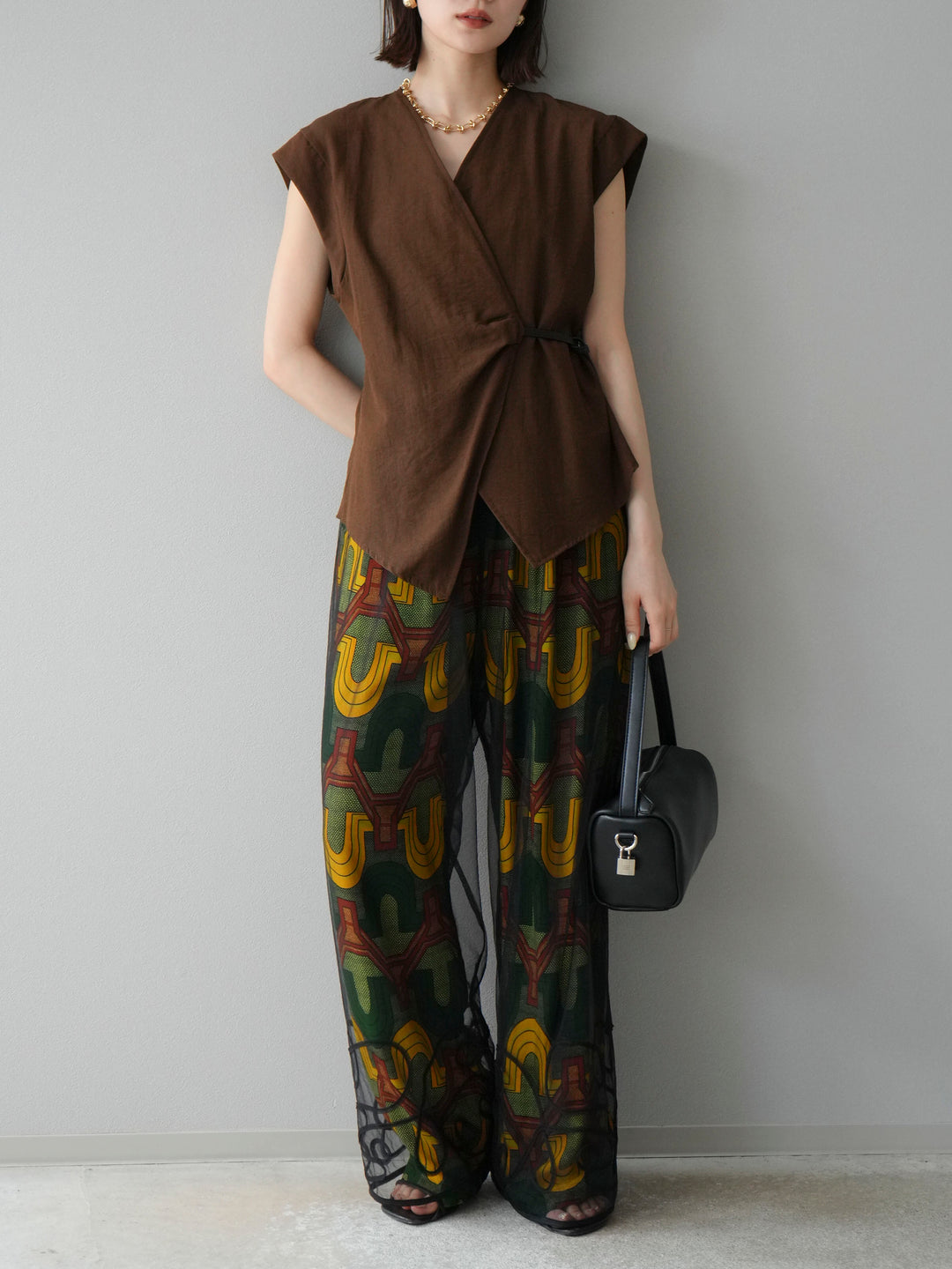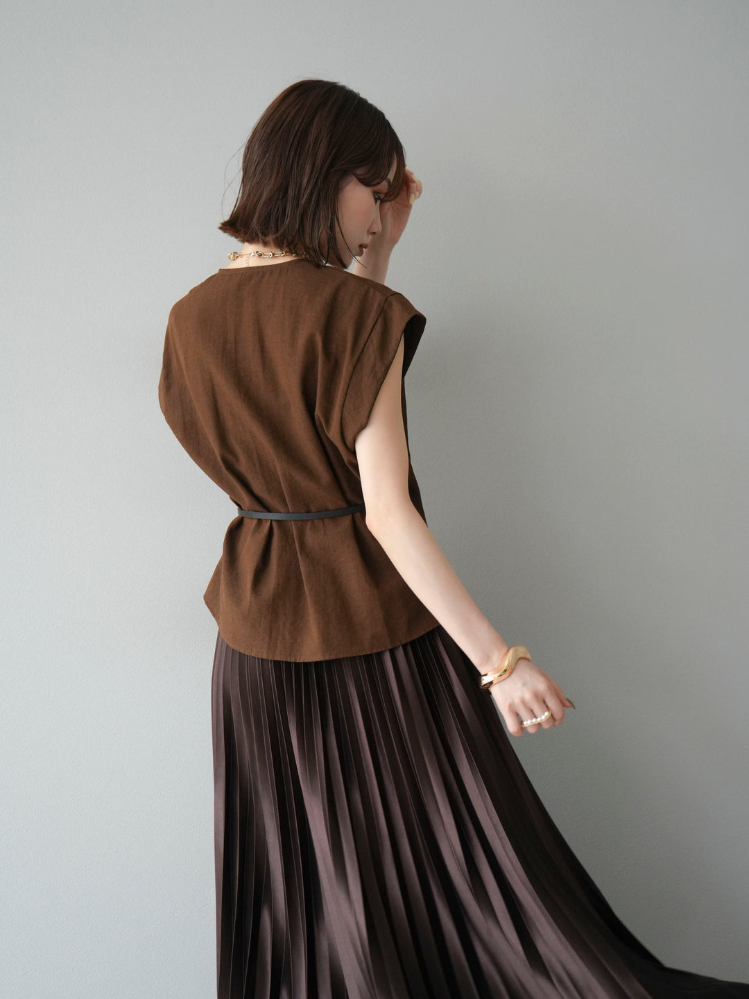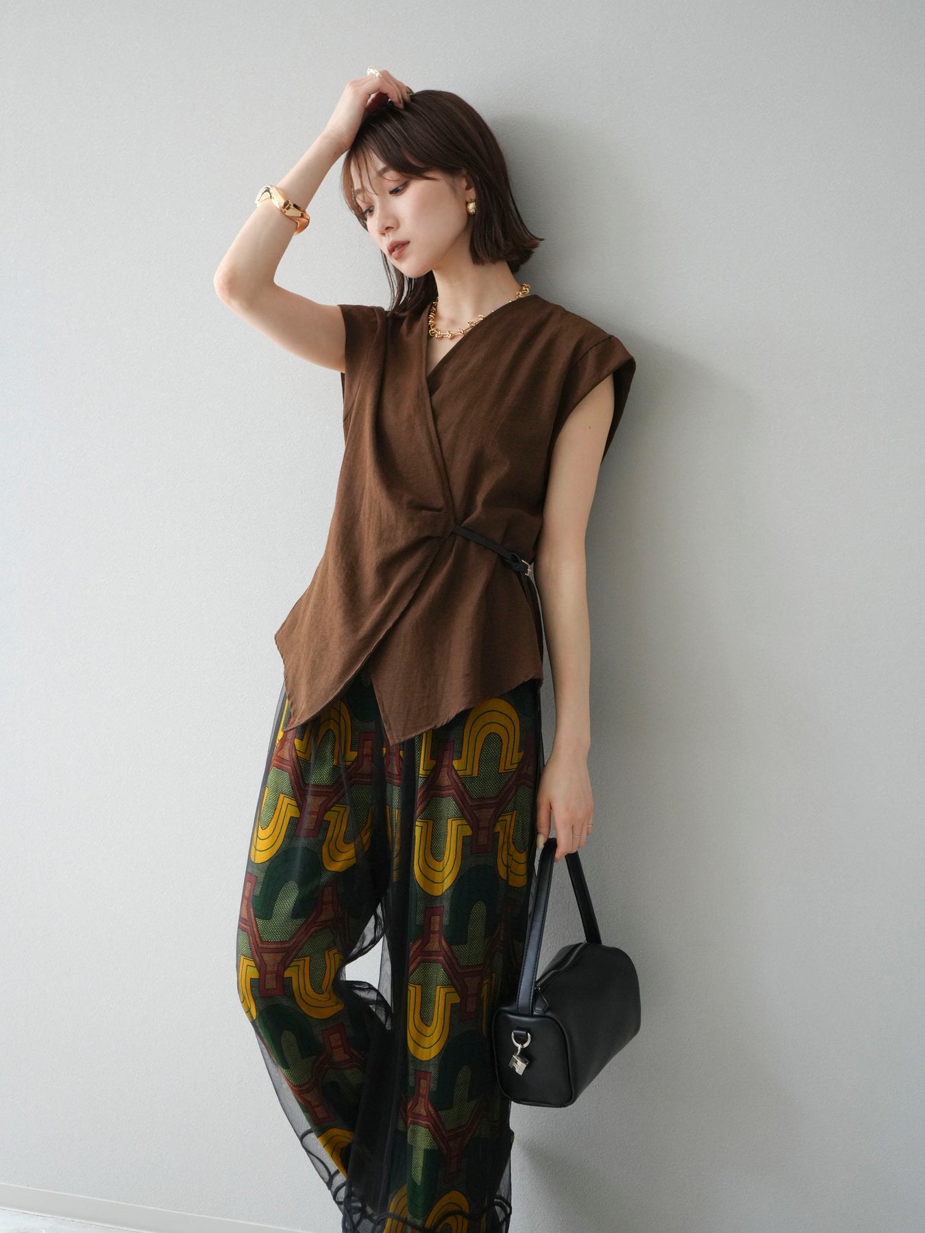 フロントのラップ風デザインに、ウエストベルトをあしらったモード感漂うノースリーブトップス。ベルトの絞り加減でシルエットに変化をつけられ、女性らしいくびれラインと抜け感を演出できます。 柔らかな素材感とすっきりとしたVネックラインが、軽やかさと上品さを両立。1枚で着映えする主役アイテムとして、ワイドパンツやタイトスカートとの相性も抜群です。 デイリー使いはもちろん、きれいめなシーンにも活躍する万能トップスです。