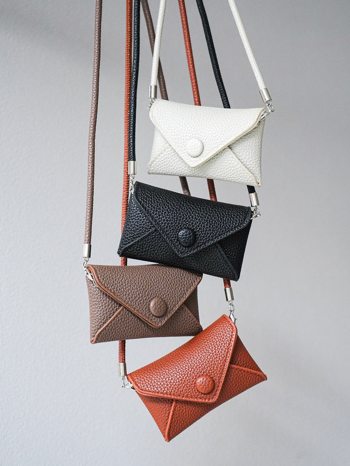 シボ感のあるフェイクレザーを使用した、上品なミニポーチ。コンパクトながらも存在感のあるエンベロープ型デザインで、首や肩にかけてアクセサリー感覚で楽しめます。 キャッシュレス時代にぴったりのサイズ感で、カードやリップなど必要最低限の小物をスマートに持ち運べます。 日常使いはもちろん、旅行時のサブポーチやフェス・イベントシーンにもおすすめです。