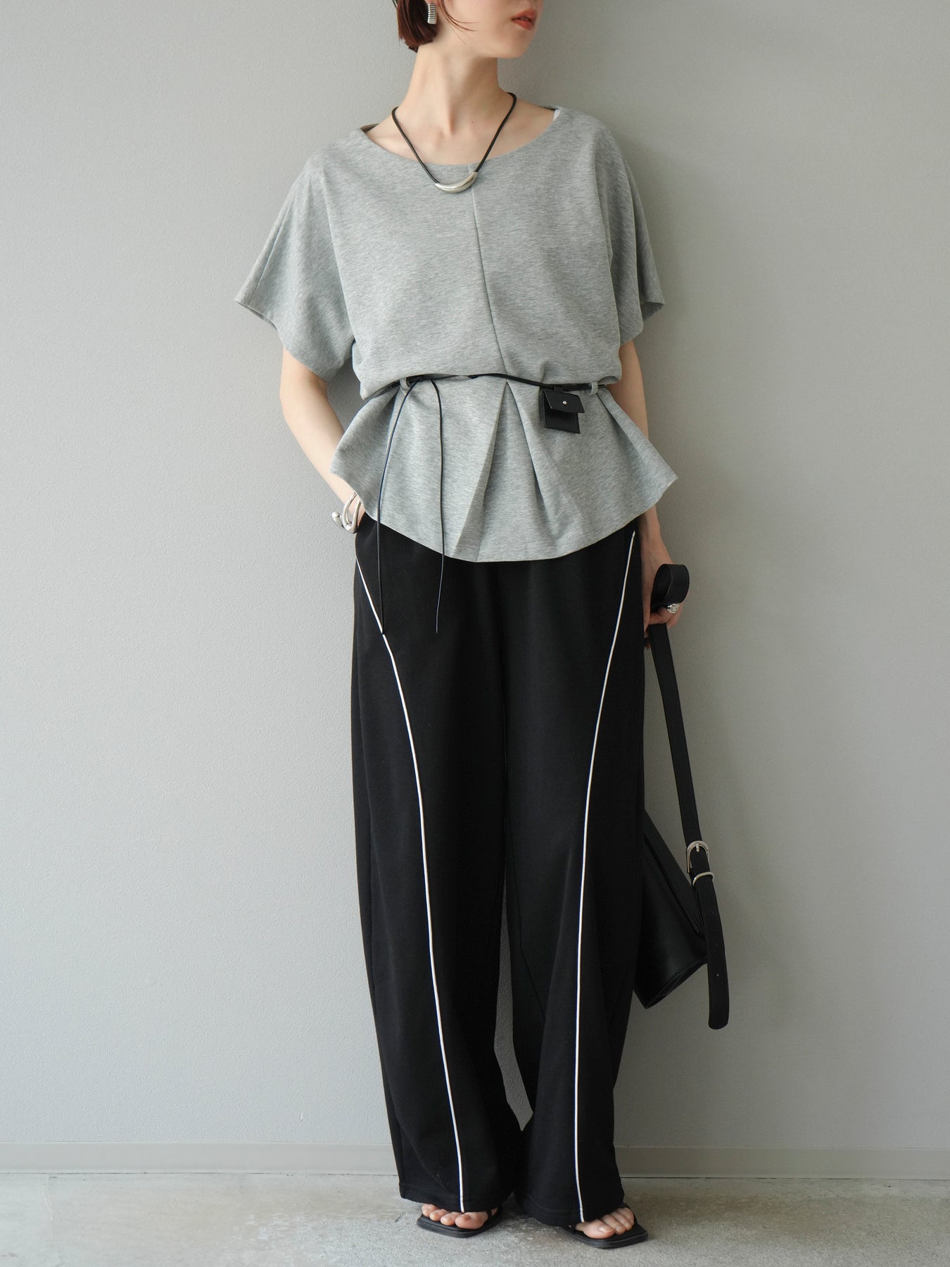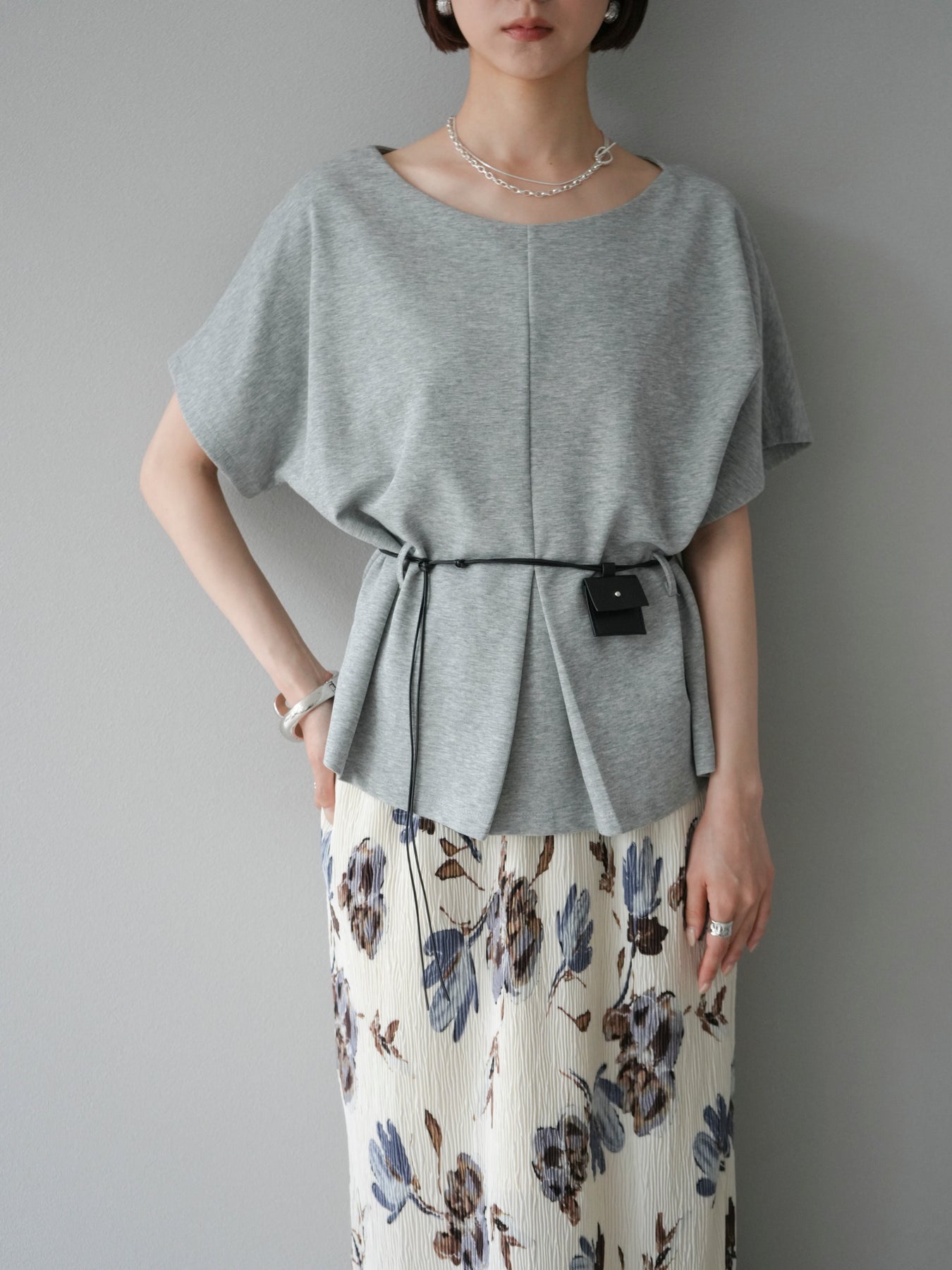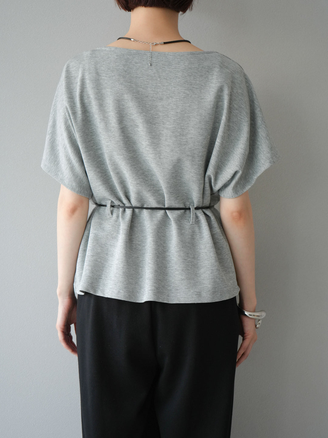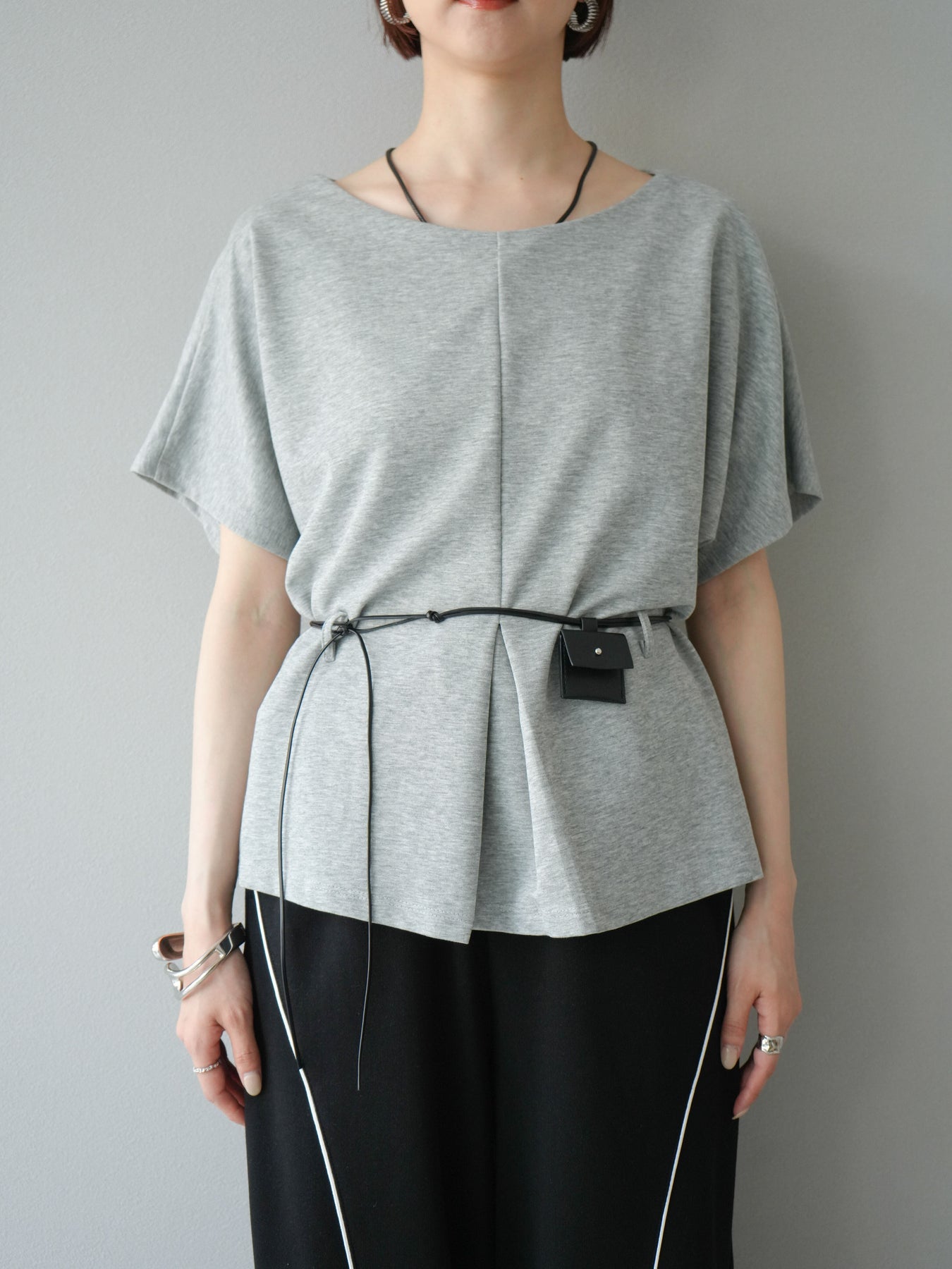 [予約]レザーアクセサリー付フロントスリットTシャツ/グレー